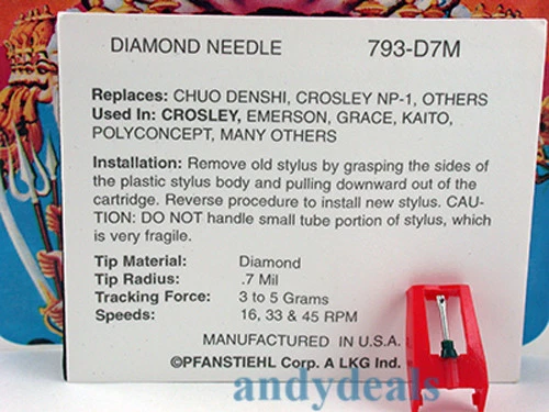 DETROLA KM-837 KM837 Phonograph Turntable Stylus Needle 793-D7M Pfanstiehl 793-D7M Model Pfanstiehl 793-D7M fits ION, GRACE & many others Description Brand New (factory sealed box) replacement stylus tracking force 3-5 grams Diamond .7 mil conical tip needle Speeds: 16, 33 & 45 RPM REPLACES needles listed below NEEDLE S FISHER ST-05D ST05D ST-141 ST141 ST-707J ST707J GRACE ITC-TWCDRW ION IPT01 , IPTUSB JC PENNEY 6-2339-1 623391 MAGNAVOX 5690300007 483525197005 PANASONIC CZ-800 CZ800 SANYO ST-707J ST707J ST-05 ST707J ST707J ST05 SHARP STY-146 SONY ND-152P ND152P TECHNICS CZ-800 CZ800 CARTRIDGES DENON SJN-68 SJN68 JC PENNEY CARTRIDGES 1259-4909 12594909 1260-9269 12609269 CZ-800-1 CZ8001 PANASONIC CZ-800 CZ800 SHARP 146 SONY VX-52G VX52G TECHNICS CZ-800 CZ800 MODELS ACADEMY MD1101 ALBA DL501 MC452 MS1050 MS1250 MS1450 MS150 MS1700 MS450 MS700 (CD) MS800 SST1820 SST1900 SST2000 SST2300 SST2400 SST2900E Z208 AMSTRAD M845 SG33 Studio100 TM71 TS46 TS77 BINATONE 1044 1054 7232 7280 Melody Mk3 Midi 110 Midi 140 BSR 6-2339-1 623391 CZ-800-1 BUSH 8830/5 8850 9530 9541 9546 9547 9561 9580 9582 9827 9842 9901 MS200 MS210 MS220 MS230 MS240 MS250 MS835 CROSLEY NOSTALGIA PHONOGRAPHS CR-27, CR-43, CR-44, CR-46C, CR-47, CR-48C,CR-49B, CR-49TW, CR-50TW,CR-53, CR-67, CR-69, CR-70, CR-73, CR-77CD, CR-78CD, CR-79, CR-711, CR-712CD, CR-86, CR-87CD CROWN CD2000 MZ1100 MZ2150 DETROLA KM-837, KM837 EMERSON M4000 CD1330P CD1435P CD1453 MC1550 MC2293 AS2610 AS2650 MS4000 AS2600 AS2603AS2803 AS2806 AS2809 CD2000 CD2500 FISHER GT747 GXT1707 GXT707 GXT747 ICS716 MC617 MC715 MC715B TAD102 GE CS3000 CS-3000 CD 3000 GOLDSTAR GCD82P GSM6310 GSM6920 GSMX2 GRACE ITC-TWCDRW Victoria Tunewriter phonograph GRAND PRIX R6300 R6400 R6500 S4000 S5500 S5800 S7000CD HITACHI HTMD10 HTMD30X SMD10 SMD100 SMD30 SMD40 SMD400 T08 T30 ION IPT01 , IPTUSB MAGNAVOX AS305M3701 MX1810 BK01 PHILIPS 1462 1465 1650 1651 1652 462 F1275 F1485 F1662 F1664 F763CD FCD185 FCD285 FCD462 FCD463 FCD465 FCD485 FCD560 FCD562 FCD563 FCD565 FCD585 S1652 SCD652 PIONEER S-100 S100 S-200 S200 X-1100 X1100 X-2100 X2100 X-4100 X4100 X-6100 X6100 X-7100 X7100 X-9100 X9100 RADIO SHACK Clarinette122 13-1327 SPIRIT OF ST. LOUIS NOSTALGIC SANYO GT1707 GT1707 1747 GXT-747 GXT747 GXT-210 GXT210 GXT707 GXT747 SOUND DESIGN 6822B 6822-B 35871BP5 5856PK6 5868CD2 5868CDP 5868PK6 5868TM4 5869BP3 5869SP1 5871BP5 5871BPJ 5871SK1 5 966PK6 5967BK6 5975BP9 5979M4D 5979PK2 5990CDP 5990M4D 5991BPPl 5991SP3 5994PK8 5995PK-4 5995PK4 6822-17 682217 6822BK4 6822BP4 6822PK3 6822PK6 6822TT1 6822M17 6822HK4 6856-56 685656 6857-57 685757 6857BK2 6857MP2 6868-68 686868 6868ACD 6869-69 686969 6966-62 696662 6967-67 696767 6971-71 697171 YORKS ELECTRONICS (YORX) M2408 M2409 M2676 M2202 M2203 M2408 M2409 M2501 Q802A STX8000 2409 STX500 M4900 M5000 R4210 R4212 R4116 R4121 R4125 R4106 R4109 R4110 Q/100 Q101 Q200 M5106 M5116 M5121 M8107 Ad is for one stylus but you can purchase as many as you want. This ad is for the 793-D7M replacement needle. Cartridge is not included; but available. Open 7 days a week, year round. We carry hard to find music, sheet music, musical instruments, electronics, surf equipment. We have live music on the weekends. We support local Musicians. Avoid our register line, shop online. Shop with your roller skates on. We also sell guitars. Stop in and try a guitar. Professional shipping.
