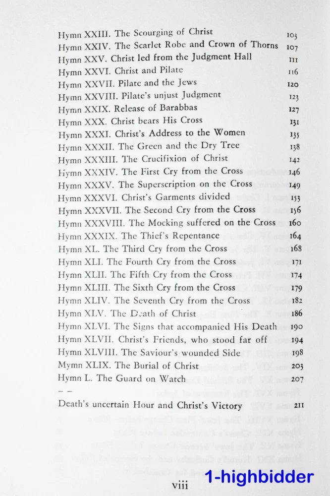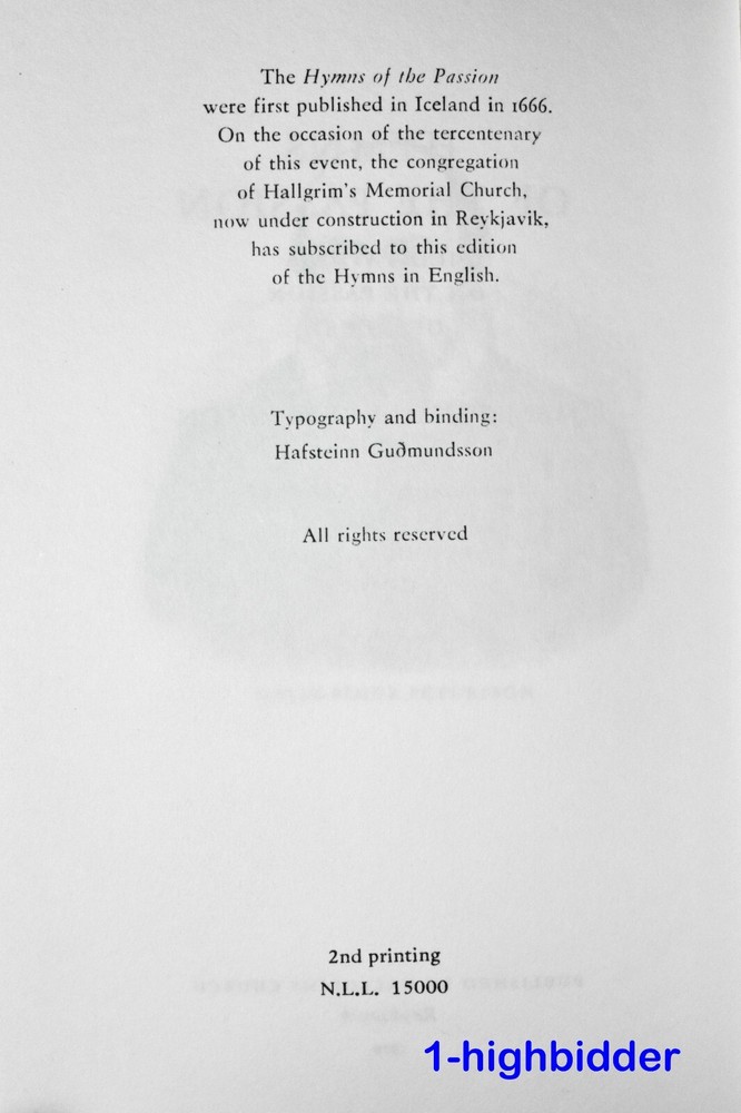 NEW! The Hymns of the Passion Hallgrímur Pétursson Icelandic Christian Poetry ______________________________________ The Hymns of the Passion Meditations on the Passion of Christ by Hallgrímur Pétursson Translated from Icelandic by Arthur Charles Gook Published by Hallgrims Church, Reykjavik (1978) Condition: BRAND NEW second printing of this Softcover Book bound in faux leather! It measures 4-3/4" x 7-1/4". The binding is tight and all 214 pages within are bright white with NO WRITING, UNDERLINING, HIGH-LIGHTING, RIPS, TEARS, BENDS OR FOLDS. The covers are perfect, as can be seen in my photos. You will be happy with this one! Always handled and packaged with care! Buy with confidence from a seller who takes the time to show you the details and not use just stock photos. Please check out all my pictures and email with any questions! Thanks for looking! About the Book: The Passíusálmar or Passion Hymns are a collection of 50 poetic texts written by the Icelandic minister and poet, Hallgrímur Pétursson. The texts explore the Passion narrative, as traditionally presented, from the point where Christ enters the Garden of Gethsemane to his death and burial. Hallgrímur began composing the work in 1656, while serving as pastor of Saurbær in Hvalfjörður. It took him three years to complete, the final poem being written in May 1659; the first edition was published seven years later, in 1666. About the author: Hallgrímur Pétursson, born in 1614 in Hólar, Iceland, was a highly esteemed religious poet. Despite coming from a respected family, Pétursson led a wayward life. As a young boy, he ran away to Copenhagen, where he worked as a blacksmith's apprentice. Bishop Brynjólfur Sveinsson influenced his life trajectory, and Pétursson later attended the Danish Vor Frue Skole, receiving a classical education in Latin. In 1636, Pétursson took on the significant task of reintroducing Christianity to a group of Icelanders who had been held captive by Algerian pirates for nine years. Among the captives was Gudridur Símonardóttir, a 38-year-old woman who bore a child by Pétursson and later became his wife. Returning to Iceland, Pétursson engaged in various occupations, including laborer and fisherman, before eventually becoming a parson at Saurbær from 1651 to 1669. Despite contracting leprosy, Pétursson produced his magnum opus, the "50 Passiusálmar" in 1666, known as "The Passion Hymns of Iceland." These hymns are regarded as some of the world's finest religious poetry, where the poet intimately intertwines his personal suffering with the narrative of Jesus. The Passion Hymns had a profound impact on the morale of a despondent people and quickly gained widespread popularity upon their first printing in 1666. To honor Hallgrímur Pétursson, the Hallgrímskirkja, a memorial church in Reykjavík, stands as one of Iceland's largest and finest churches. A Book Review:139.99 5/5 stars - Spiritual and Literary Moments for Reflection Hallgrimur Petursson's "Hymns of the Passion" is a remarkable literary treasure that intensifies the retreat into spiritual reflection that one enters when taking it up. The hymns have been beautifully translated from the Icelandic by Aurthur Charles Cook, who by all accounts, has done a remarkable job of keeping the English as close to the rhyming nature of the original. The hymns interweave the accounts of Passion from the Gospels. The book divides the Passion up into 100 short chapters that make for easy reading. Verses take turns recounting the story of the Passion and offering a deep spiritual reflection. The Hymns could make for inspirational source material for sermons and certainly have much to offer in deepening devotional time or family reading. This little book is belongs among the greatest writings of Christianity and just happens to be well put together in word and depth of feeling. --Barry Ratzliff Copyright © 2018-2023 TDM Inc. The photos and text in this listing are copyrighted. I spend lots of time writing up my descriptions and despise it when un-original losers cut and paste my descriptions in as their own. It is against ebay policy and if you are caught, you will be reported to ebay and could be sued for copyright infringement and damages.