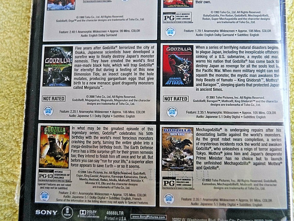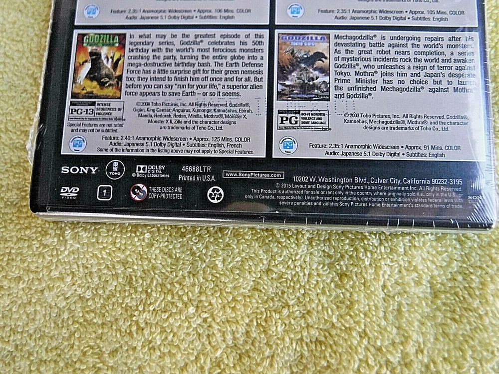 FEEL FREE TO ASK QUESTIONS ABOUT MY ITEMS, AND PLEASE Check out my other items ! CHECK OUT MY STORE FOR OTHER MY ITEMS, THANXX BRAND NEW/FACTORY SEALED 4 DVD SET! THE TOHO GODZILLA COLLECTION VOLUME 2! THE COMPLETE 7 FILM COLLECTION ! THIS SET IS STARTING TO GET RARE! DISCONTINUED SET! 2015(SET), 1993-2004(FILMS), 720 MINUTES, WS, 5 OUT OF 7 FILMS ARE JAPANESE AUDIO W/ ENGLISH SUBTITLES, 2 ARE ENGLISH DOLBY SURROUND, REGION 1, DISC MADE IN MEXICO. THE PICTURES DESCRIBE THIS ITEM BETTER THAN I CAN! WHAT YOU GET IS WHAT YOU SEE ABOVE! + LOW DOMESTIC SHIPPING! & LOW CANADA SHIP! THANX 4 LOOKING AND IF YOU HAVE ANY OTHER QUESTIONS PLEASE CONTACT ME BEFORE BUYING! PLEASE Check out my other items in my store ! CANADA: I'M NOT RESPONSIBLE FOR ANY CUSTOMS DELAYS, FEES, TAXES OR TARIFFS, SO PLEASE NO BAD FEED BACKS FOR THAT --CUSTOMS FEES ARE YOUR RESPONSIBILITY! ITEMS WILL BE SHIPPED AS MERCHAN DISE B/C THEY ARE NOT GIFTS. PACKAGING WILL BE INCLUDED IN YOUR SHIPPING COST B/C I WILL USE MORE BUBBLE WRAP, ETC. TO GET YOUR ITEM SAFELY TO YOU. IT ALSO MAY TAKE 1 TO 2 DAYS TO SHIP OUT, NOT THE 24 HOURS ALLOTTED FOR DOMESTIC(USA) PACKAGES. CANADA USUALLY TAKES 2 WEEKS TO DELIVER UNLESS HELD IN CUSTOMS. FOREIGN CAN BE ANYWHERE FROM 2 WEEKS TO 1.5 MONTHS DEPENDING ON WHERE AND HOW SHIPPED. IF HAVE OTHER PROBLEMS, PLEASE CONTACT ME BEFORE YOU LEAVE FEEDBACK- THANXXXXXXX SEE MY STORE ! BUY NOW-THANXXXX 3 at*****2*********o******** 2 at******/********L********