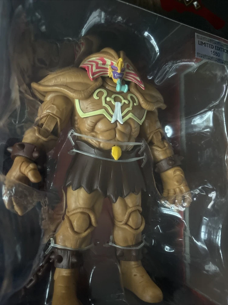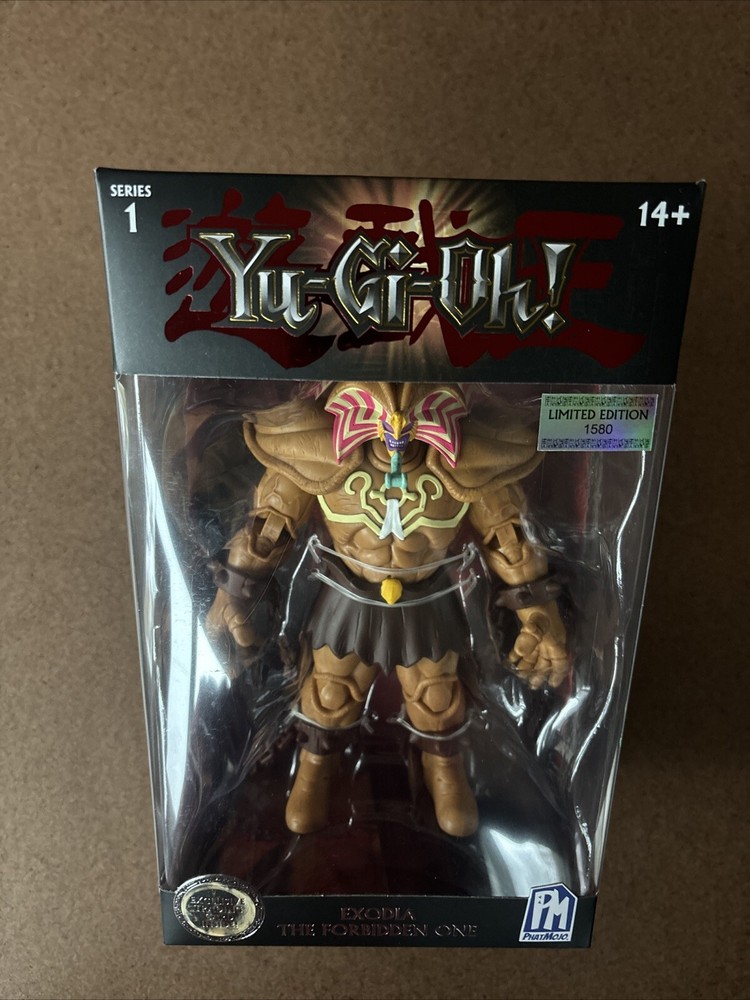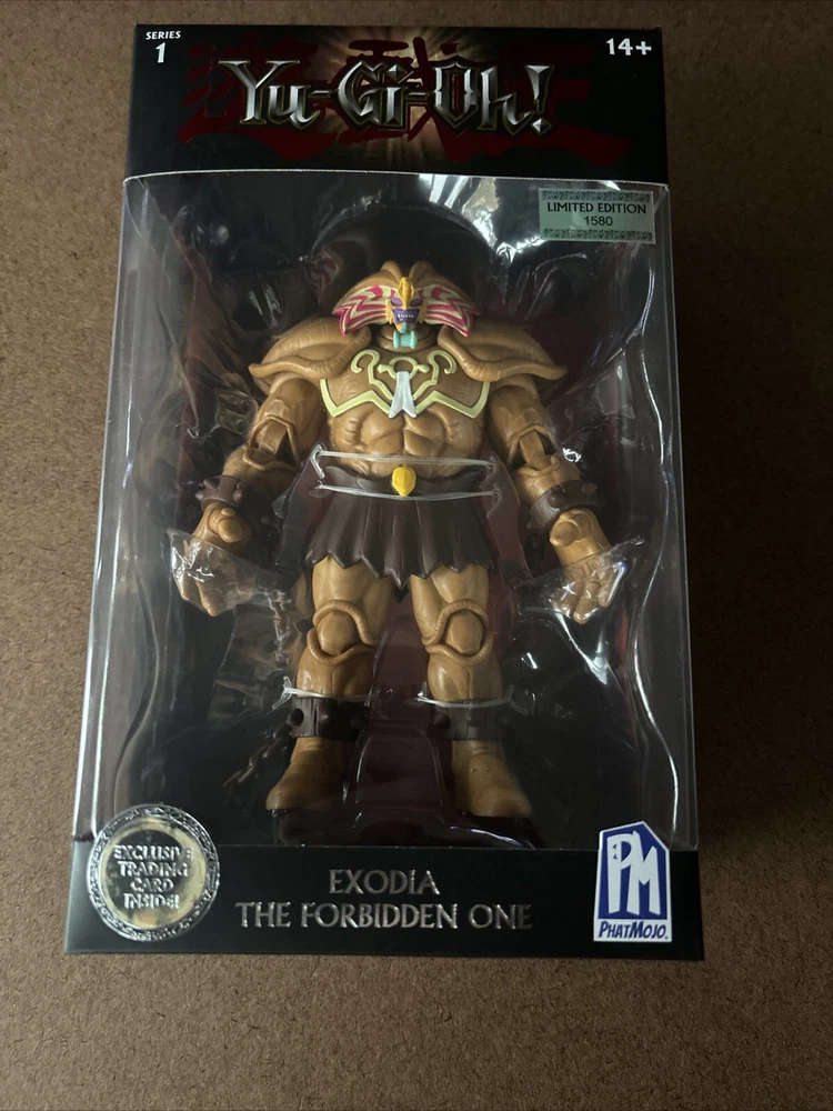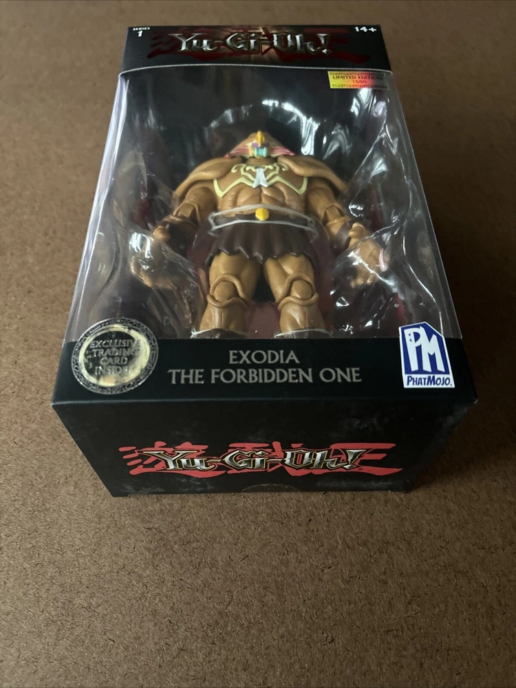 Small tear on the bottom as in photos. Some shelf life wear . Please use photos for reference. This limited edition PhatMojo Series 1 action figure features the iconic Yu-Gi-Oh! character, Exodia The Forbidden One. The figure is made of high-quality plastic and comes with an exclusive trading card. It is perfect for fans of the anime and manga franchise, and collectors of limited edition items. The action figure is designed with attention to detail, capturing the essence of the character. It is suitable for ages 14 and above and is an original, licensed reproduction. The figure is made in China and is part of the Yu-Gi-Oh! series. Get your hands on this highly sought-after item before it's too late!
