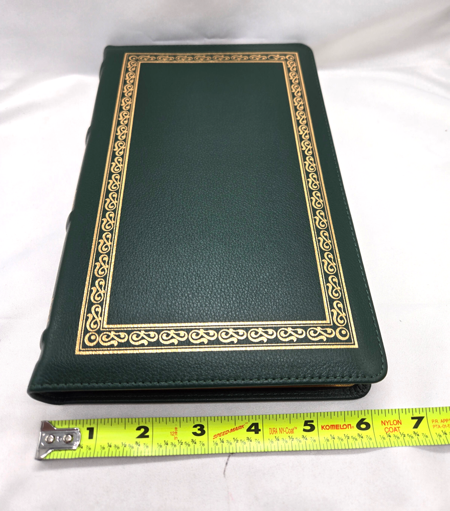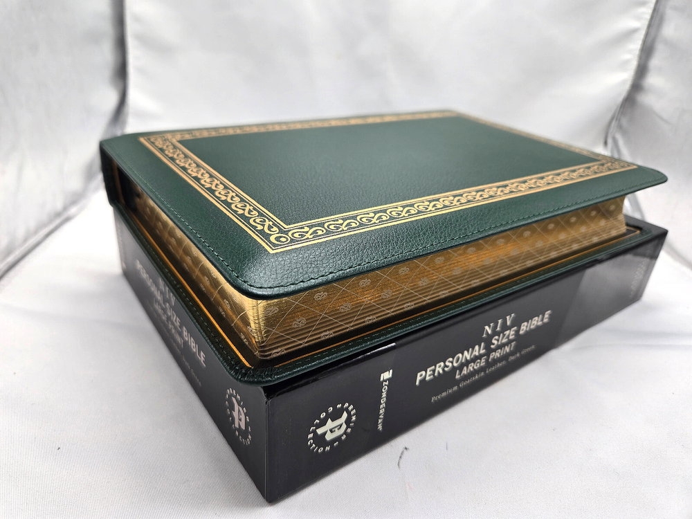 NIV, Personal Size Bible, Large Print, Premium Goatskin Leather, Green, Premier Collection, Black Letter, Gauffered Edges, Comfort Print Leather Bound – Large Print, October 11, 2022 Features: Complete text of the accurate, readable, and clear New International Version (NIV) Hand-bound in a supple, dark green goatskin leather cover with raised spine hubs and foil cover decoration Smyth-sewn and edge-lined construction for flexibility Geometric gauffered page edging (exquisite, printed gilding), with gilt line and perimeter stitching Reinforced end papers for a strong, durable binding Three double-sided satin ribbon markers, each 3/8-inch wide Premium European Bible paper, 36 GSM Elegant two-color page design in a double-column format Black-letter text Generous yapp Convenient, portable size Eight pages of full-color maps for helpful reference Exclusive Zondervan NIV Comfort Print typeface Print size: 11.5