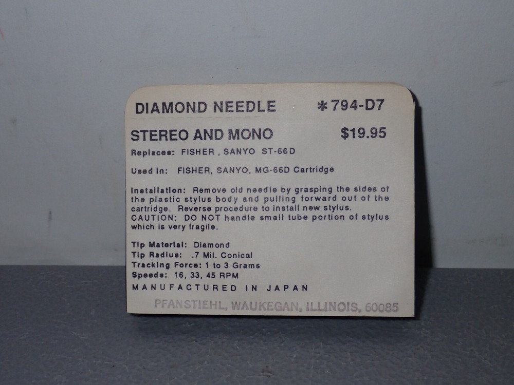 NOS Pfanstiehl Diamond Needle/Stylus #794-D7 Brand new, factory sealed Multiple quantities available These come from the inventory of a long closed turntable repair shop Check my store, I will be listing many more vintage cartridges, styli and other turntable accessories over the next few months Will be carefully packaged for safe shipping Will ship via USPS Ground Advantage