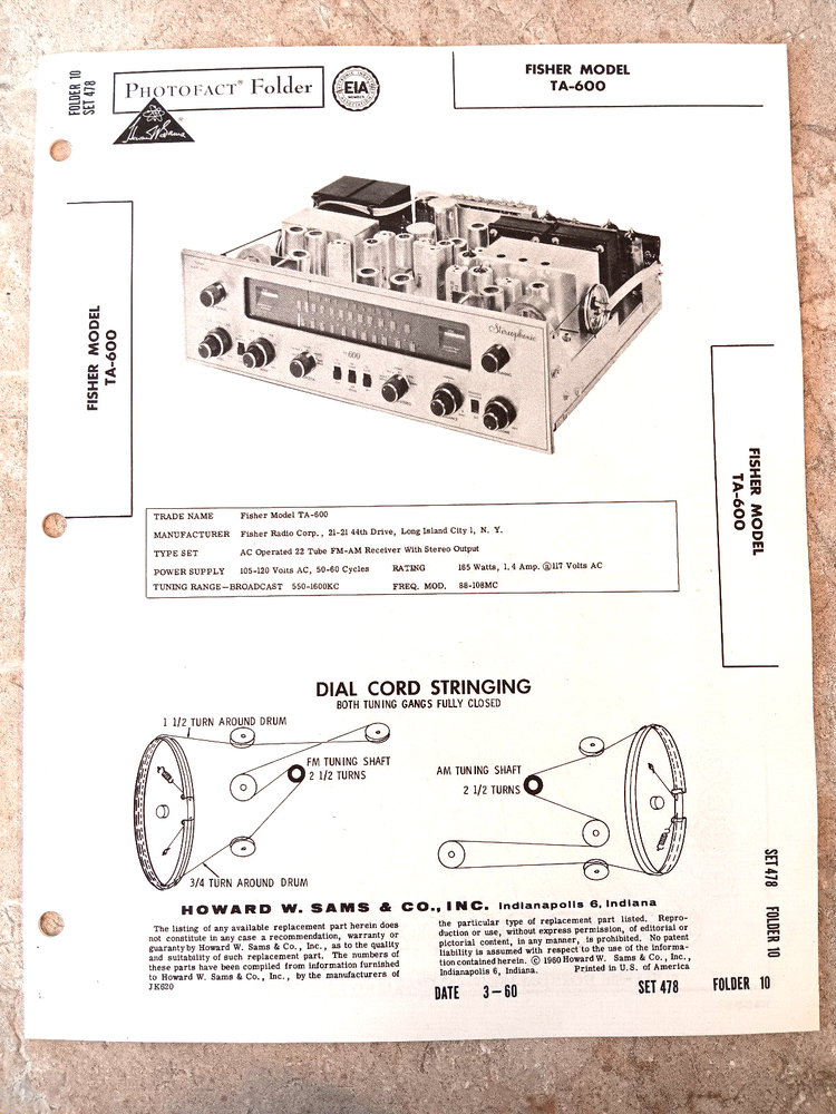 NOS SAMS PHOTOFACT manual 478-10 FISHER TA-600 an AM/FM RECEIVER stereo output. Mint new original condition never used, tight spine crease, no soil, no crease, no notes, .... Paper is hardly toned at all from age, straight edges, square corners, no creases, ... New old stock folder, brown at bottom right is photo effect, paper is ALL white. 16 pages of schematic, resistance chart, chassis photos, alignment, dial string routing, parts list w locator,... This is the info repairmen of the era and of today depend on. SHIPS FLAT in full manila envelope w supportive cardboard, not all folded for cheaper shipping. Normally ships the next day.