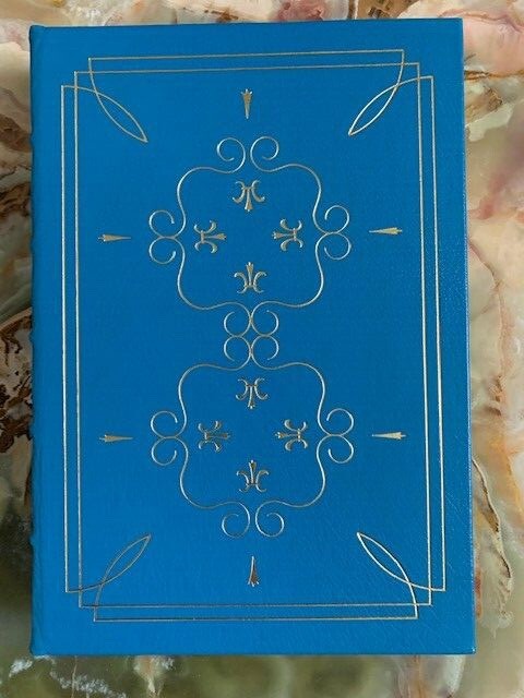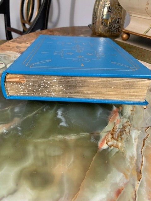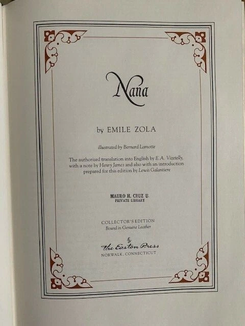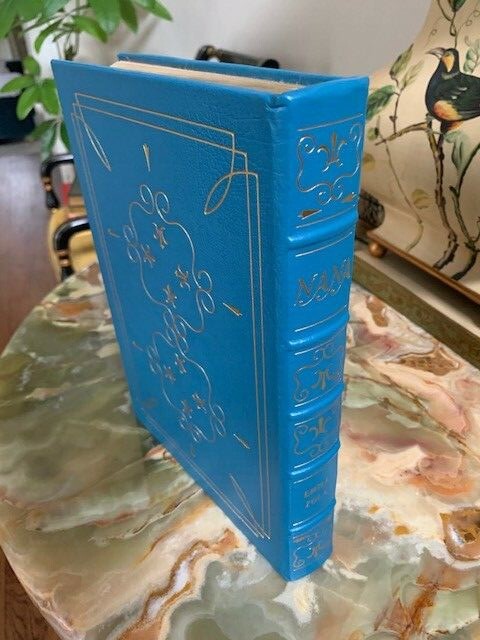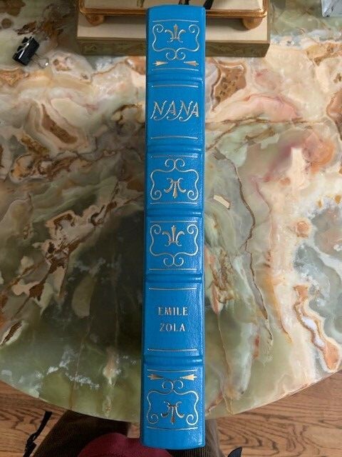 Nana , Emile Zola , Published by Easton Press, Leather, Collectors’ Edition 1976 The authorized translation from French into English by E.A. Vizetelly, with a note by Henry James and also with an introduction prepared for this edition by Lewis Galantiere. Illustrated by Bernard Lamotte. This book is printed on archival quality paper especially milled for this edition. It is acid-neutral and conforms to all guidelines established for permanence and durability by the council of Library resources and the American National Standards Institute. Bound in fine genuine leather of light blue color with 22 karat gold decorations, all page edges gilded wit gold, raised spine hubs, sewn-in satin ribbon book marker, archival quality acid-free paper, silk moire fabric endpapers, thread-sewn pages for strength and durability. Condition of the book is good, pre- owned with owned's stamp on the first 3 pages, The end of the book have some small white point of the end of gold edge, see the pictures. Otherwise the pages are clean and tight, unread. Size of the book: 11.25x8x1.5 inch; Weight: 3 lb. 3 oz.; Pages: 409 Will be shipped via USPS Media Mail with tracking number.