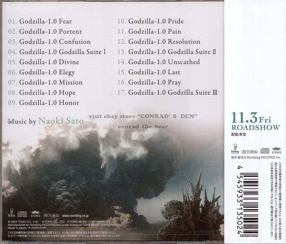 "GODZILLA MINUS ONE" soundtrack Japan CD - music by Naoki Satoh & Akira Ifukube The Soundtrack CD to "GODZILLA MINUS ONE"(2023, aka "GODZILLA -1.0"), TOHO Japan's latest Godzilla film set mainly in Japan 1947, two years after WWII defeat and seven years earlier to original GODZILLA film set in 1954, written and directed by Takashi Yamazaki, original music composed by Naoki Satoh, Godzilla theme composed by Akira Ifukube. The CD released through Rambling Records Japan, disc number RBCP-3502. 17 tracks, 56 minutes of recording. The CD is brand new, still sealed in the factory wrap. Please note the product is for Japan domestic market, most of the inserts are written in Japanese. It has no cut-out marks. SHIPPING: To USA $25 by FedEx, To Europe $12 by registered airmail shipping (trackable and insured up to $35) or $28 by EMS (trackable, fully insured and express mail). Item will be shipped upon receipt of payment. PAYMENT: eBay Managed Payments accepted.