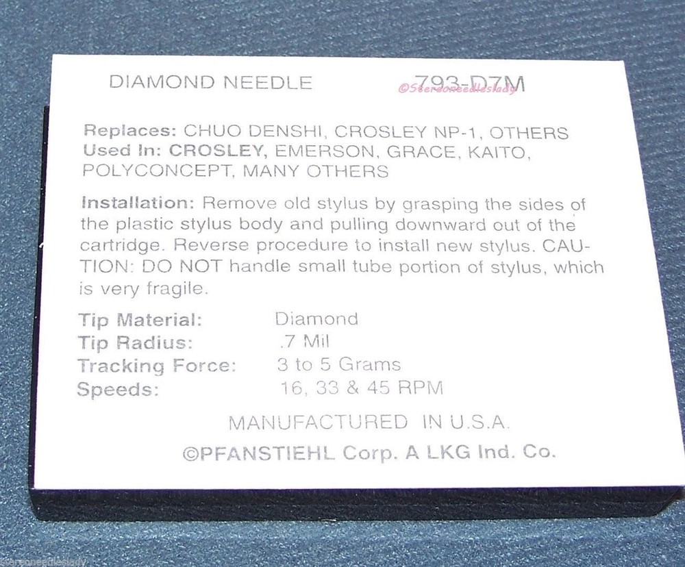 Stereo needle, Pfanstiehl 793-D7M, replaces 793-D7 and is used in many Crosley and nostalgia record player brands. Tip: .7 mil diamond. This upgrade has the metal cantilever. Speeds: 33 & 45 RPM. New in Pfanstiehl box. Also used for: Crown: CD2000S, MZ2100, MZ1100, Columbia - Denon: SJN68, C.E.C: MC392, Sanyo: ST05D, STWW3, ST40D, ST707J, Philips: F1650, Sharp: STY146, STY159, STY156, Toshiba: N73C, Goldstar: STY146, Glenwood: STY146, AIWA: STY146, TEAC: P35, P90, Sherwood: DM215, Samsung: SML8550, VIP300, VIP330, Realistic Tandy: Clarinette 121, Clarinette 122 Used in Cartridges: Sanyo: MG05 Philips: CZ800.1 Sharp: GSTV5-8 Goldstar: GCD21P Used in models with original cartridge: Akai: ACM58, ACM345, ACSM333, ACM548, ACSM333, APM111, APM121CD, APM222, APM333, APM340, APM525CD, APM636CD AIWA: MG2801 Crown: MZ1100, MZ2100, CD2000S Sanyo: GXT180, GXT215, GXT707, GXT747, GXT757, GXT818, GXT828, GXT909, GXT949, TPX600 Philips: AS645, AS660, AS665, CZ800.1, EAK1009, EAK1011, EAK1022, F1275, F1375, FP1650, FP9300, FP9400, FP9410, FP9513, FP9600, FP9650, SA9300, SC1003, SC1095, SE7WT, MZ1000, MZ7347, TTXC1, XA5, XA8, XA55, XA500, XB1P, XB1529, XB7002, XB8004, XC1PB, XC109ST, XC1003, AS680C Sharp: CMS250, CM750D, DX450, GSTV5, RP304, DM215, SG46, SG550, SG750, SGF50, System46 Toshiba: SL3127, SL3147 Glenwood: GCD21P Jensen Audio: JTA300, JT450 TEAC: DCD2750, DCD2830, DCD2930, JC10, JC15, JC16, JC30, JC32, JC35, JC39, JC40, MXD10, P35, P90, GF350, DCD6300, STL153, STL103, GF350, DCD6300 Sherwood: DM215 Realistic Tandy: Clarinette 121, Clarinette 122, Clarinette 123, M3500, System100 PYE: C800.01, EAK1005A, EAK1010, EAK1011, EAK1022, EAK1023, KM2, KM2000, KM3000, KM4000, LX1000, LX1250, LX1400, LX1500, LX1750, MD1, MD2, MD3, MD2650, MD2700, MD3700, MD4700, MG1A, MG3, MG5, MG6, MG1400, MG2000, MG3200, MG4300, MG4400, MG4976, MG5400, MG6972, MS4200, MS4344, MZ4, MZ4E, MZ8P, MZ1000, MZ4200, TTXC, XB1P Thomson: TH632 Always compare the needle purchase to your old needle. There is a chance your cartridge has been changed by a dealer or user. Search my store titles AND descriptions. Enter your needle no., cartridge no., or brand name. E-mail for further help. IF YOU ARE PURCHASING A NEEDLE Model numbers are provided in manufacturer's references for the cartridge they installed in those models. If the cartridge has been changed by a dealer or user, this needle will not be correct for the model numbers listed, as it is the cartridge that determines what needle is needed. Be sure it looks like your old needle.