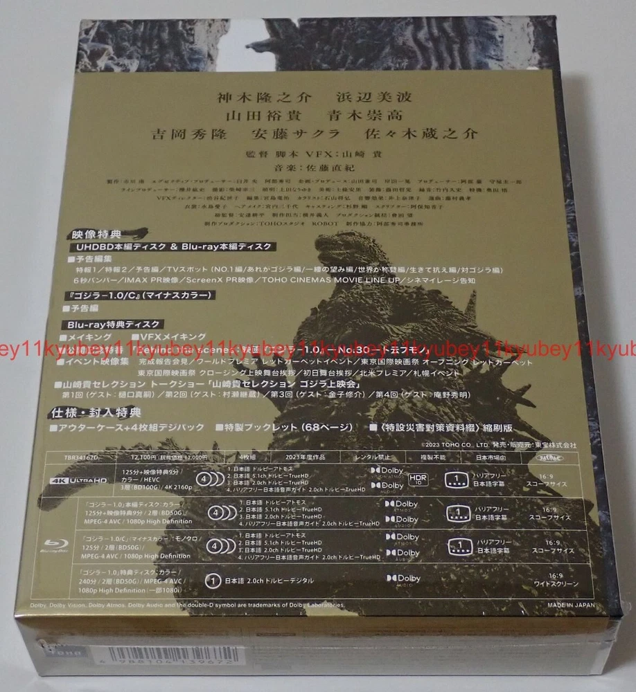 Description Condition : Brand New / Factory Sealed Release Date : May.1.2024 Region Code : Free Language : Japanese Subtitles : None Text : Japanese Disc : 4 (Blu-ray) Time : This item is First Limited Edition. [First Limited Edition Benefits] ・ 4K Ultra HD Blu-ray × 1 ・ Blu-ray × 3 ・ Special booklet ・ Outer case ・ Special disaster countermeasure materials Reduced edition [Spec/Bonus] - 4-disc digipak + Outer case - Special booklet - <Special disaster countermeasure materials> Reduced edition 4K UHD Blu-ray release of "Godzilla Minus One (Godzilla -1.0)", a 2023 Japanese sci-fi action film directed, written, and with visual effects by Takashi Yamazaki. It is Toho's 33rd Godzilla film and stars Ryunosuke Kamiki. In the film, postwar Japan deals with the emergence of Godzilla... [Main story DISC① 4K Ultra HD Blu-ray] Main story 125 minutes / 3 layers (100G) / 4K 2160p 16:9 Scope size / Dolby Vision Audio: (1) Japanese Dolby Atmos (2) Japanese 5.1ch Dolby TrueHD (3) Japanese 2.0ch Dolby TrueHD (4) Barrier-free Japanese audio guide 2.0ch Dolby TrueHD Subtitles: Barrier-free Japanese subtitles [Main story DISC② Blu-ray] Main story 125 minutes / Trailer editing / 2 layers (BD50G) / 1080p High Definition 16:9 Scope size Audio: (1) Japanese Dolby Atmos (2) Japanese 5.1ch Dolby TrueHD (3) Japanese 2.0ch Dolby TrueHD (4) Barrier-free Japanese audio guide 2.0ch Dolby TrueHD Subtitles: Barrier-free Japanese subtitles [“Godzilla-1.0/C” main story DISC③ Blu-ray] Main story 125 minutes / "Godzilla-1.0/C" trailer / 2 layers (BD50G) / 1080p High Definition 16:9 Scope size Audio: (1) Japanese Dolby Atmos (2) Japanese 5.1ch Dolby TrueHD (3) Japanese 2.0ch Dolby TrueHD (4) Barrier-free Japanese audio guide 2.0ch Dolby TrueHD Subtitles: Barrier-free Japanese subtitles [Bonus DISC Blu-ray] Recording length: Undetermined / 2 layers (BD50G) / 16:9 / 1080p High Definition (some 1080i) Audio: Japanese 2.0ch Dolby Digital <Contents (Bonus DISC)> ■Making ■VFX making ■Release commemoration special program Behind the scenes -No.30-Tounfumono'' ■Event video collection Monday, September 4, 2023: Completion report press conference Wednesday, October 18, 2023: World Premiere Red Carpet Event Monday, October 23, 2023: Tokyo International Film Festival Opening Red Carpet Wednesday, November 1, 2023: Tokyo International Film Festival Closing Screening Stage Greetings November 3, 2023 (Friday/Holiday): Opening day stage greeting Wednesday, November 8, 2023 - Friday, November 10, 2023: North American Premiere Wednesday, November 29, 2023: Sapporo event ◇Takashi Yamazaki Selection Talk Show Friday, September 15, 2023: “Takashi Yamazaki Selection Godzilla Screening” 1st (Guest: Shinji Higuchi) Friday, September 29, 2023: “Takashi Yamazaki Selection Godzilla Screening” 2nd (Guest: Keizo Murase) Friday, October 13, 2023: “Takashi Yamazaki Selection Godzilla Screening” 3rd (Guest: Shusuke Kaneko) Friday, October 27, 2023: “Takashi Yamazaki Selection Godzilla Screening” 4th (Guest: Hideaki Anno) <Preview editing (main disc ②)> ■Special news 1 and 2 ■Trailer ■TV spot NO.1 edition / That's Godzilla edition / A glimmer of hope / The world praises edition / Live and resist edition / Against Godzilla edition ■6 seconds bumper ■IMAX PR video ■ScreenX PR video ■TOHO CINEMAS MOVIE LINE UP ■Cinema erasure announcement Japan after the war. From nothing to negative. <Story> Live and resist. Godzilla suddenly appears in Japan, which has become a scorched earth. Is there a way for the nameless people left behind to survive and fight back? Shipping SHIPPED EXPRESS (EMS) from JAPAN Shipped : World Wide Courier : Japan Post EMS Online Tracking Number : PROVIDED Insurance : PROVIDED Estimated Delivery : 1 week to 2 weeks We will ship this product within 5 business days after the payment is received. Payment Please pay within 5 days after auction is finished. About Us Our Products are 100% Authentic. I promise to pack up the product very carefully. Although slight costs start for that purpose, I do some shopping to you in comfort, and want you to enjoy the product. If you have any question,please contact me. Happy Bidding!!