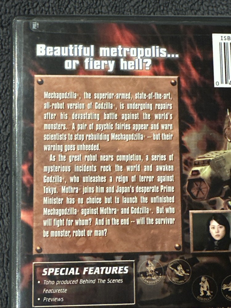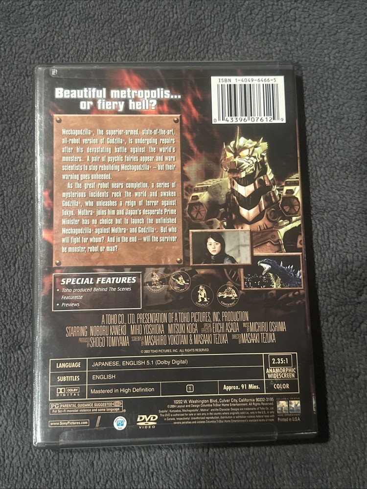 This is the fifth Godzilla of the Millennium Series, Godzilla Tokyo SOS. This is a dvd that allows you so switch languages. You can watch it in Japanese with English Subtitles or you can watch it dubbed in English. This movie is a sequel to Godzilla Against Mechagodzilla. One year after Godzilla’s battle with Mechagodzilla, Godzilla returns and keeps causing more havoc in Japan. Eventually the giant moth, Mothra, arrives to defend Japan from Godzilla. The Japanese military deploys Mechagodzilla to team up with Mothra to defeat Godzilla. If you have any questions, please feel free to message me. Thank you. Also feel free to make an offer on this item as well and I will decide if it is acceptable or not. Thank you.