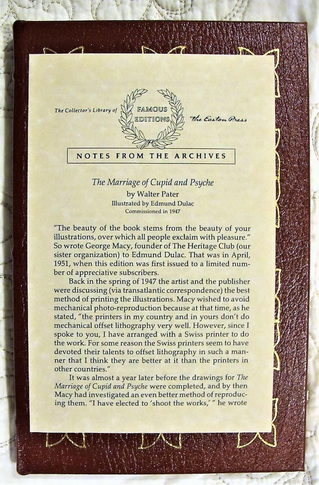 New, unopened, excellent condition. Walter Pater, THE MARRIAGE OF CUPID AND PSYCHE, Easton Press, 1996. The Notes from the Archives and new unattached book plate are included. Shipped with USPS Media Mail.