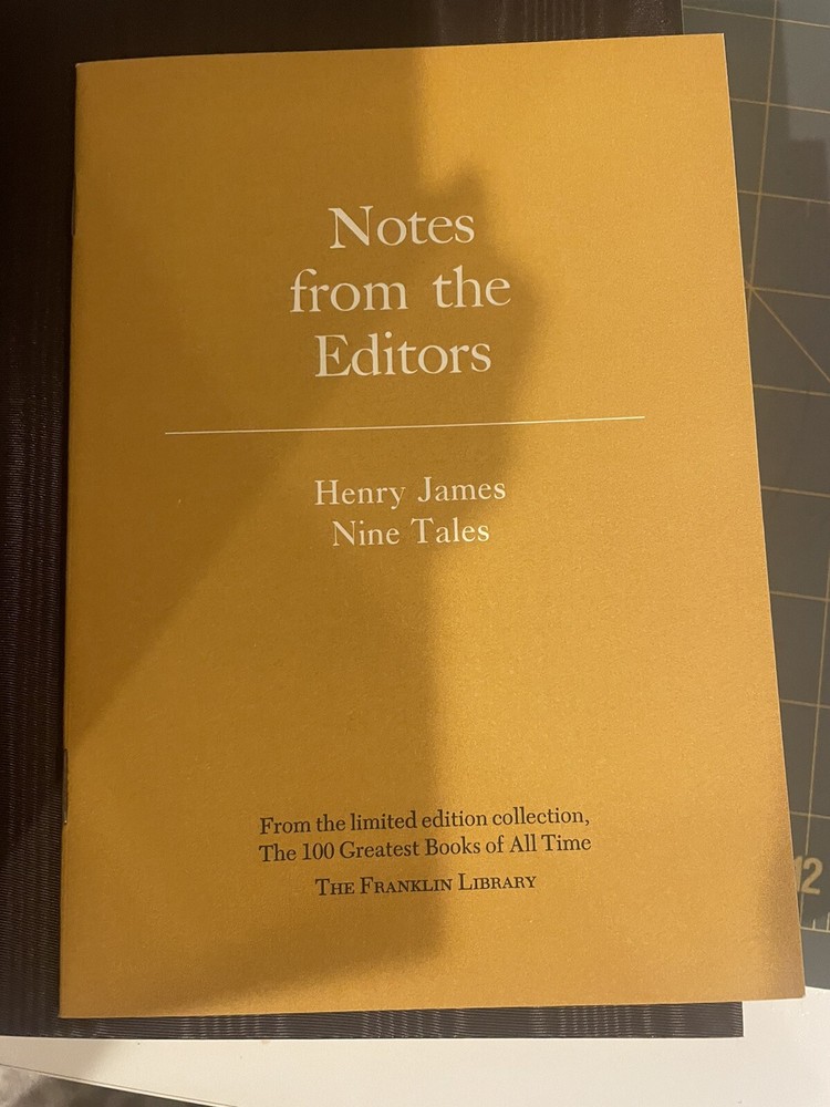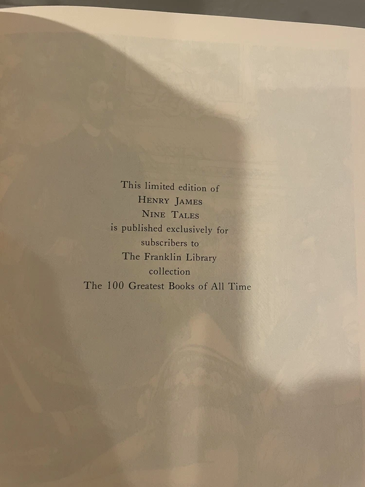 This is a limited edition leather-bound book by Henry James titled "Nine Tales". The book was printed in 1977 by Franklin Library and is a great addition to any literature collection. The book features stories by the renowned author and is printed in English. It is a must-have for any book collector or enthusiast. The book comes with an insert for added value. Smoke free home. I combine shipping, like new. (Nancy 28)