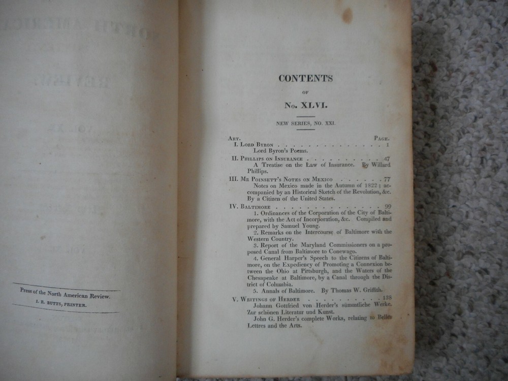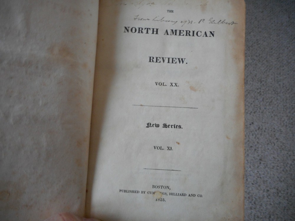 The North American Review Vol.XX m New Series Vol. XI . 491 pages , foxing . Tear/loss to last end paper . Contents reference No. XLVI , New Series No. XXI . Included in this issue : Lord Byron ; Baltimore ; Lafayette , in French language ; Pickering's Report ; Emigration to Africa and Hayti (sic) ; Escalala , An American Tale, by Samuel B. Beach ; and Critical Notices of History of Philadelphia , Russell on Crimes , General Hull's Memoirs , the Auction System and more .