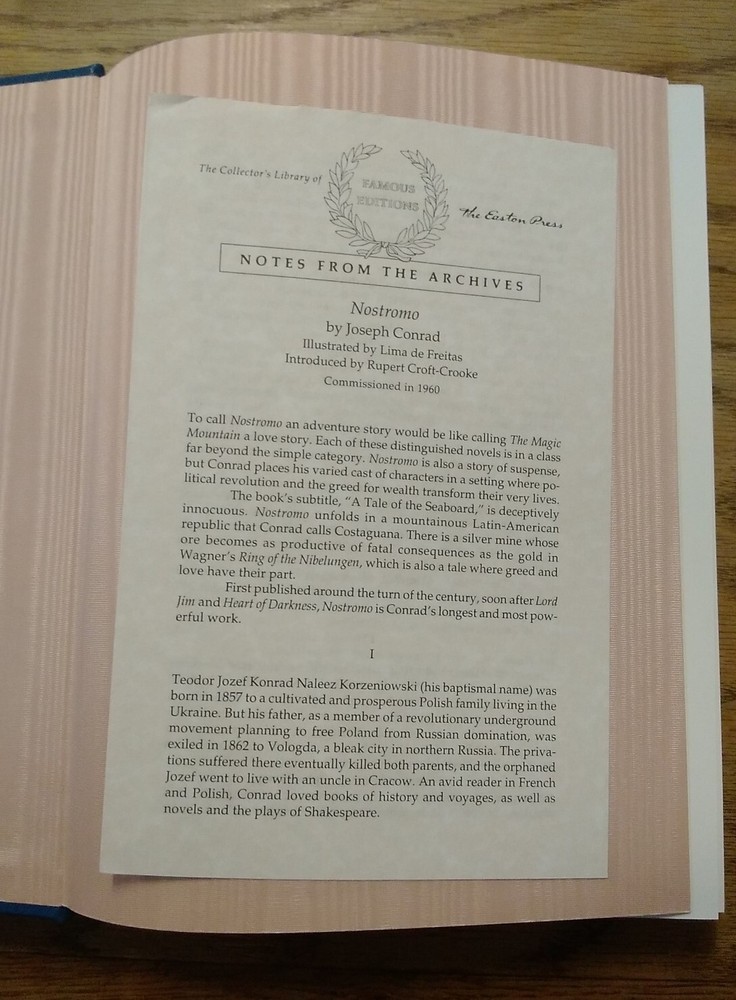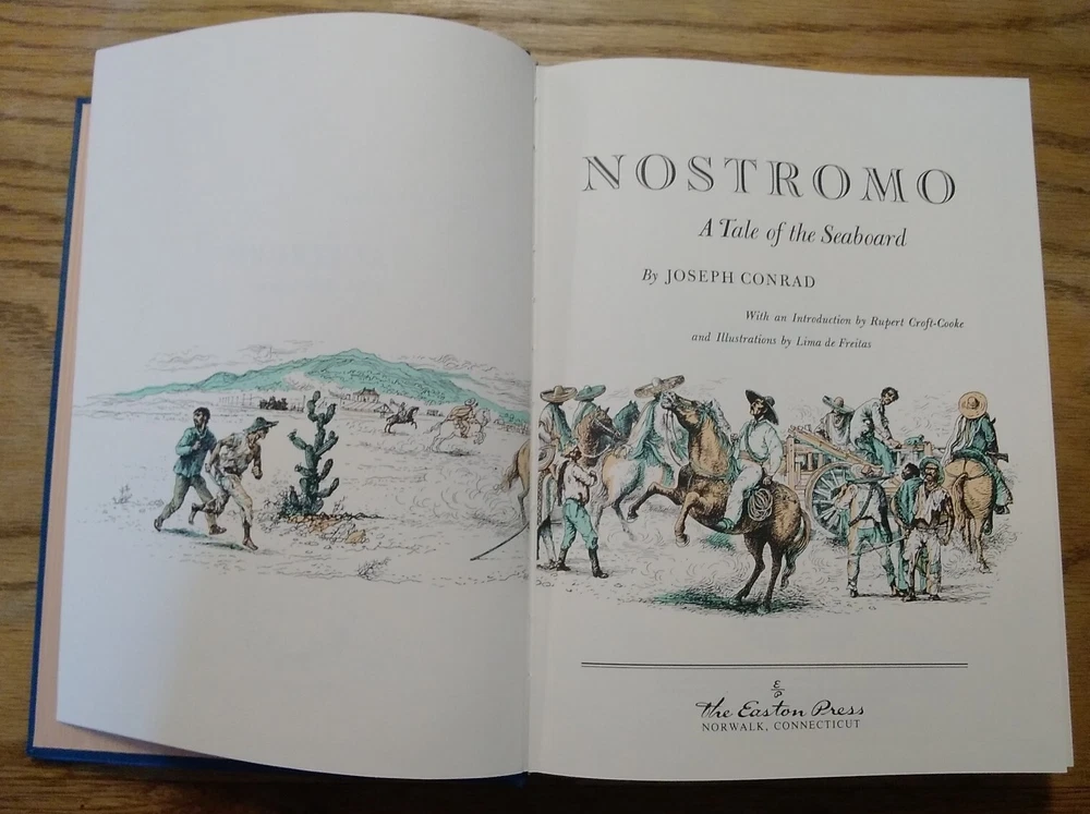 Nostromo by Joseph Conrad, Easton Press Famous Editions, 1994. Leather-bound collector's edition copy of Joseph Conrad's classic novel Nostromo, originally released in 1904. It is Conrad's longest work and features illustrations by Lima de Freitas. This book is like new.