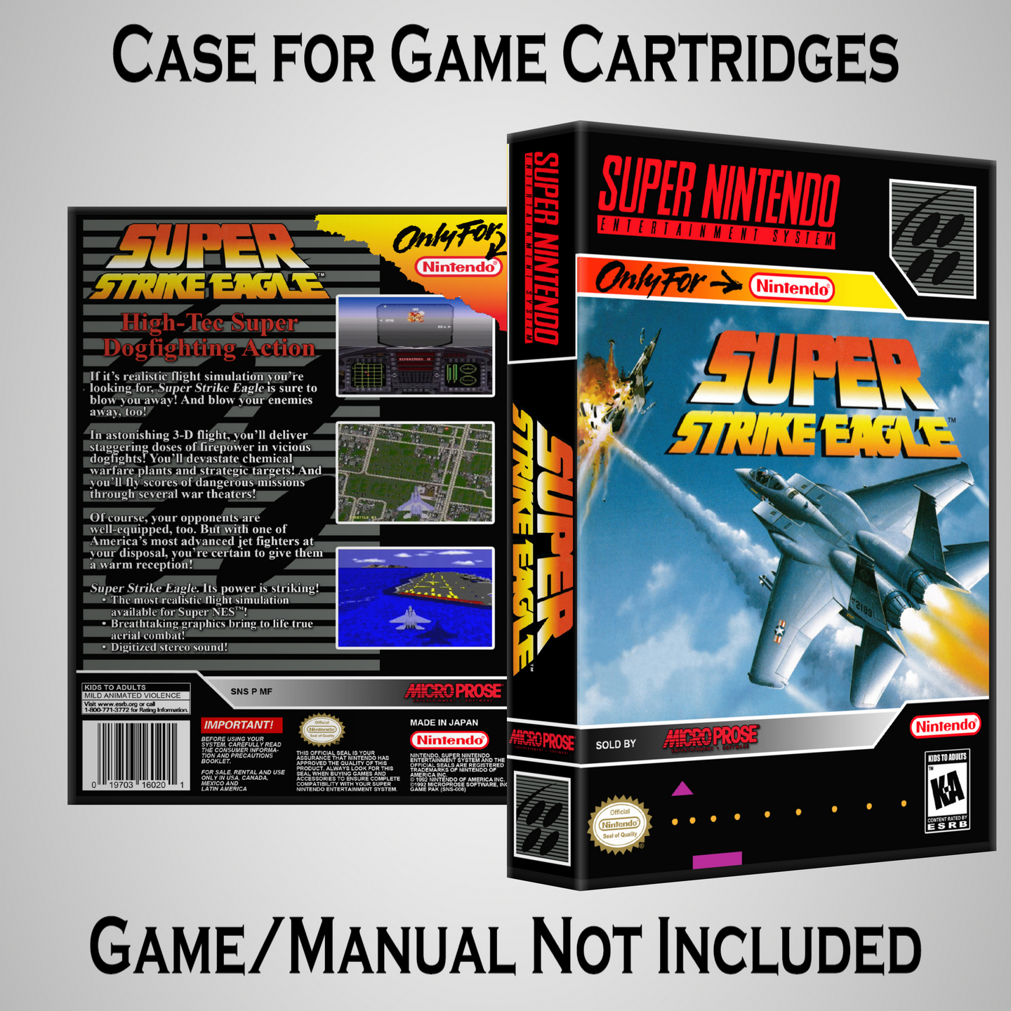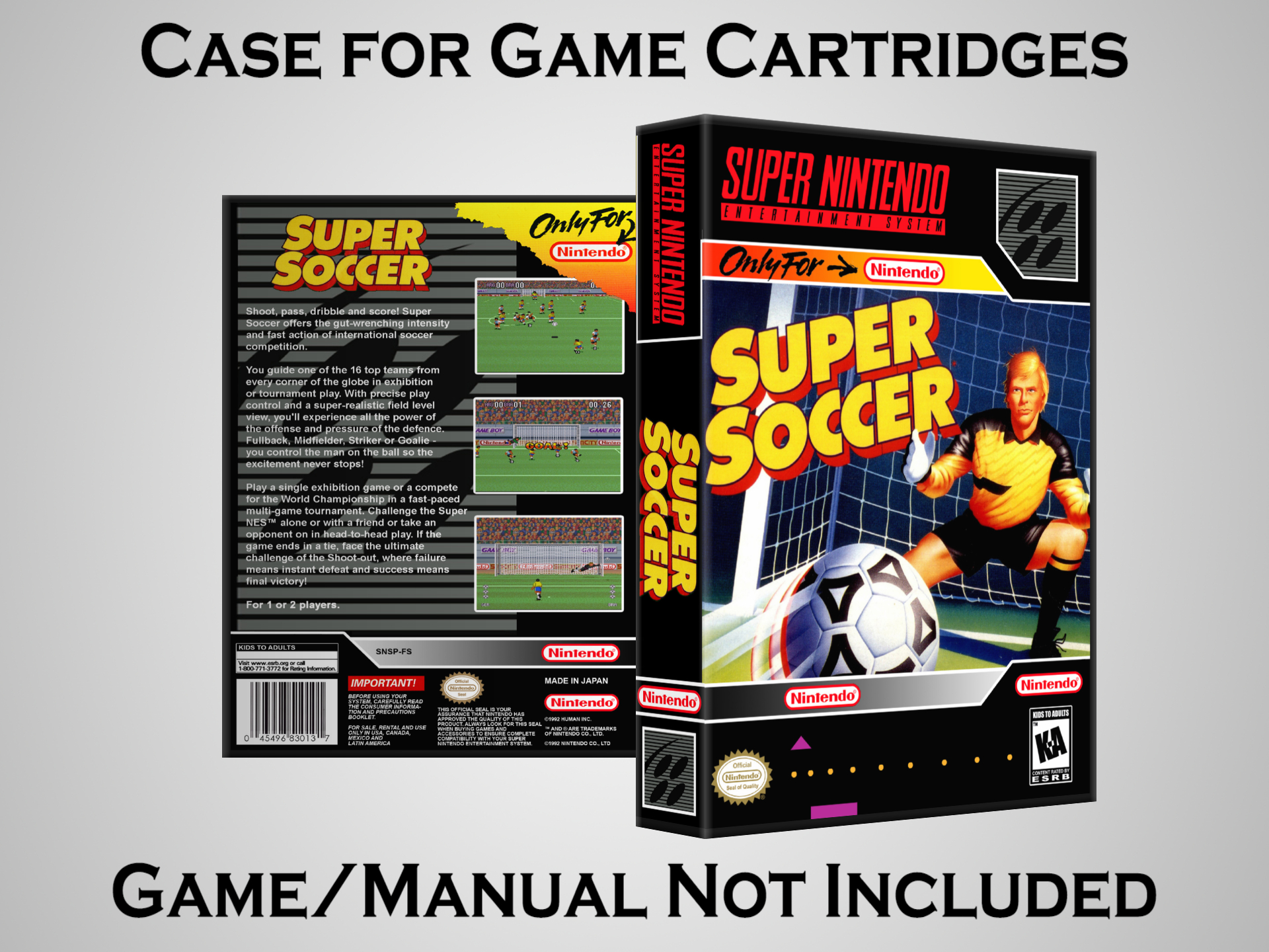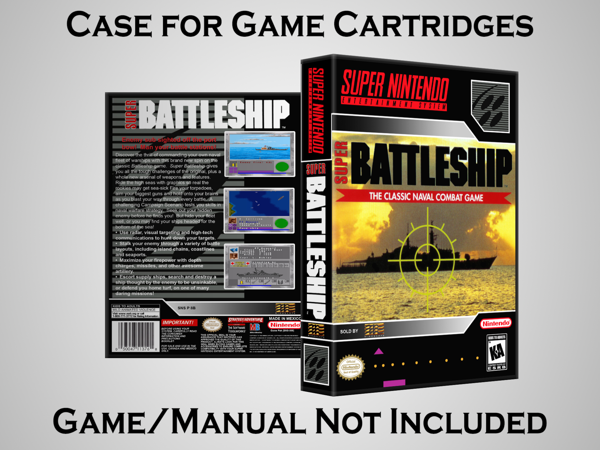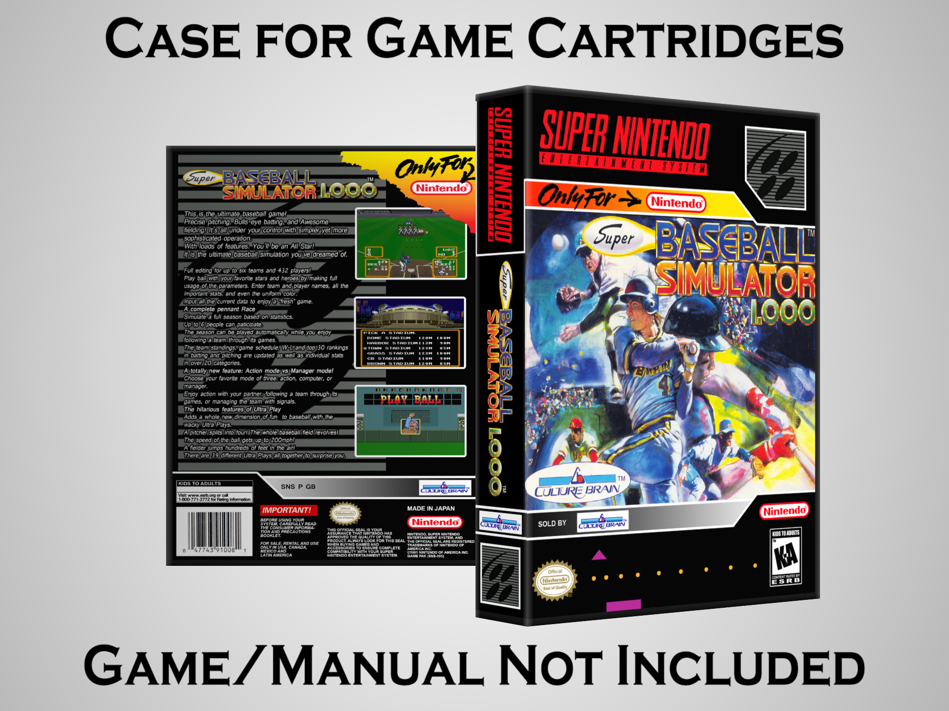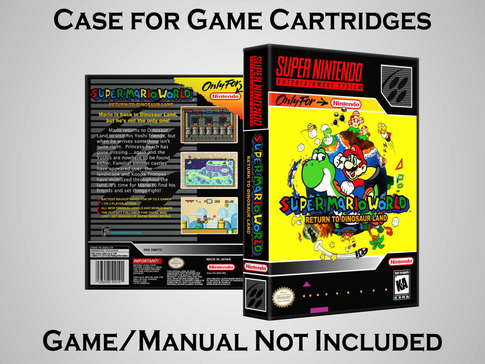 NO GAME OR MANUAL IS INCLUDED! This is NOT an original cardboard box. Case Dimensions : 7.25" x 5.25" x 1.125" Case Color : Dark Grey These cases are designed specifically to hold your Super Nintendo (SNES) cartridges. These are not the low quality Universal Game Cases that most other sellers offer. These firmly hold your cartridges in place, and include clips on the opposite side to hold the instruction manuals if you have them. Our Super Nintendo cases are split into multiple listings alphabetically due to the limit on options in one listing. You can find the rest of our cases in the following links: SNES Cases from # to F SNES Cases from G to N SNES Cases from O to S SNES Cases from T to Z Click here to find more cases in our eBay store!