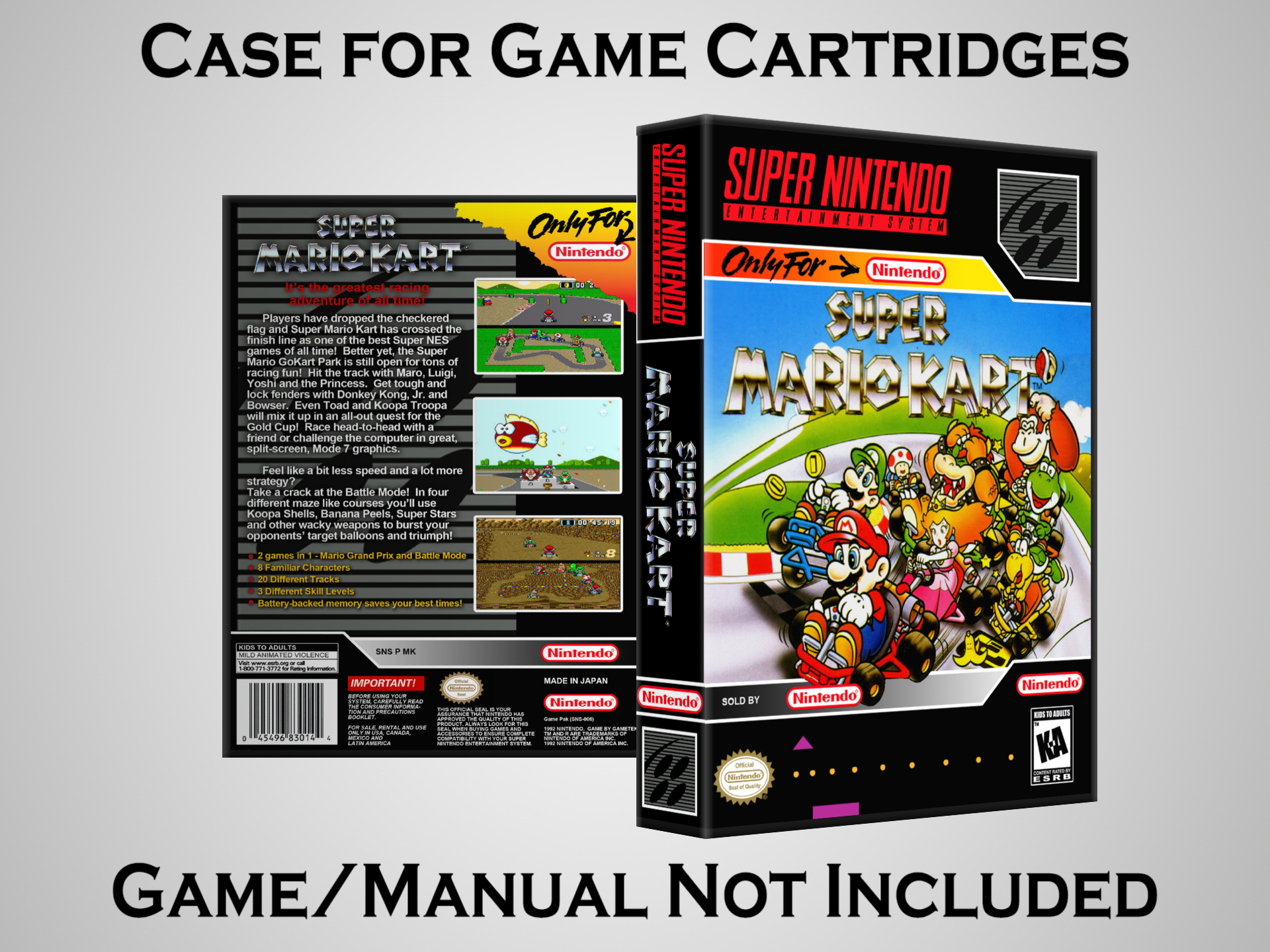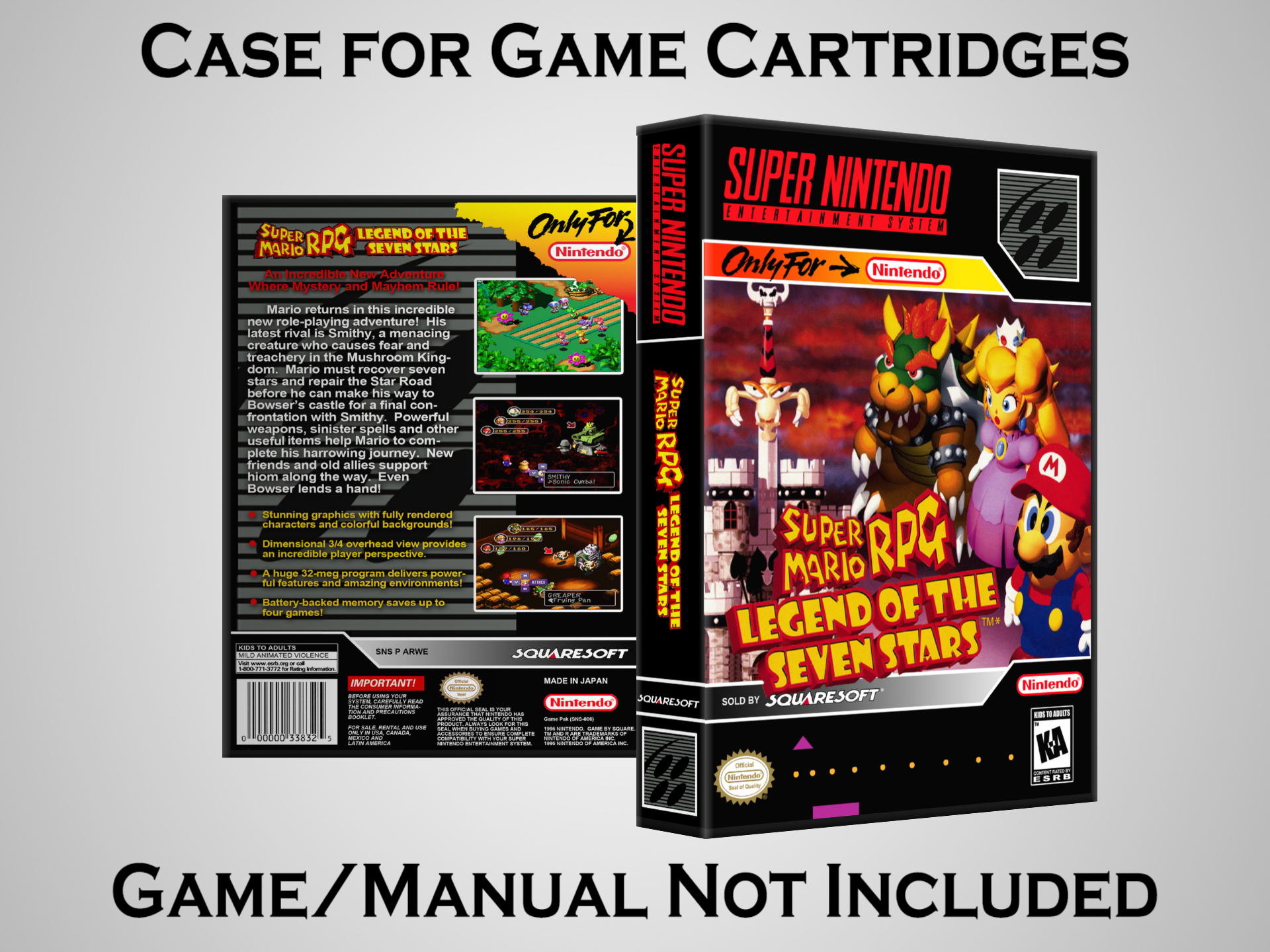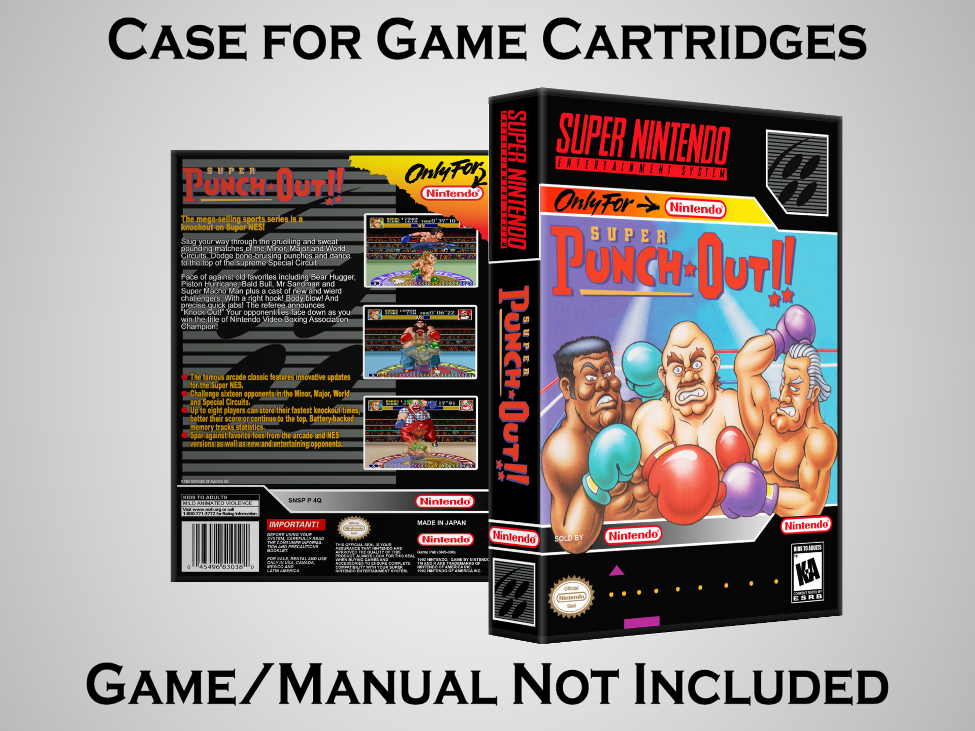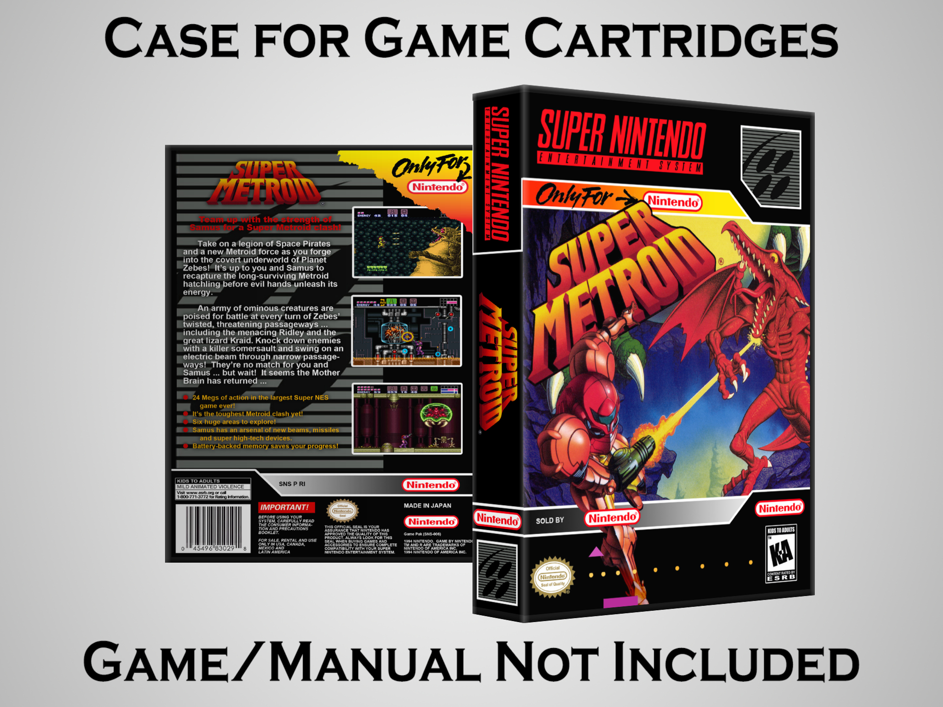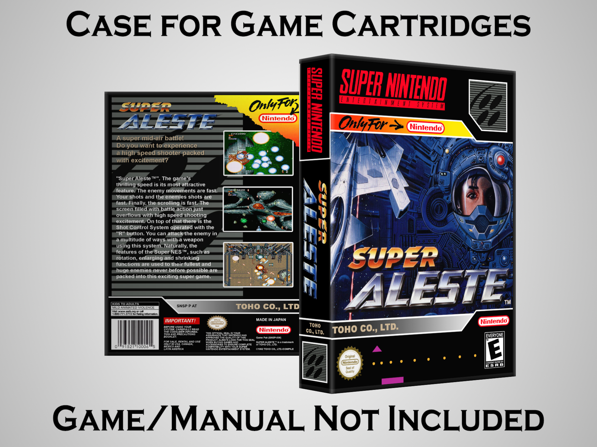 NO GAME OR MANUAL IS INCLUDED! This is NOT an original cardboard box. Case Dimensions : 7.25" x 5.25" x 1.125" Case Color : Dark Grey These cases are designed specifically to hold your Super Nintendo (SNES) cartridges. These are not the low quality Universal Game Cases that most other sellers offer. These firmly hold your cartridges in place, and include clips on the opposite side to hold the instruction manuals if you have them. Our Super Nintendo cases are split into multiple listings alphabetically due to the limit on options in one listing. You can find the rest of our cases in the following links: SNES Cases from # to F SNES Cases from G to N SNES Cases from O to S SNES Cases from T to Z Click here to find more cases in our eBay store!