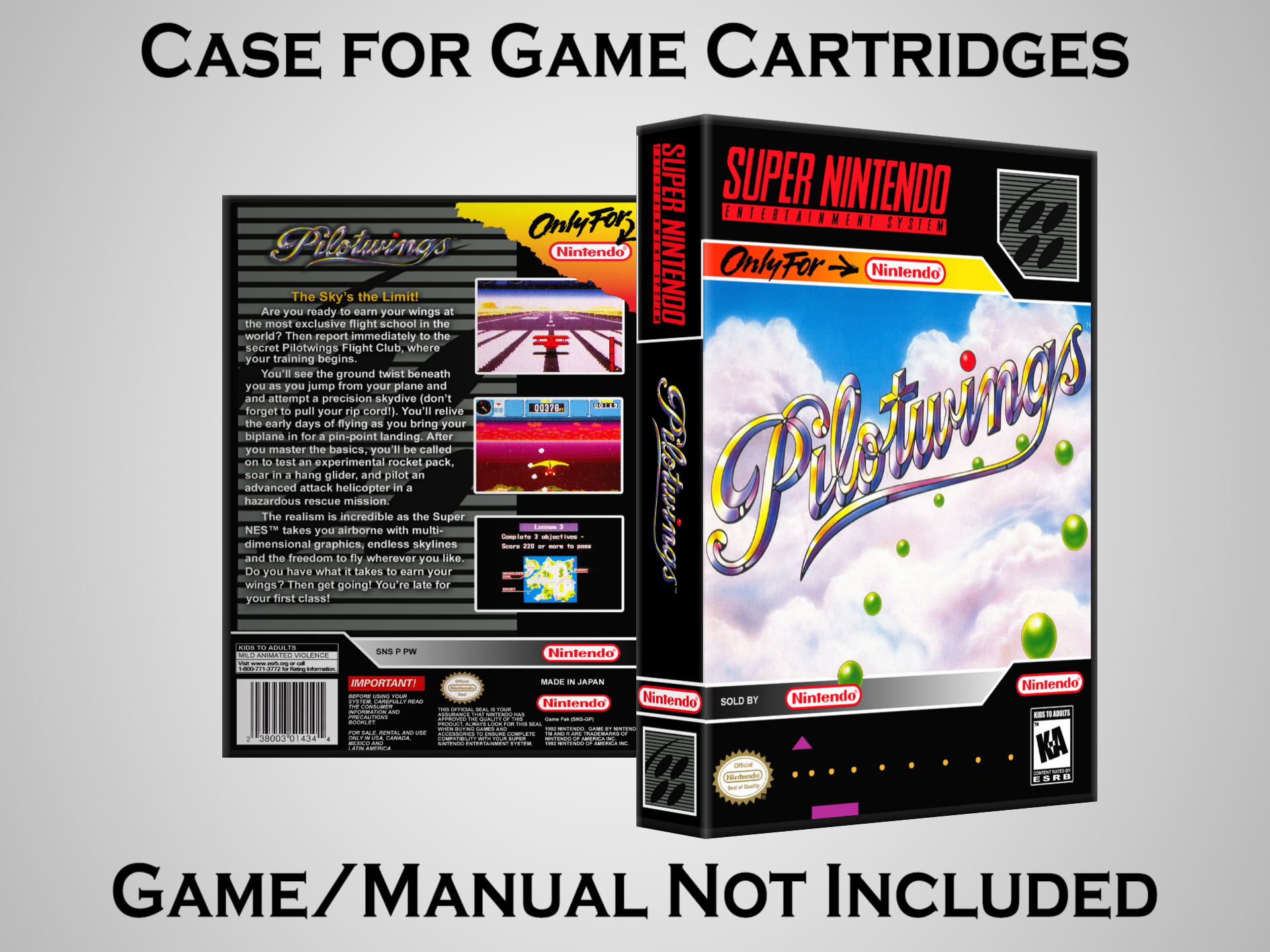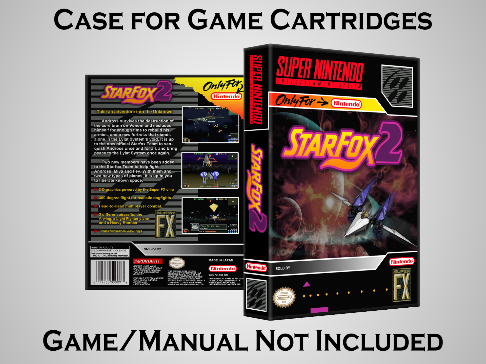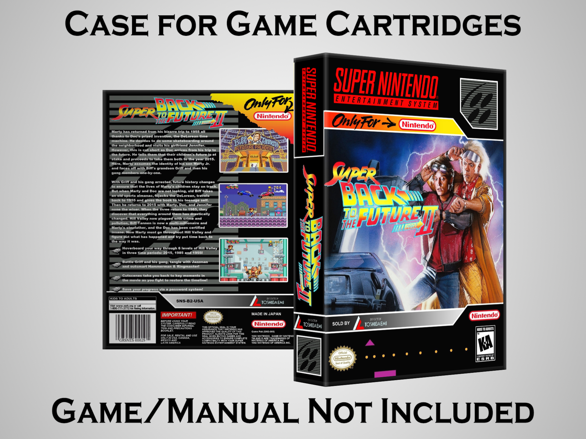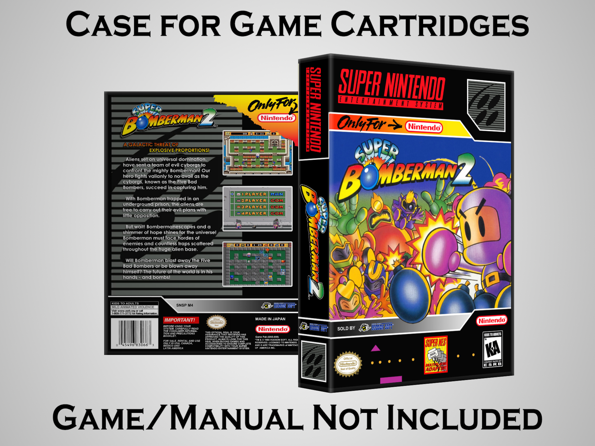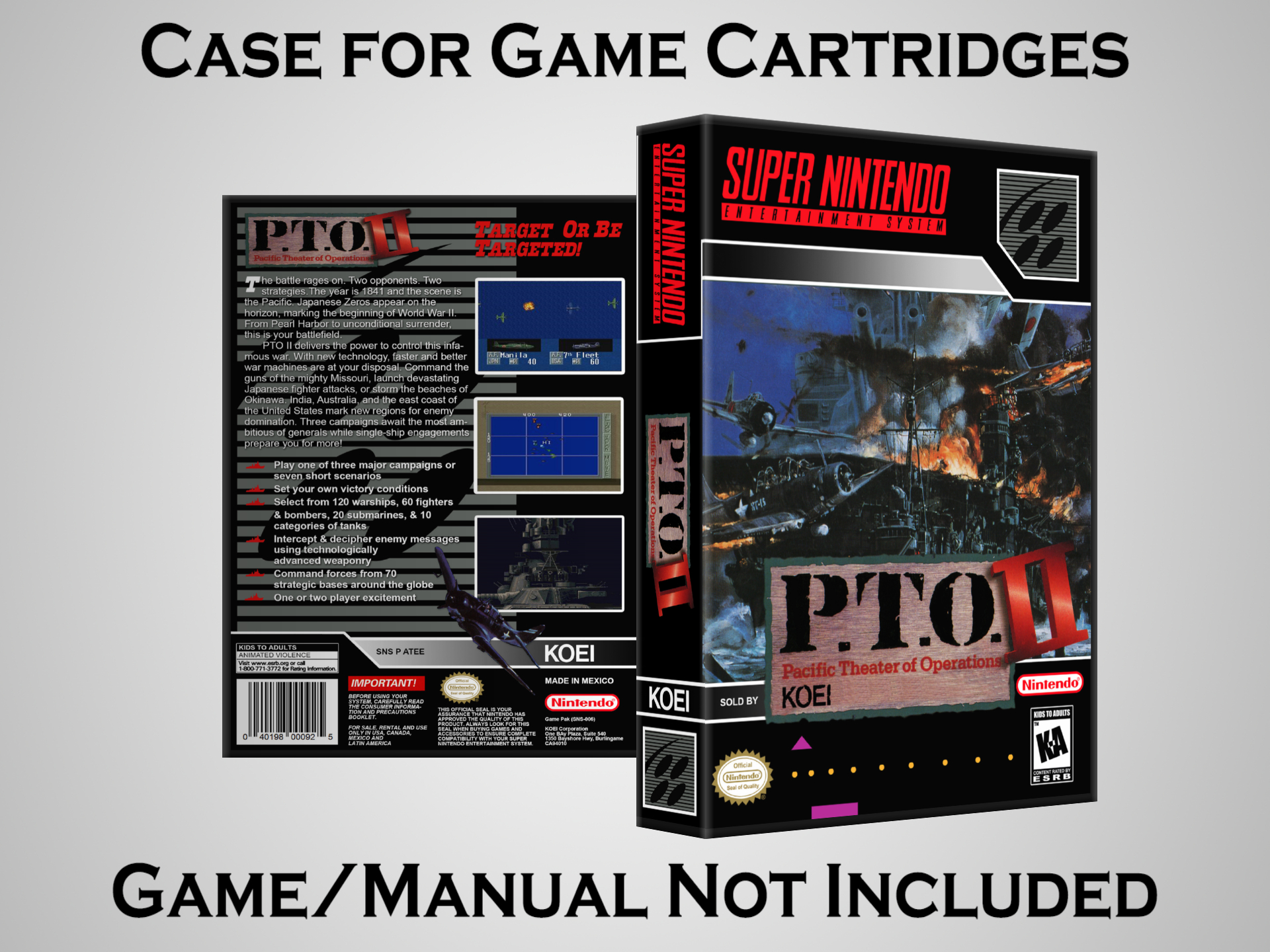 NO GAME OR MANUAL IS INCLUDED! This is NOT an original cardboard box. Case Dimensions : 7.25" x 5.25" x 1.125" Case Color : Dark Grey These cases are designed specifically to hold your Super Nintendo (SNES) cartridges. These are not the low quality Universal Game Cases that most other sellers offer. These firmly hold your cartridges in place, and include clips on the opposite side to hold the instruction manuals if you have them. Our Super Nintendo cases are split into multiple listings alphabetically due to the limit on options in one listing. You can find the rest of our cases in the following links: SNES Cases from # to F SNES Cases from G to N SNES Cases from O to S SNES Cases from T to Z Click here to find more cases in our eBay store!