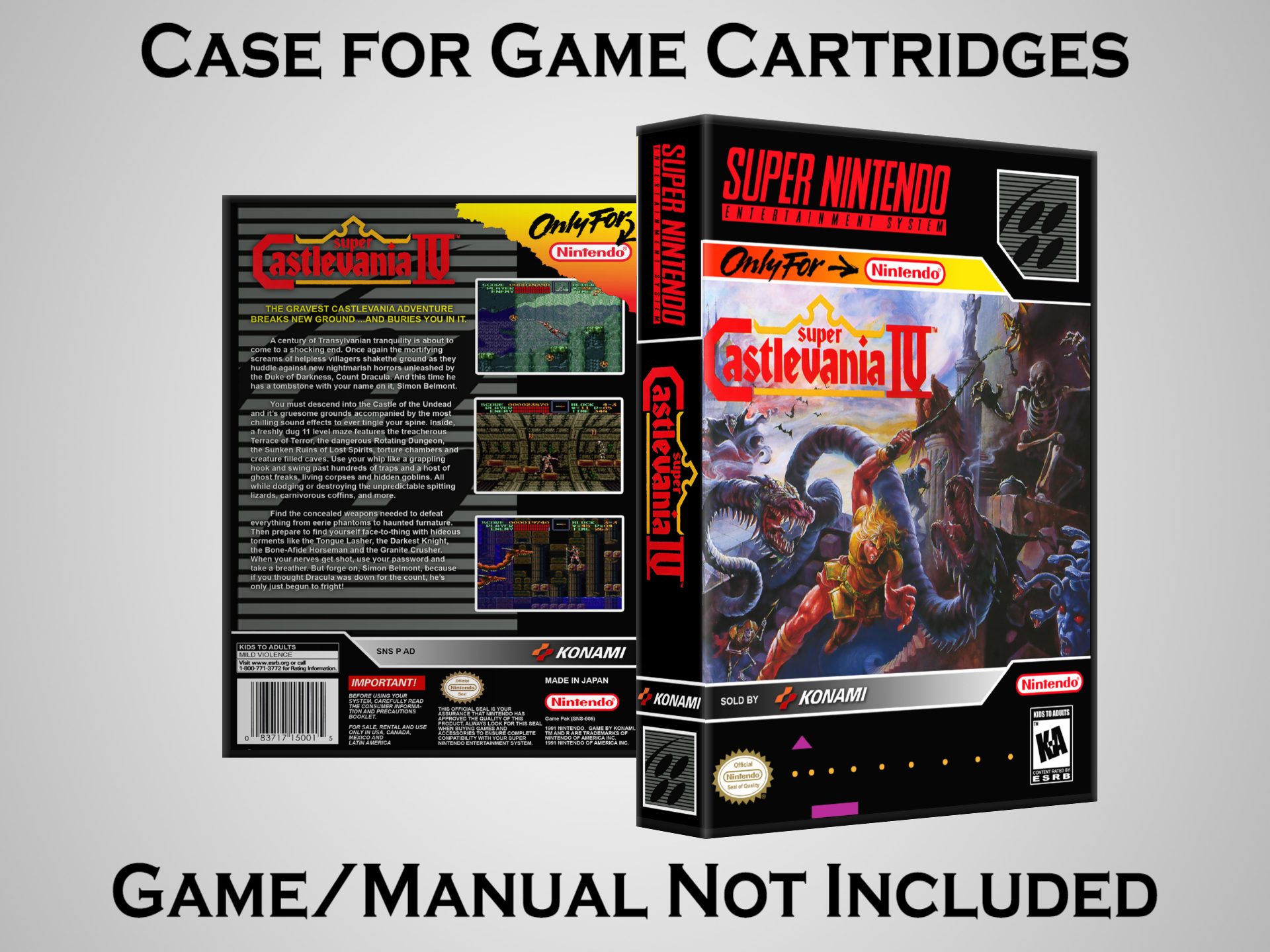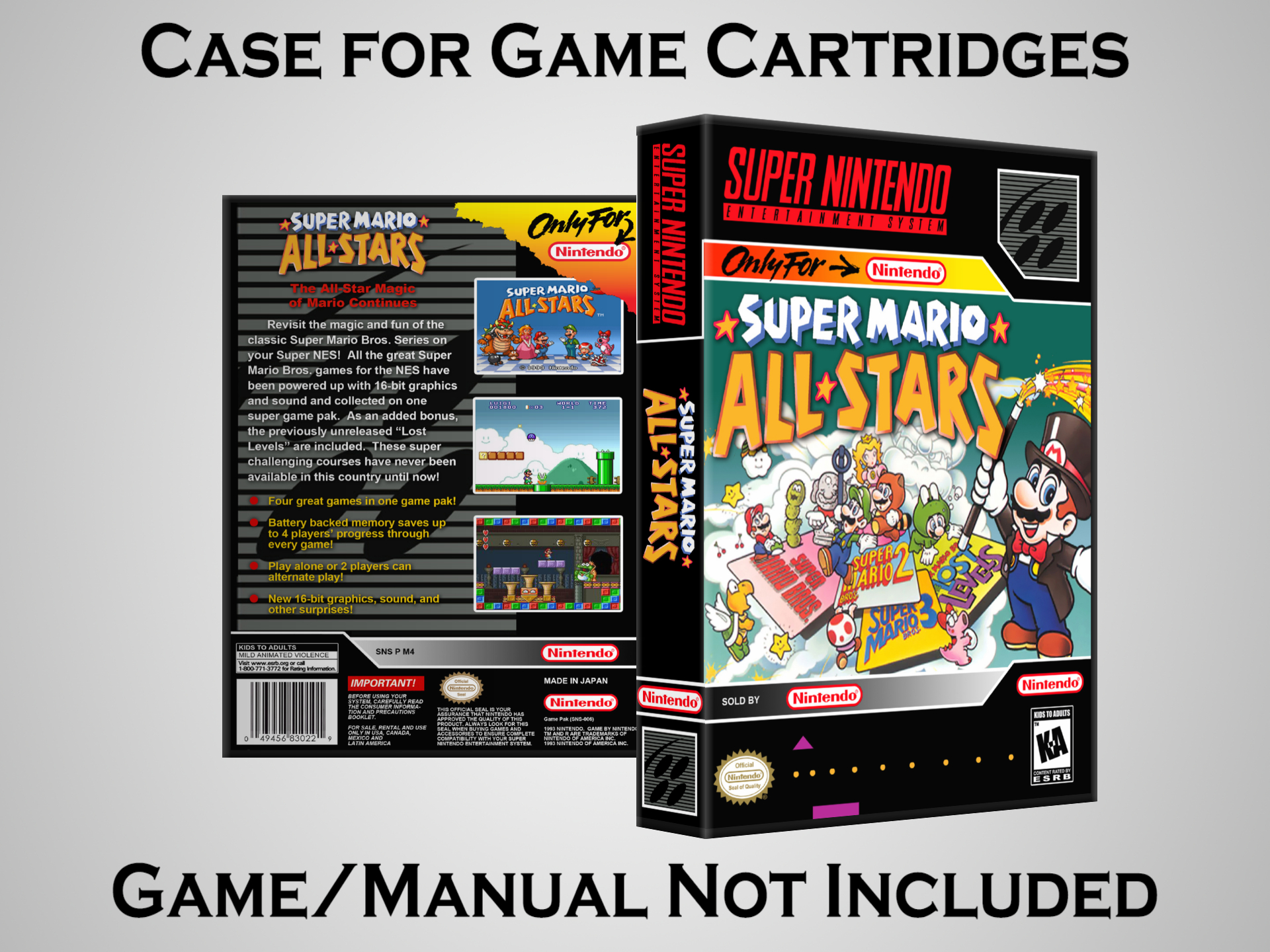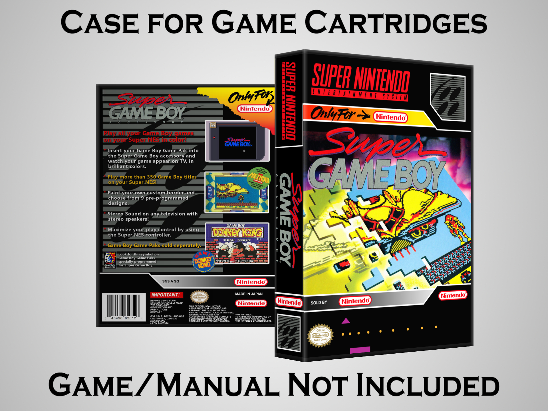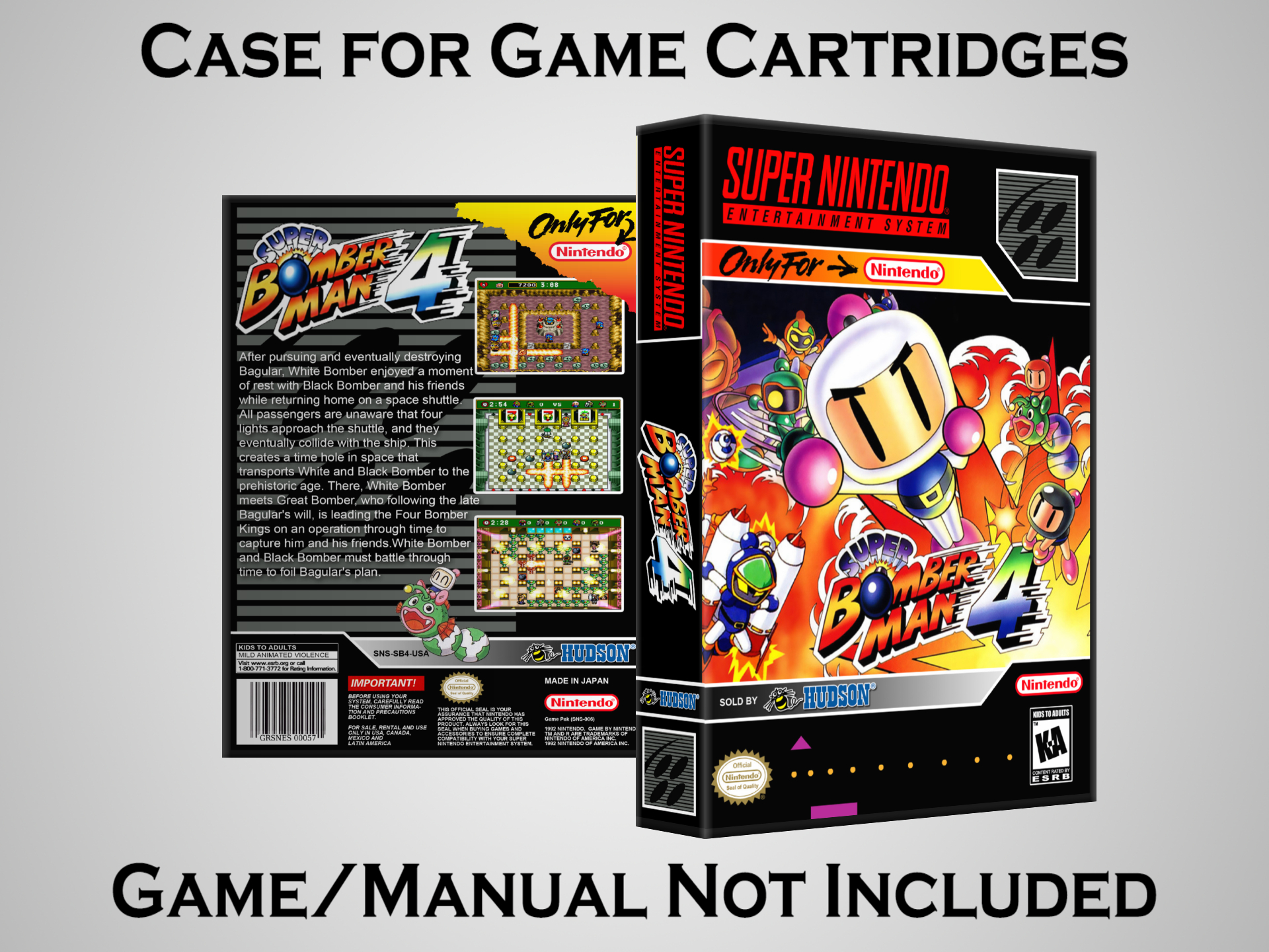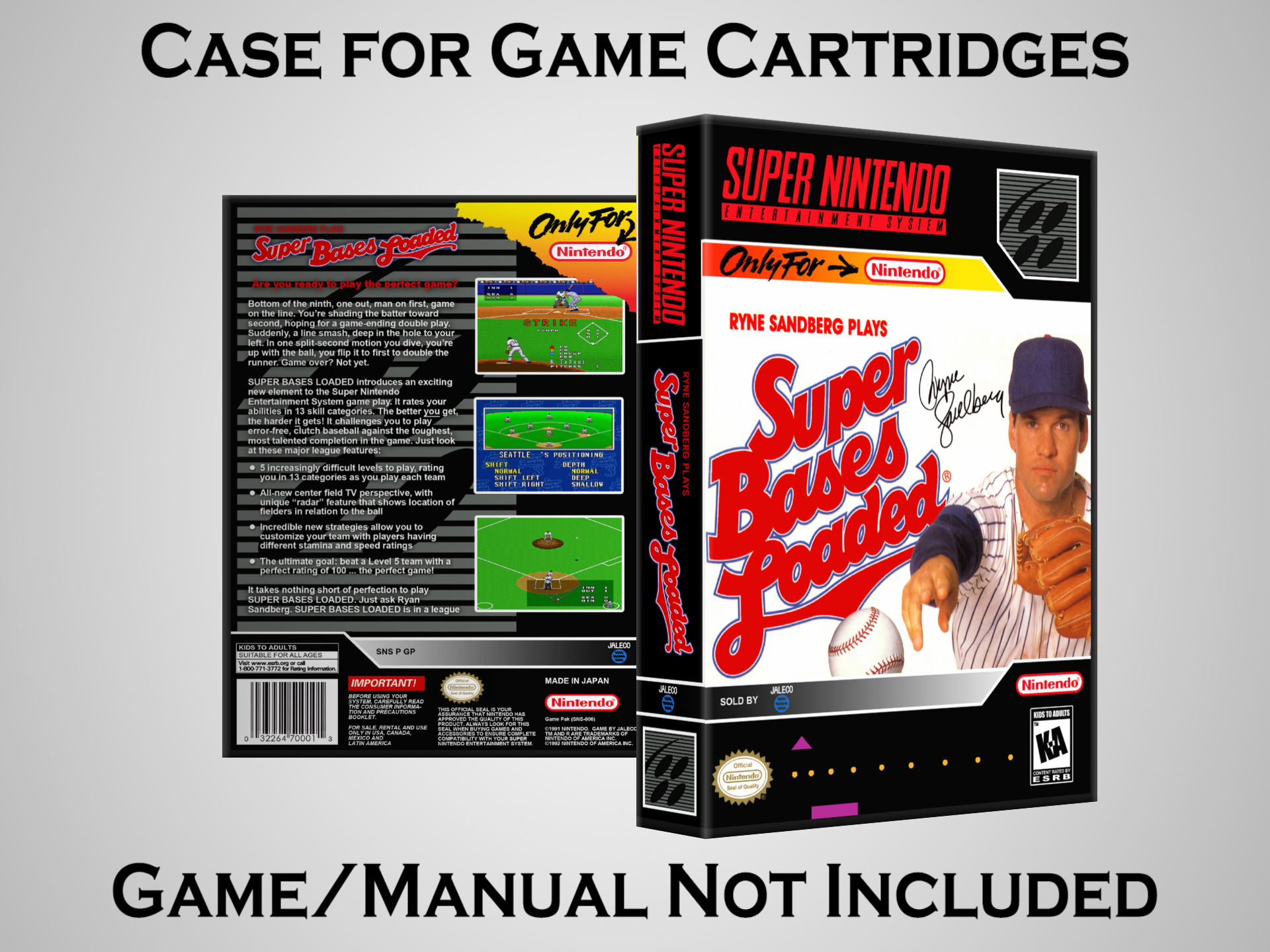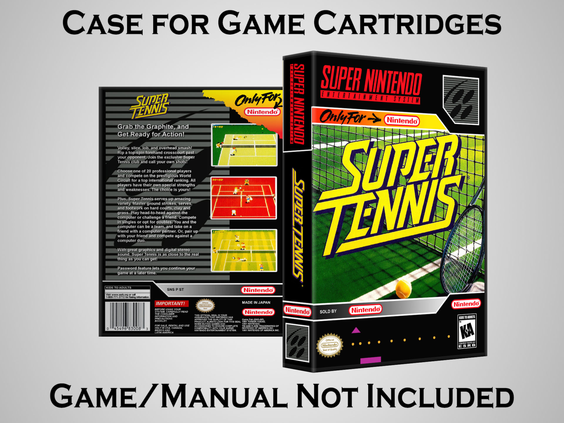 NO GAME OR MANUAL IS INCLUDED! This is NOT an original cardboard box. Case Dimensions : 7.25" x 5.25" x 1.125" Case Color : Dark Grey These cases are designed specifically to hold your Super Nintendo (SNES) cartridges. These are not the low quality Universal Game Cases that most other sellers offer. These firmly hold your cartridges in place, and include clips on the opposite side to hold the instruction manuals if you have them. Our Super Nintendo cases are split into multiple listings alphabetically due to the limit on options in one listing. You can find the rest of our cases in the following links: SNES Cases from # to F SNES Cases from G to N SNES Cases from O to S SNES Cases from T to Z Click here to find more cases in our eBay store!
