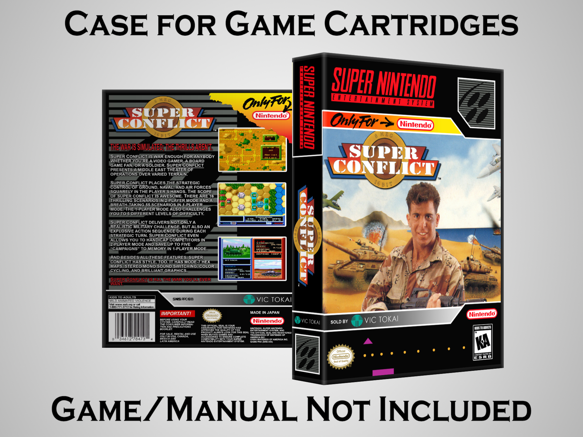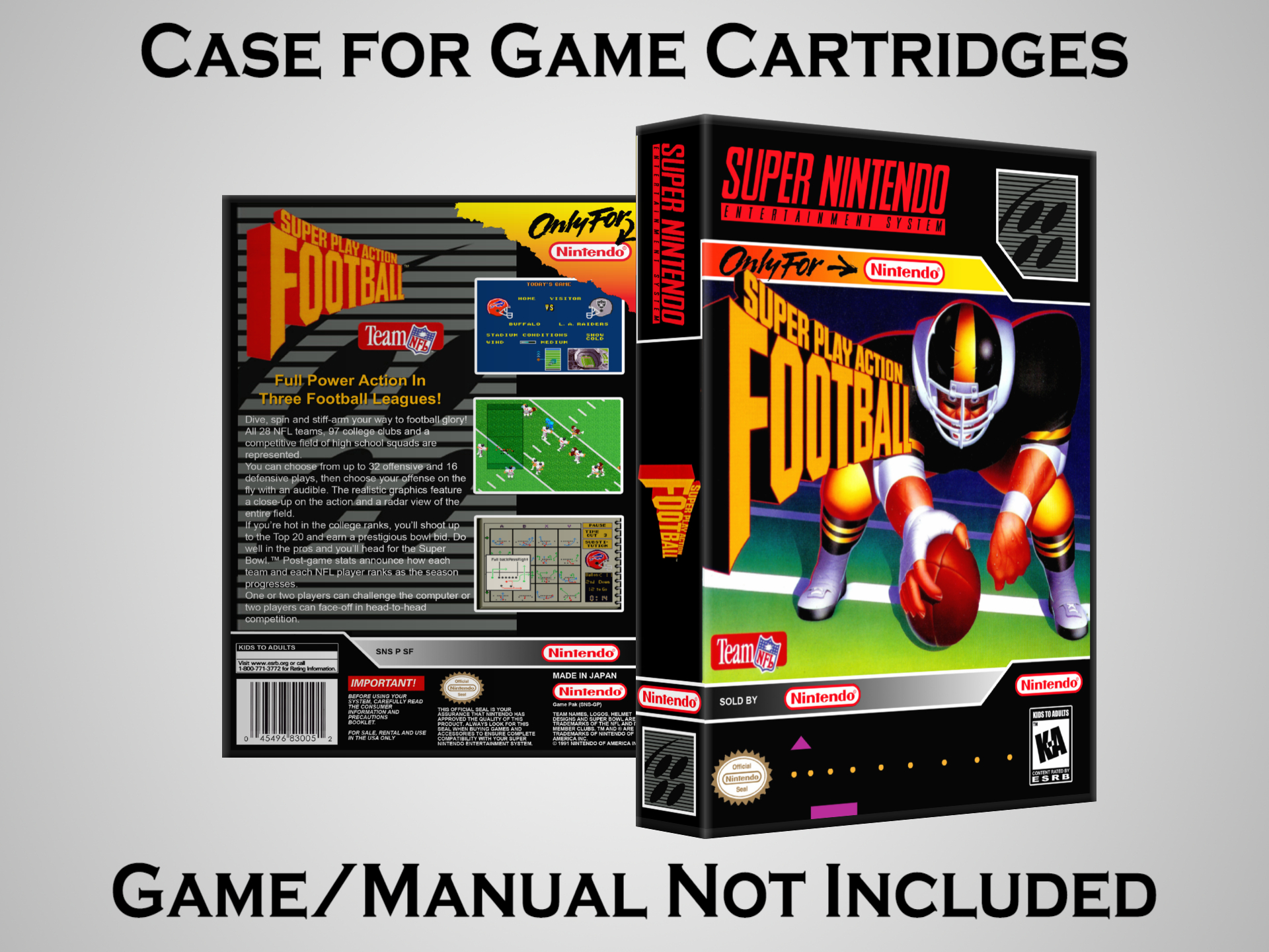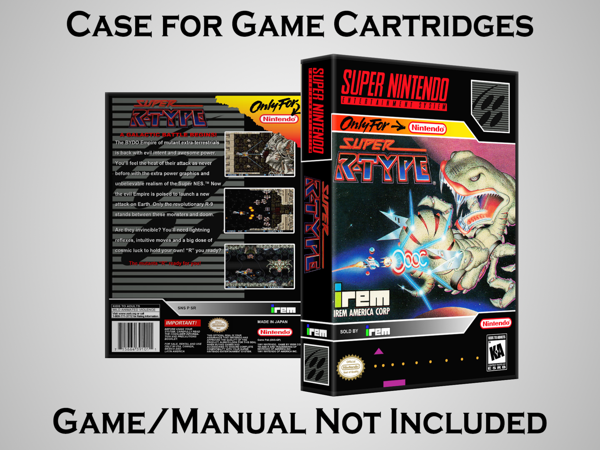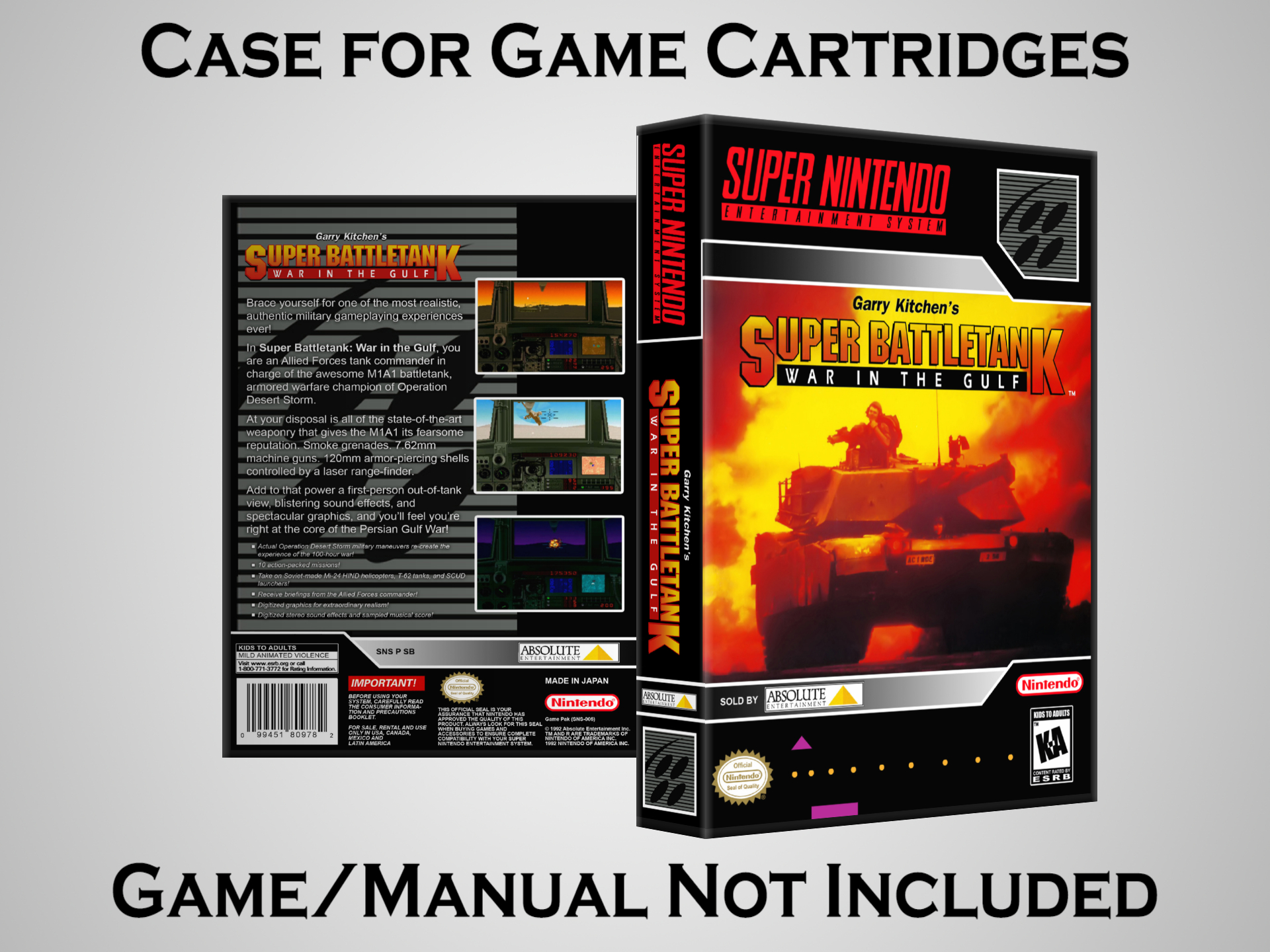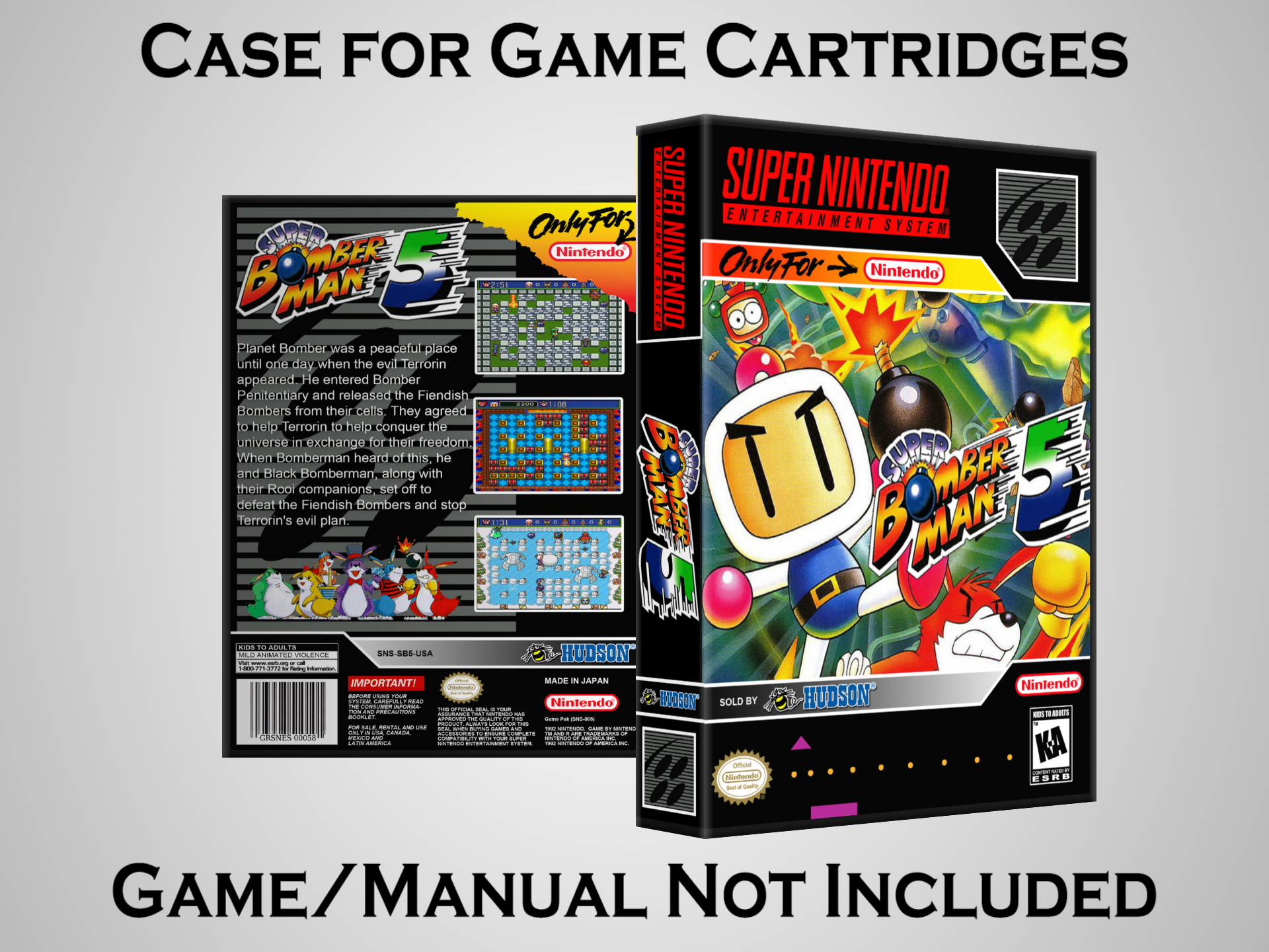 NO GAME OR MANUAL IS INCLUDED! This is NOT an original cardboard box. Case Dimensions : 7.25" x 5.25" x 1.125" Case Color : Dark Grey These cases are designed specifically to hold your Super Nintendo (SNES) cartridges. These are not the low quality Universal Game Cases that most other sellers offer. These firmly hold your cartridges in place, and include clips on the opposite side to hold the instruction manuals if you have them. Our Super Nintendo cases are split into multiple listings alphabetically due to the limit on options in one listing. You can find the rest of our cases in the following links: SNES Cases from # to F SNES Cases from G to N SNES Cases from O to S SNES Cases from T to Z Click here to find more cases in our eBay store!