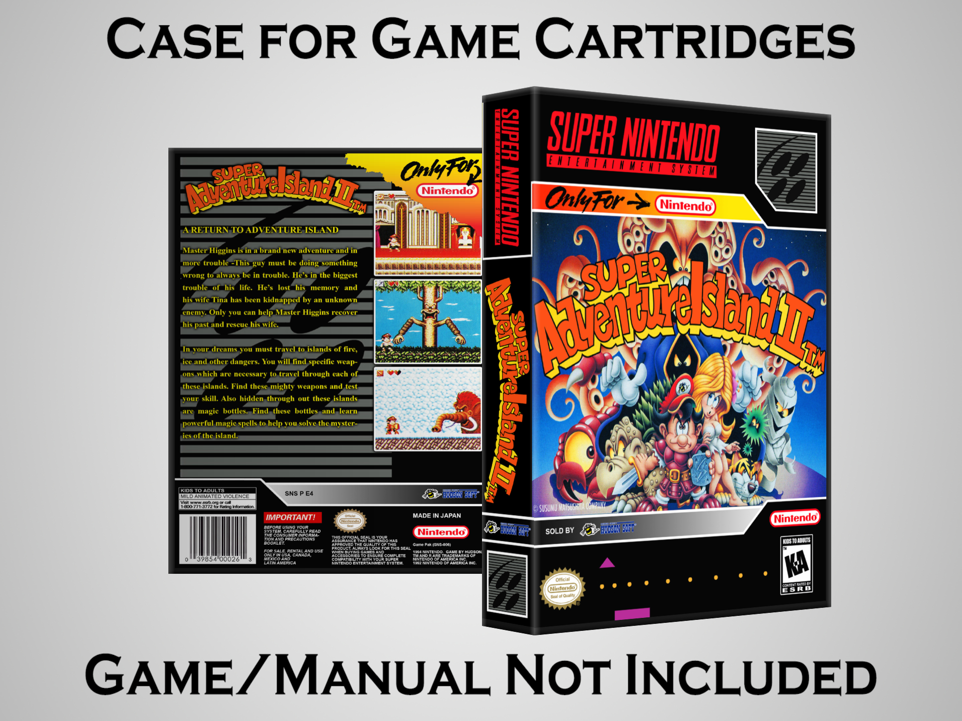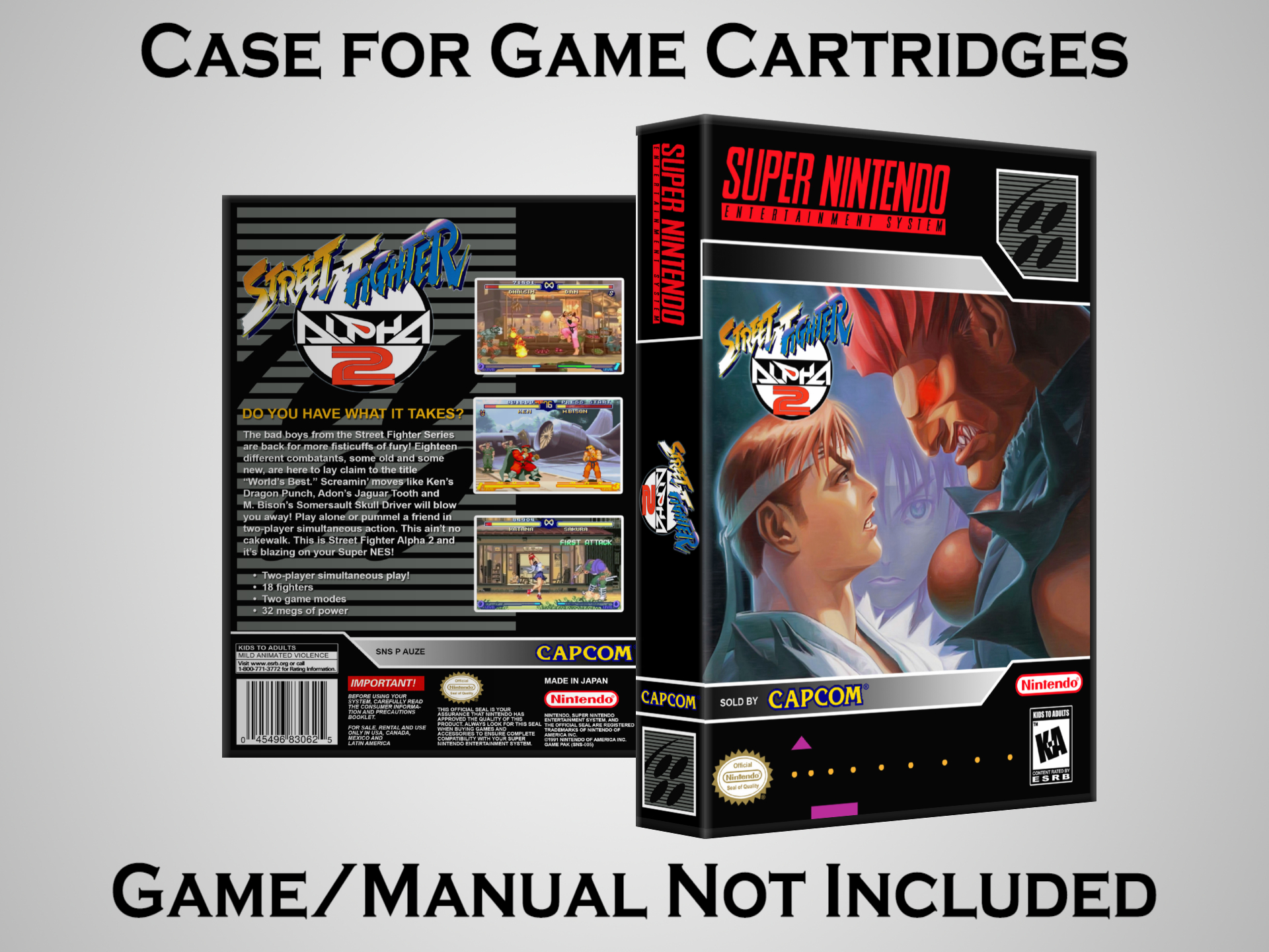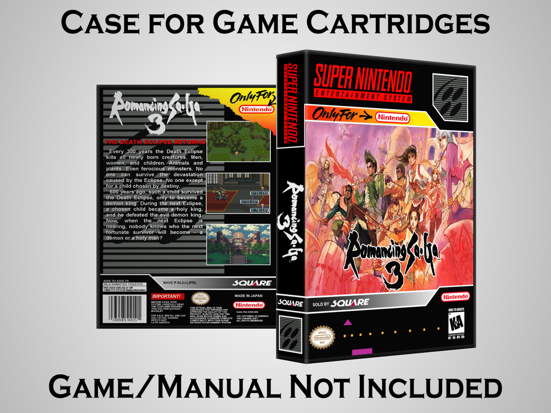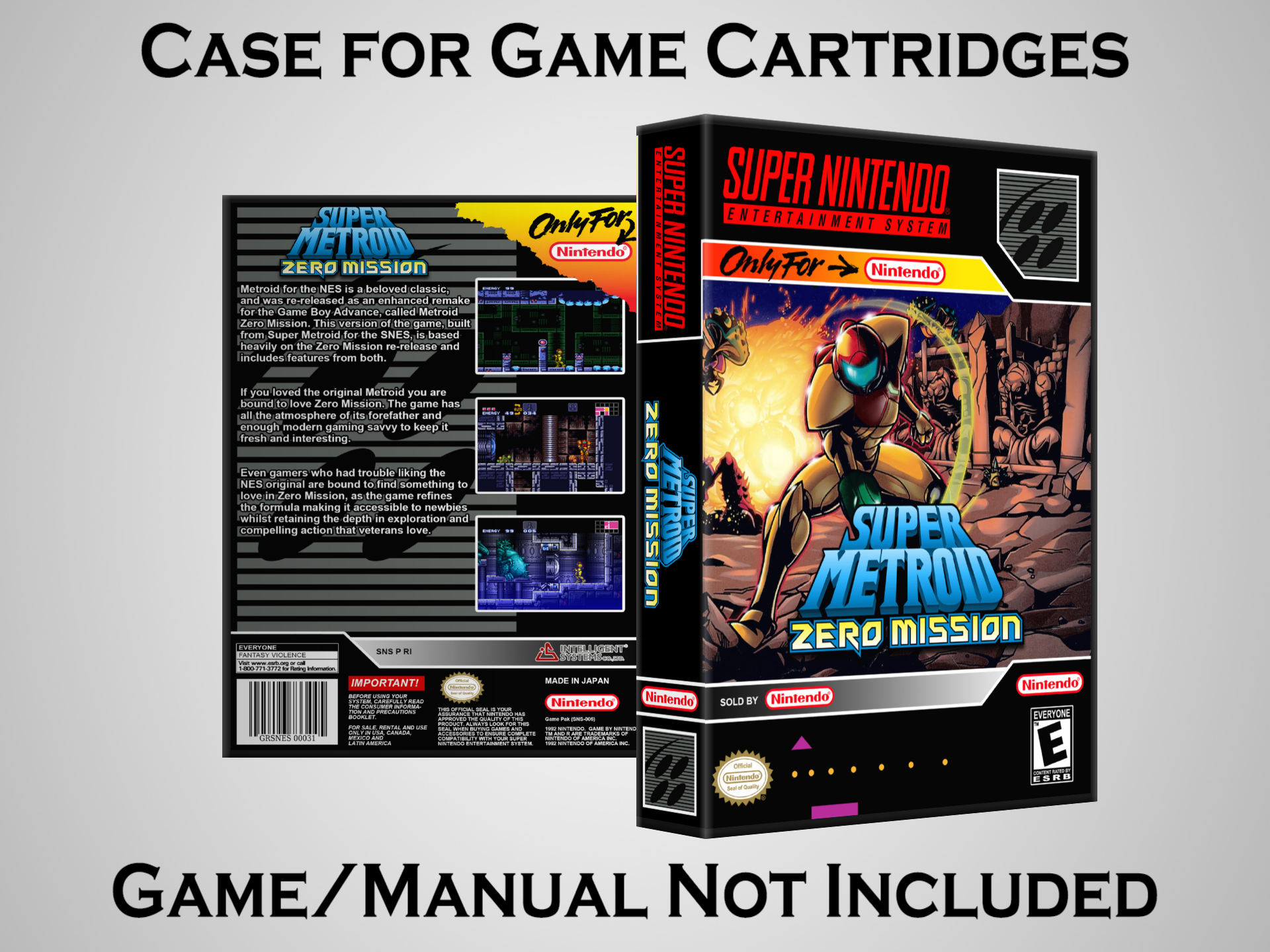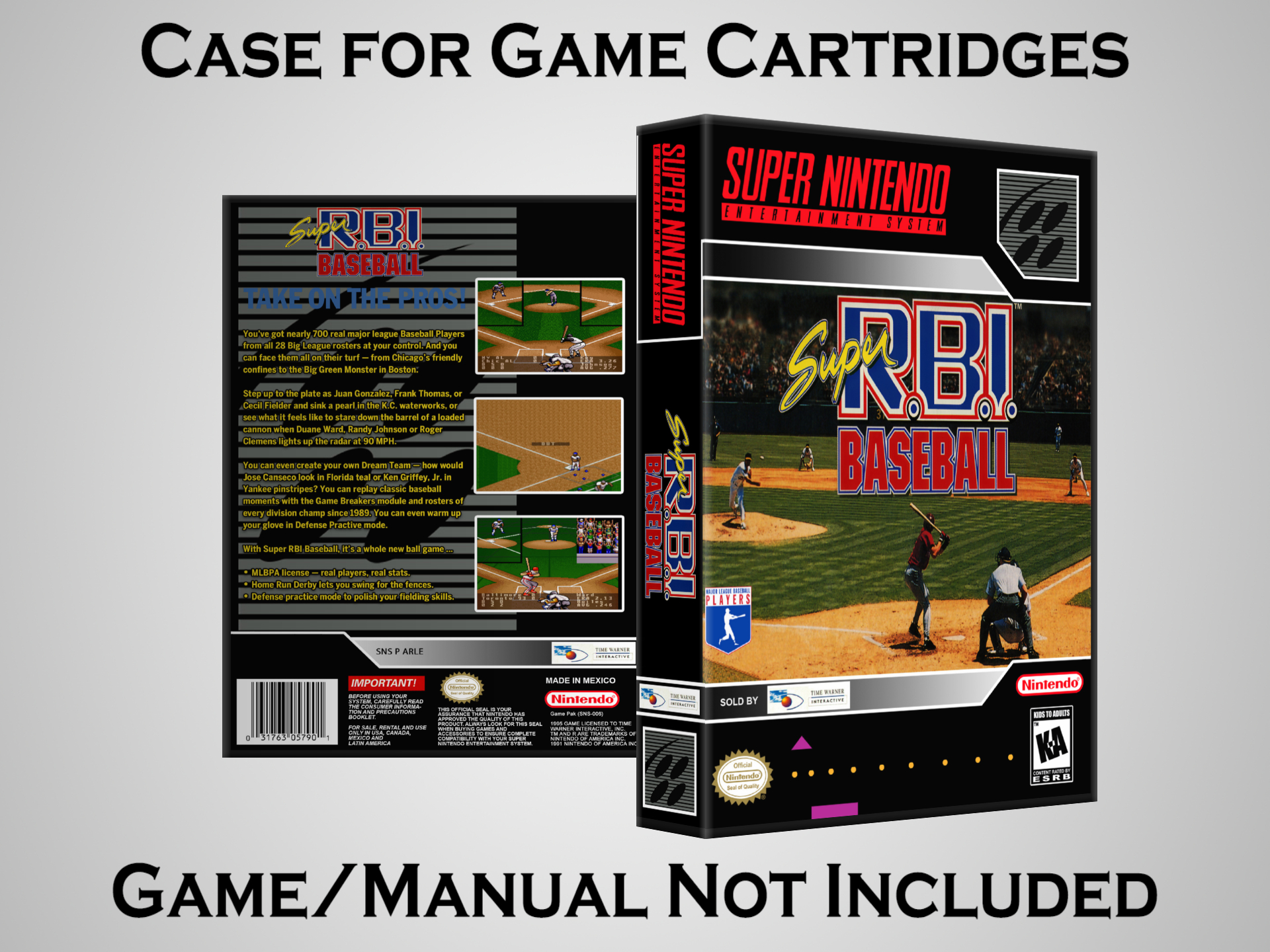 NO GAME OR MANUAL IS INCLUDED! This is NOT an original cardboard box. Case Dimensions : 7.25" x 5.25" x 1.125" Case Color : Dark Grey These cases are designed specifically to hold your Super Nintendo (SNES) cartridges. These are not the low quality Universal Game Cases that most other sellers offer. These firmly hold your cartridges in place, and include clips on the opposite side to hold the instruction manuals if you have them. Our Super Nintendo cases are split into multiple listings alphabetically due to the limit on options in one listing. You can find the rest of our cases in the following links: SNES Cases from # to F SNES Cases from G to N SNES Cases from O to S SNES Cases from T to Z Click here to find more cases in our eBay store!