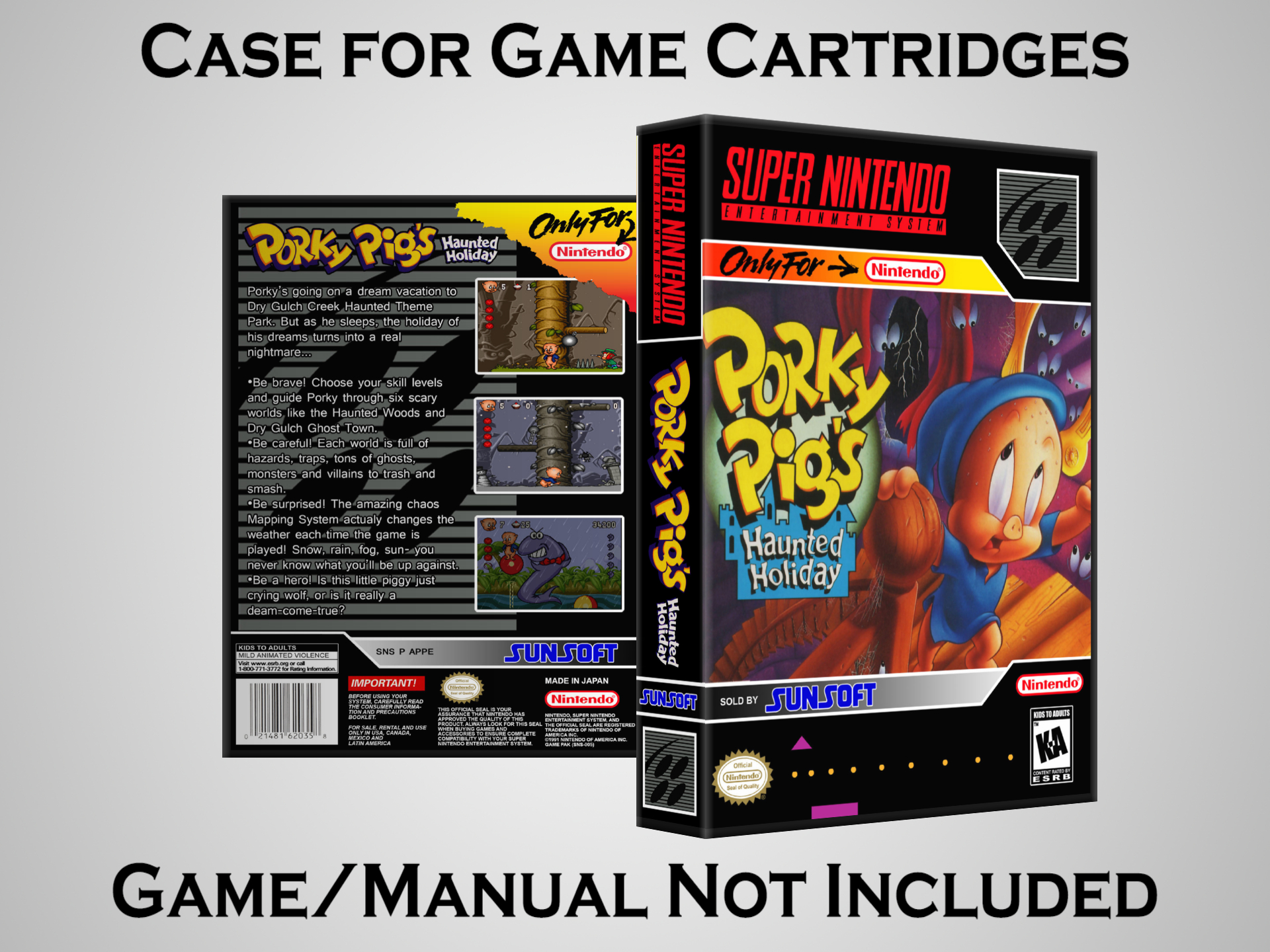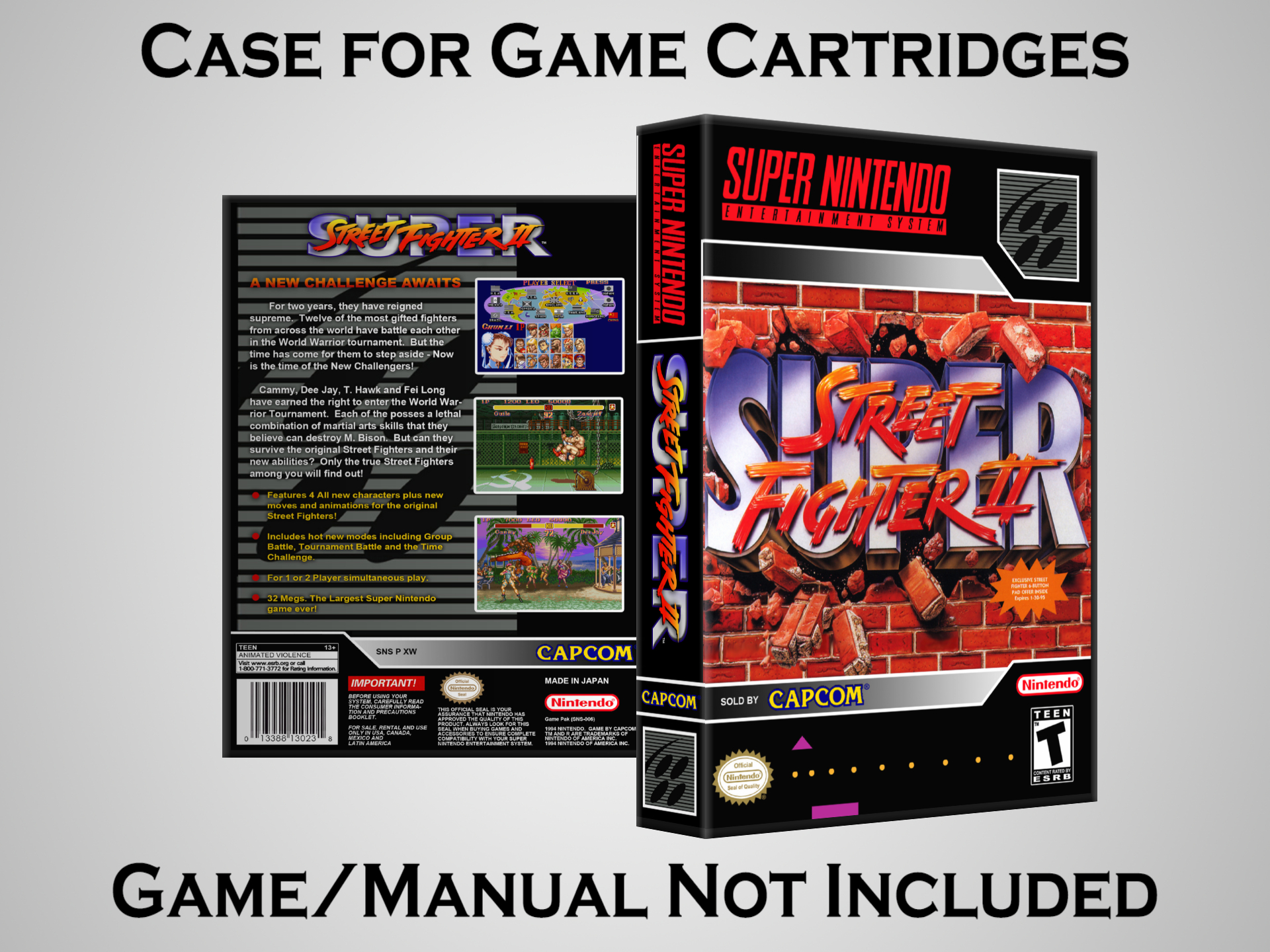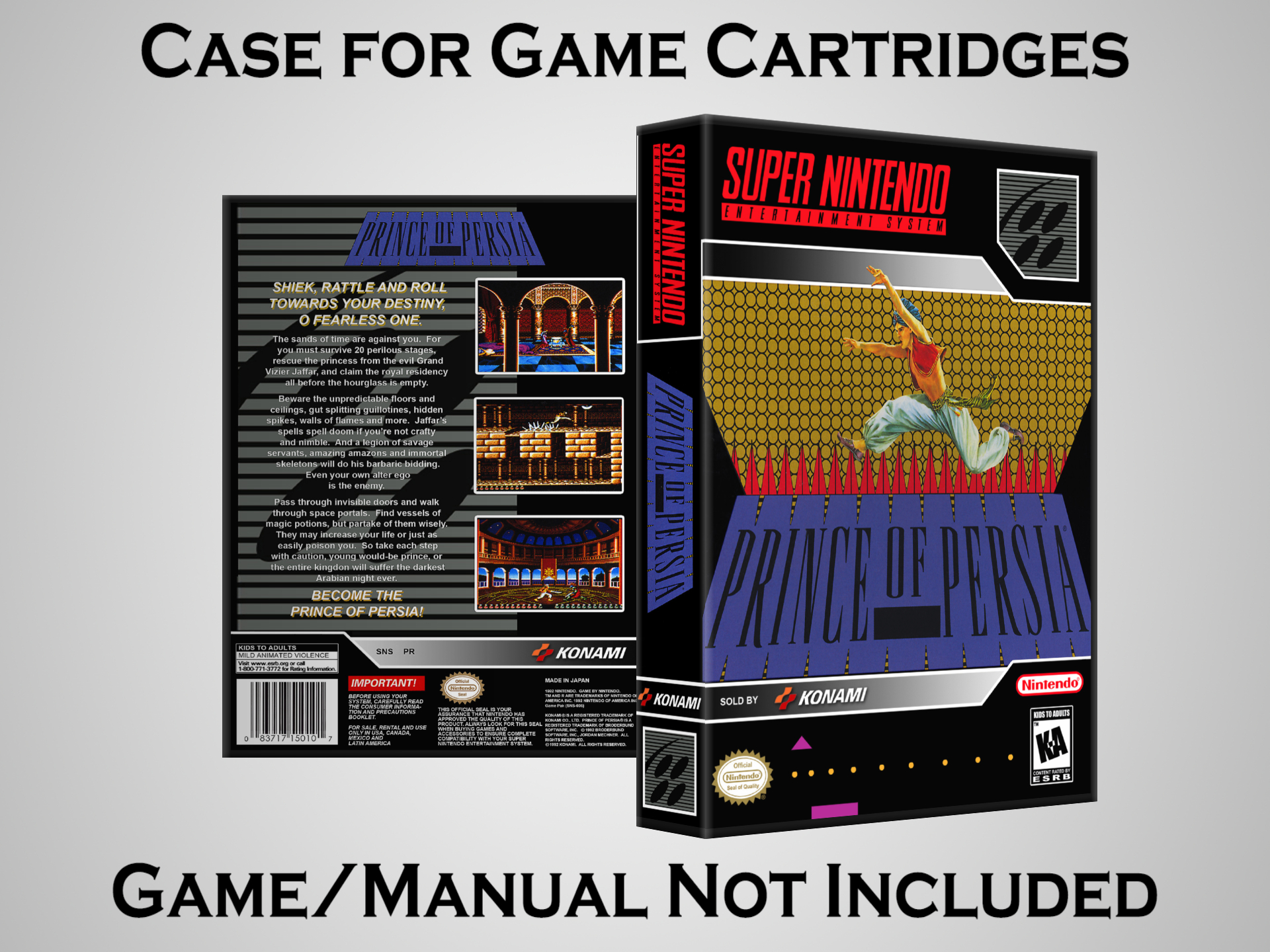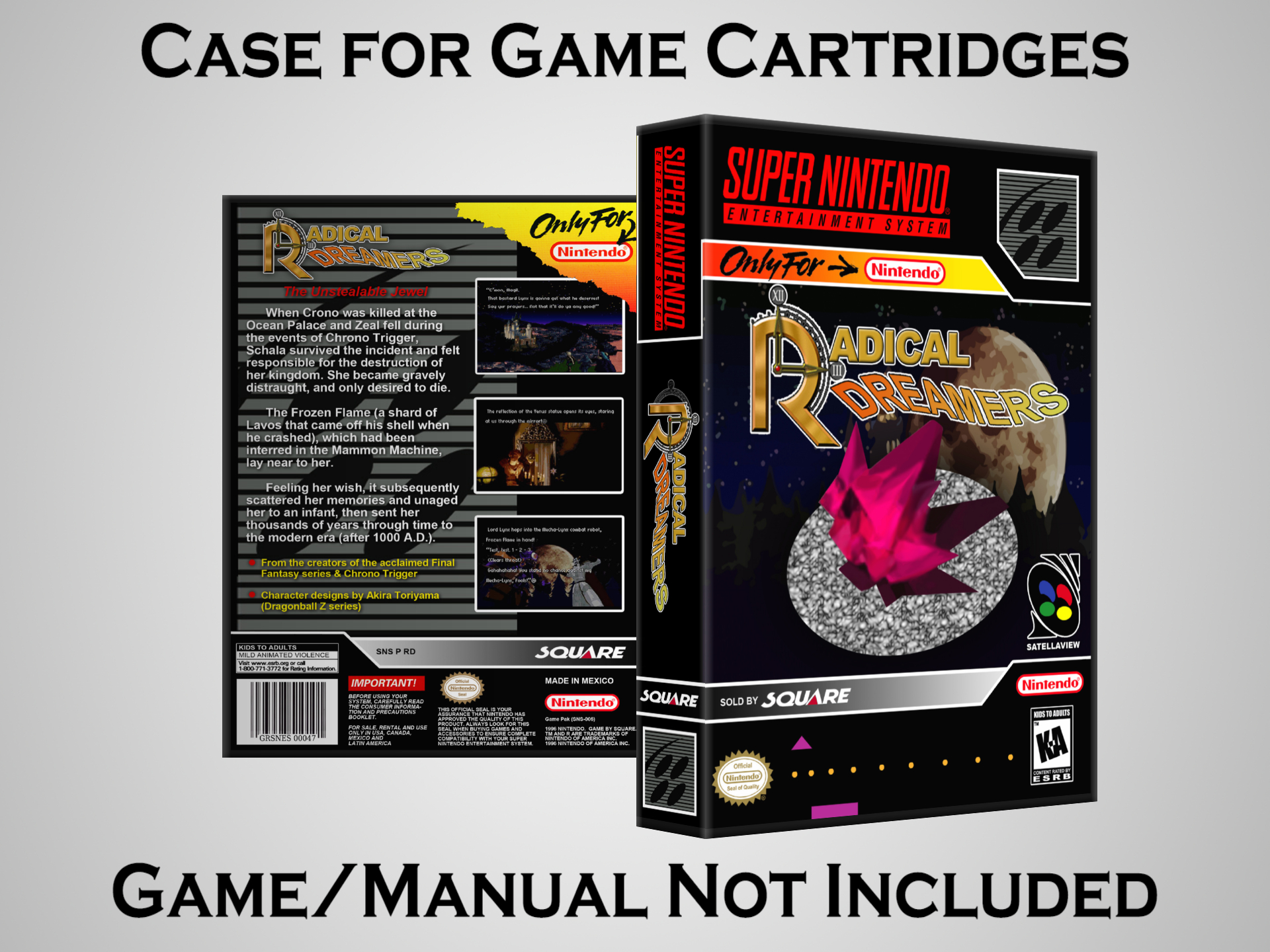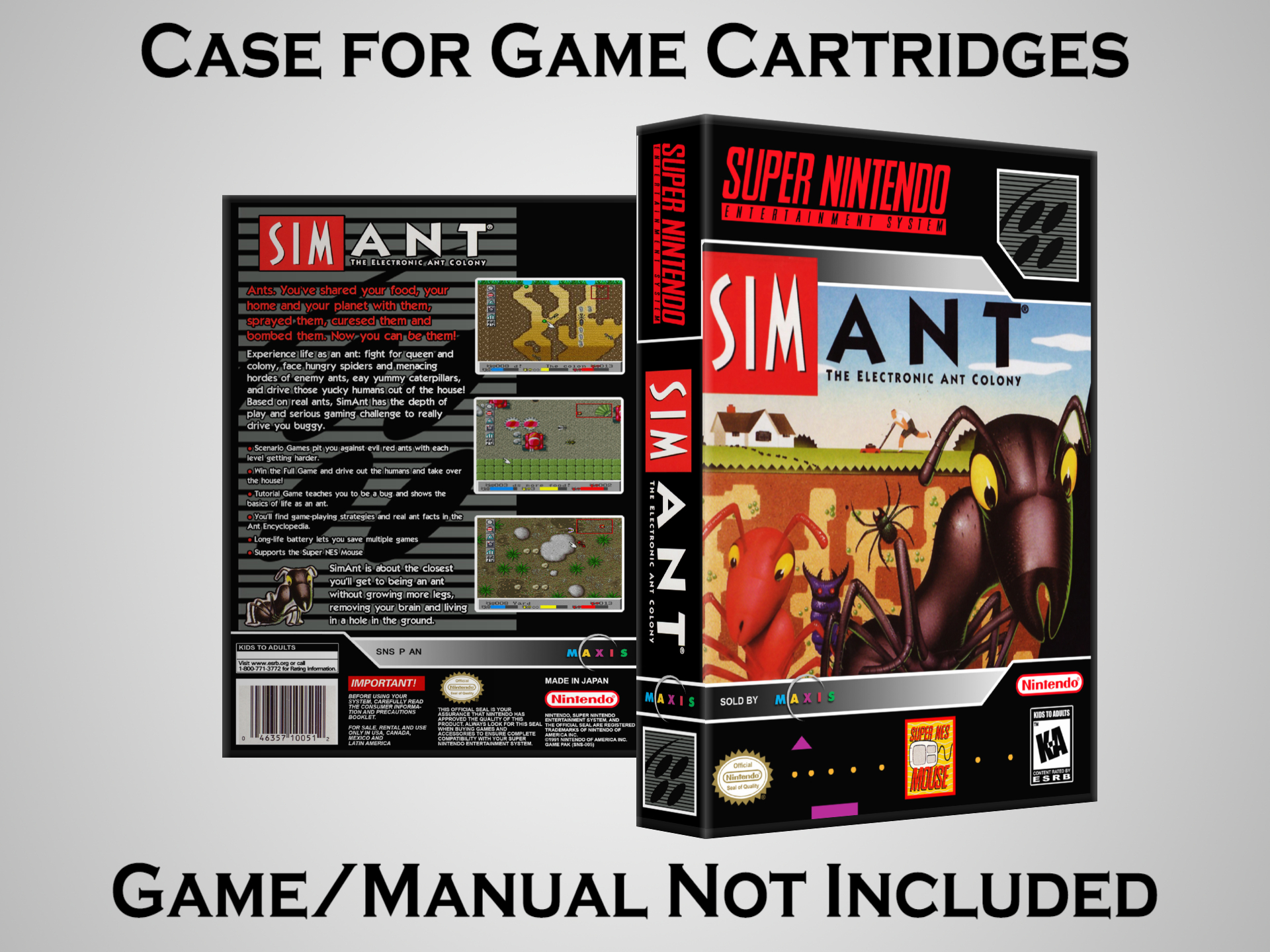NO GAME OR MANUAL IS INCLUDED! This is NOT an original cardboard box. Case Dimensions : 7.25" x 5.25" x 1.125" Case Color : Dark Grey These cases are designed specifically to hold your Super Nintendo (SNES) cartridges. These are not the low quality Universal Game Cases that most other sellers offer. These firmly hold your cartridges in place, and include clips on the opposite side to hold the instruction manuals if you have them. Our Super Nintendo cases are split into multiple listings alphabetically due to the limit on options in one listing. You can find the rest of our cases in the following links: SNES Cases from # to F SNES Cases from G to N SNES Cases from O to S SNES Cases from T to Z Click here to find more cases in our eBay store!