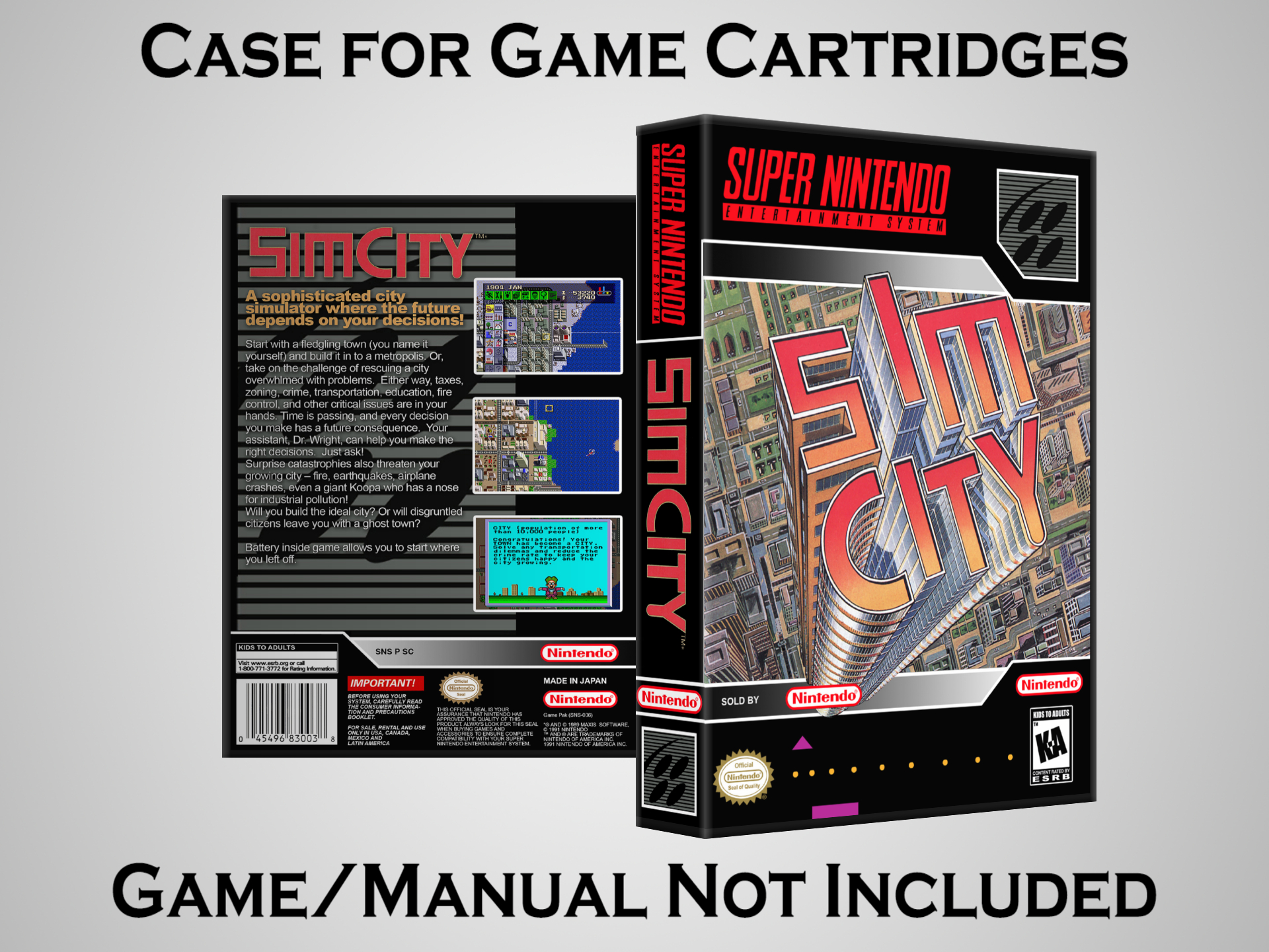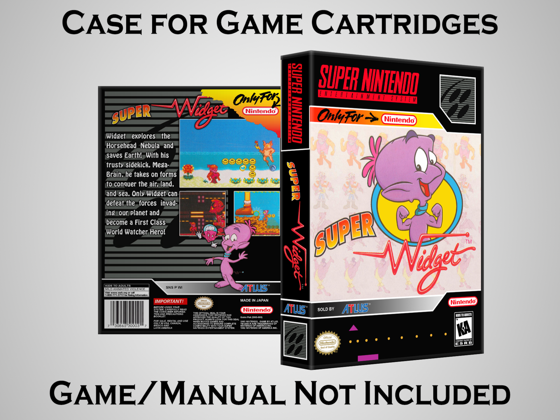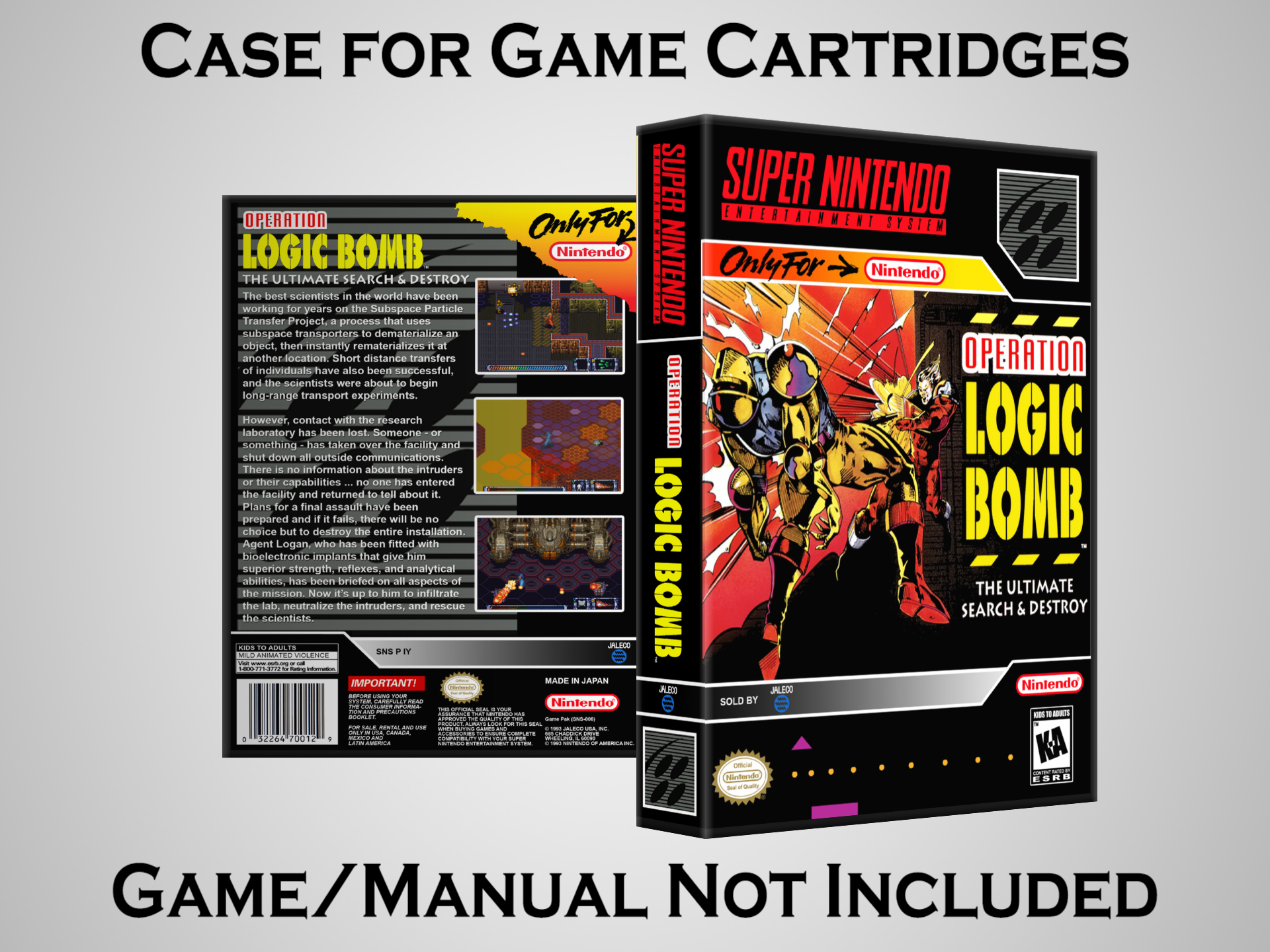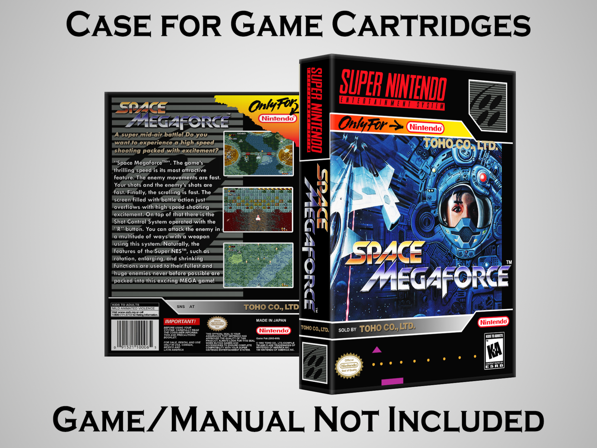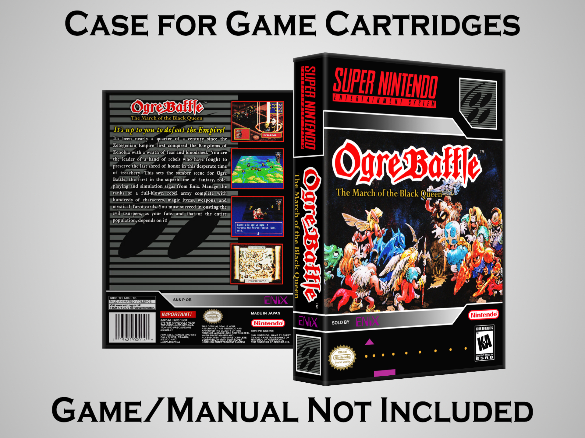 NO GAME OR MANUAL IS INCLUDED! This is NOT an original cardboard box. Case Dimensions : 7.25" x 5.25" x 1.125" Case Color : Dark Grey These cases are designed specifically to hold your Super Nintendo (SNES) cartridges. These are not the low quality Universal Game Cases that most other sellers offer. These firmly hold your cartridges in place, and include clips on the opposite side to hold the instruction manuals if you have them. Our Super Nintendo cases are split into multiple listings alphabetically due to the limit on options in one listing. You can find the rest of our cases in the following links: SNES Cases from # to F SNES Cases from G to N SNES Cases from O to S SNES Cases from T to Z Click here to find more cases in our eBay store!