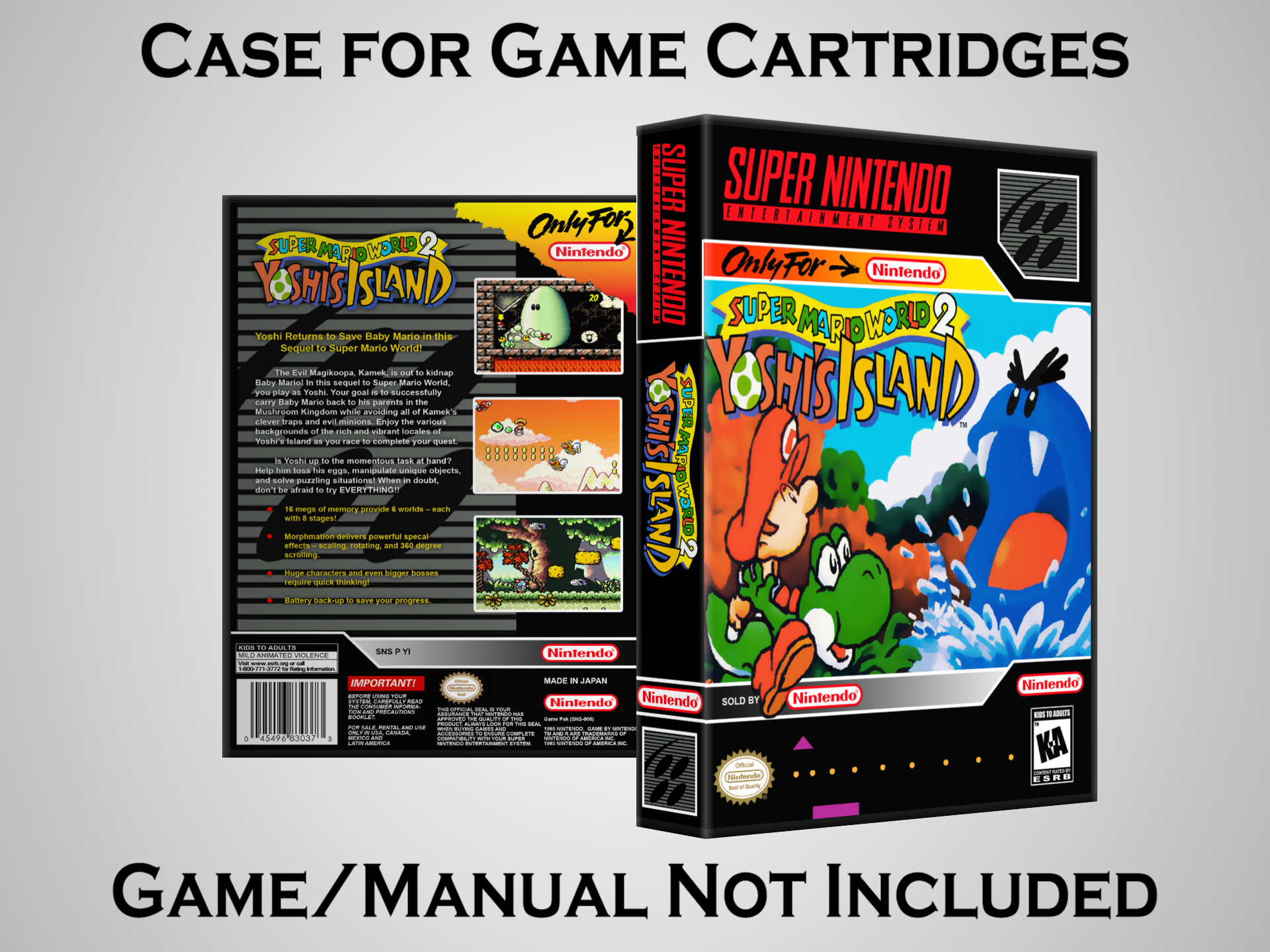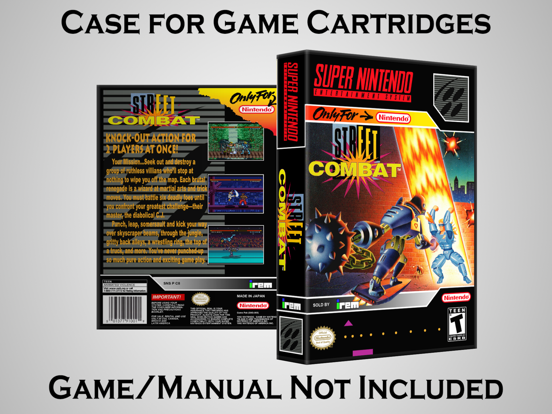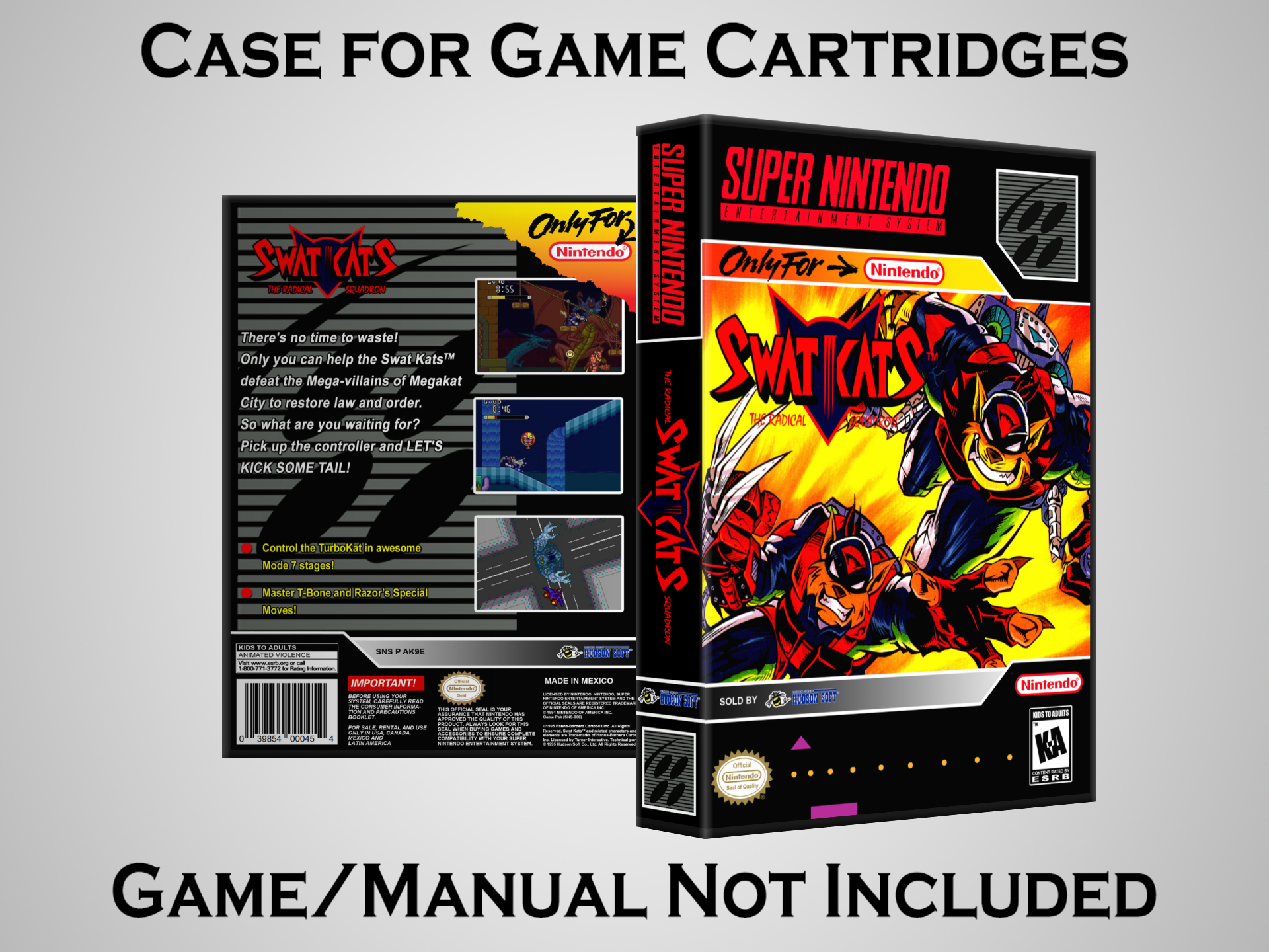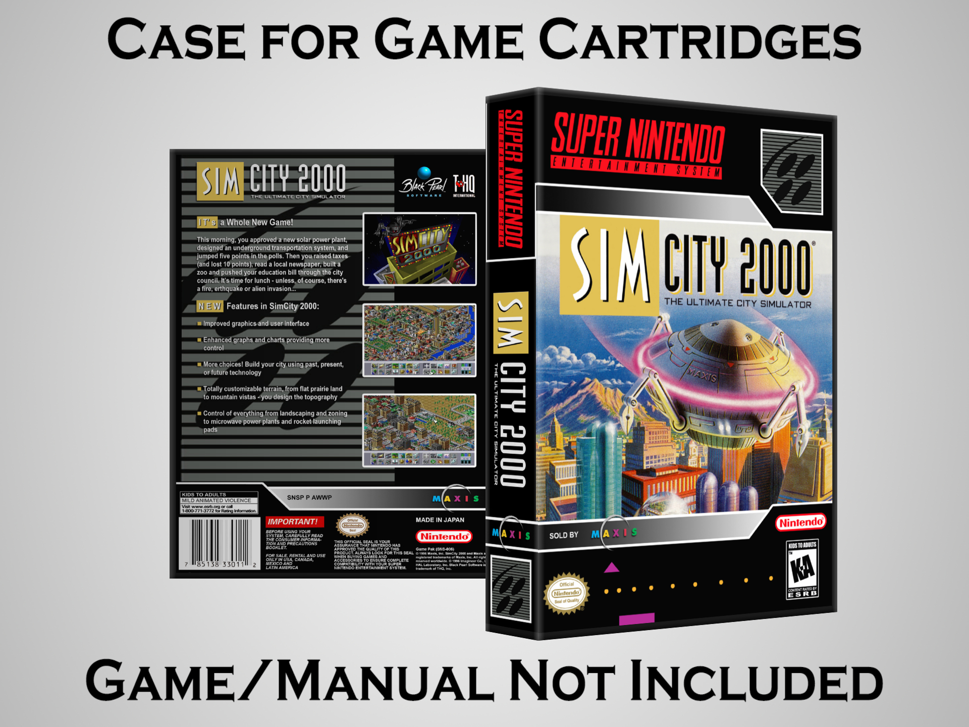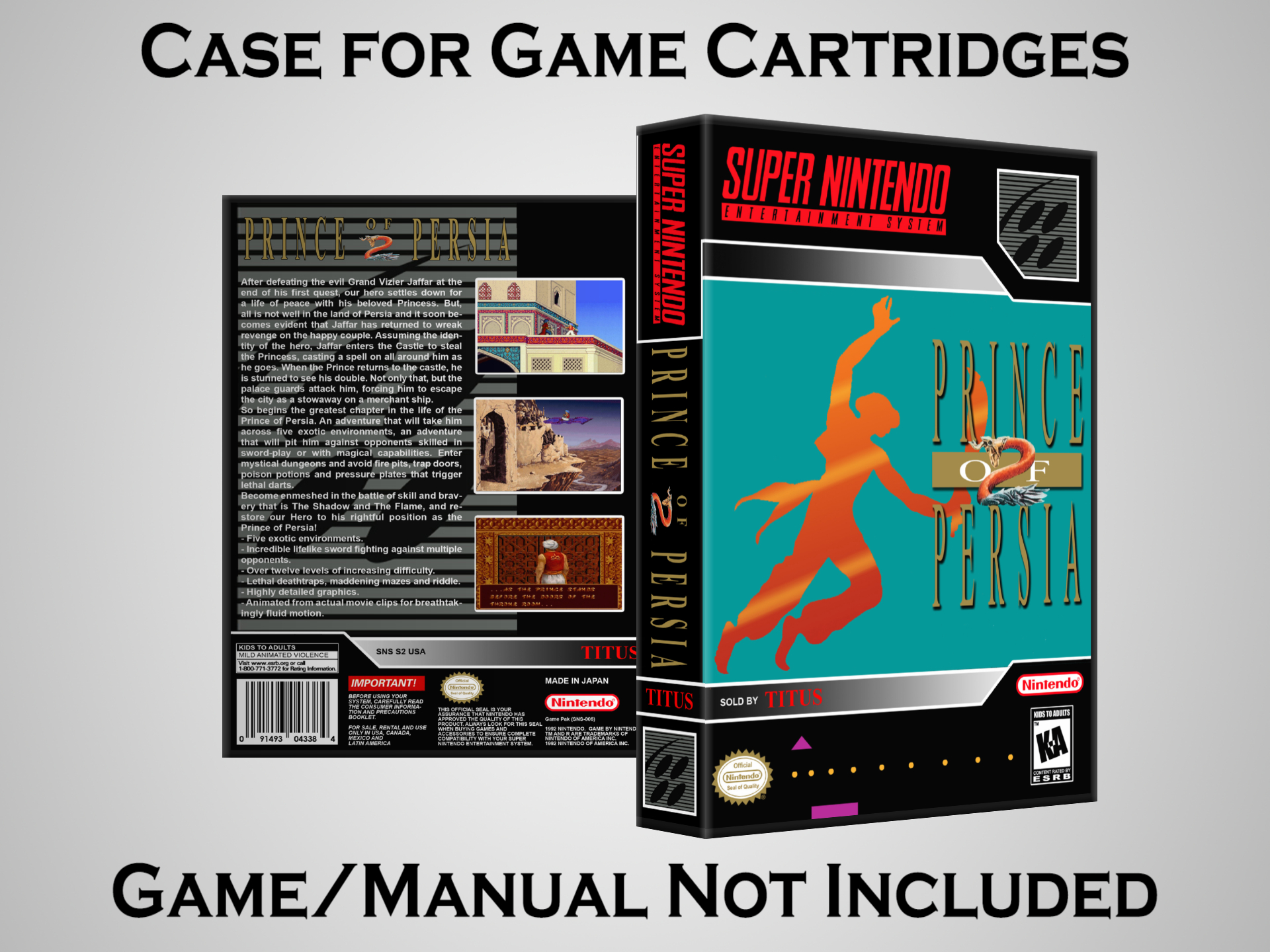 NO GAME OR MANUAL IS INCLUDED! This is NOT an original cardboard box. Case Dimensions : 7.25" x 5.25" x 1.125" Case Color : Dark Grey These cases are designed specifically to hold your Super Nintendo (SNES) cartridges. These are not the low quality Universal Game Cases that most other sellers offer. These firmly hold your cartridges in place, and include clips on the opposite side to hold the instruction manuals if you have them. Our Super Nintendo cases are split into multiple listings alphabetically due to the limit on options in one listing. You can find the rest of our cases in the following links: SNES Cases from # to F SNES Cases from G to N SNES Cases from O to S SNES Cases from T to Z Click here to find more cases in our eBay store!