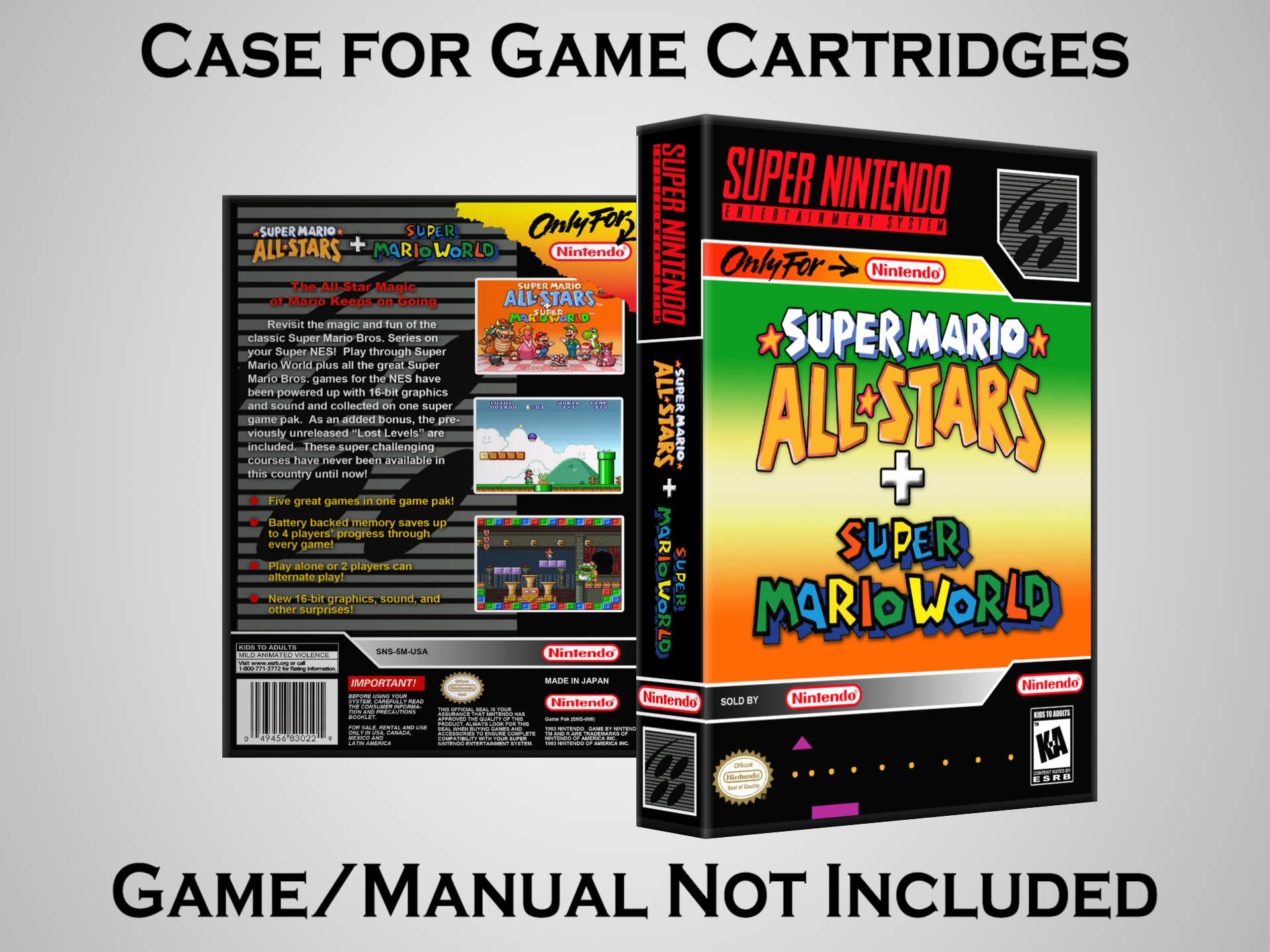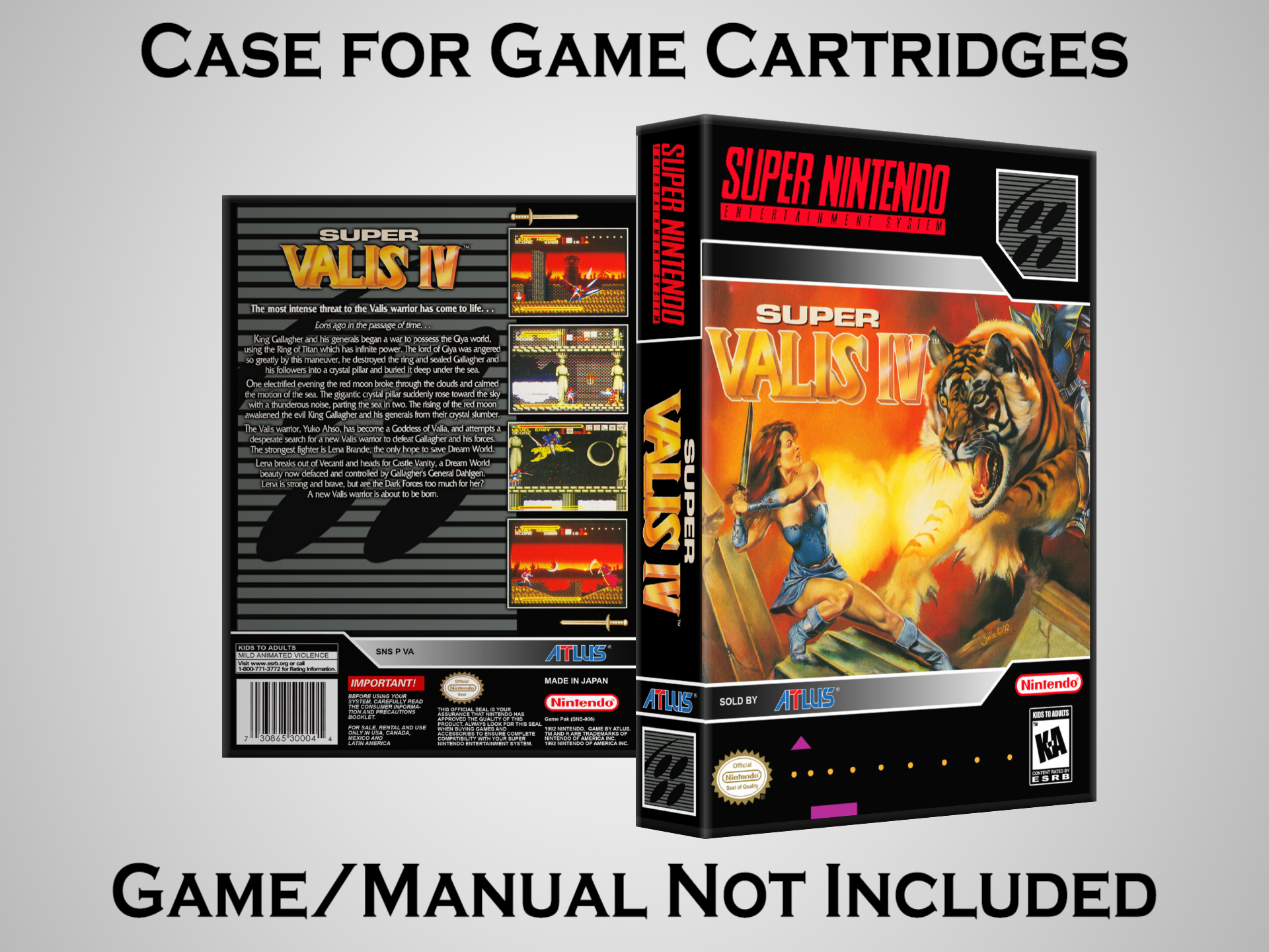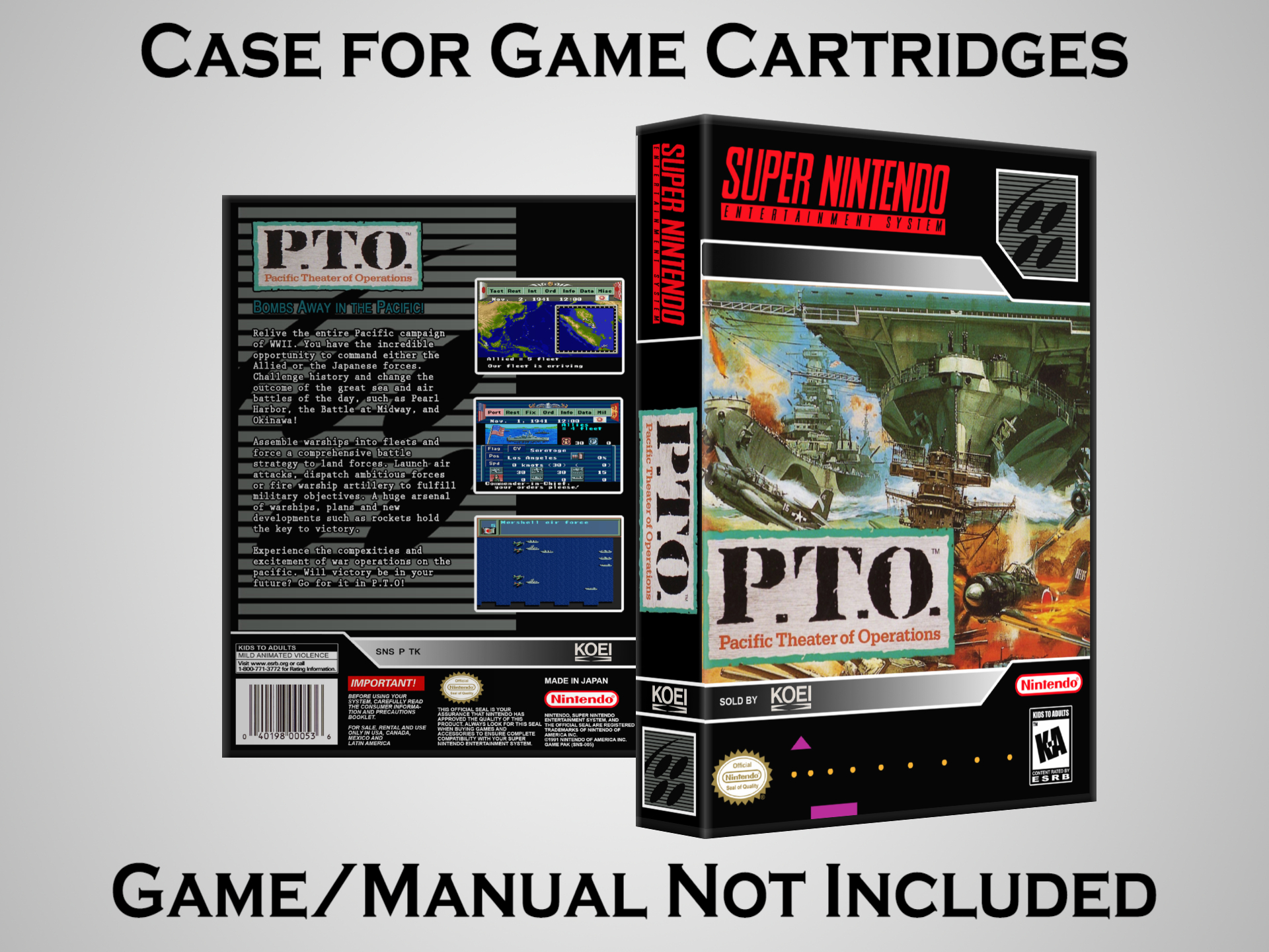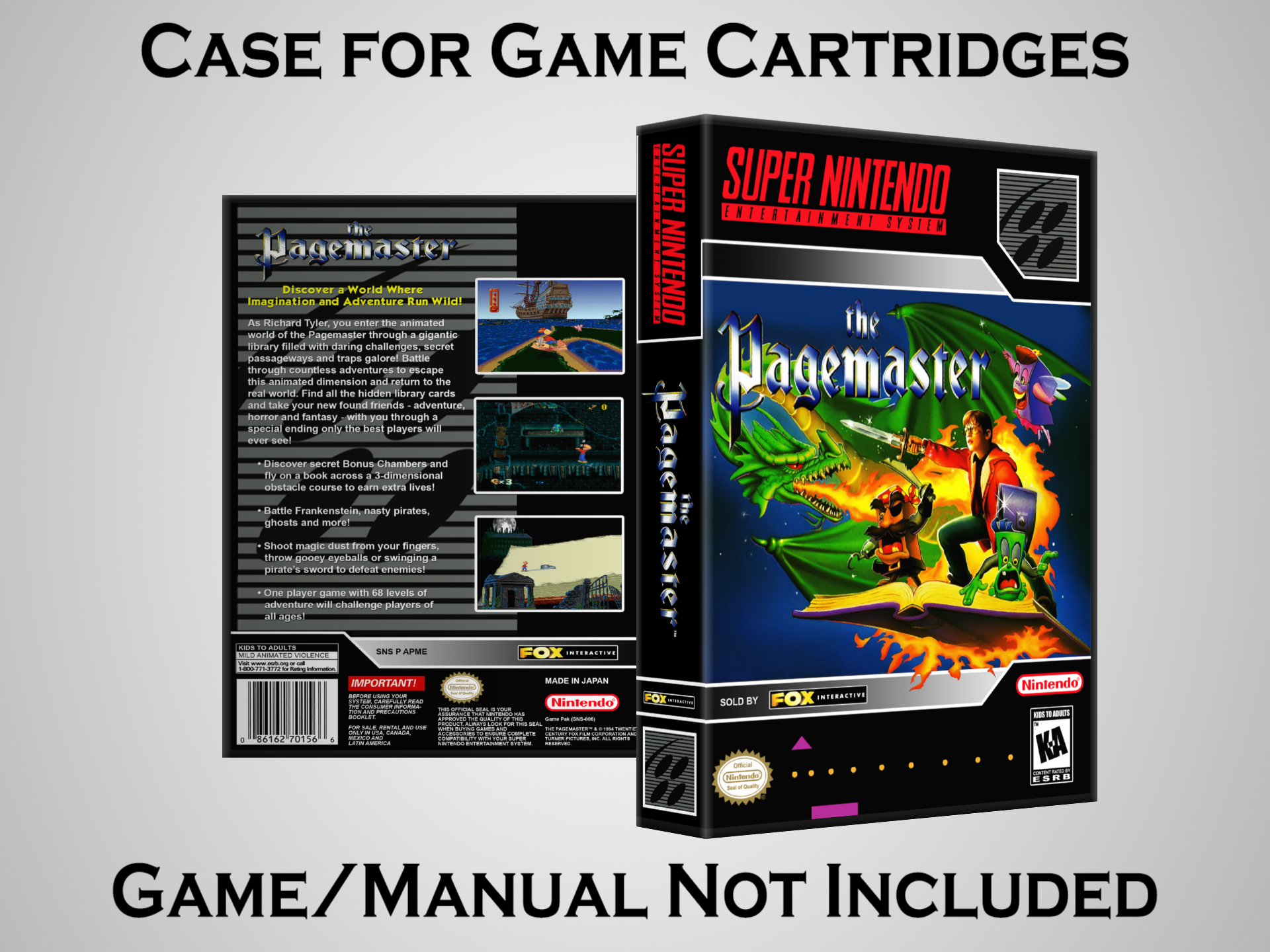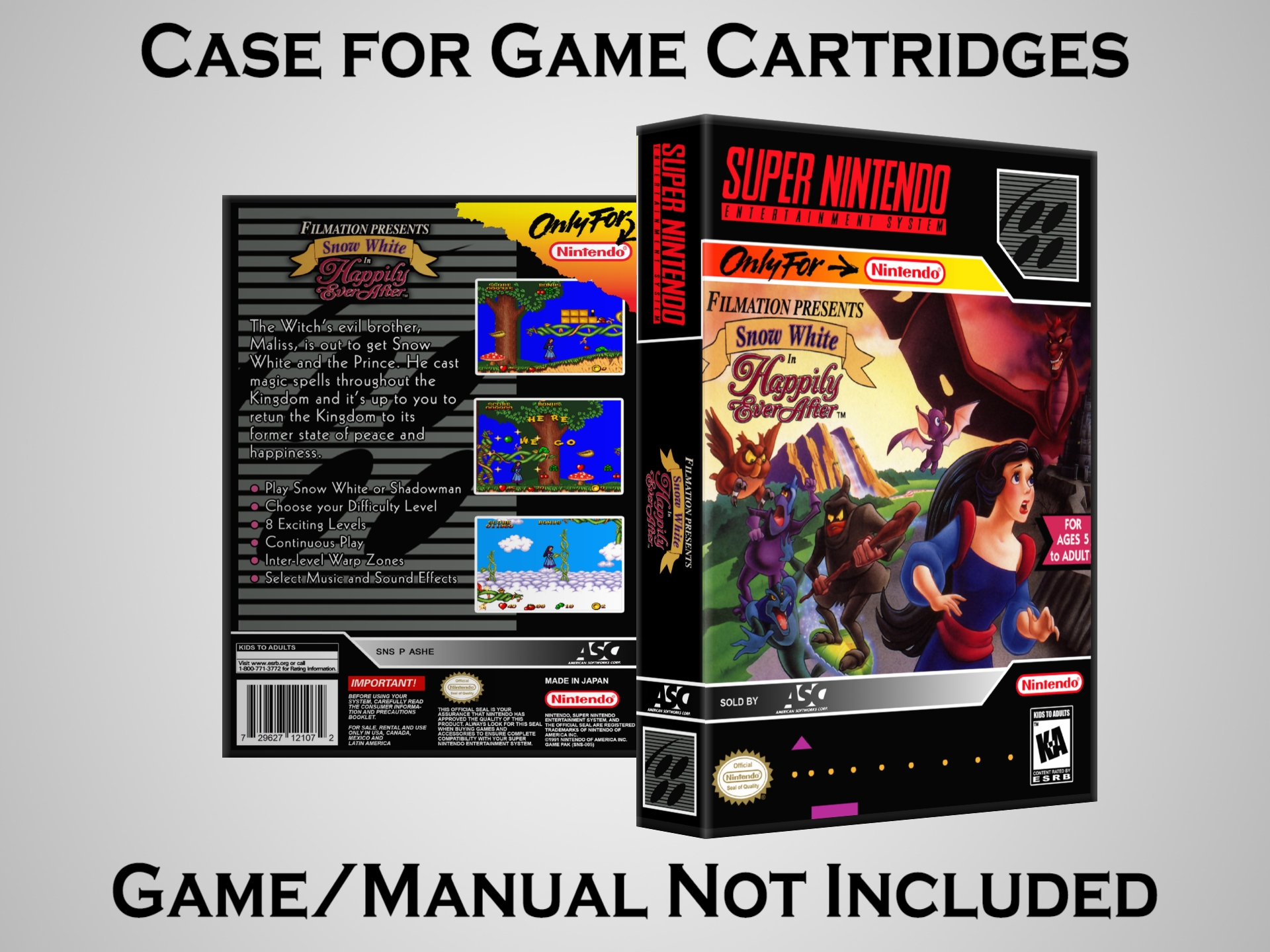 NO GAME OR MANUAL IS INCLUDED! This is NOT an original cardboard box. Case Dimensions : 7.25" x 5.25" x 1.125" Case Color : Dark Grey These cases are designed specifically to hold your Super Nintendo (SNES) cartridges. These are not the low quality Universal Game Cases that most other sellers offer. These firmly hold your cartridges in place, and include clips on the opposite side to hold the instruction manuals if you have them. Our Super Nintendo cases are split into multiple listings alphabetically due to the limit on options in one listing. You can find the rest of our cases in the following links: SNES Cases from # to F SNES Cases from G to N SNES Cases from O to S SNES Cases from T to Z Click here to find more cases in our eBay store!