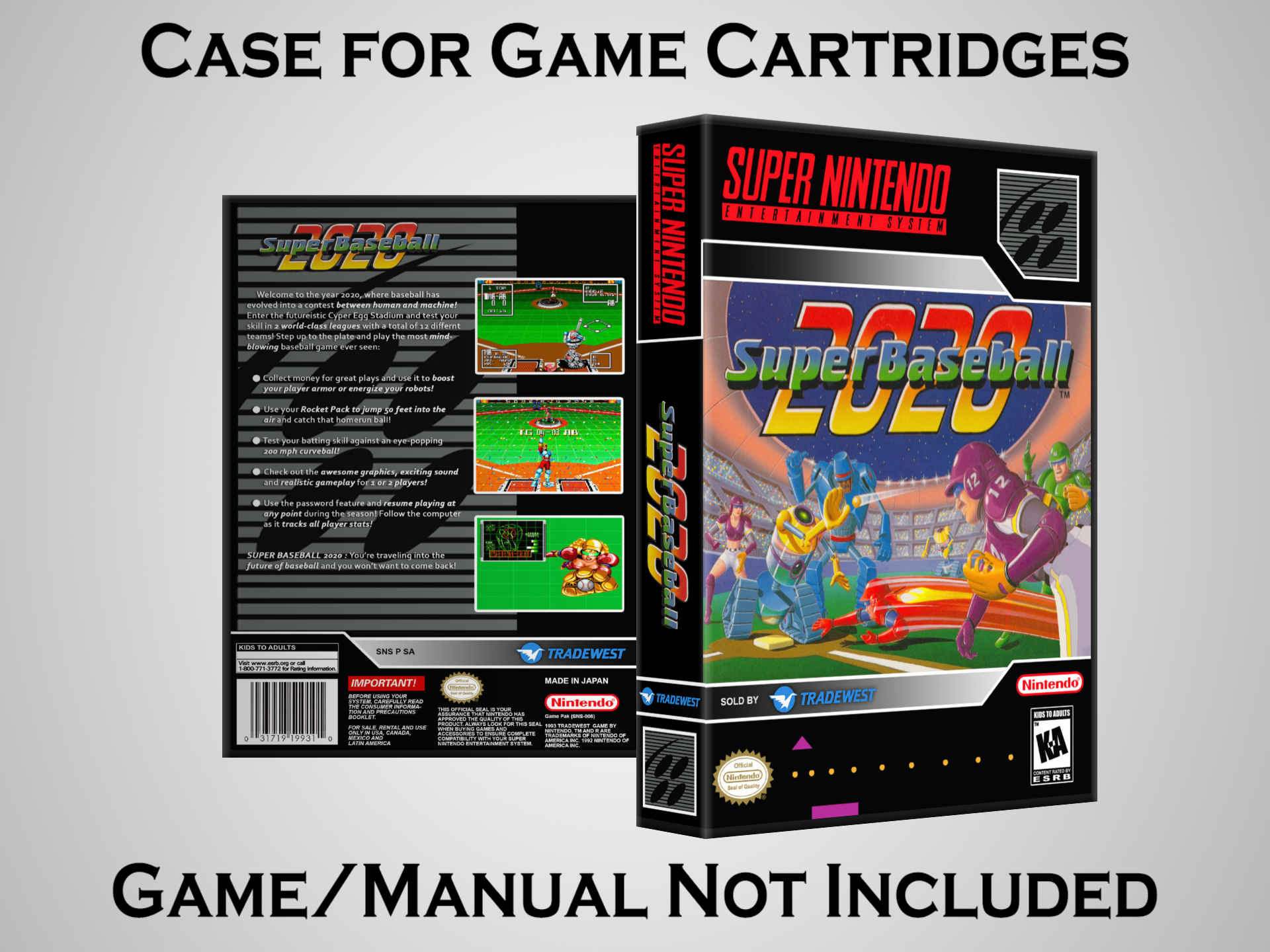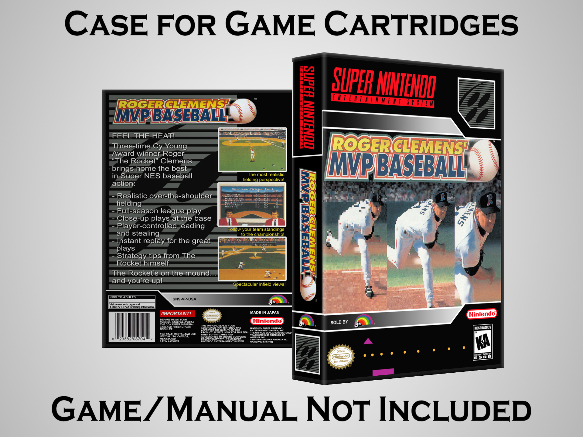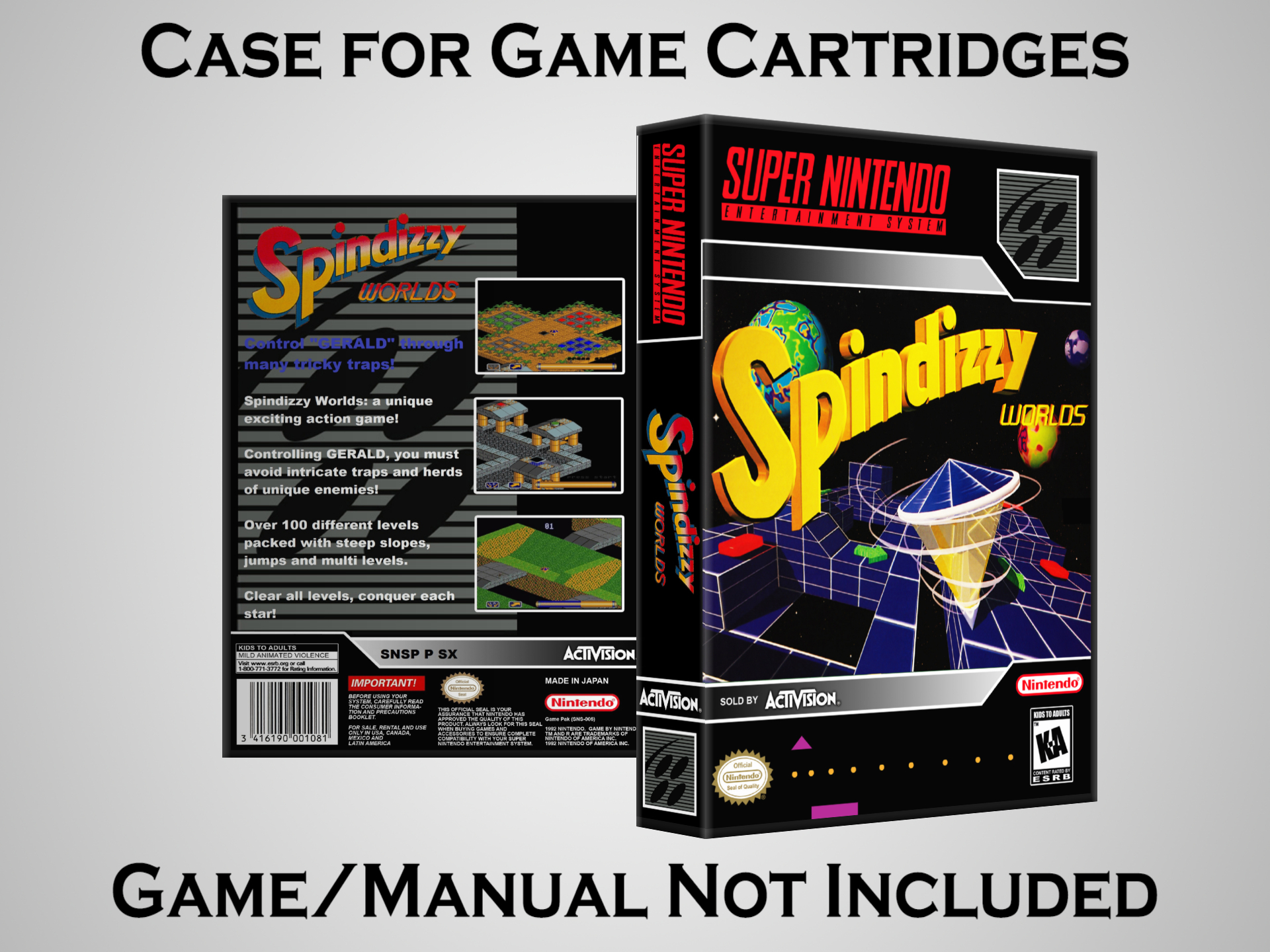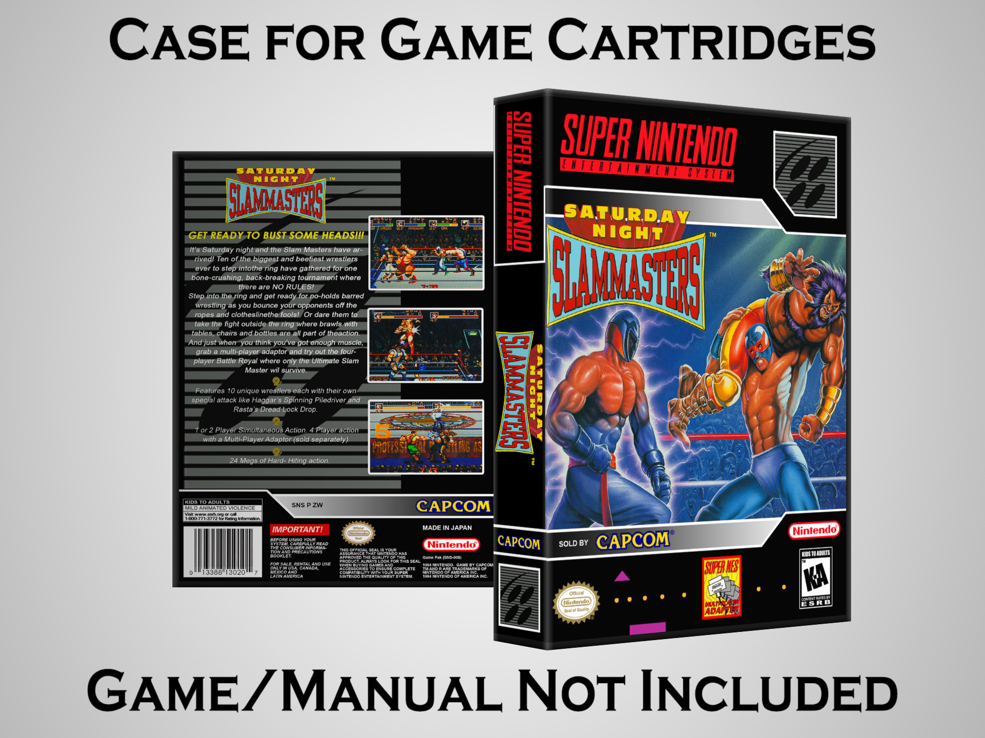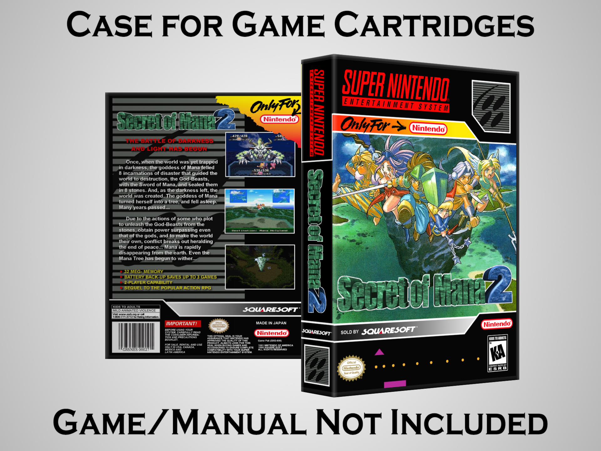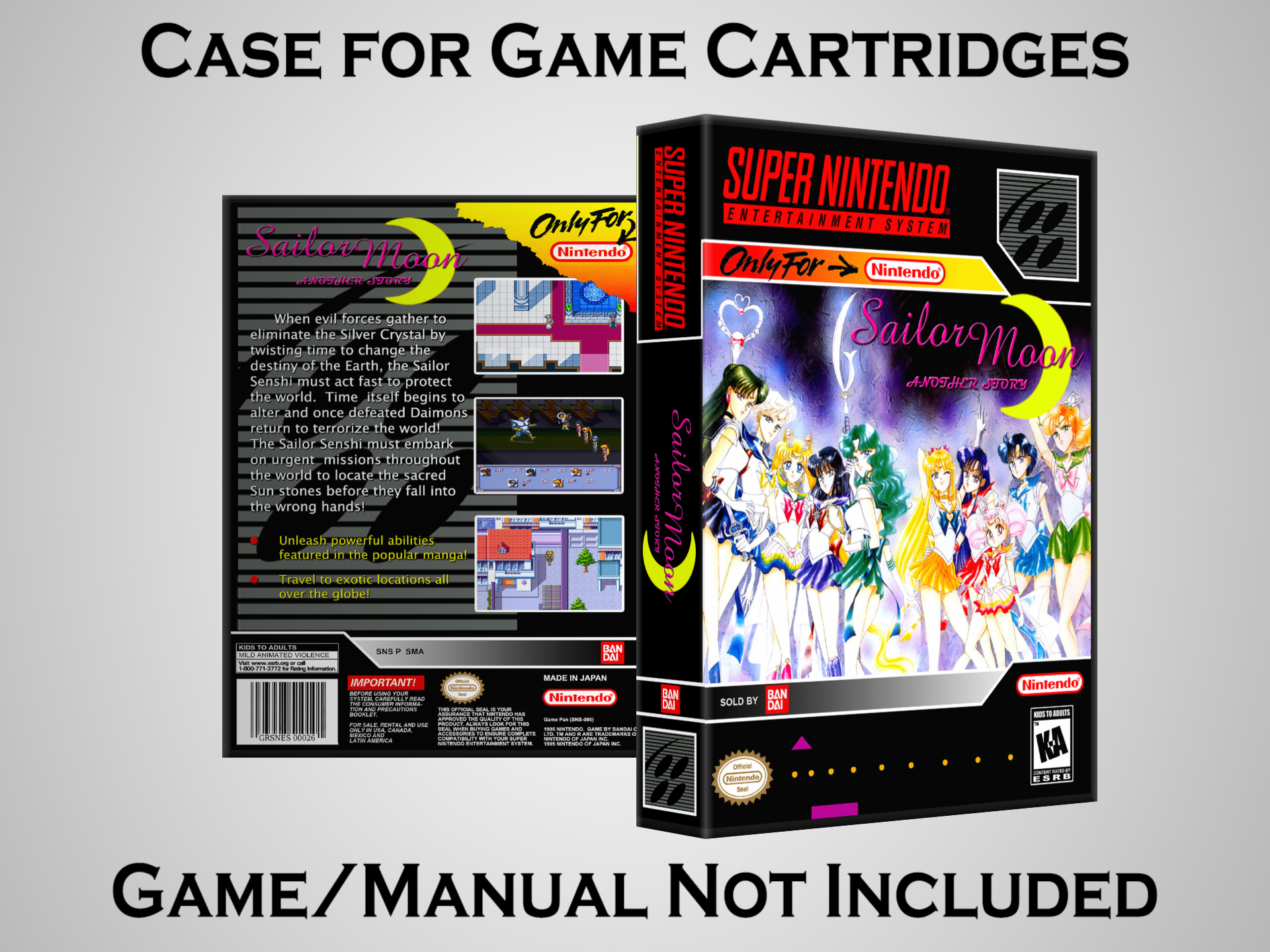 NO GAME OR MANUAL IS INCLUDED! This is NOT an original cardboard box. Case Dimensions : 7.25" x 5.25" x 1.125" Case Color : Dark Grey These cases are designed specifically to hold your Super Nintendo (SNES) cartridges. These are not the low quality Universal Game Cases that most other sellers offer. These firmly hold your cartridges in place, and include clips on the opposite side to hold the instruction manuals if you have them. Our Super Nintendo cases are split into multiple listings alphabetically due to the limit on options in one listing. You can find the rest of our cases in the following links: SNES Cases from # to F SNES Cases from G to N SNES Cases from O to S SNES Cases from T to Z Click here to find more cases in our eBay store!