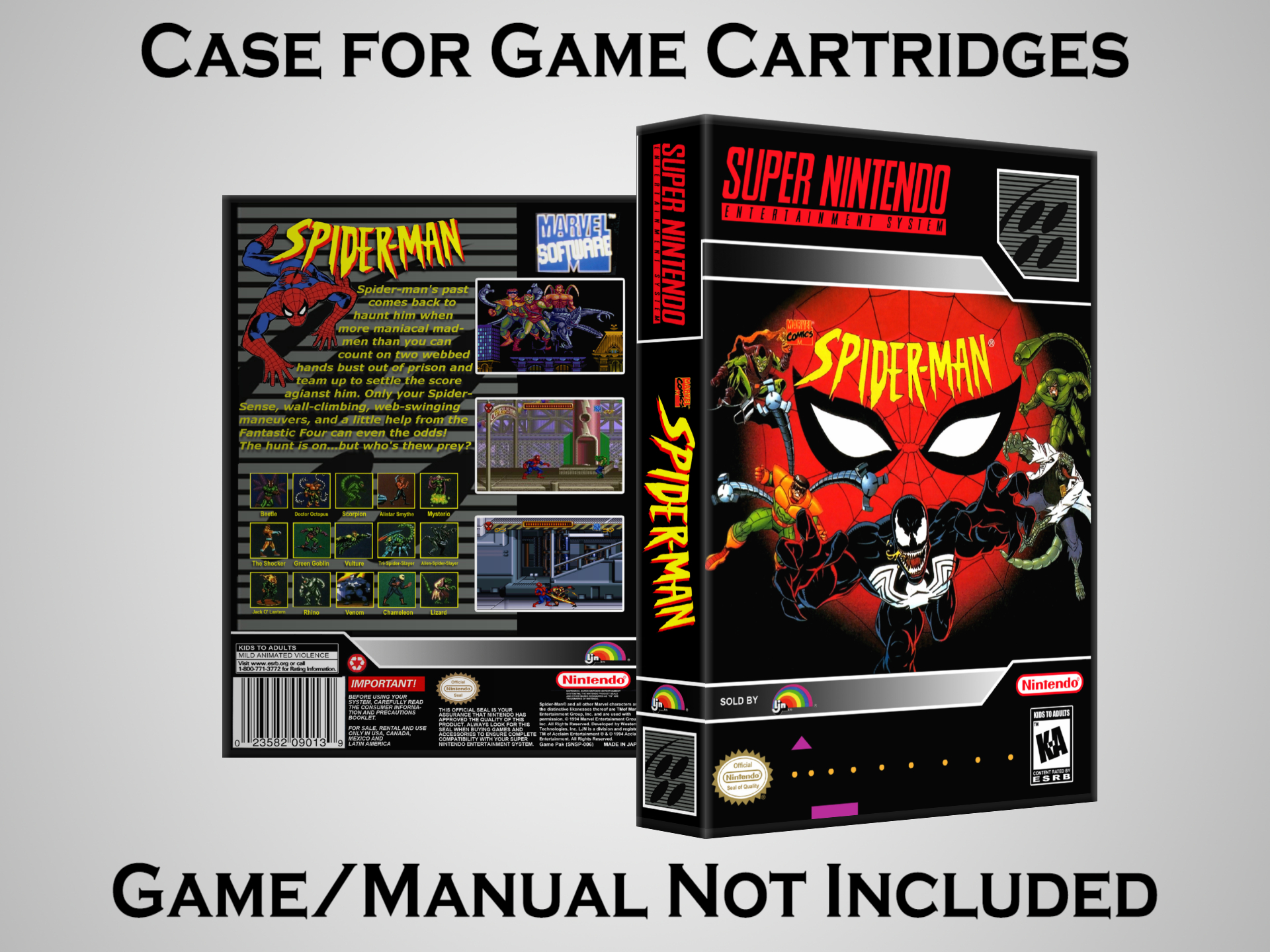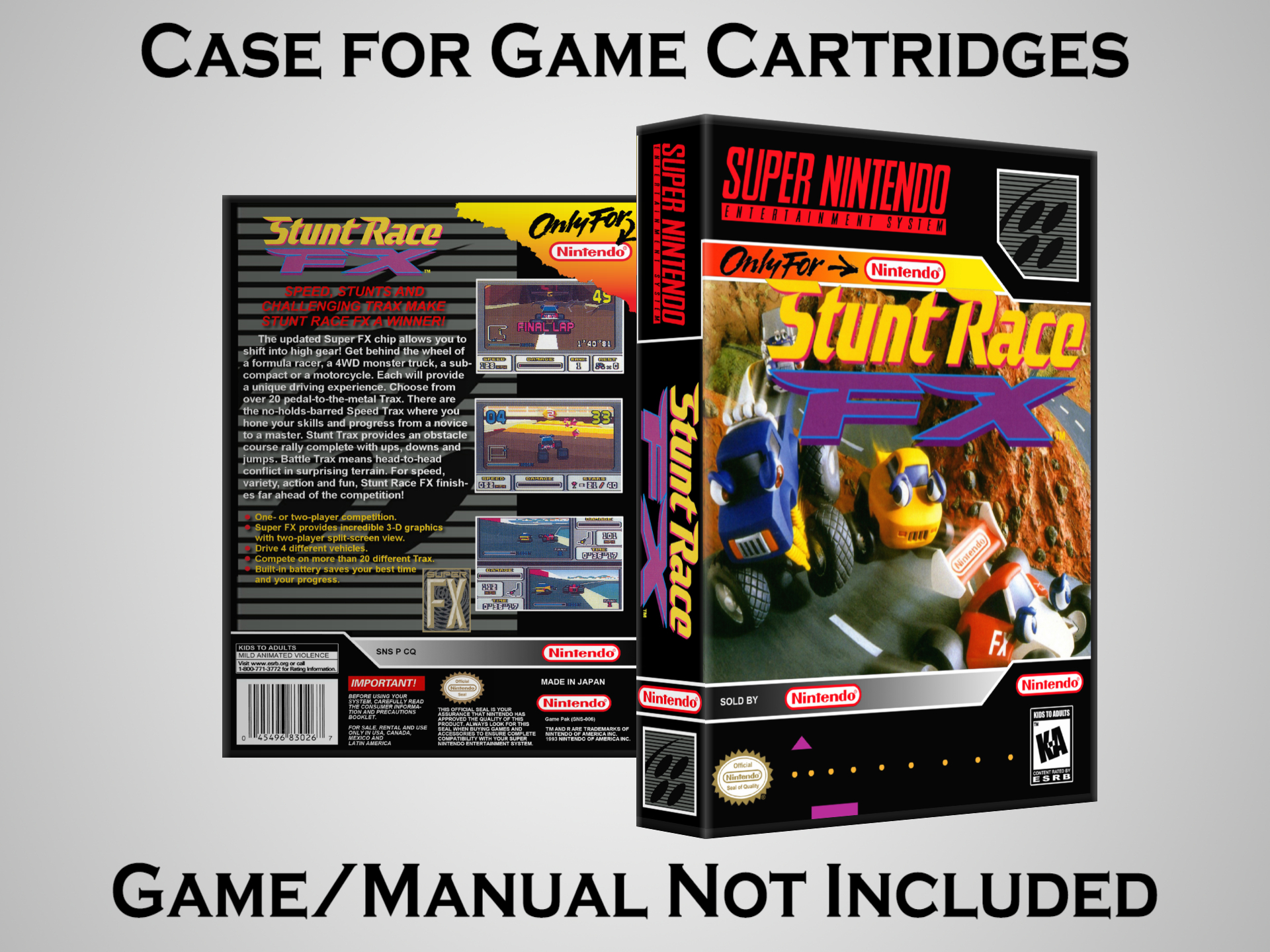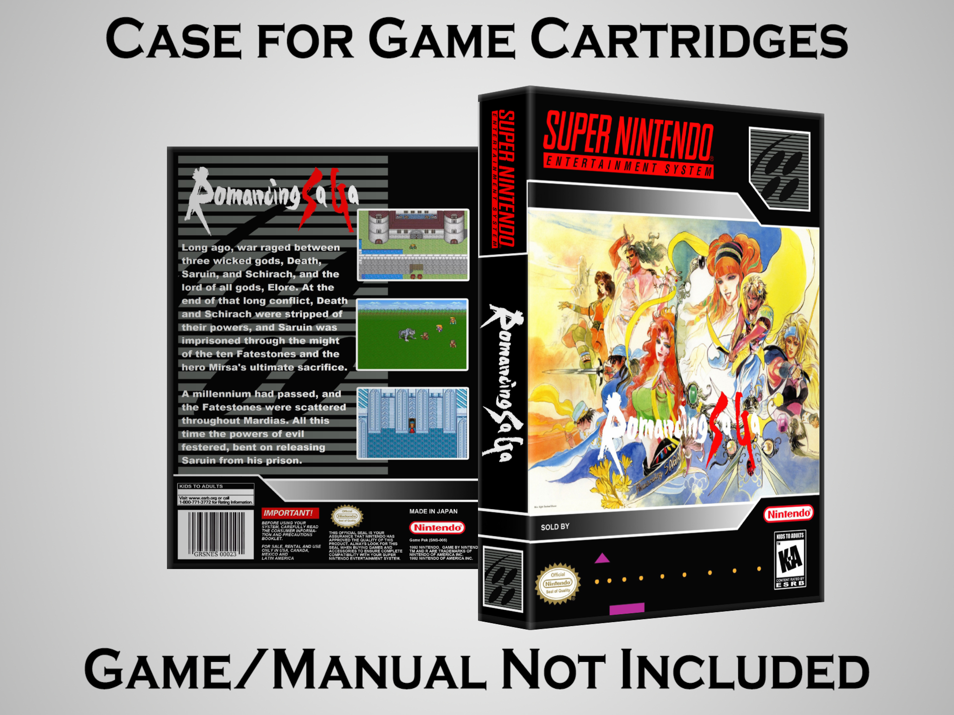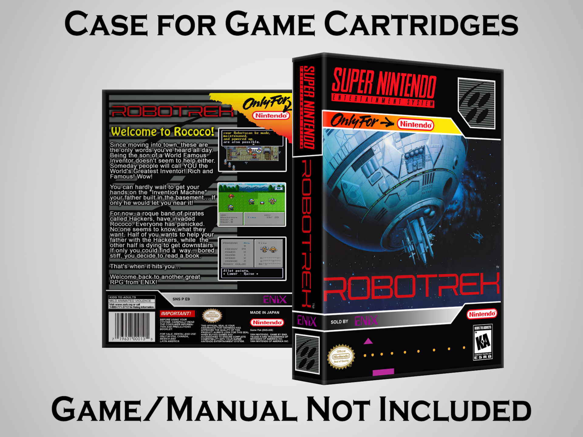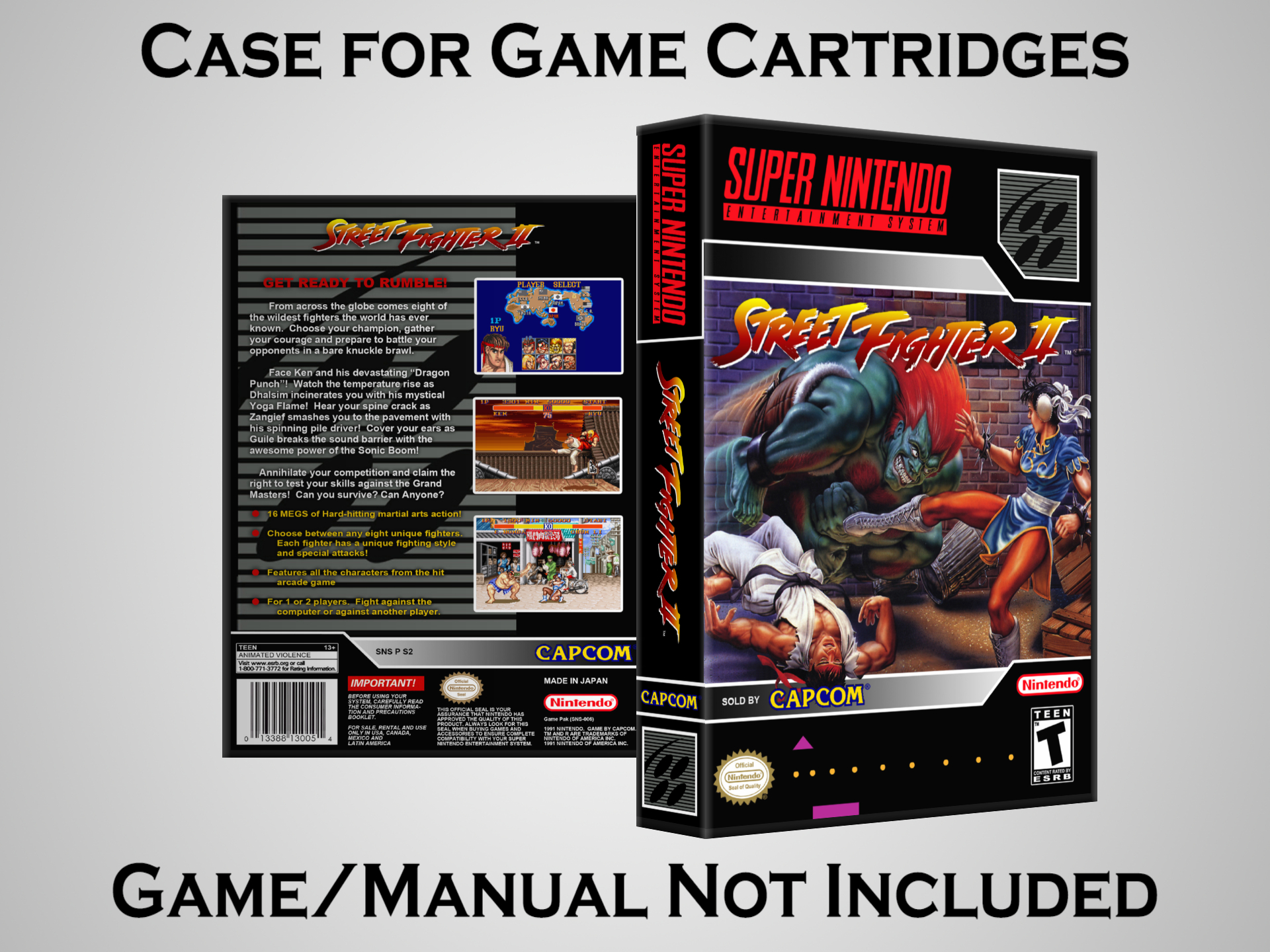 NO GAME OR MANUAL IS INCLUDED! This is NOT an original cardboard box. Case Dimensions : 7.25" x 5.25" x 1.125" Case Color : Dark Grey These cases are designed specifically to hold your Super Nintendo (SNES) cartridges. These are not the low quality Universal Game Cases that most other sellers offer. These firmly hold your cartridges in place, and include clips on the opposite side to hold the instruction manuals if you have them. Our Super Nintendo cases are split into multiple listings alphabetically due to the limit on options in one listing. You can find the rest of our cases in the following links: SNES Cases from # to F SNES Cases from G to N SNES Cases from O to S SNES Cases from T to Z Click here to find more cases in our eBay store!