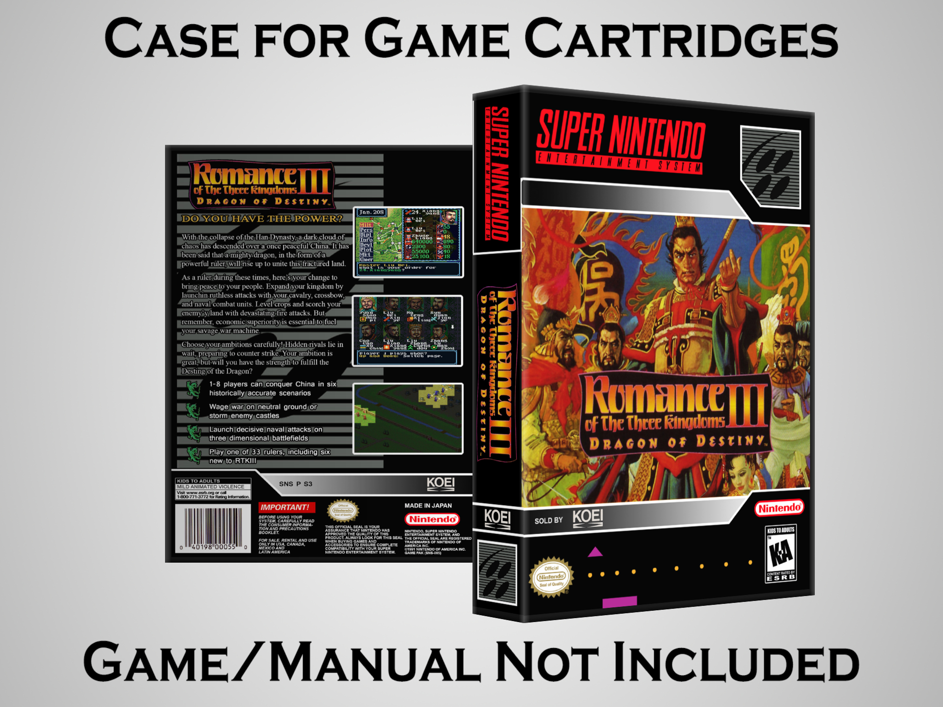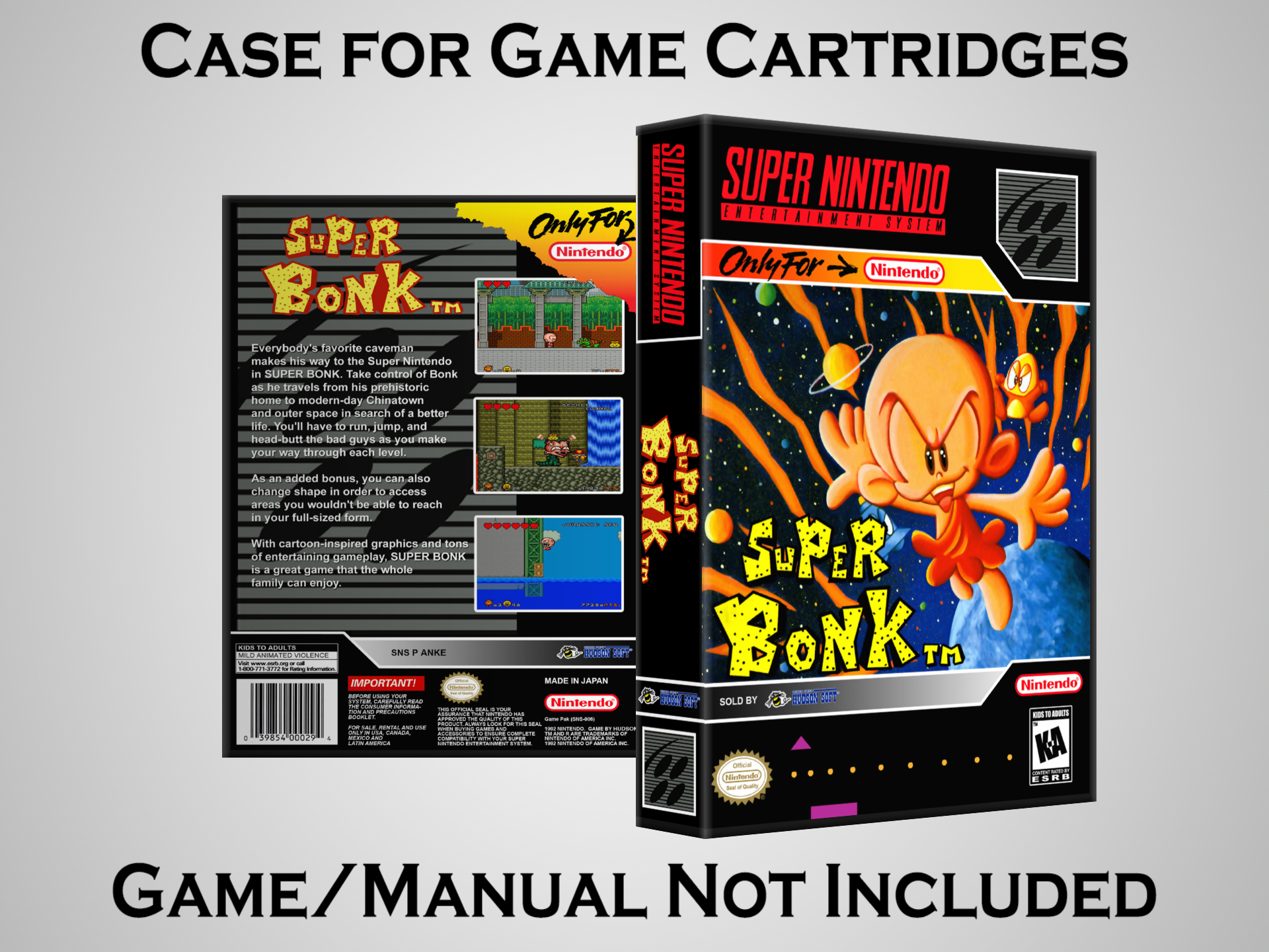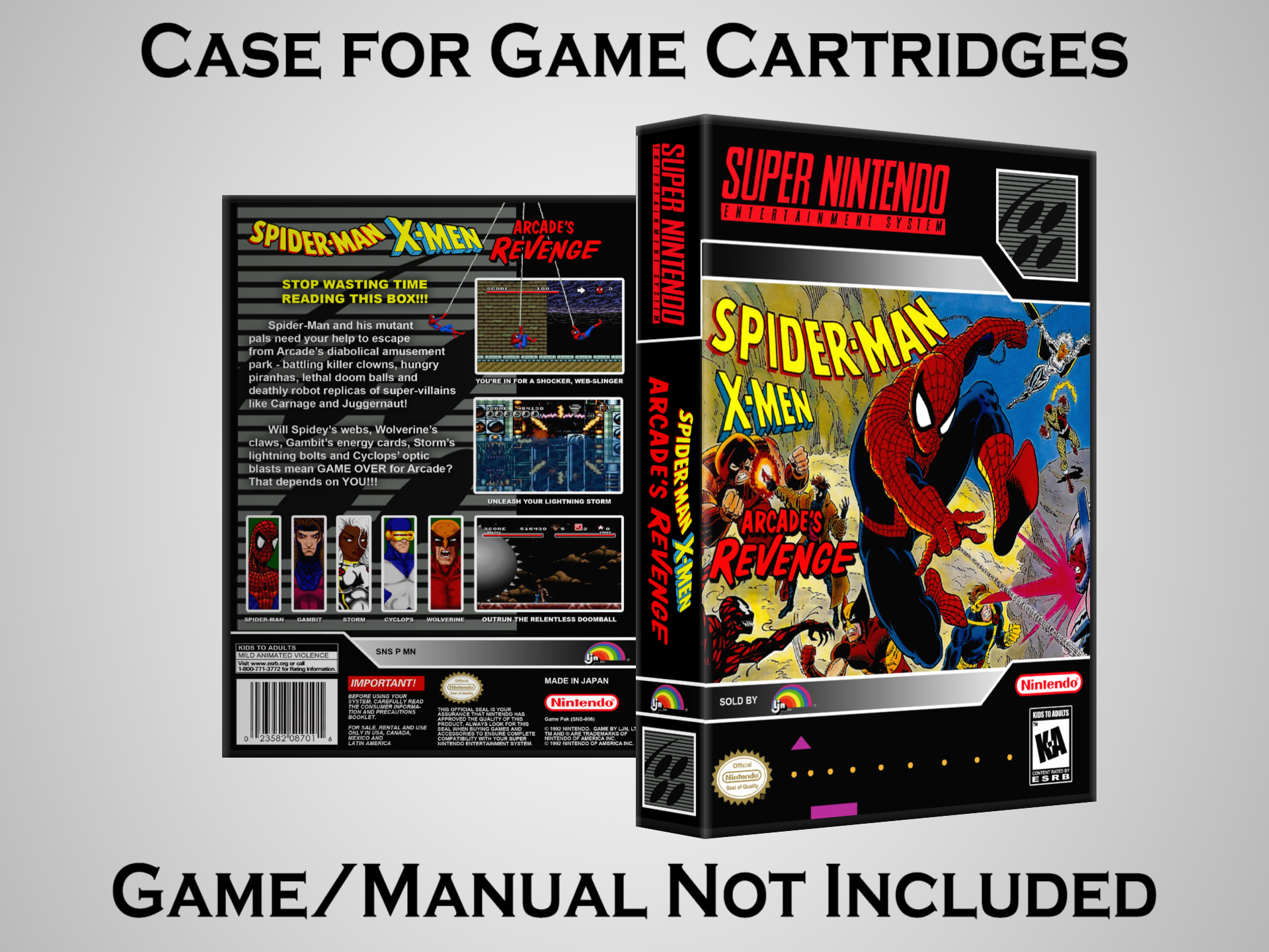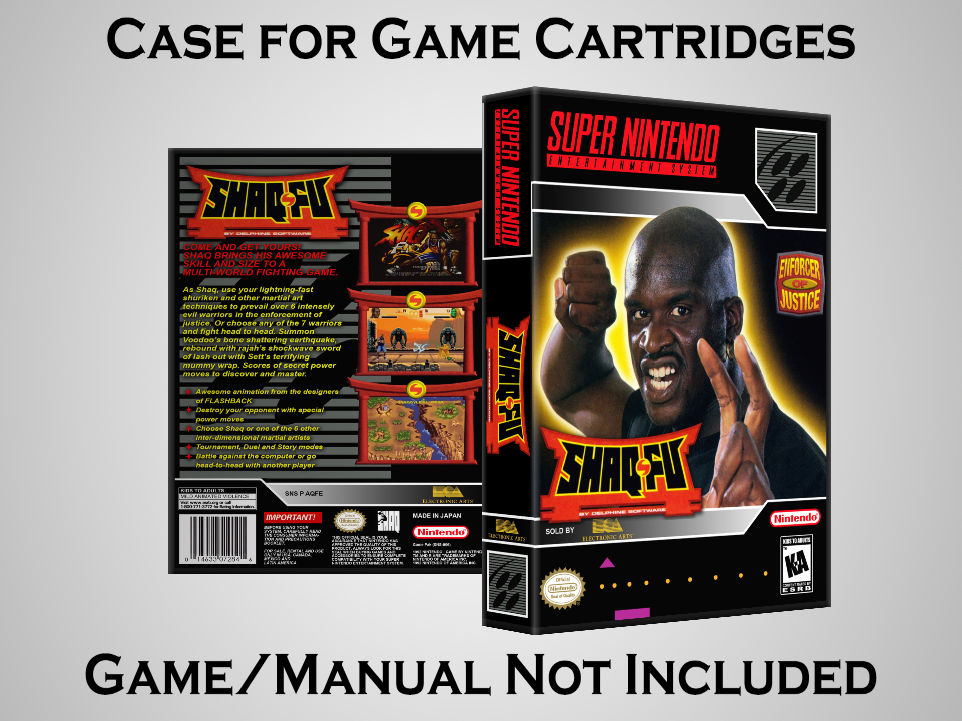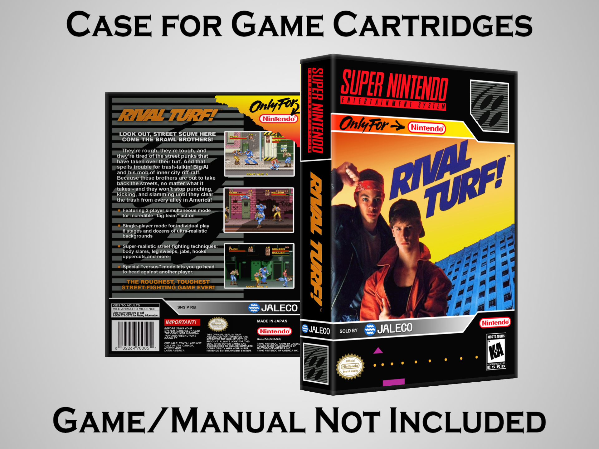 NO GAME OR MANUAL IS INCLUDED! This is NOT an original cardboard box. Case Dimensions : 7.25" x 5.25" x 1.125" Case Color : Dark Grey These cases are designed specifically to hold your Super Nintendo (SNES) cartridges. These are not the low quality Universal Game Cases that most other sellers offer. These firmly hold your cartridges in place, and include clips on the opposite side to hold the instruction manuals if you have them. Our Super Nintendo cases are split into multiple listings alphabetically due to the limit on options in one listing. You can find the rest of our cases in the following links: SNES Cases from # to F SNES Cases from G to N SNES Cases from O to S SNES Cases from T to Z Click here to find more cases in our eBay store!