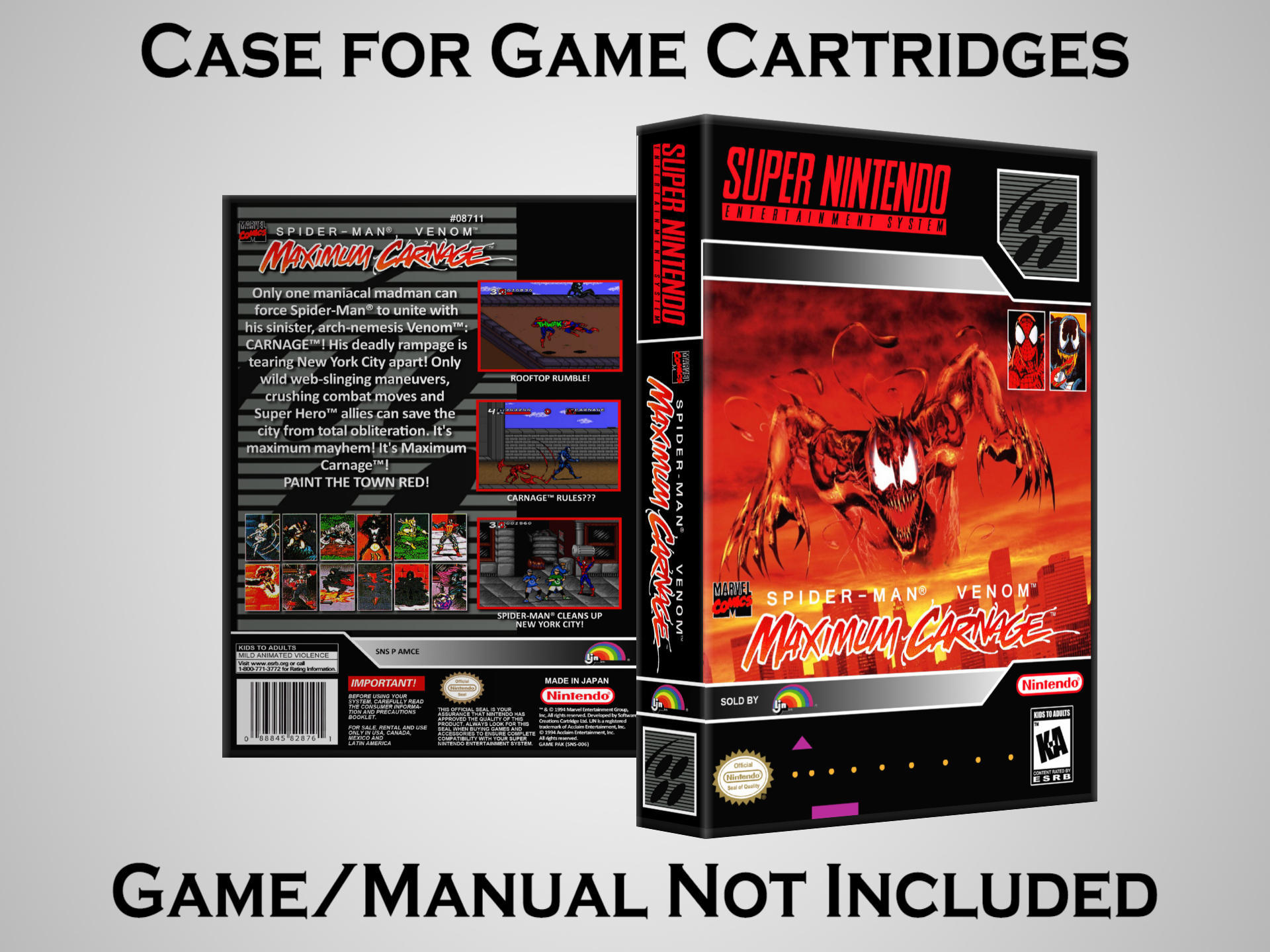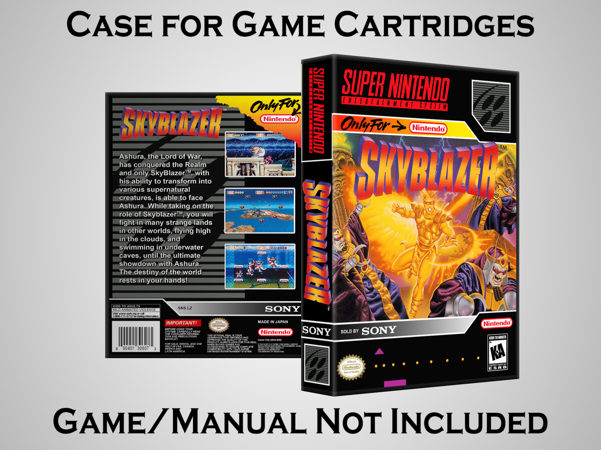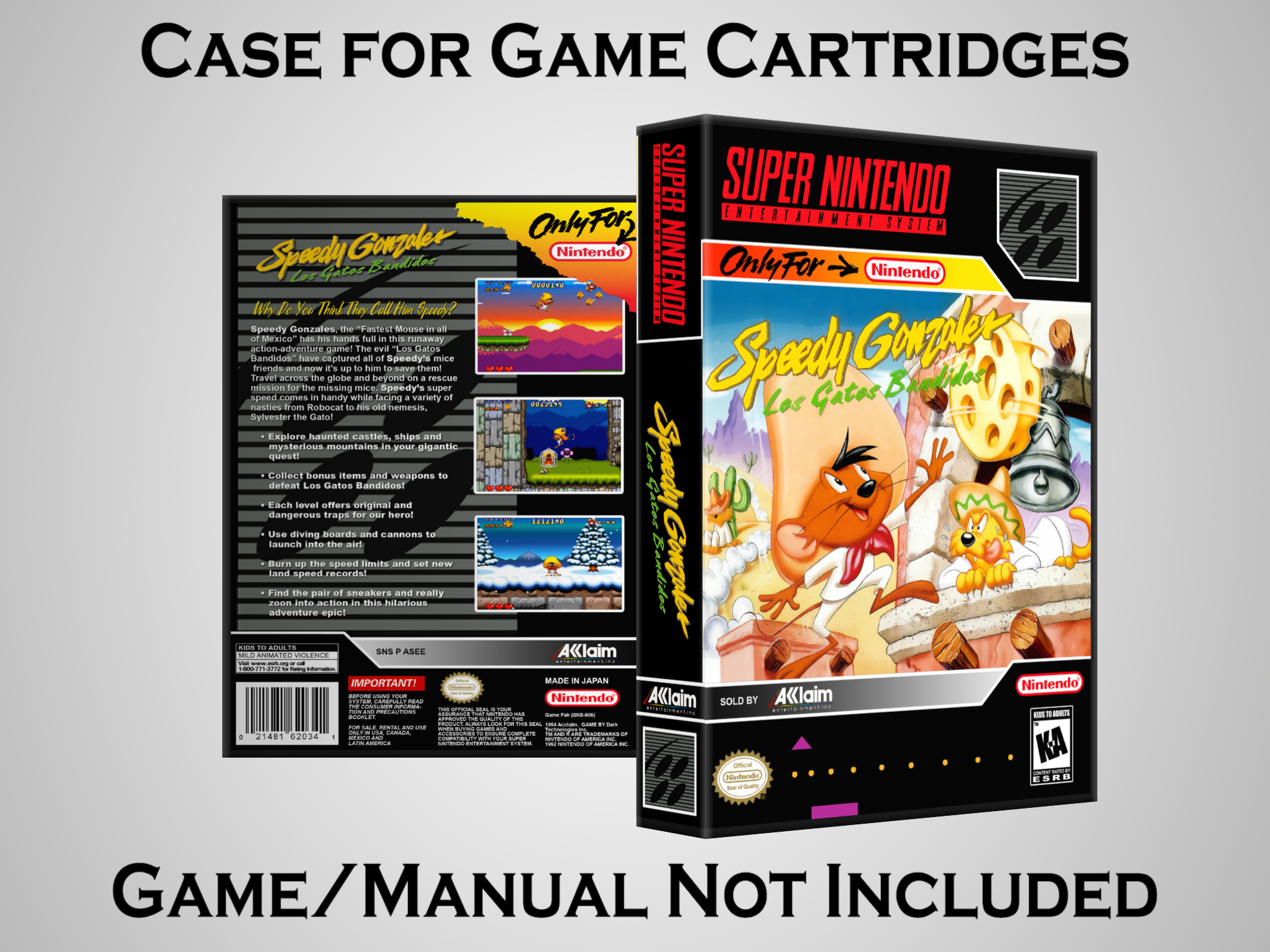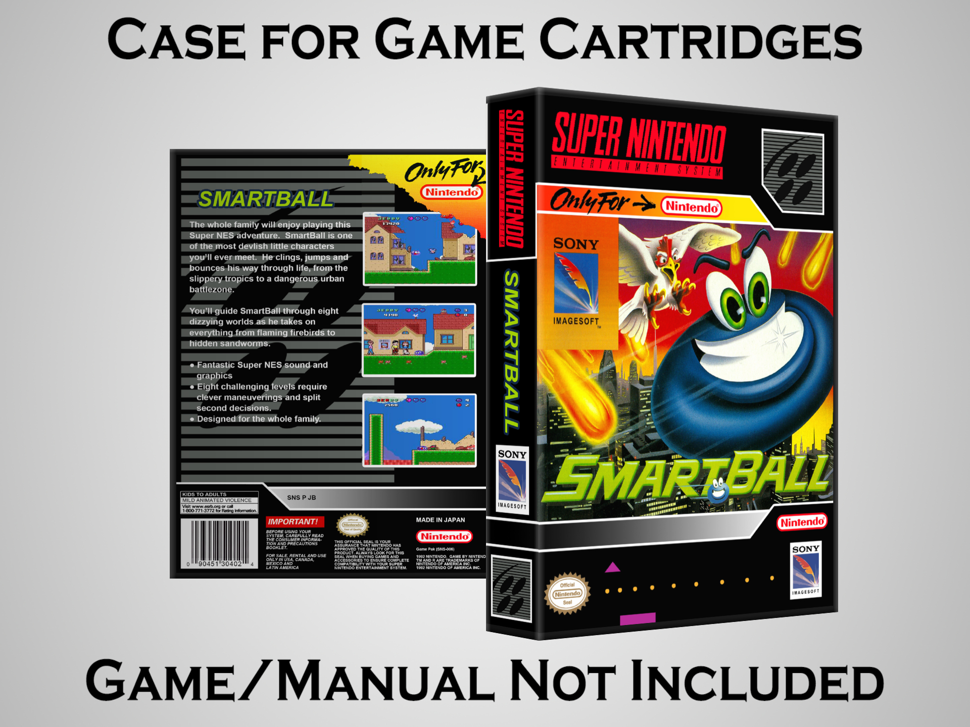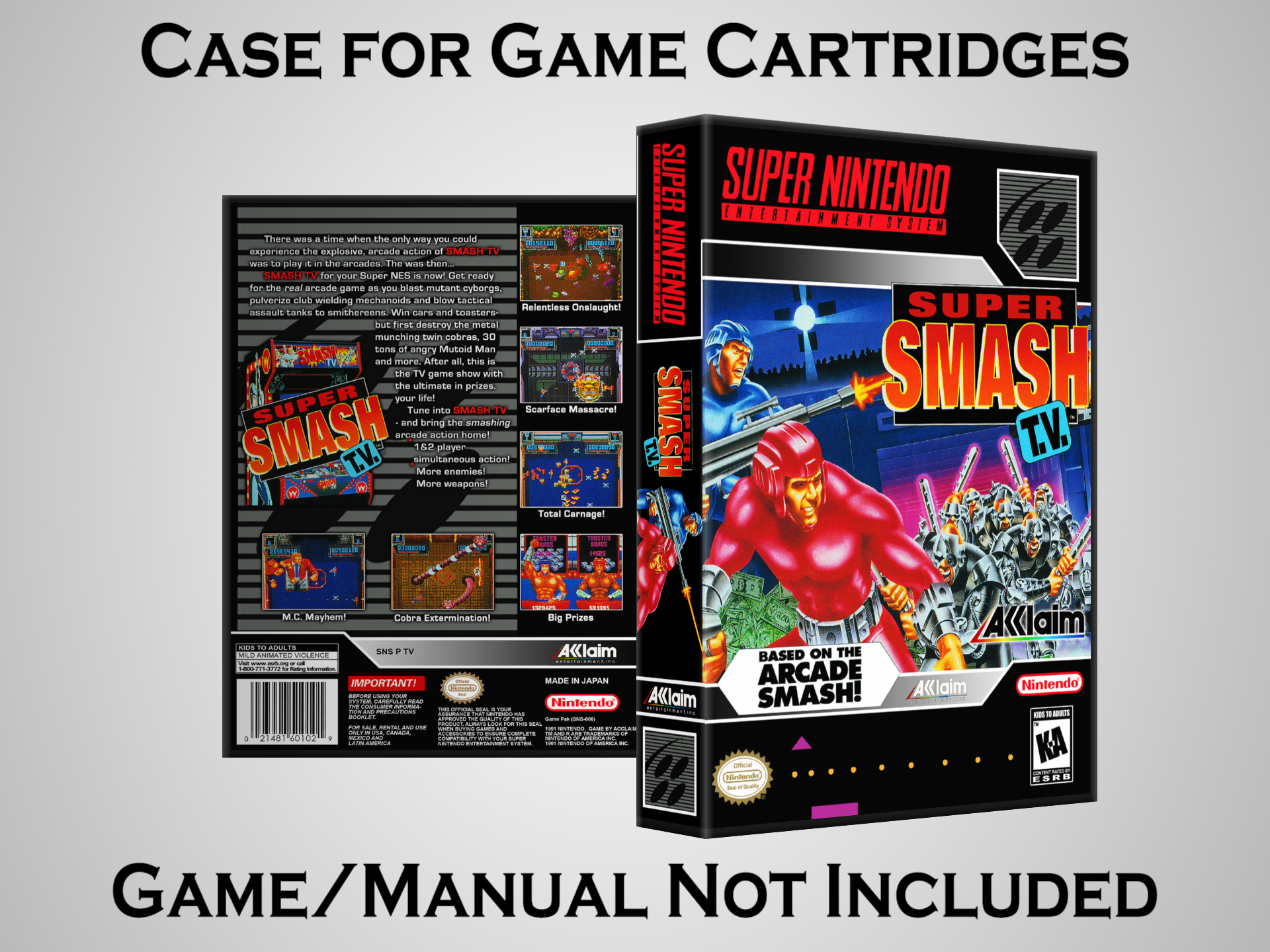 NO GAME OR MANUAL IS INCLUDED! This is NOT an original cardboard box. Case Dimensions : 7.25" x 5.25" x 1.125" Case Color : Dark Grey These cases are designed specifically to hold your Super Nintendo (SNES) cartridges. These are not the low quality Universal Game Cases that most other sellers offer. These firmly hold your cartridges in place, and include clips on the opposite side to hold the instruction manuals if you have them. Our Super Nintendo cases are split into multiple listings alphabetically due to the limit on options in one listing. You can find the rest of our cases in the following links: SNES Cases from # to F SNES Cases from G to N SNES Cases from O to S SNES Cases from T to Z Click here to find more cases in our eBay store!