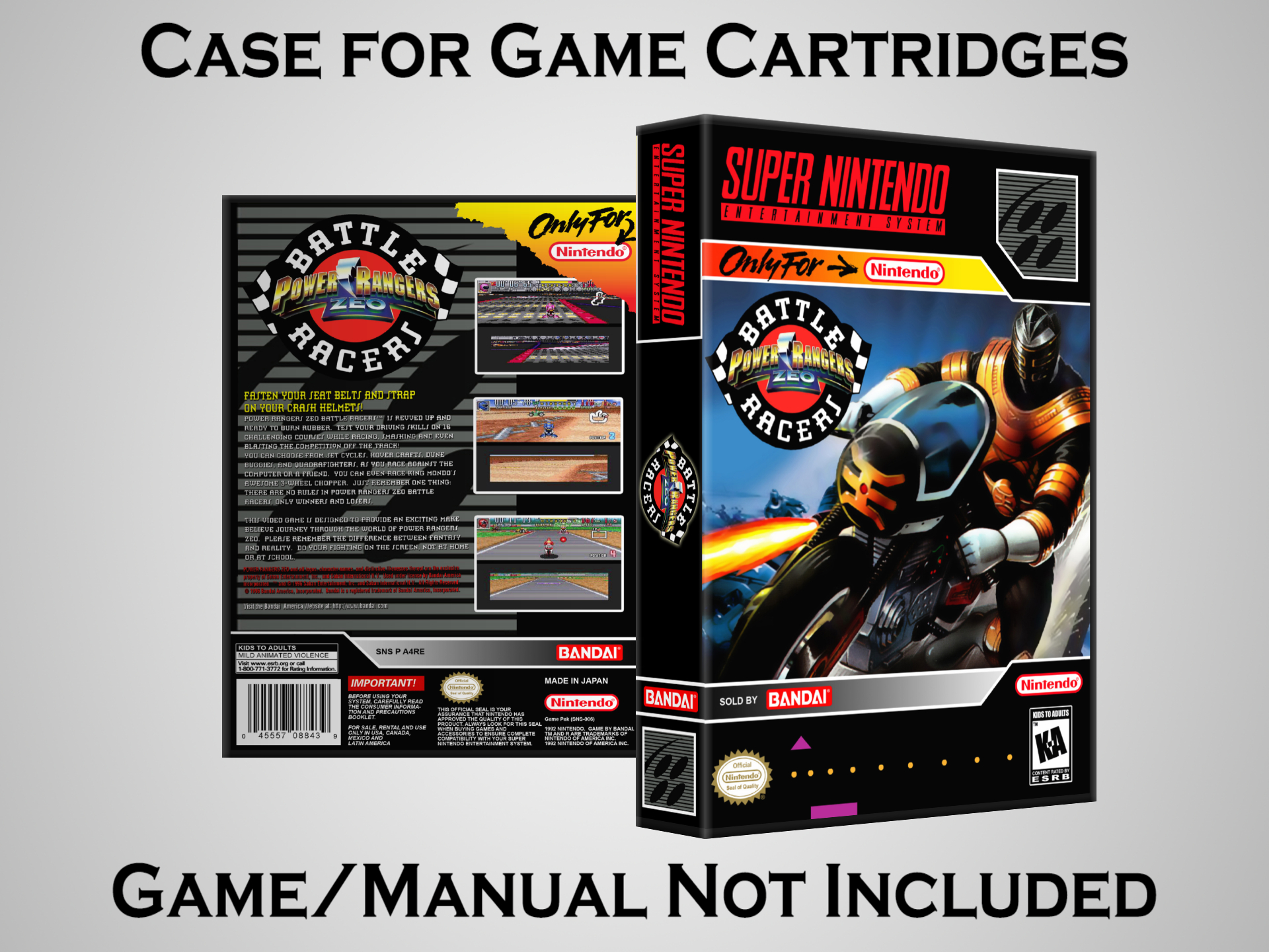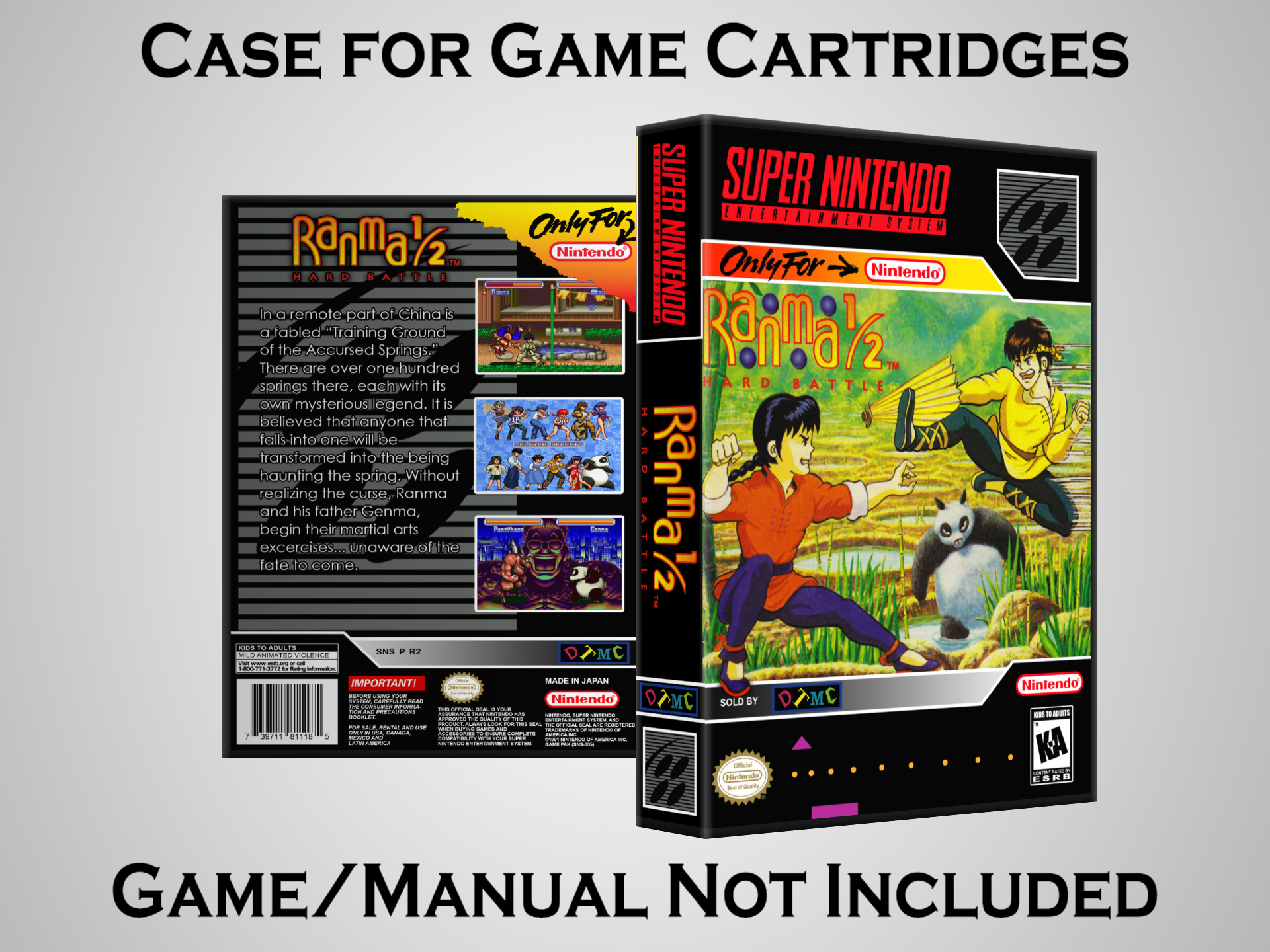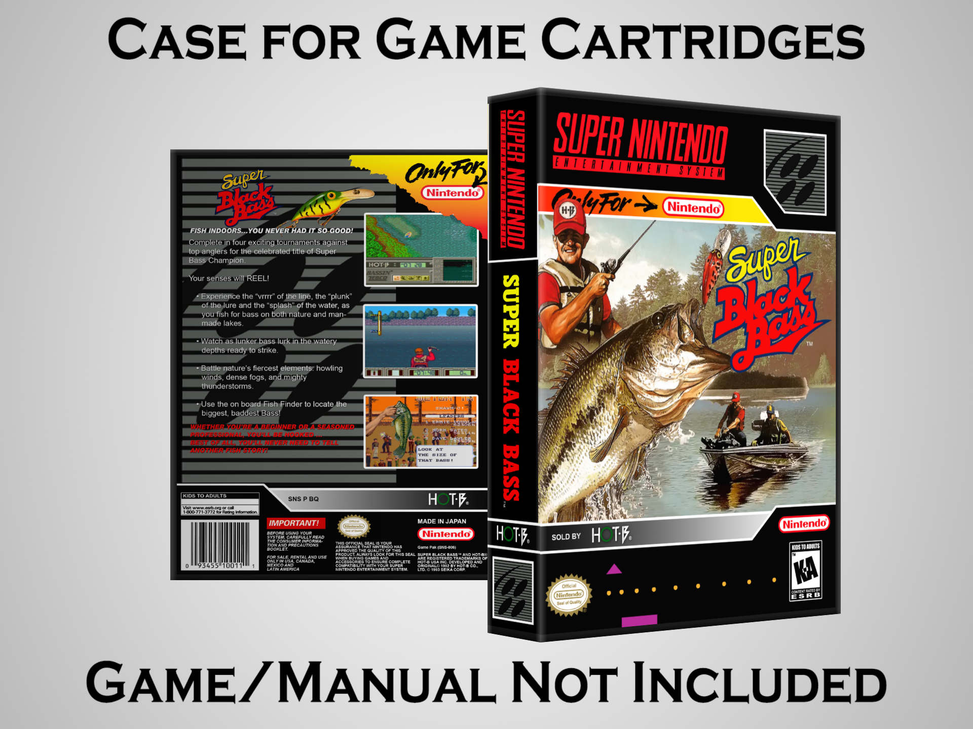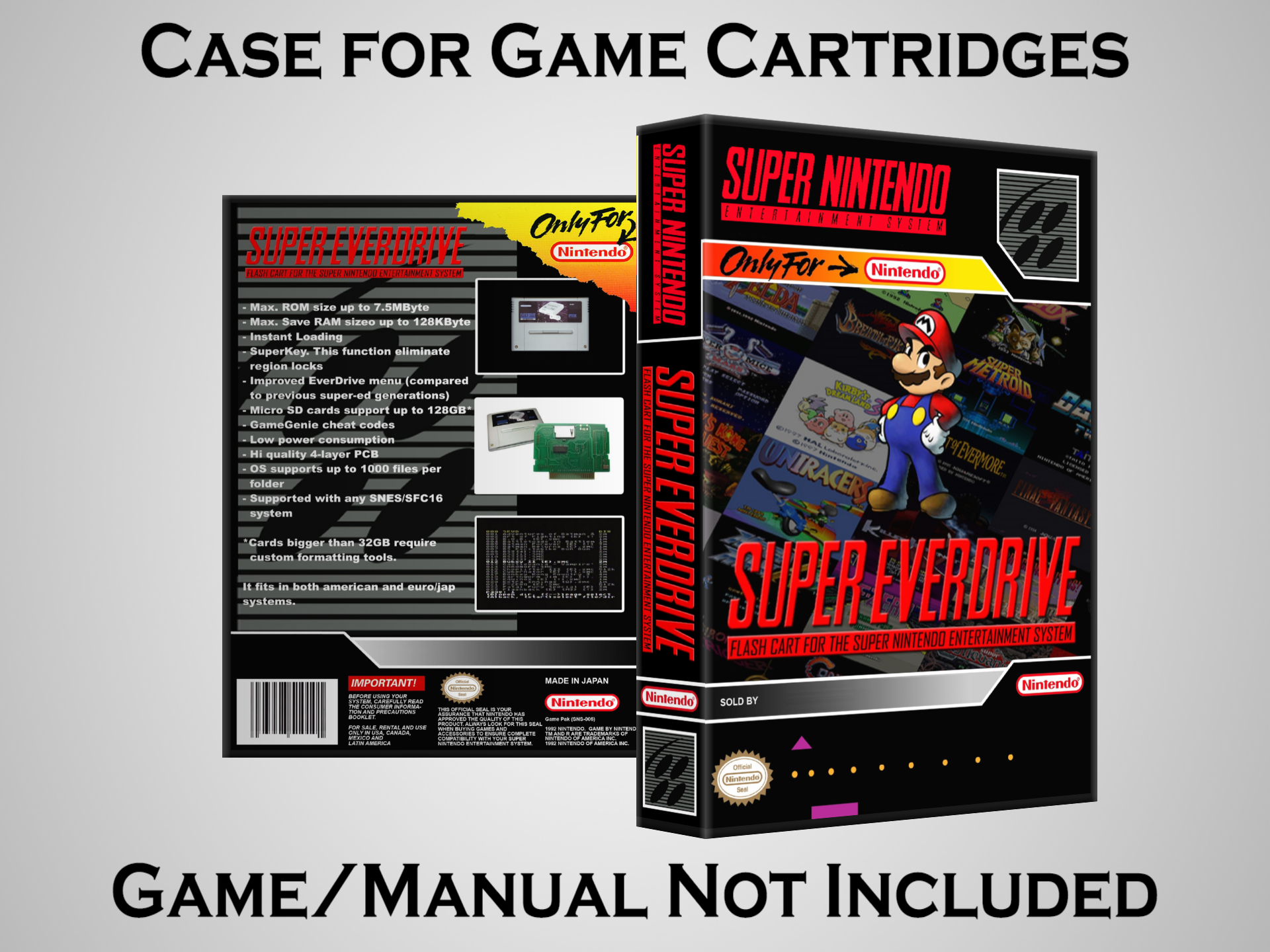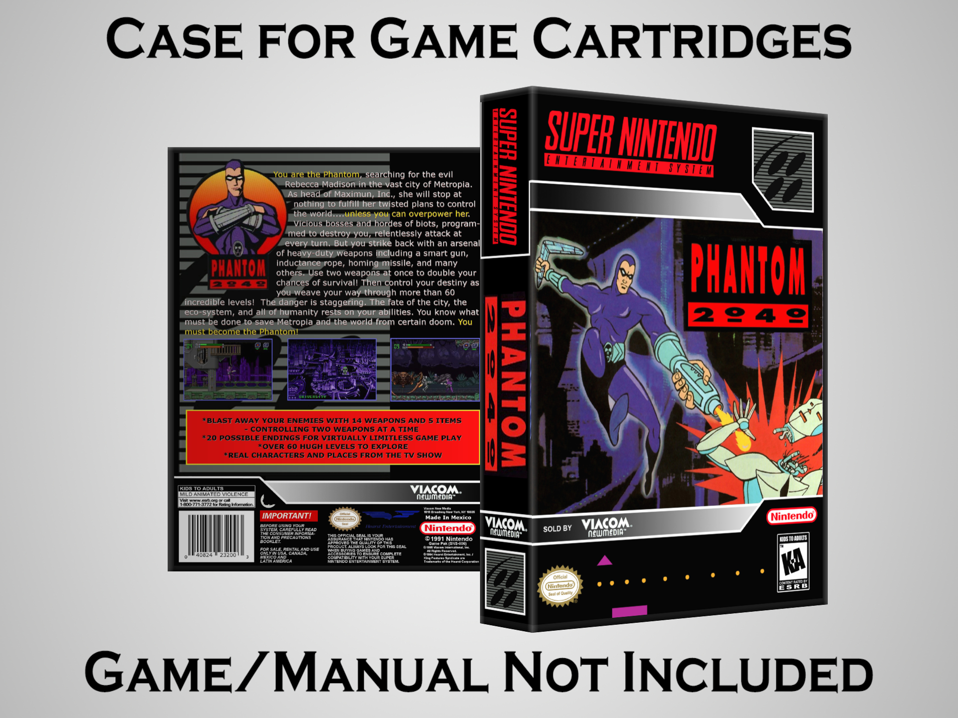 NO GAME OR MANUAL IS INCLUDED! This is NOT an original cardboard box. Case Dimensions : 7.25" x 5.25" x 1.125" Case Color : Dark Grey These cases are designed specifically to hold your Super Nintendo (SNES) cartridges. These are not the low quality Universal Game Cases that most other sellers offer. These firmly hold your cartridges in place, and include clips on the opposite side to hold the instruction manuals if you have them. Our Super Nintendo cases are split into multiple listings alphabetically due to the limit on options in one listing. You can find the rest of our cases in the following links: SNES Cases from # to F SNES Cases from G to N SNES Cases from O to S SNES Cases from T to Z Click here to find more cases in our eBay store!