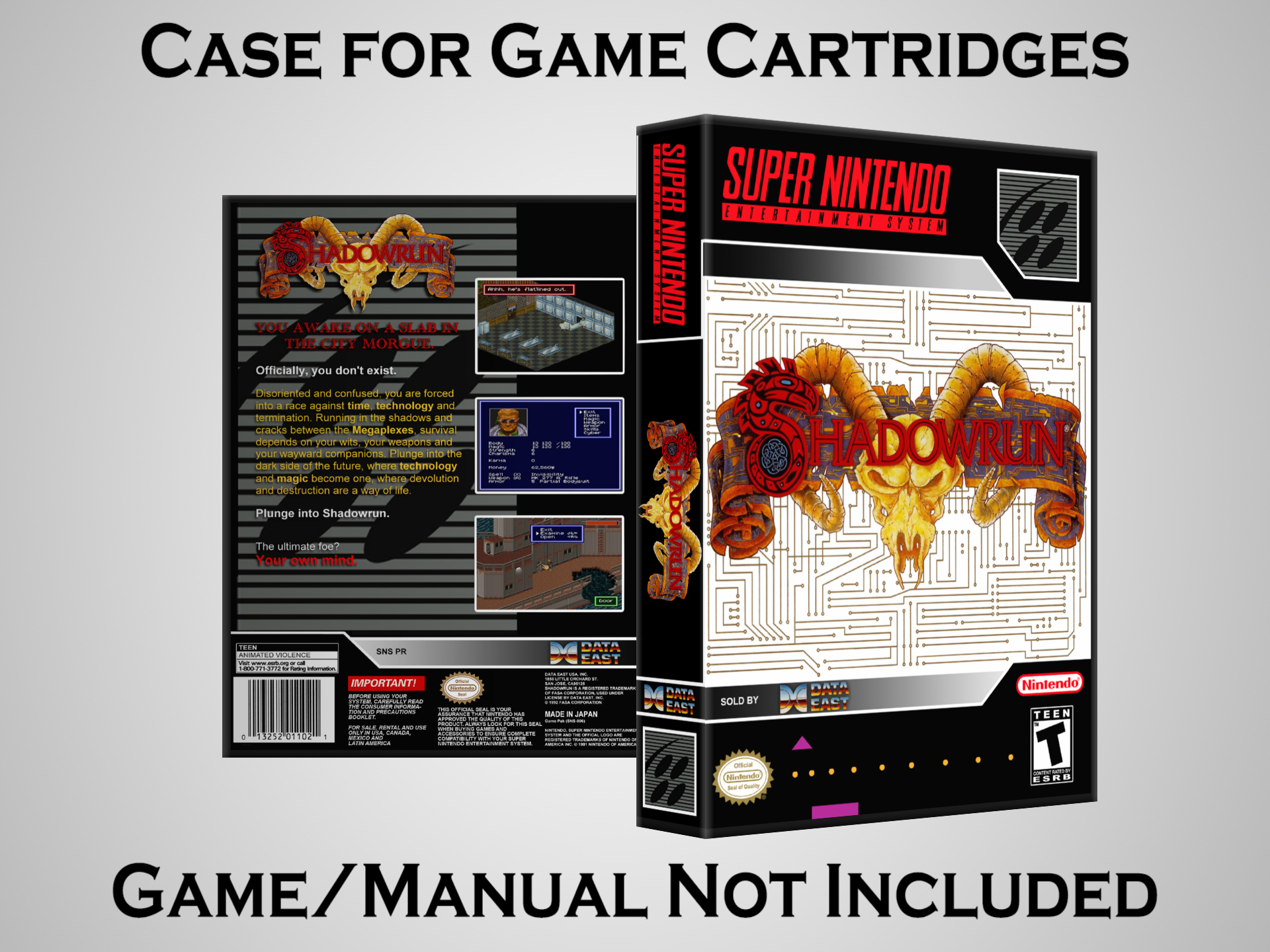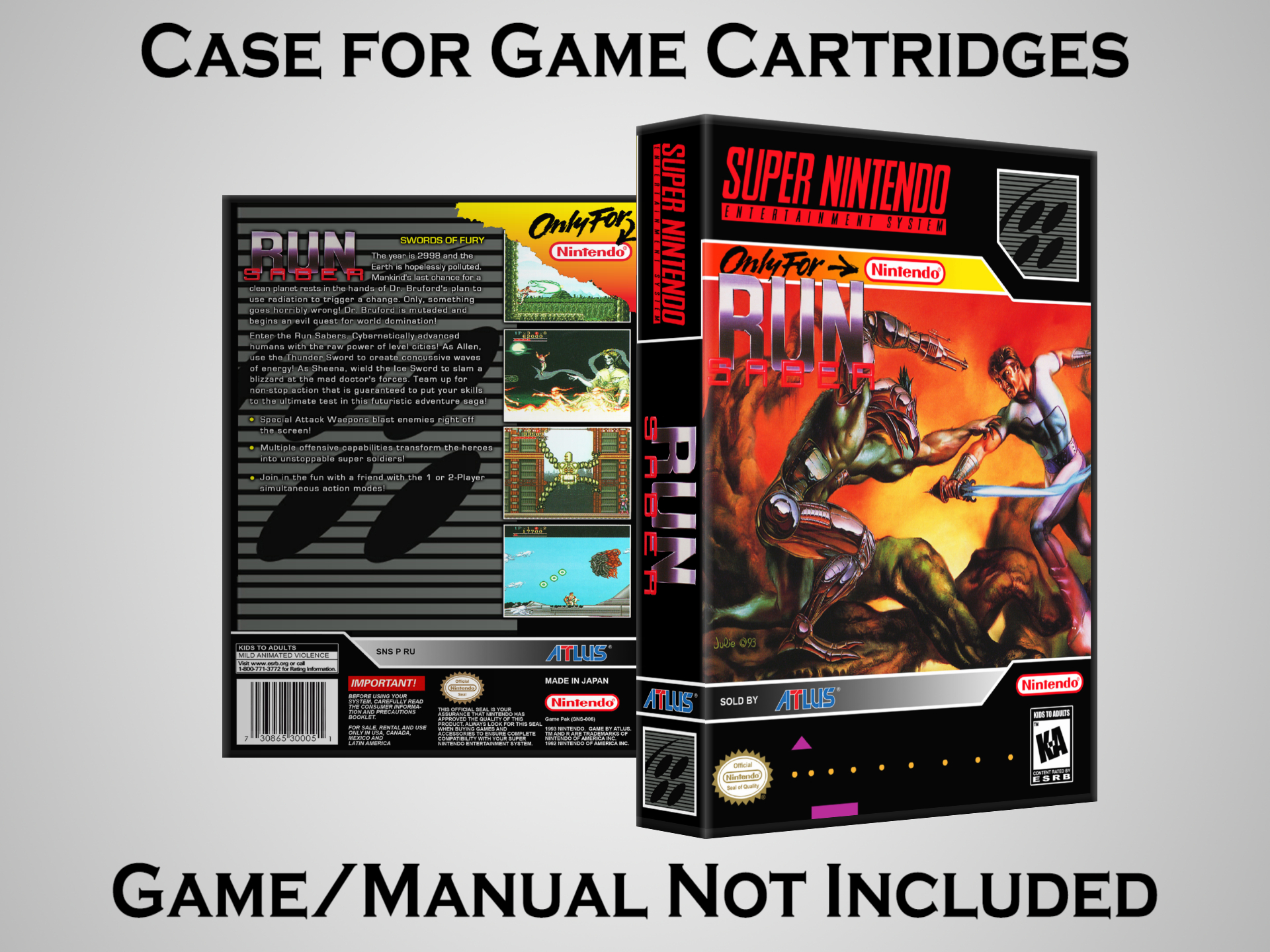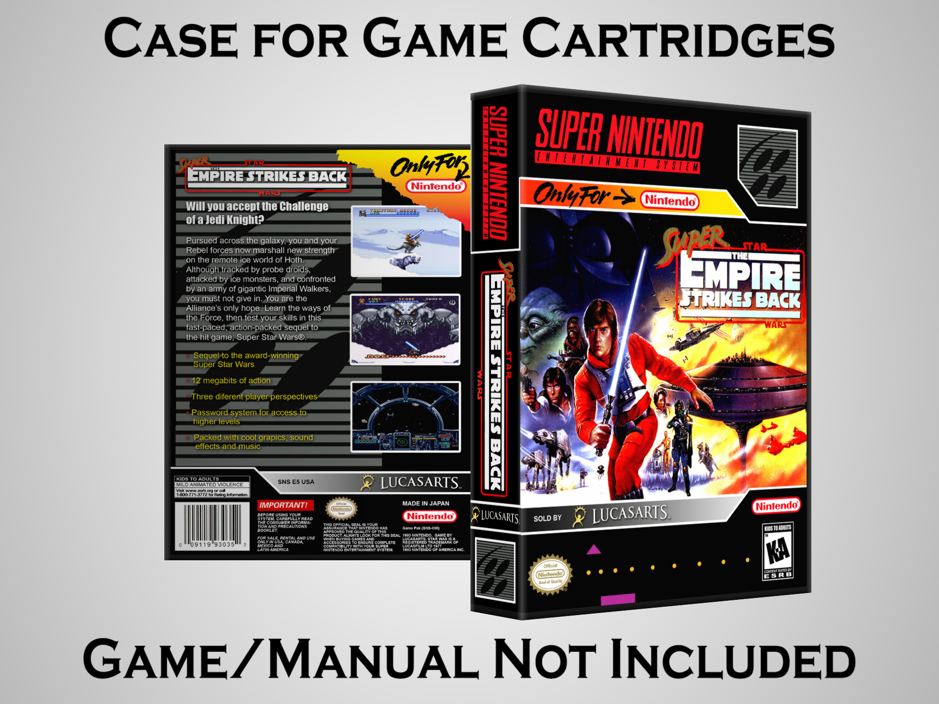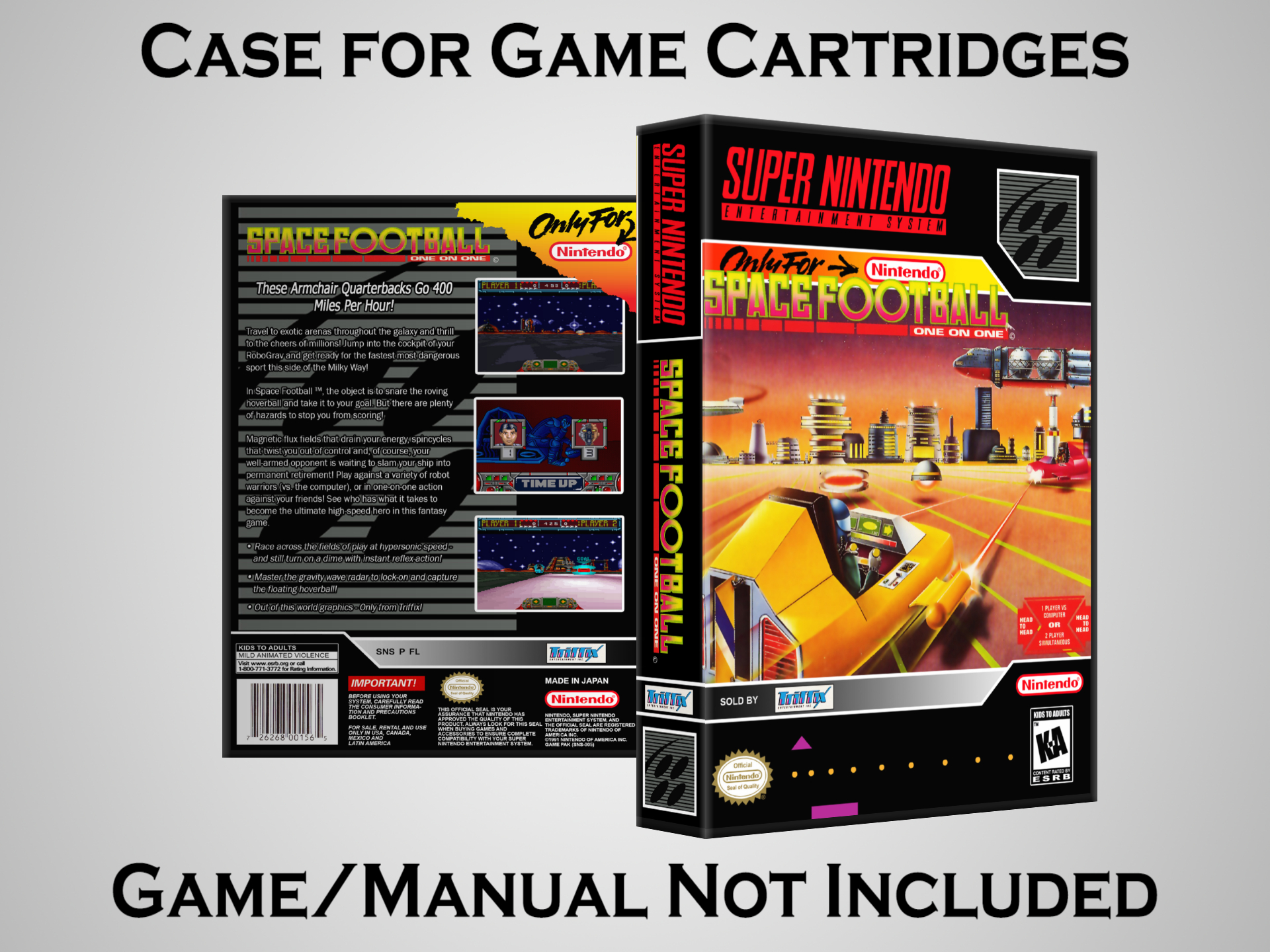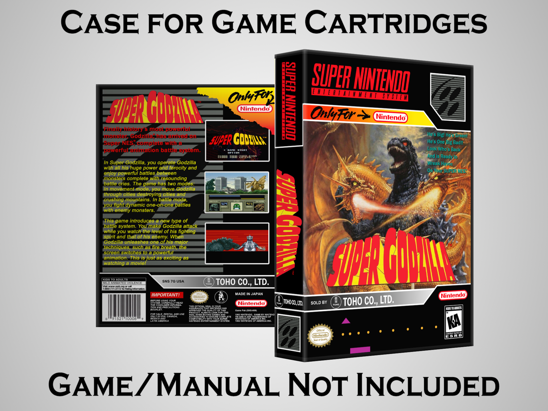 NO GAME OR MANUAL IS INCLUDED! This is NOT an original cardboard box. Case Dimensions : 7.25" x 5.25" x 1.125" Case Color : Dark Grey These cases are designed specifically to hold your Super Nintendo (SNES) cartridges. These are not the low quality Universal Game Cases that most other sellers offer. These firmly hold your cartridges in place, and include clips on the opposite side to hold the instruction manuals if you have them. Our Super Nintendo cases are split into multiple listings alphabetically due to the limit on options in one listing. You can find the rest of our cases in the following links: SNES Cases from # to F SNES Cases from G to N SNES Cases from O to S SNES Cases from T to Z Click here to find more cases in our eBay store!