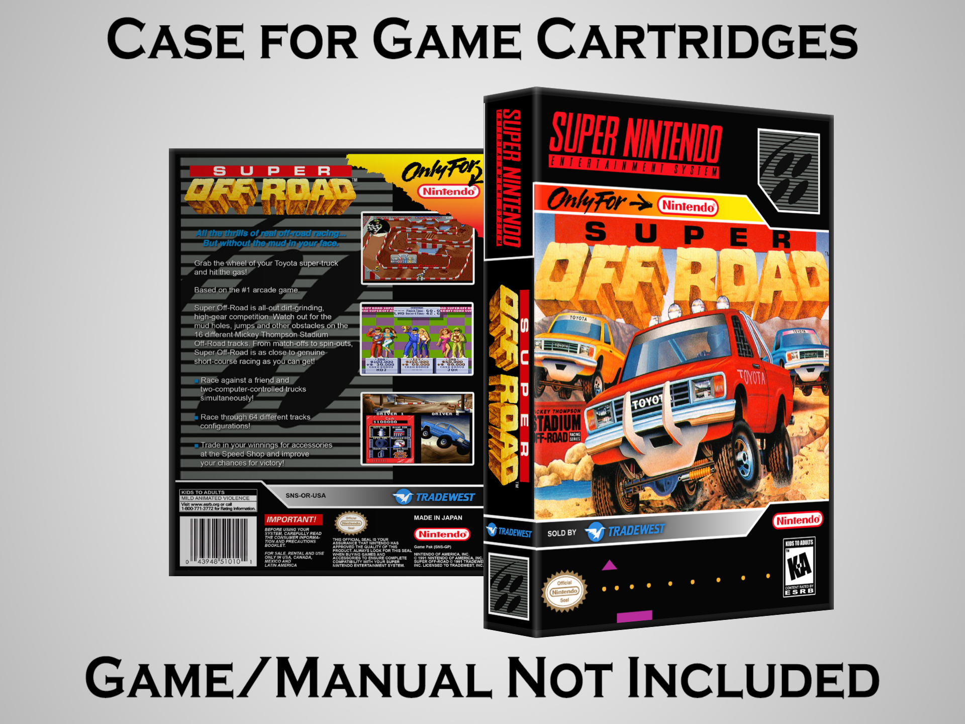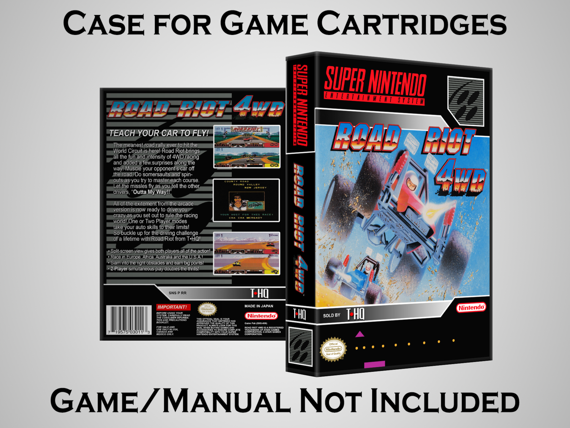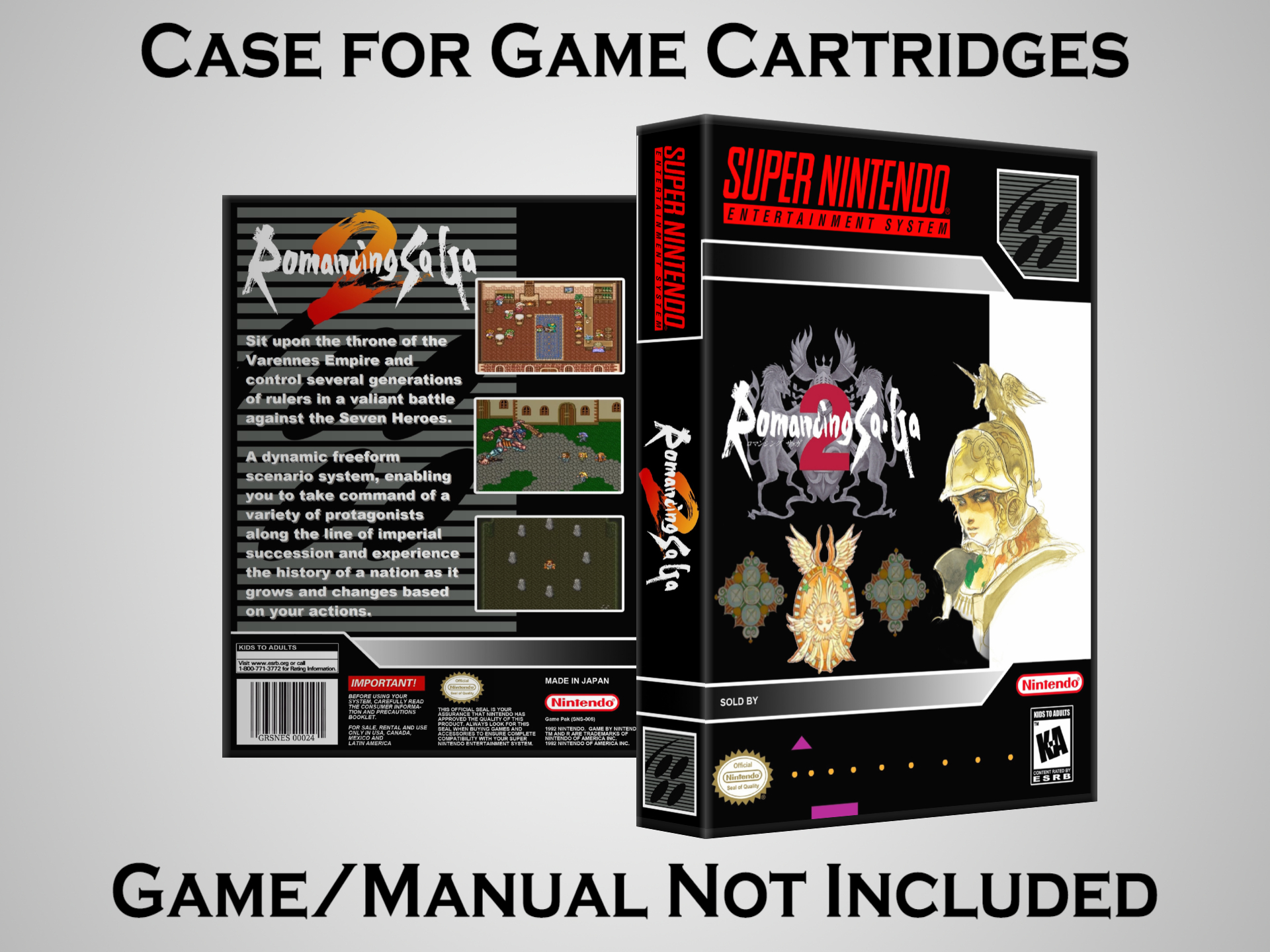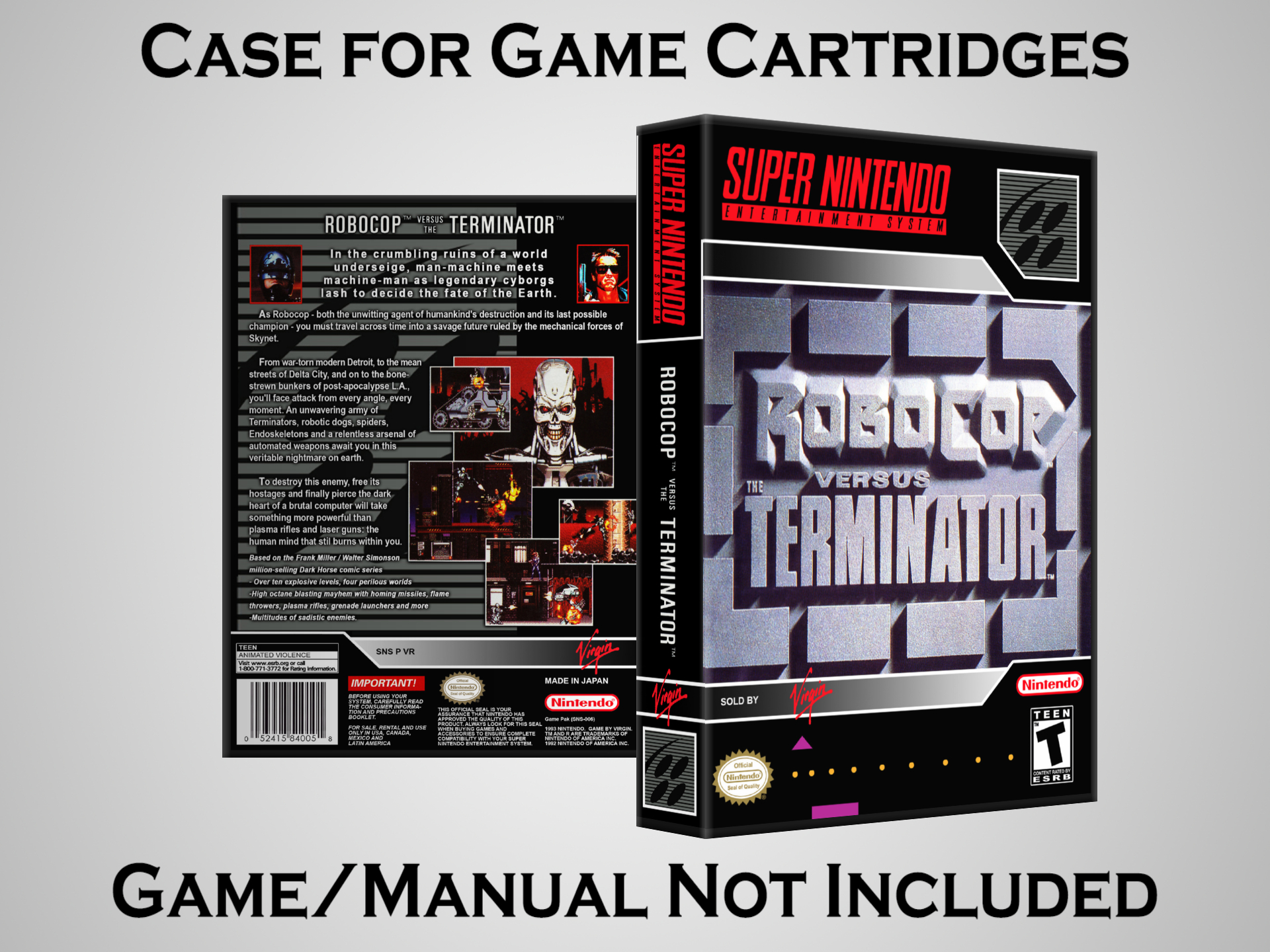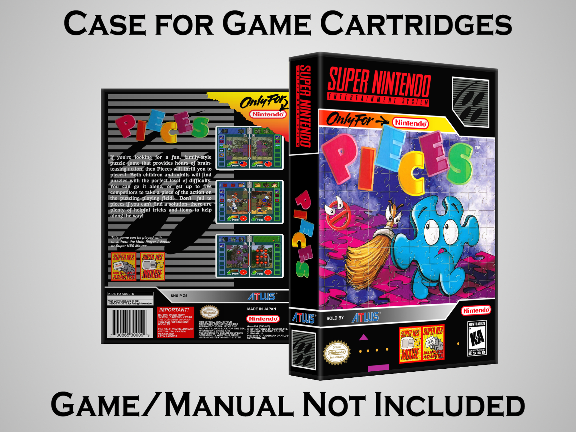 NO GAME OR MANUAL IS INCLUDED! This is NOT an original cardboard box. Case Dimensions : 7.25" x 5.25" x 1.125" Case Color : Dark Grey These cases are designed specifically to hold your Super Nintendo (SNES) cartridges. These are not the low quality Universal Game Cases that most other sellers offer. These firmly hold your cartridges in place, and include clips on the opposite side to hold the instruction manuals if you have them. Our Super Nintendo cases are split into multiple listings alphabetically due to the limit on options in one listing. You can find the rest of our cases in the following links: SNES Cases from # to F SNES Cases from G to N SNES Cases from O to S SNES Cases from T to Z Click here to find more cases in our eBay store!