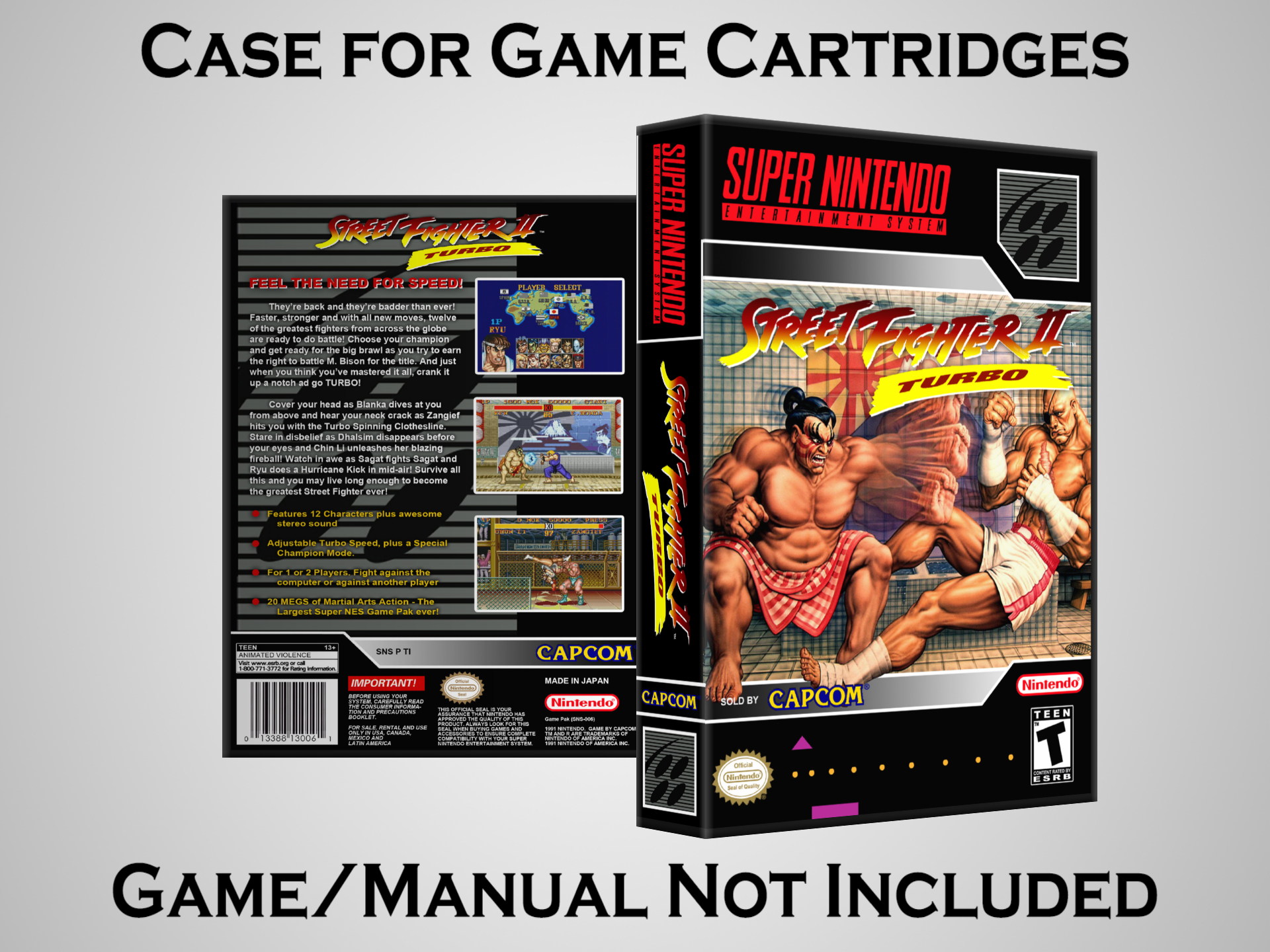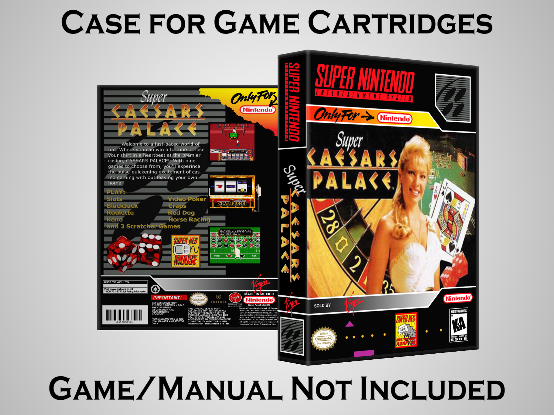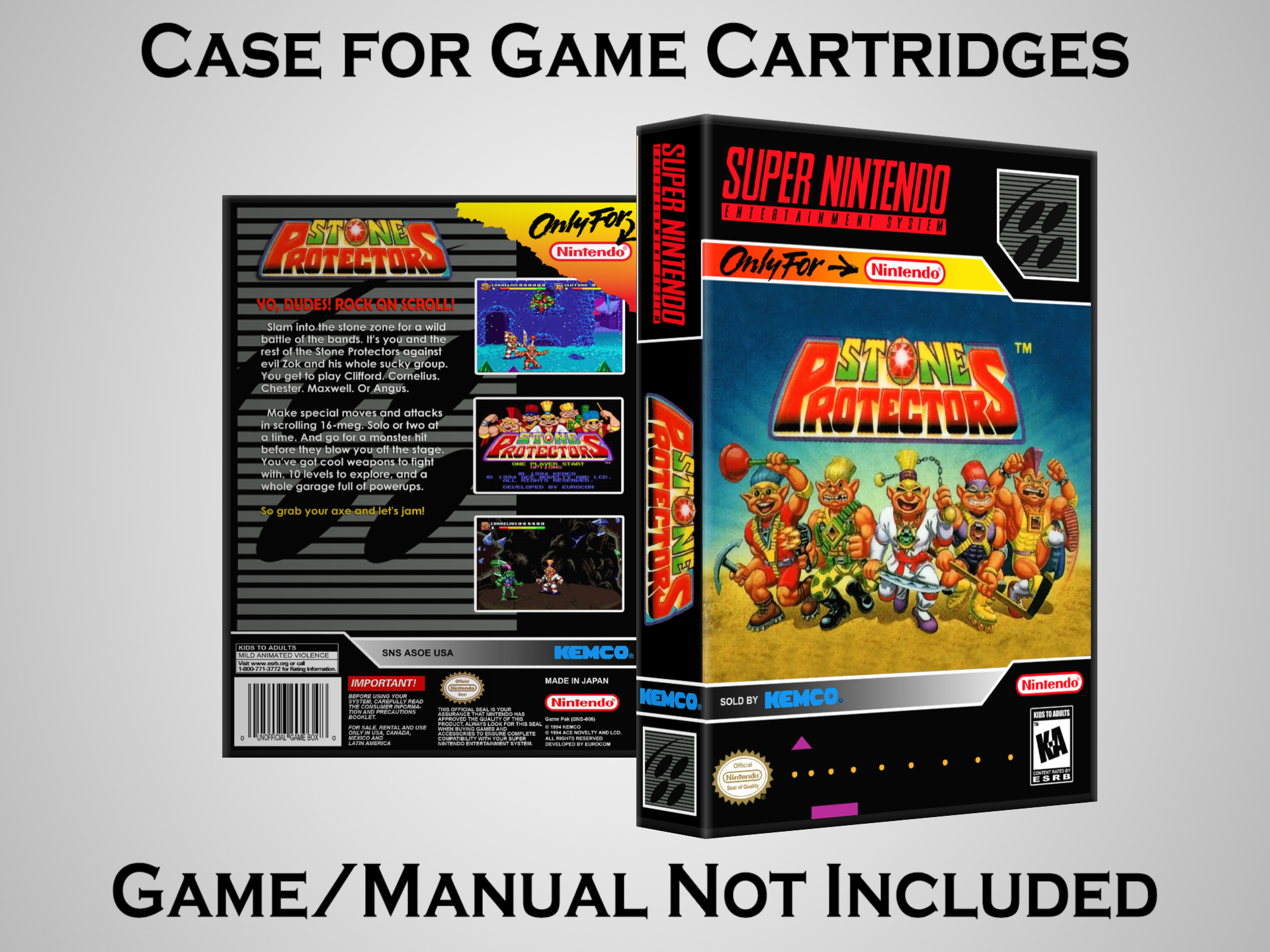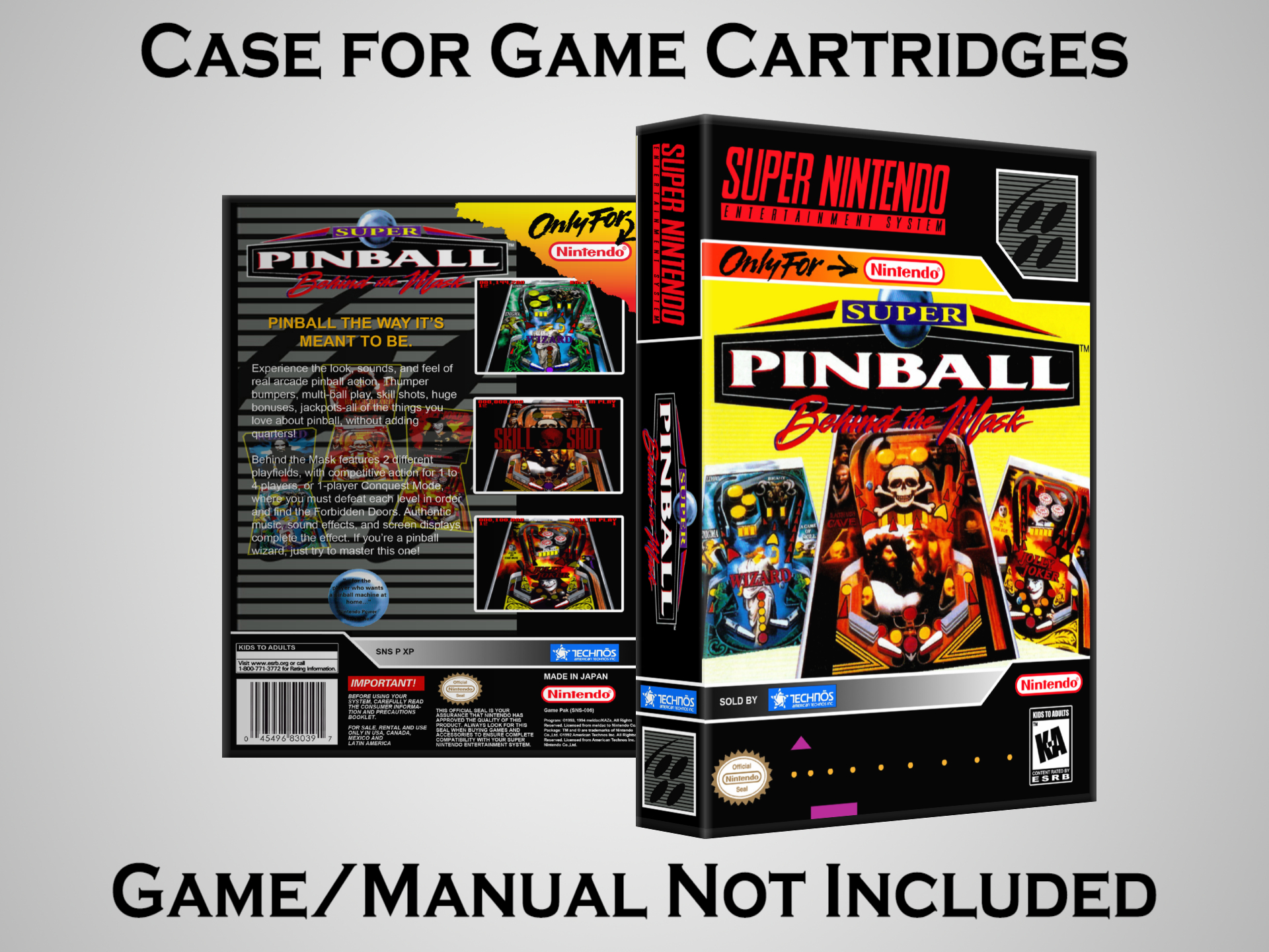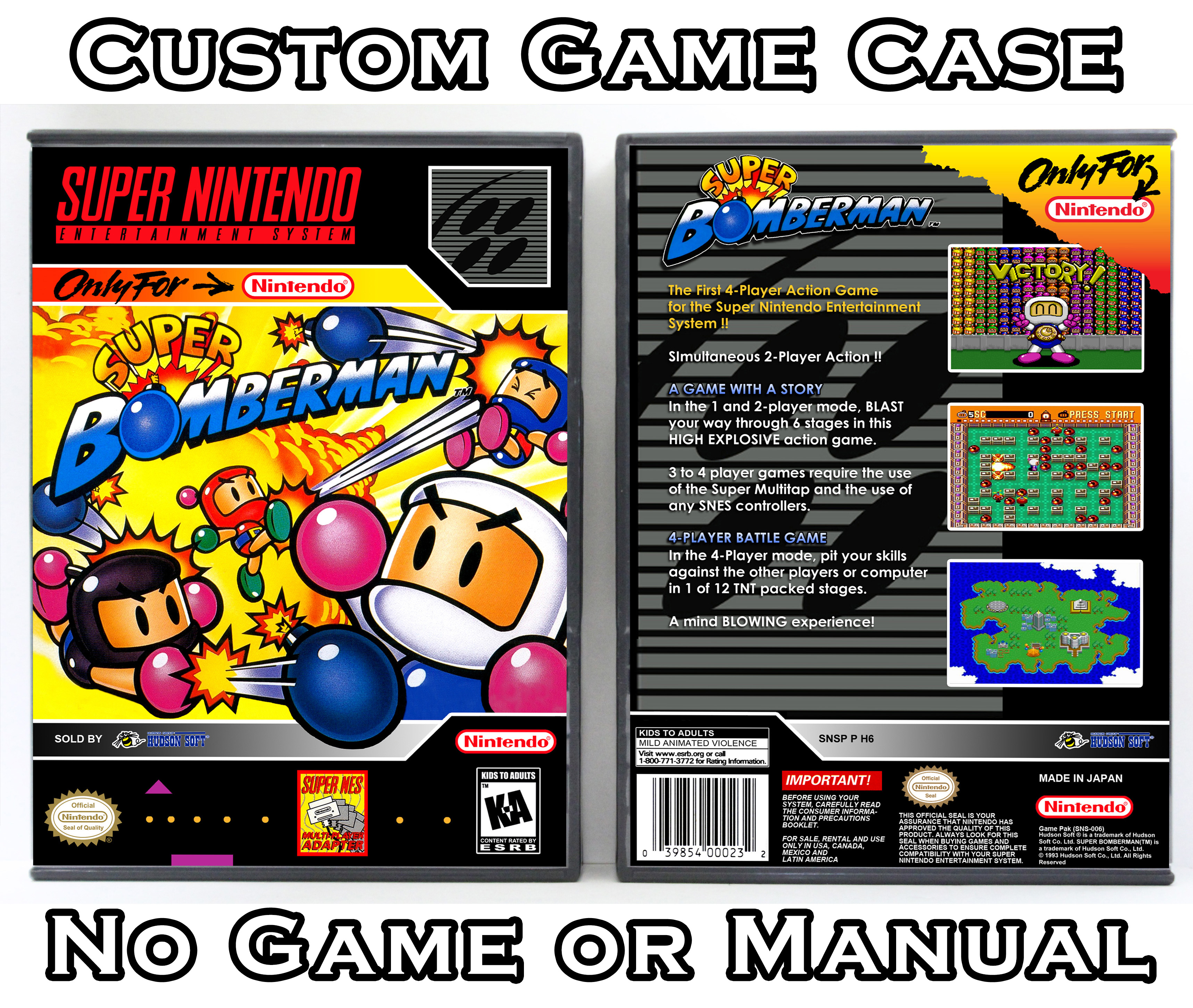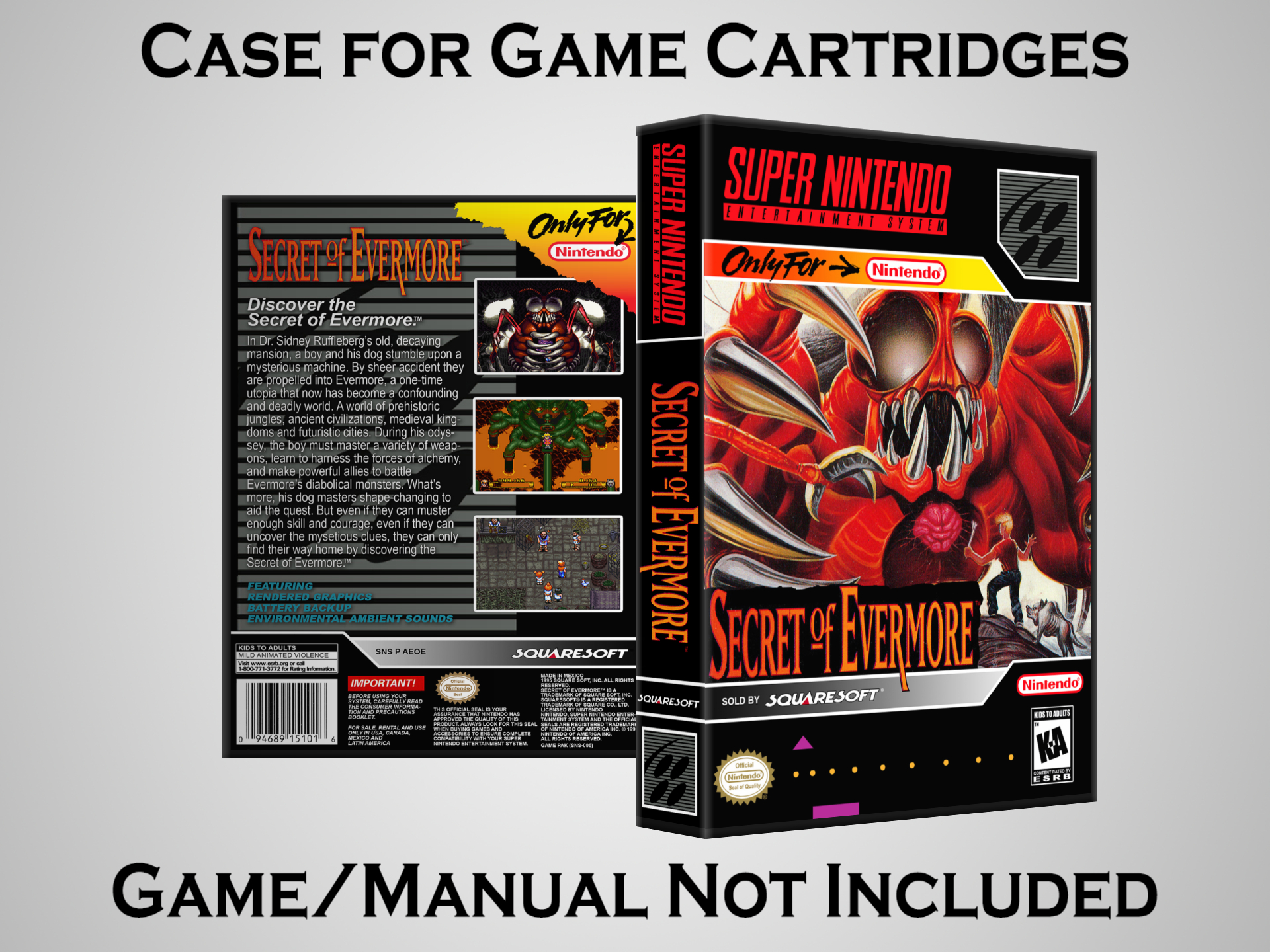 NO GAME OR MANUAL IS INCLUDED! This is NOT an original cardboard box. Case Dimensions : 7.25" x 5.25" x 1.125" Case Color : Dark Grey These cases are designed specifically to hold your Super Nintendo (SNES) cartridges. These are not the low quality Universal Game Cases that most other sellers offer. These firmly hold your cartridges in place, and include clips on the opposite side to hold the instruction manuals if you have them. Our Super Nintendo cases are split into multiple listings alphabetically due to the limit on options in one listing. You can find the rest of our cases in the following links: SNES Cases from # to F SNES Cases from G to N SNES Cases from O to S SNES Cases from T to Z Click here to find more cases in our eBay store!