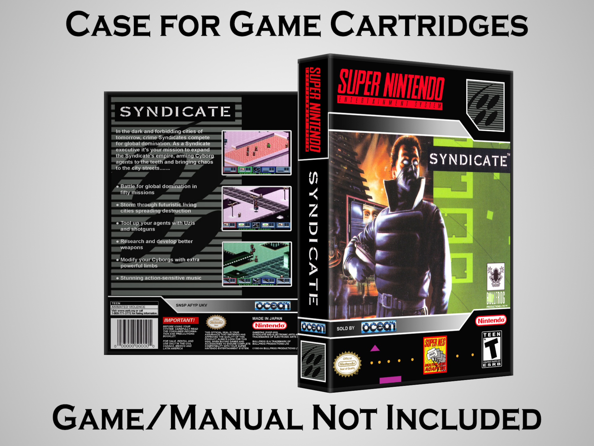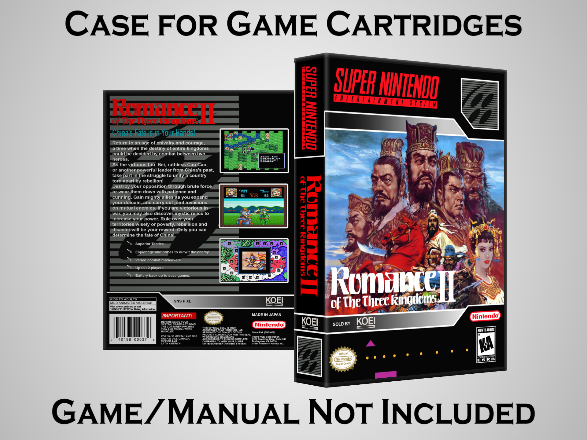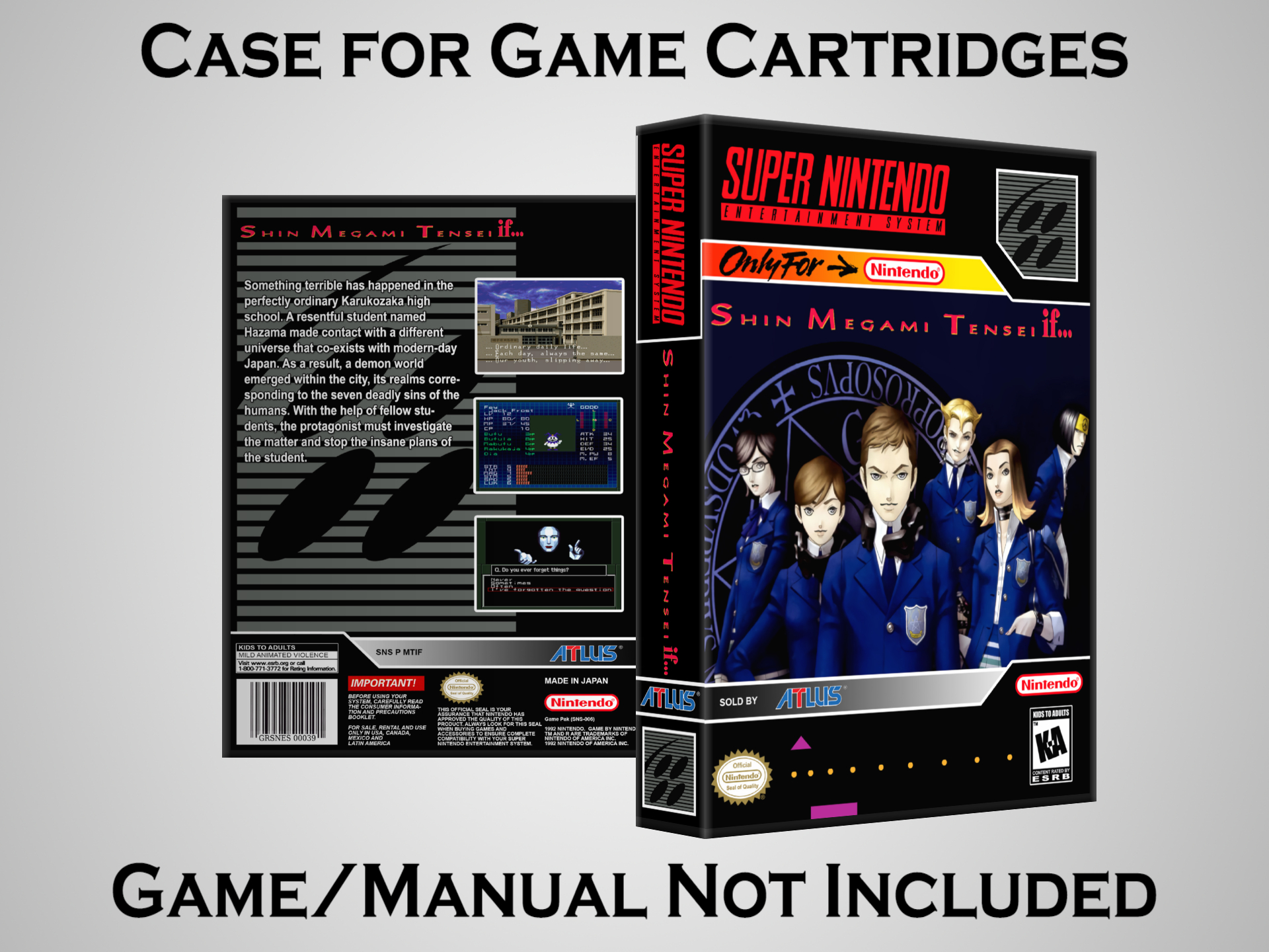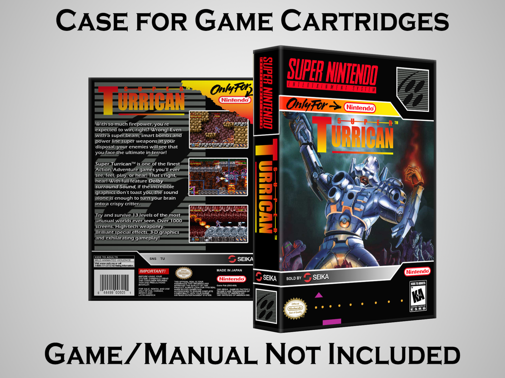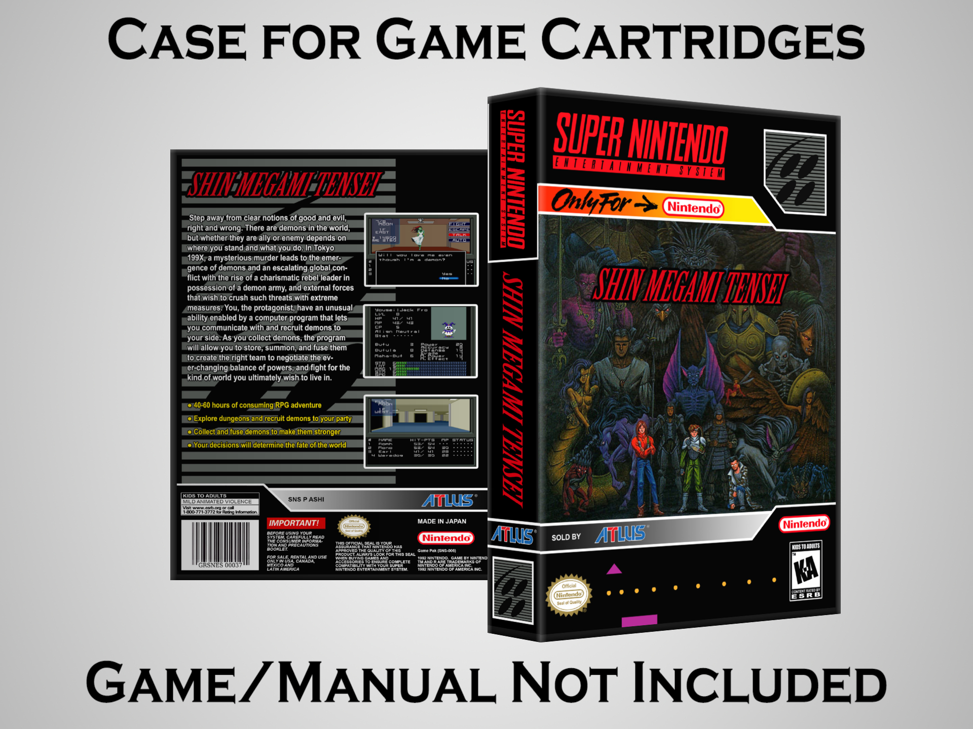 NO GAME OR MANUAL IS INCLUDED! This is NOT an original cardboard box. Case Dimensions : 7.25" x 5.25" x 1.125" Case Color : Dark Grey These cases are designed specifically to hold your Super Nintendo (SNES) cartridges. These are not the low quality Universal Game Cases that most other sellers offer. These firmly hold your cartridges in place, and include clips on the opposite side to hold the instruction manuals if you have them. Our Super Nintendo cases are split into multiple listings alphabetically due to the limit on options in one listing. You can find the rest of our cases in the following links: SNES Cases from # to F SNES Cases from G to N SNES Cases from O to S SNES Cases from T to Z Click here to find more cases in our eBay store!