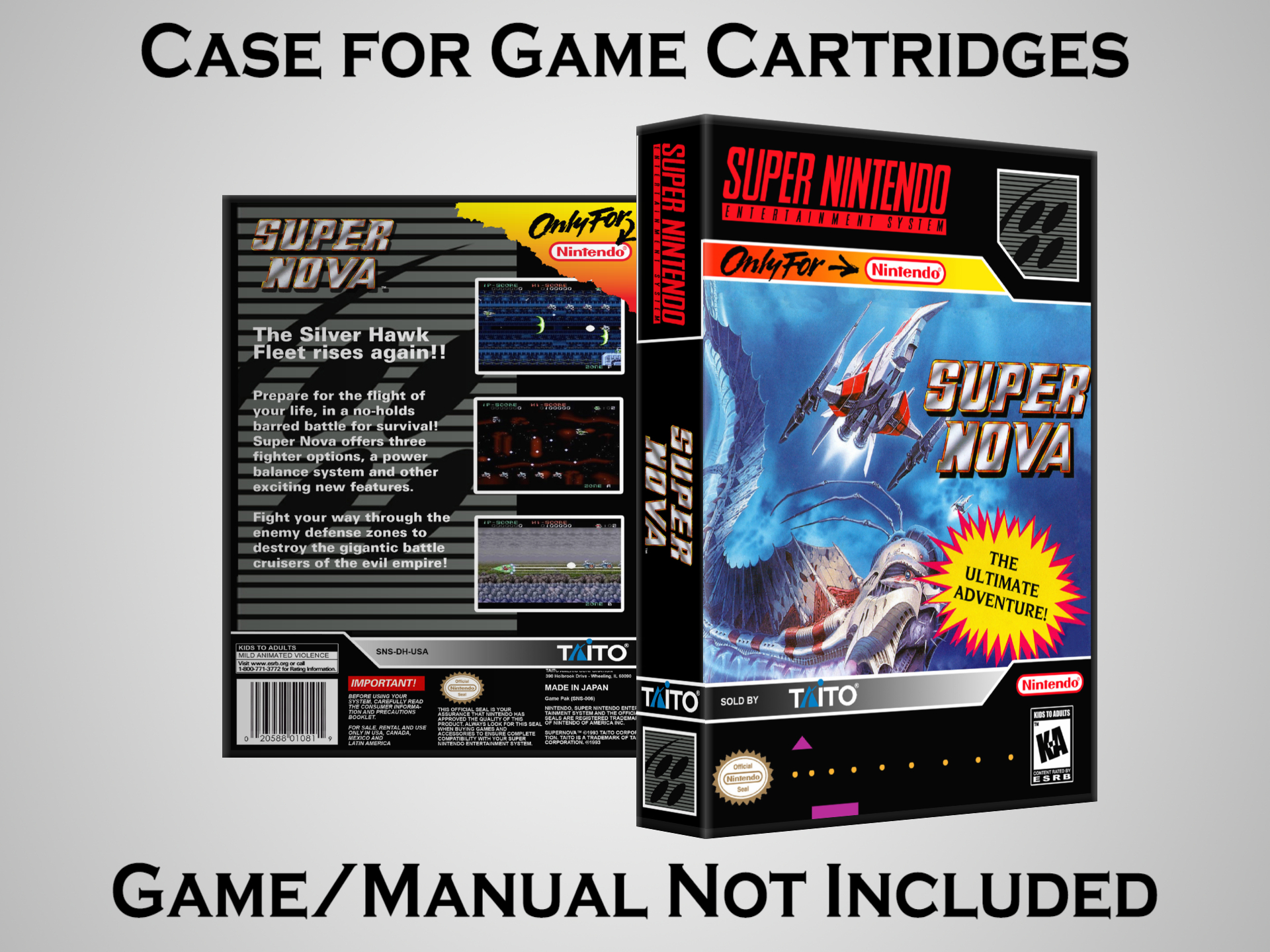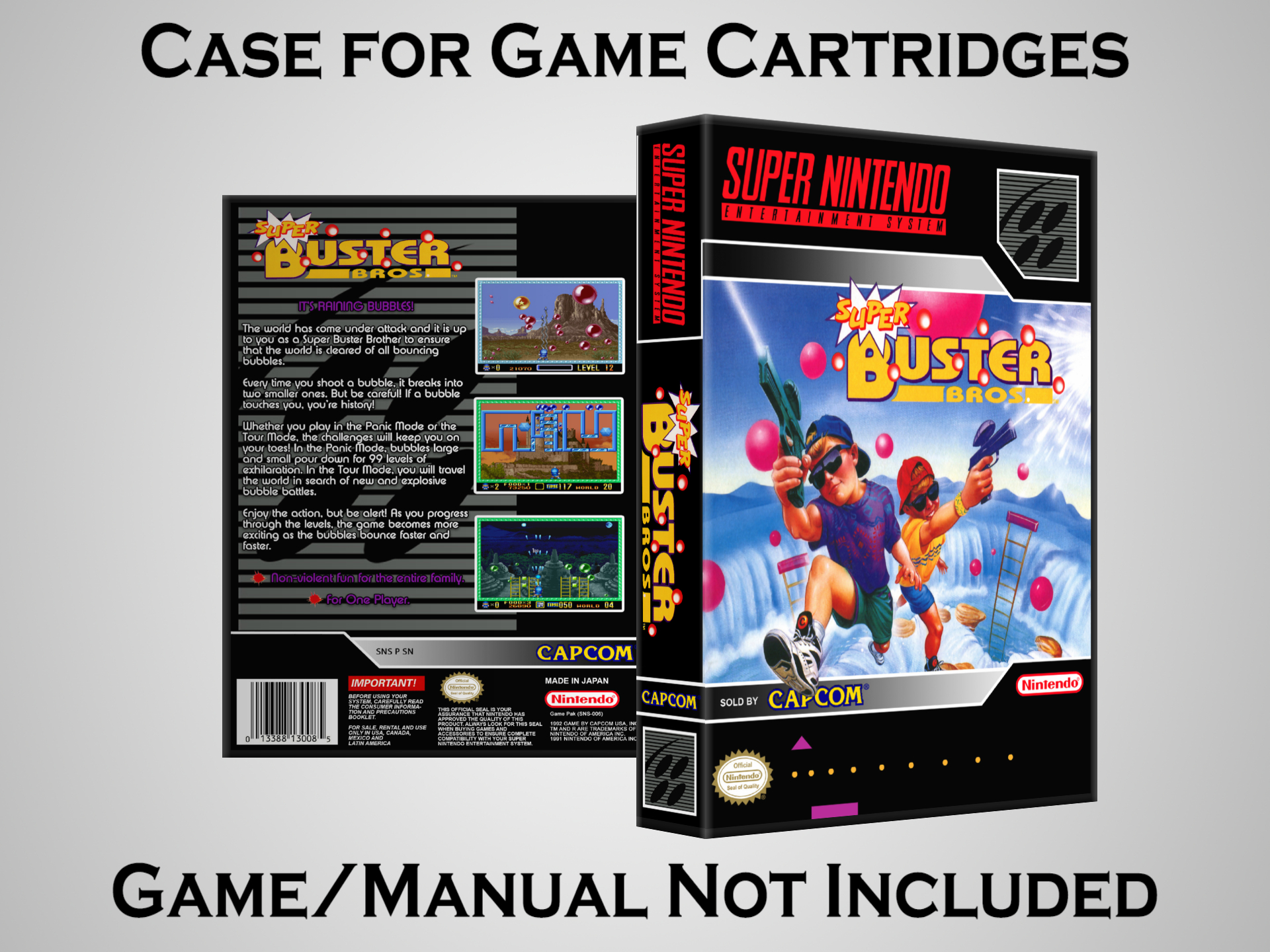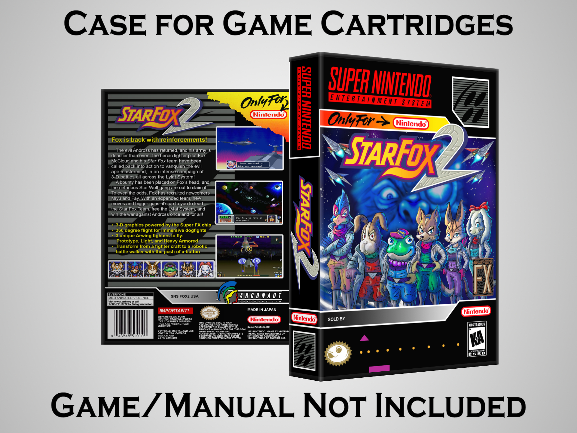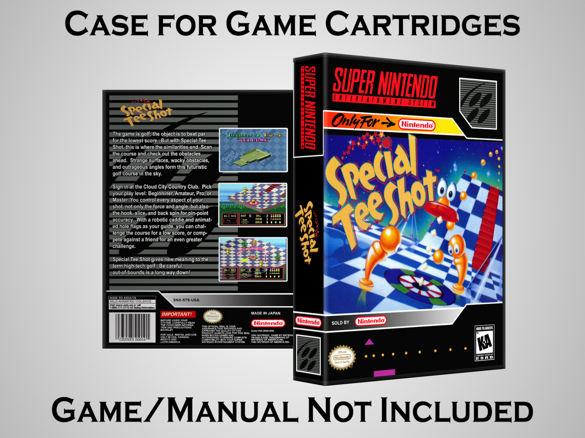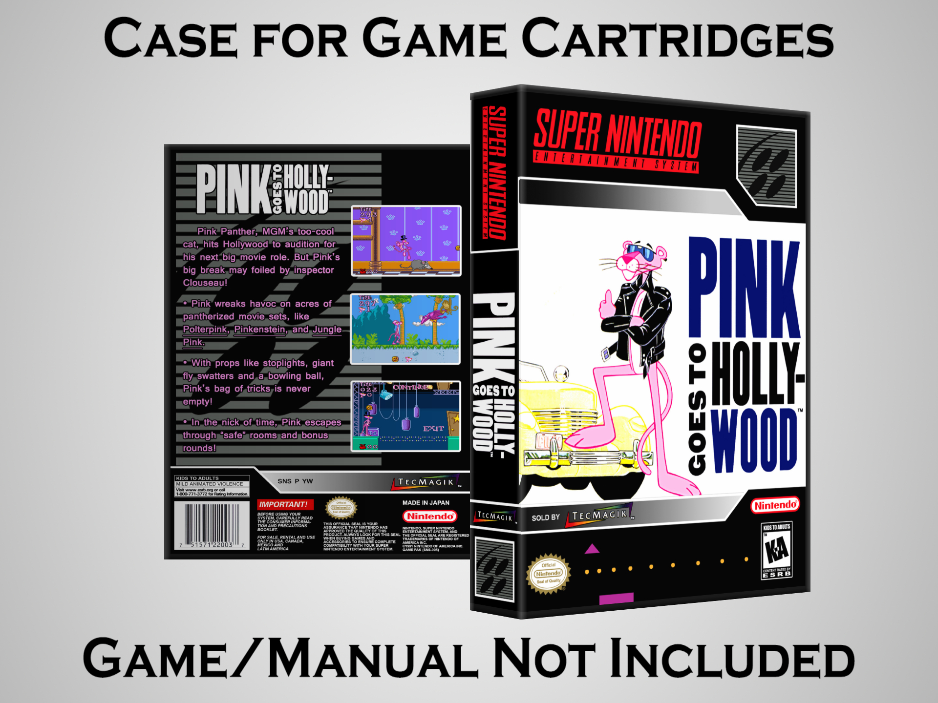 NO GAME OR MANUAL IS INCLUDED! This is NOT an original cardboard box. Case Dimensions : 7.25" x 5.25" x 1.125" Case Color : Dark Grey These cases are designed specifically to hold your Super Nintendo (SNES) cartridges. These are not the low quality Universal Game Cases that most other sellers offer. These firmly hold your cartridges in place, and include clips on the opposite side to hold the instruction manuals if you have them. Our Super Nintendo cases are split into multiple listings alphabetically due to the limit on options in one listing. You can find the rest of our cases in the following links: SNES Cases from # to F SNES Cases from G to N SNES Cases from O to S SNES Cases from T to Z Click here to find more cases in our eBay store!