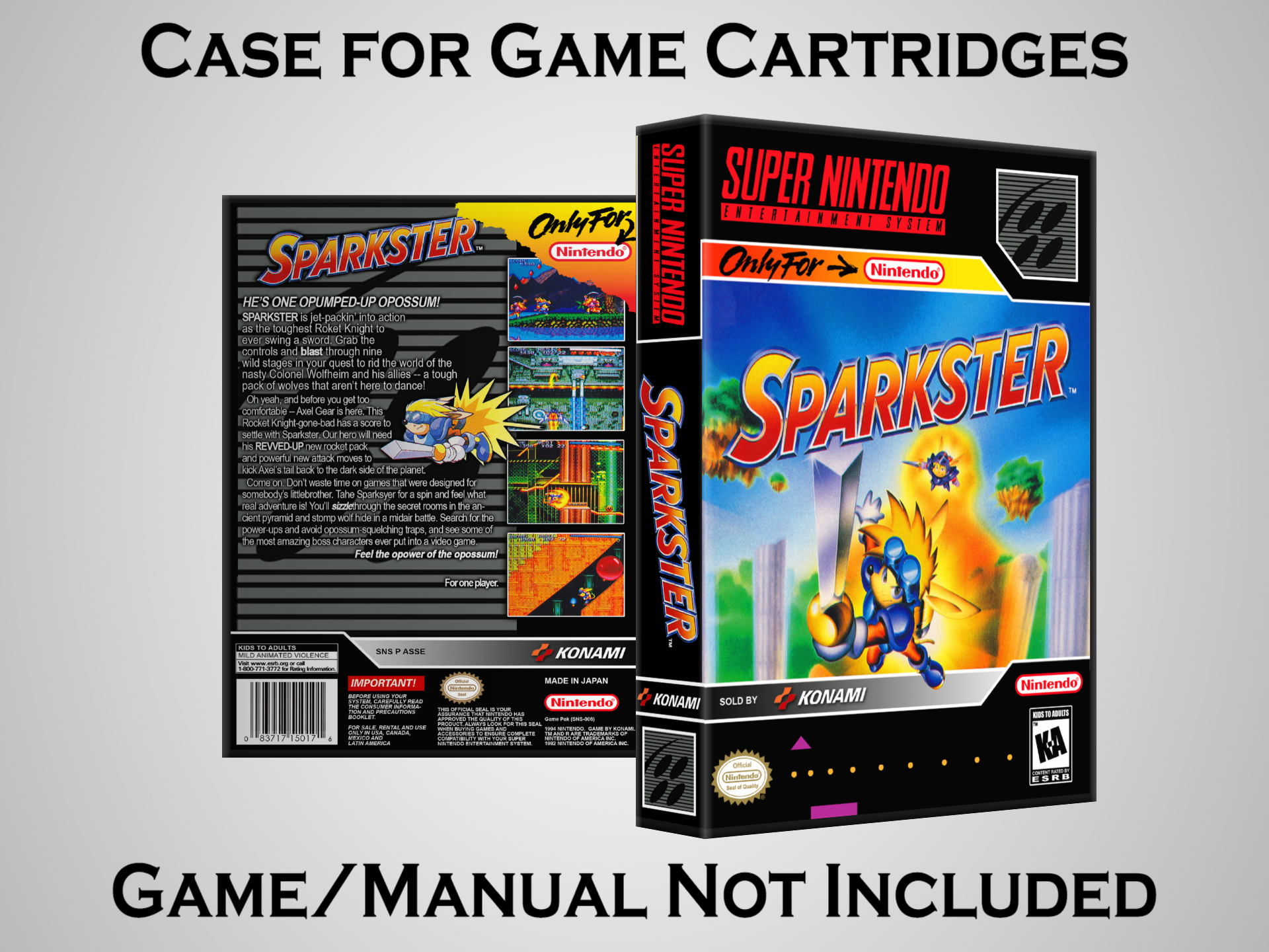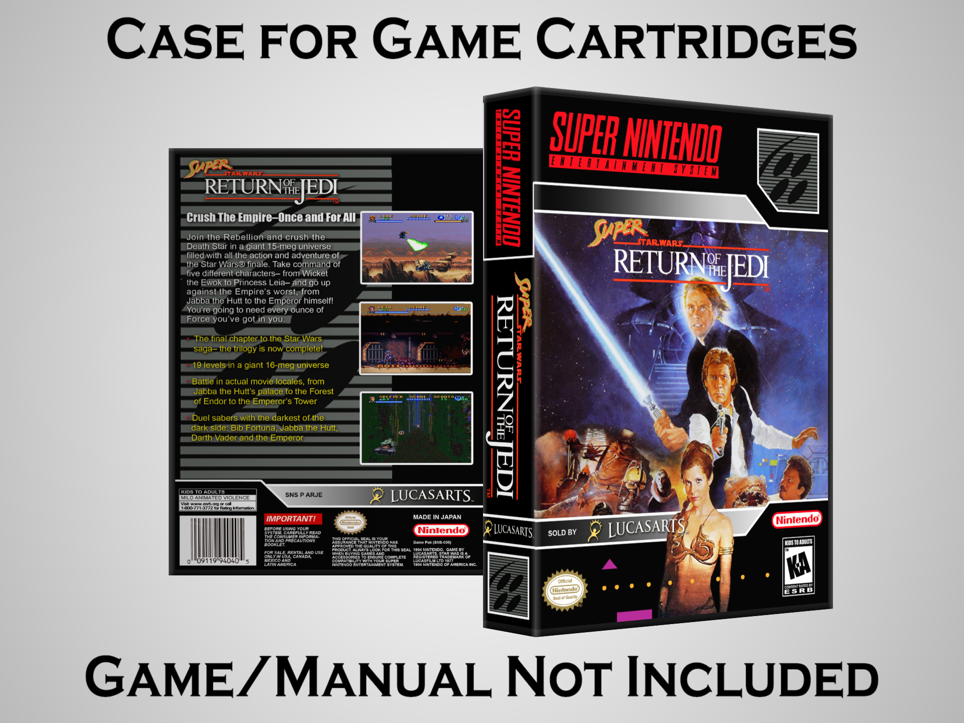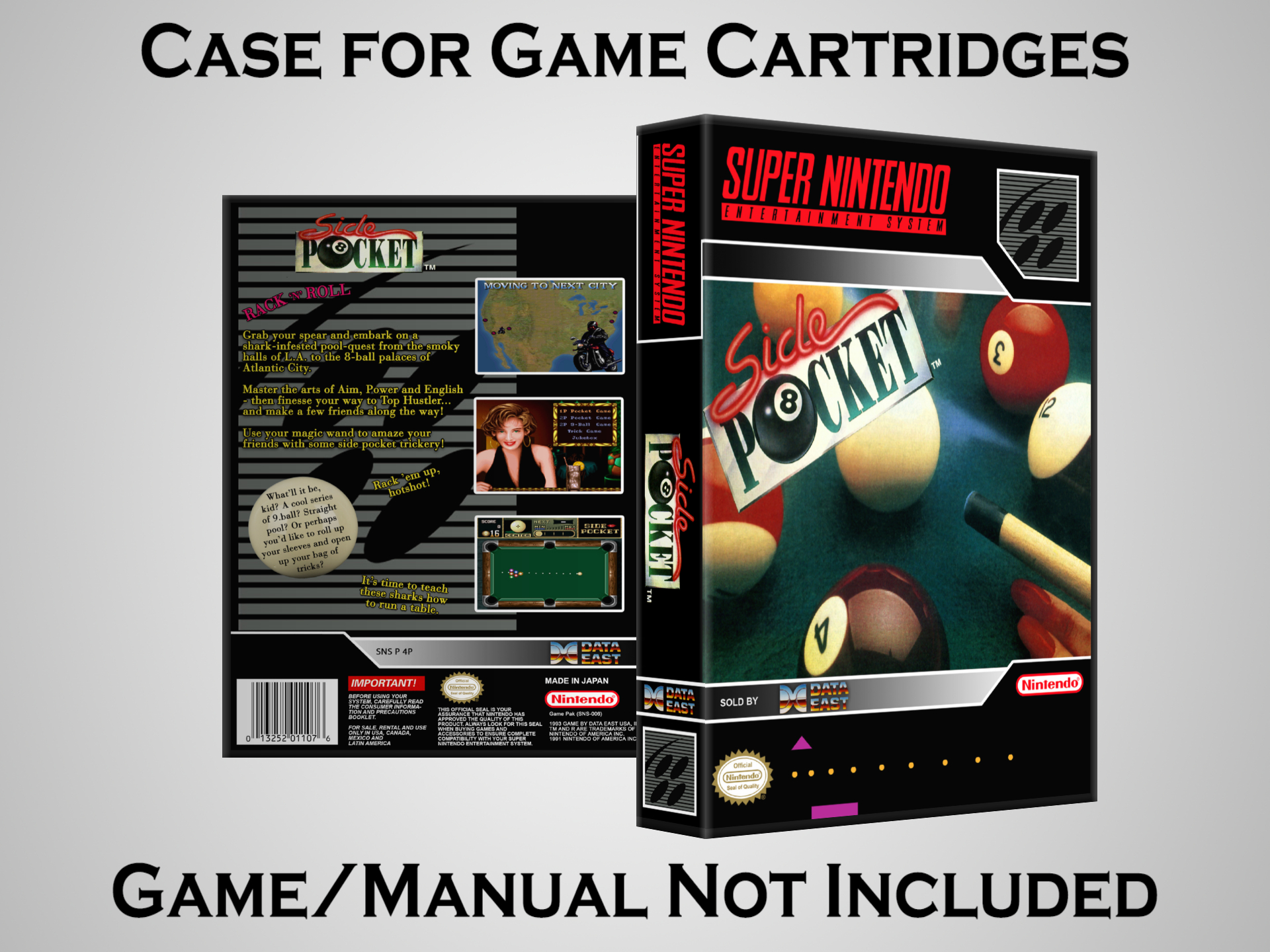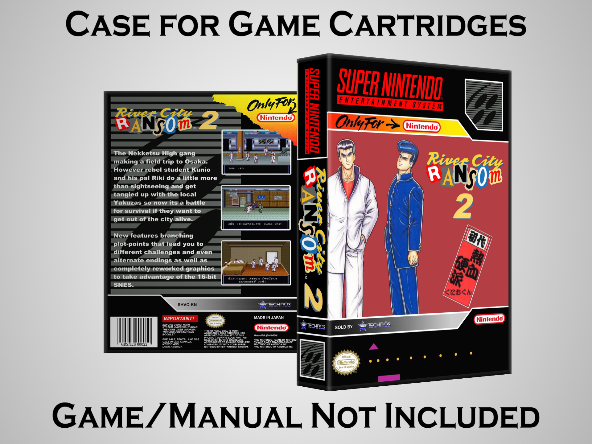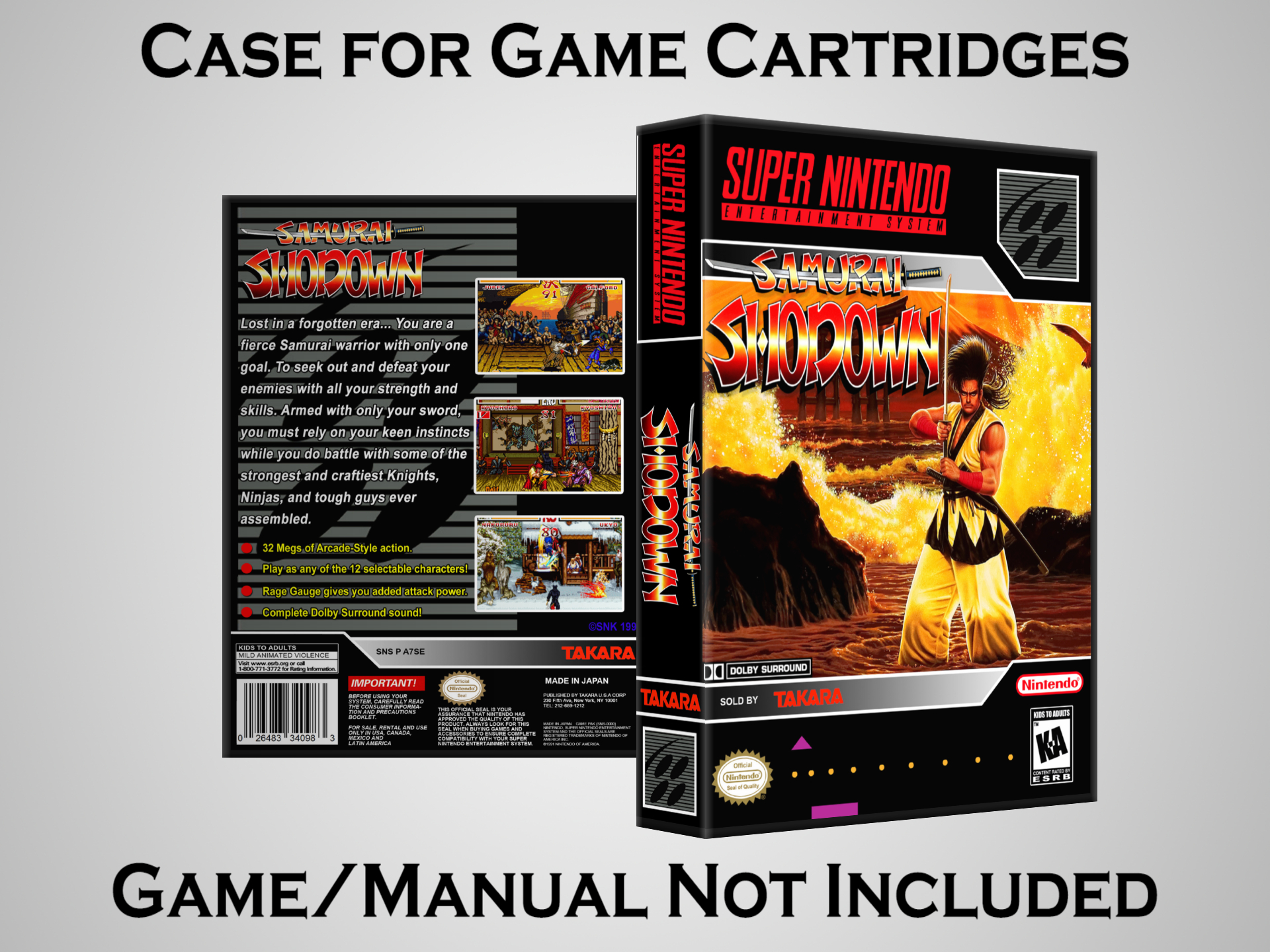 NO GAME OR MANUAL IS INCLUDED! This is NOT an original cardboard box. Case Dimensions : 7.25" x 5.25" x 1.125" Case Color : Dark Grey These cases are designed specifically to hold your Super Nintendo (SNES) cartridges. These are not the low quality Universal Game Cases that most other sellers offer. These firmly hold your cartridges in place, and include clips on the opposite side to hold the instruction manuals if you have them. Our Super Nintendo cases are split into multiple listings alphabetically due to the limit on options in one listing. You can find the rest of our cases in the following links: SNES Cases from # to F SNES Cases from G to N SNES Cases from O to S SNES Cases from T to Z Click here to find more cases in our eBay store!