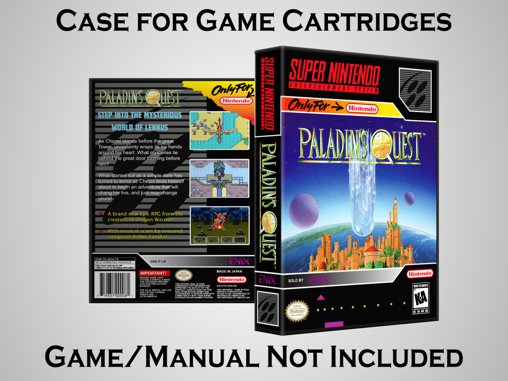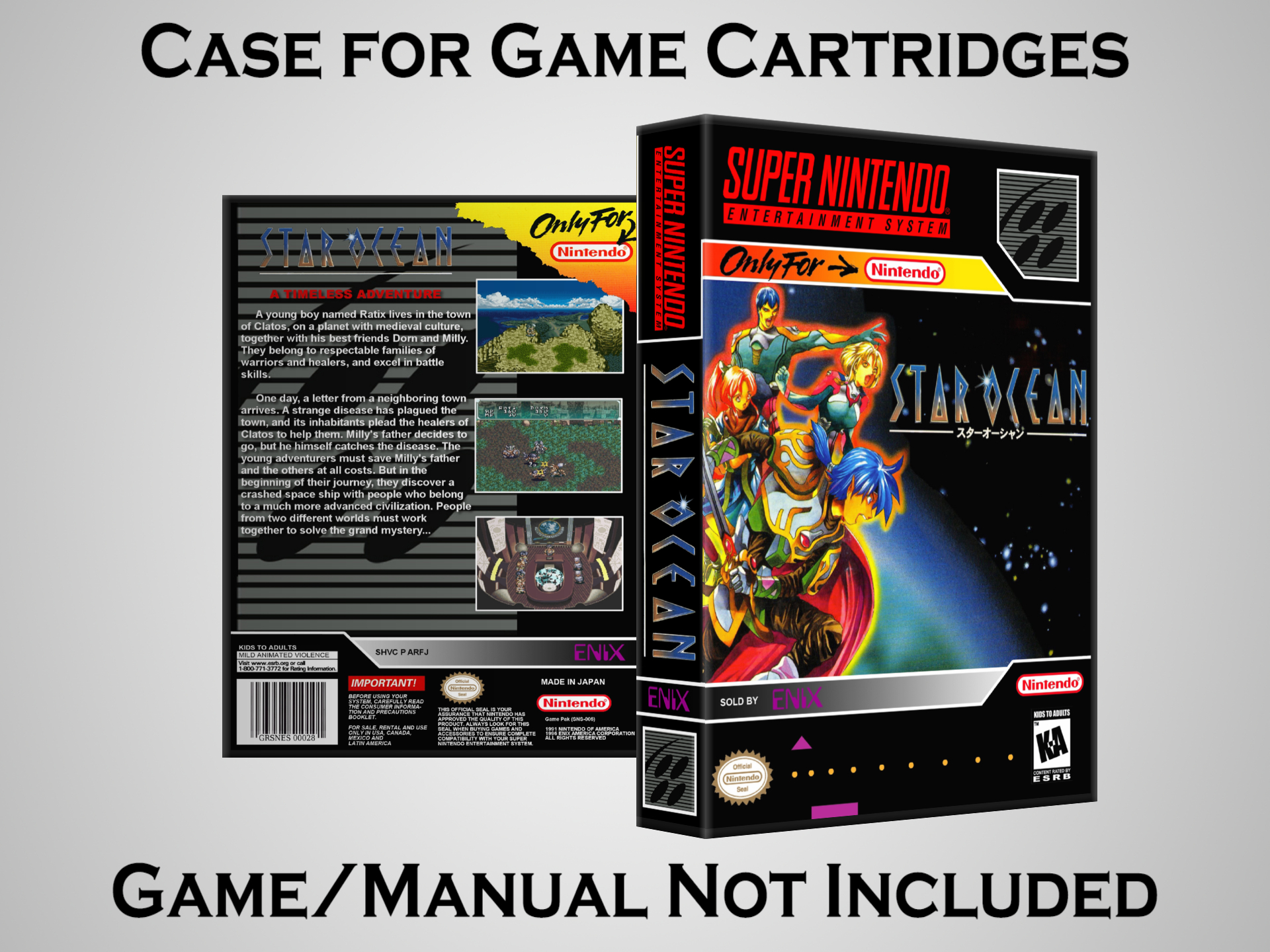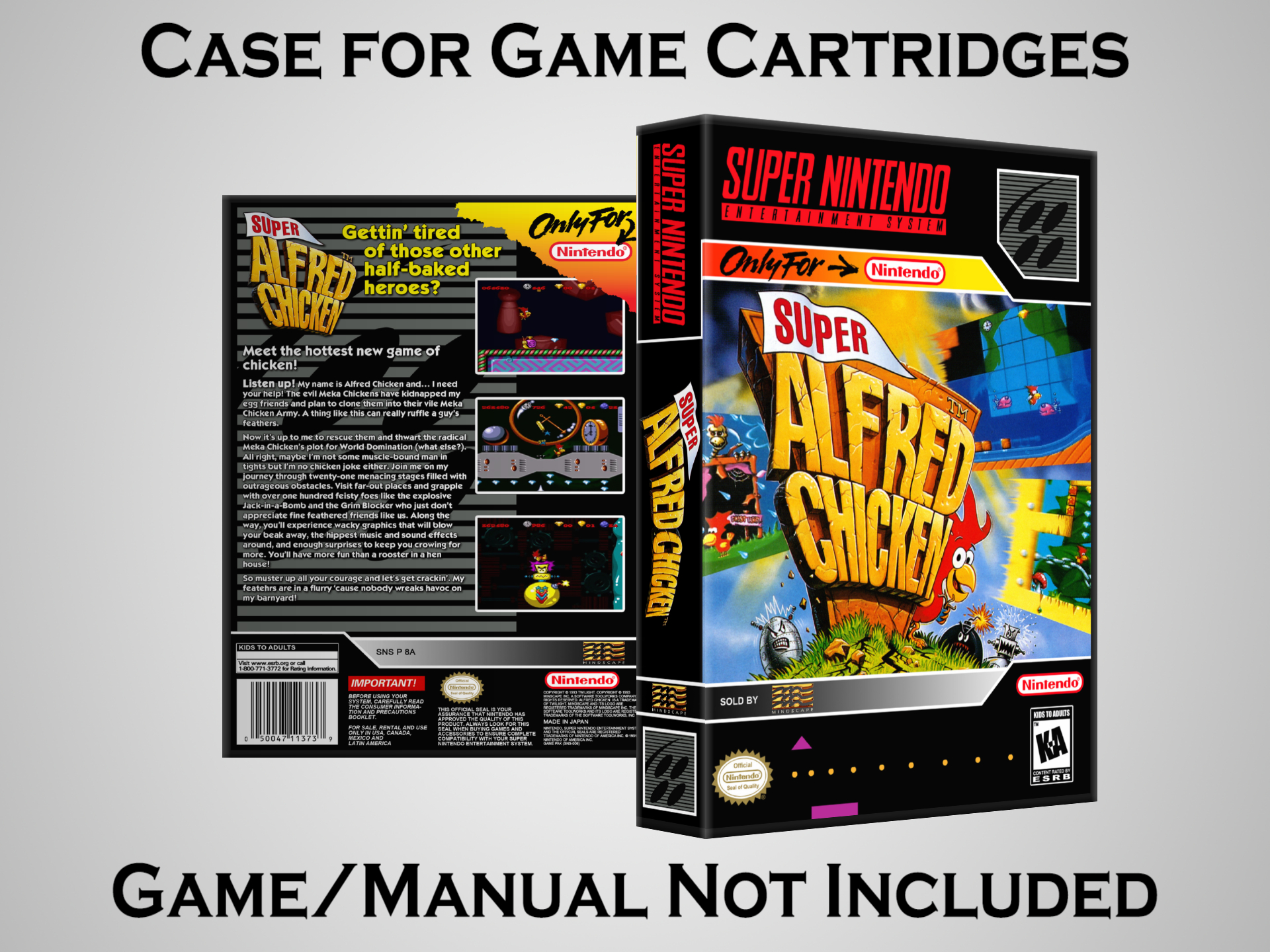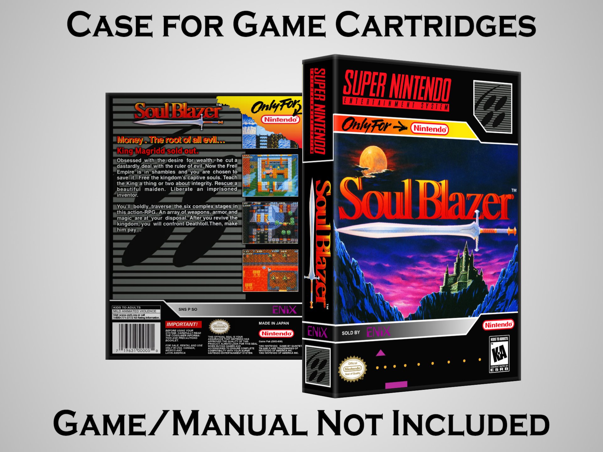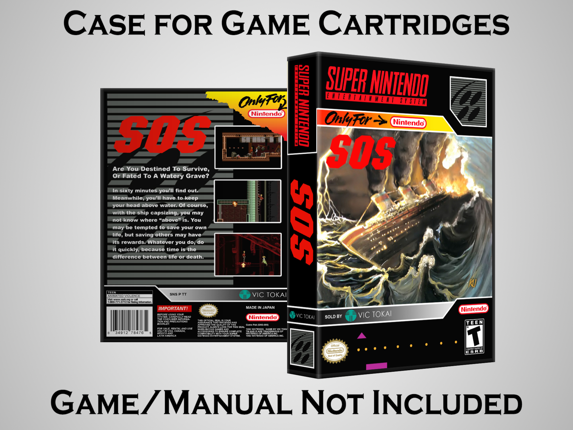 NO GAME OR MANUAL IS INCLUDED! This is NOT an original cardboard box. Case Dimensions : 7.25" x 5.25" x 1.125" Case Color : Dark Grey These cases are designed specifically to hold your Super Nintendo (SNES) cartridges. These are not the low quality Universal Game Cases that most other sellers offer. These firmly hold your cartridges in place, and include clips on the opposite side to hold the instruction manuals if you have them. Our Super Nintendo cases are split into multiple listings alphabetically due to the limit on options in one listing. You can find the rest of our cases in the following links: SNES Cases from # to F SNES Cases from G to N SNES Cases from O to S SNES Cases from T to Z Click here to find more cases in our eBay store!