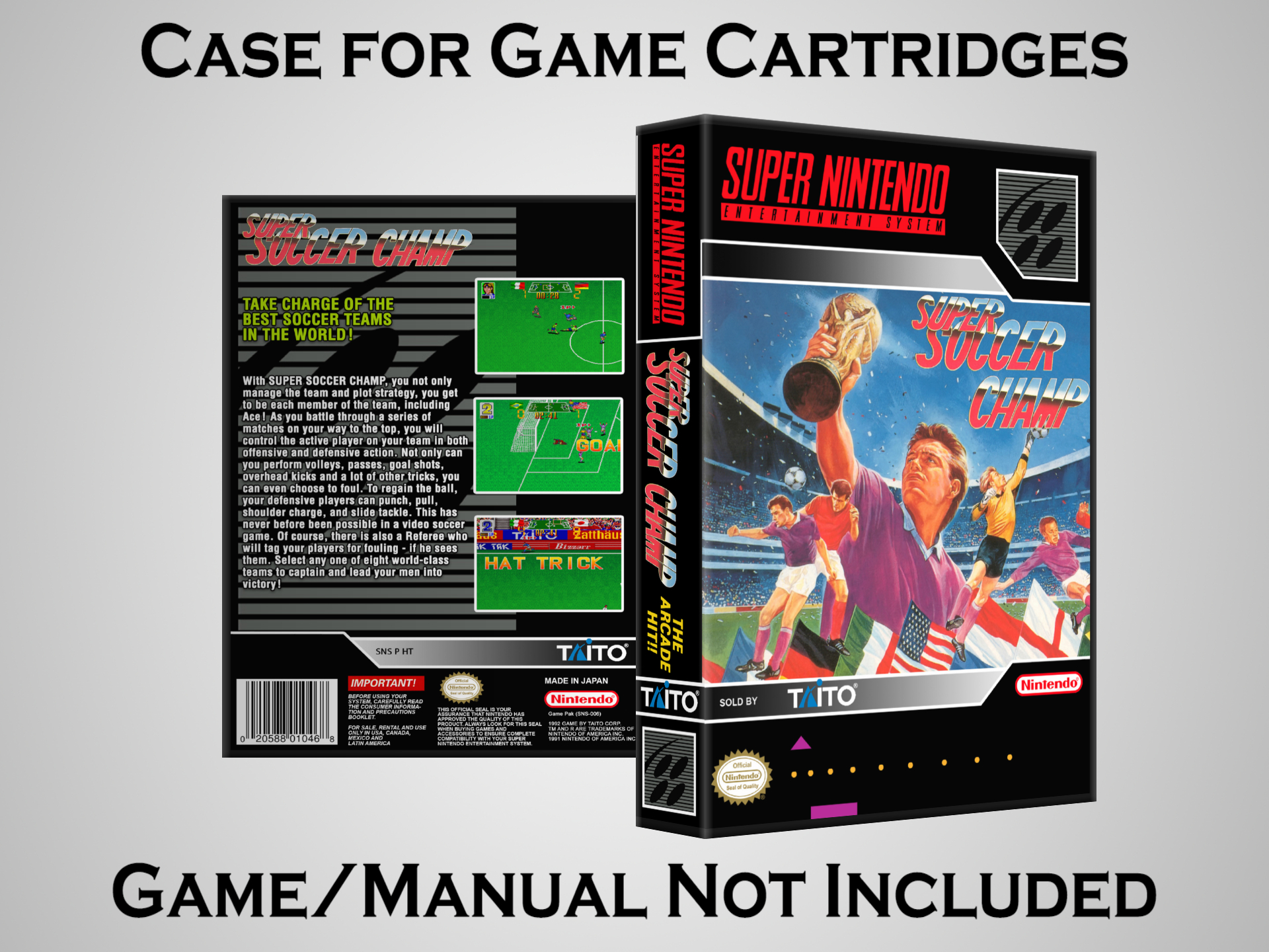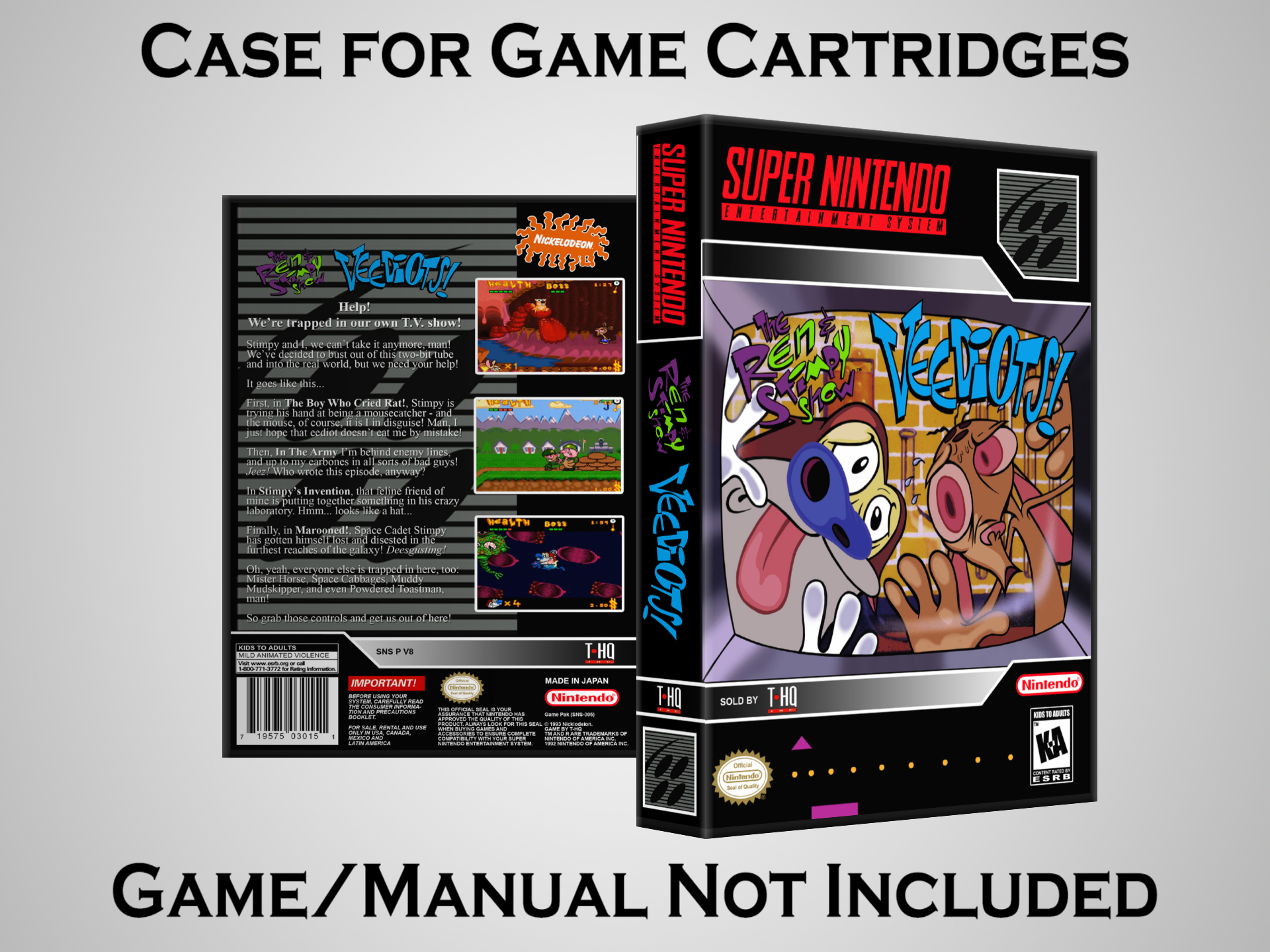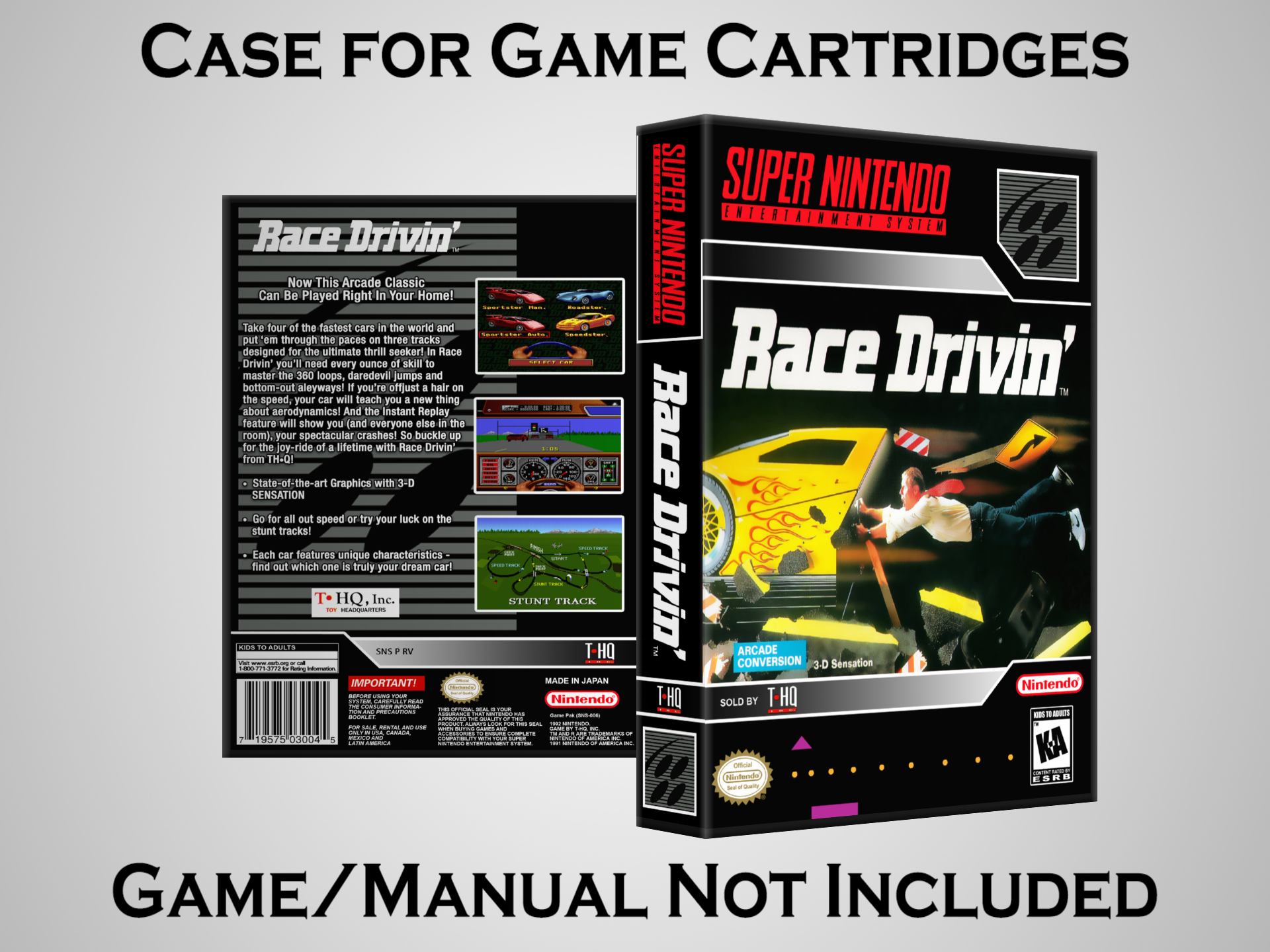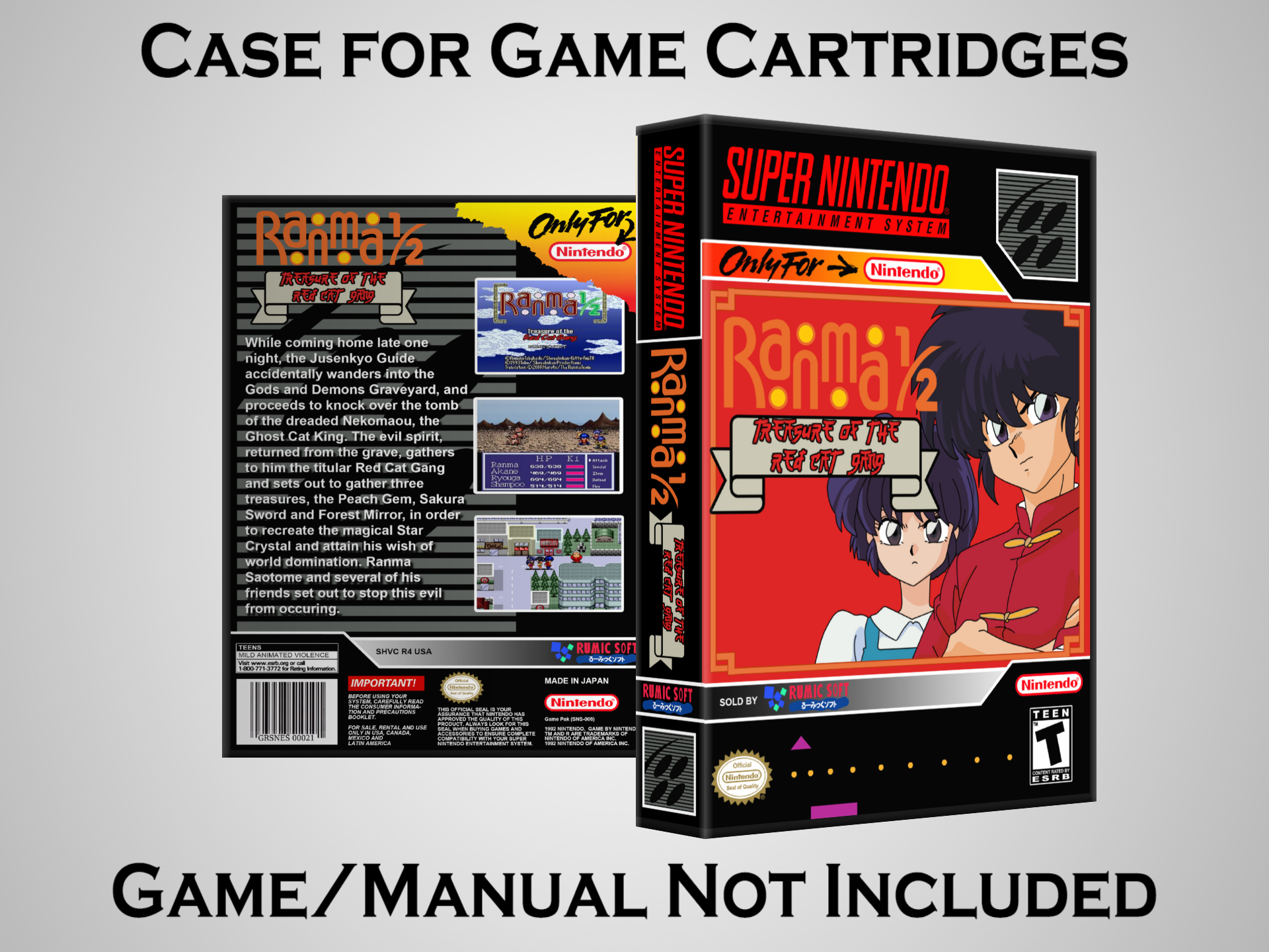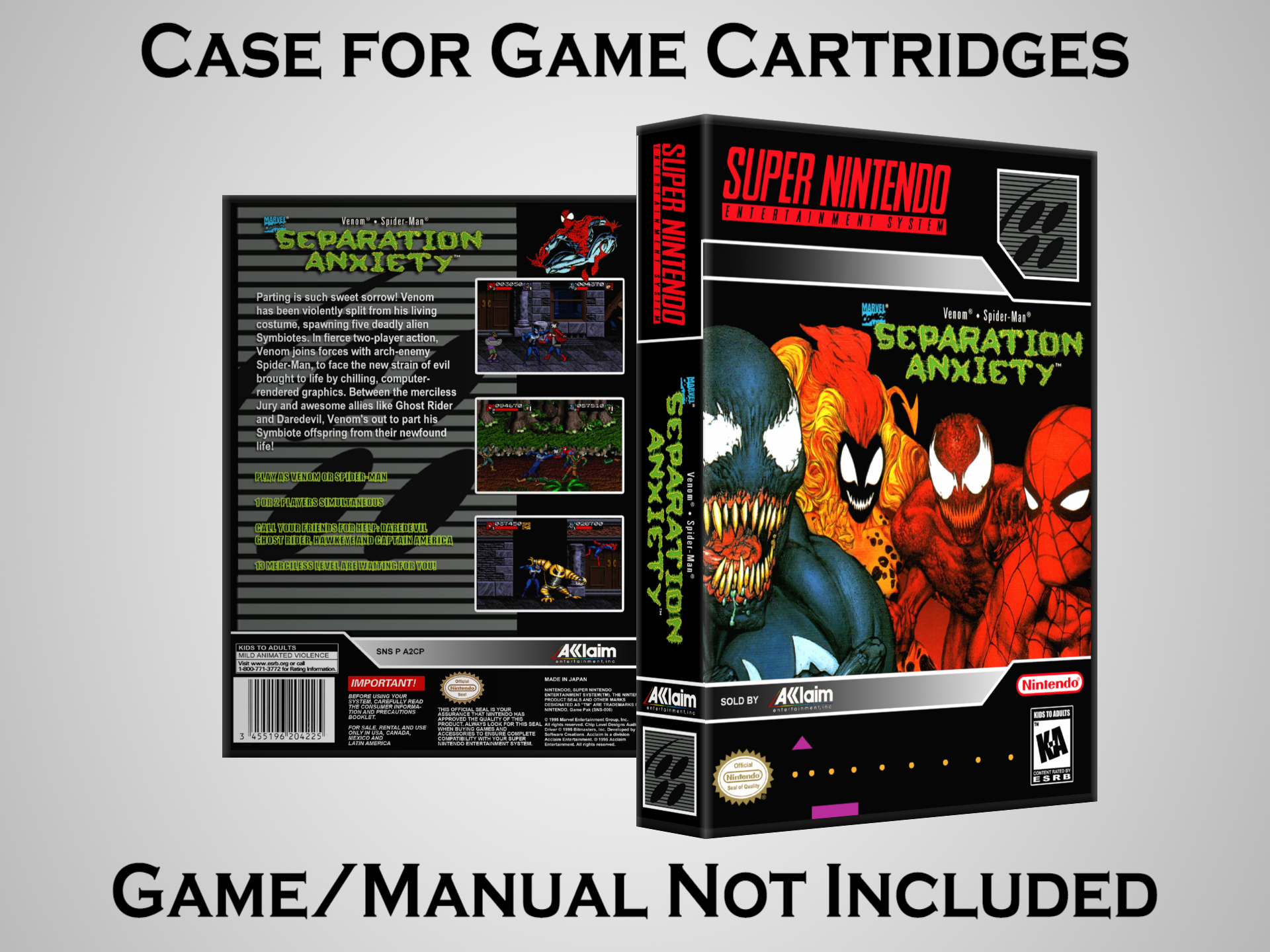 NO GAME OR MANUAL IS INCLUDED! This is NOT an original cardboard box. Case Dimensions : 7.25" x 5.25" x 1.125" Case Color : Dark Grey These cases are designed specifically to hold your Super Nintendo (SNES) cartridges. These are not the low quality Universal Game Cases that most other sellers offer. These firmly hold your cartridges in place, and include clips on the opposite side to hold the instruction manuals if you have them. Our Super Nintendo cases are split into multiple listings alphabetically due to the limit on options in one listing. You can find the rest of our cases in the following links: SNES Cases from # to F SNES Cases from G to N SNES Cases from O to S SNES Cases from T to Z Click here to find more cases in our eBay store!