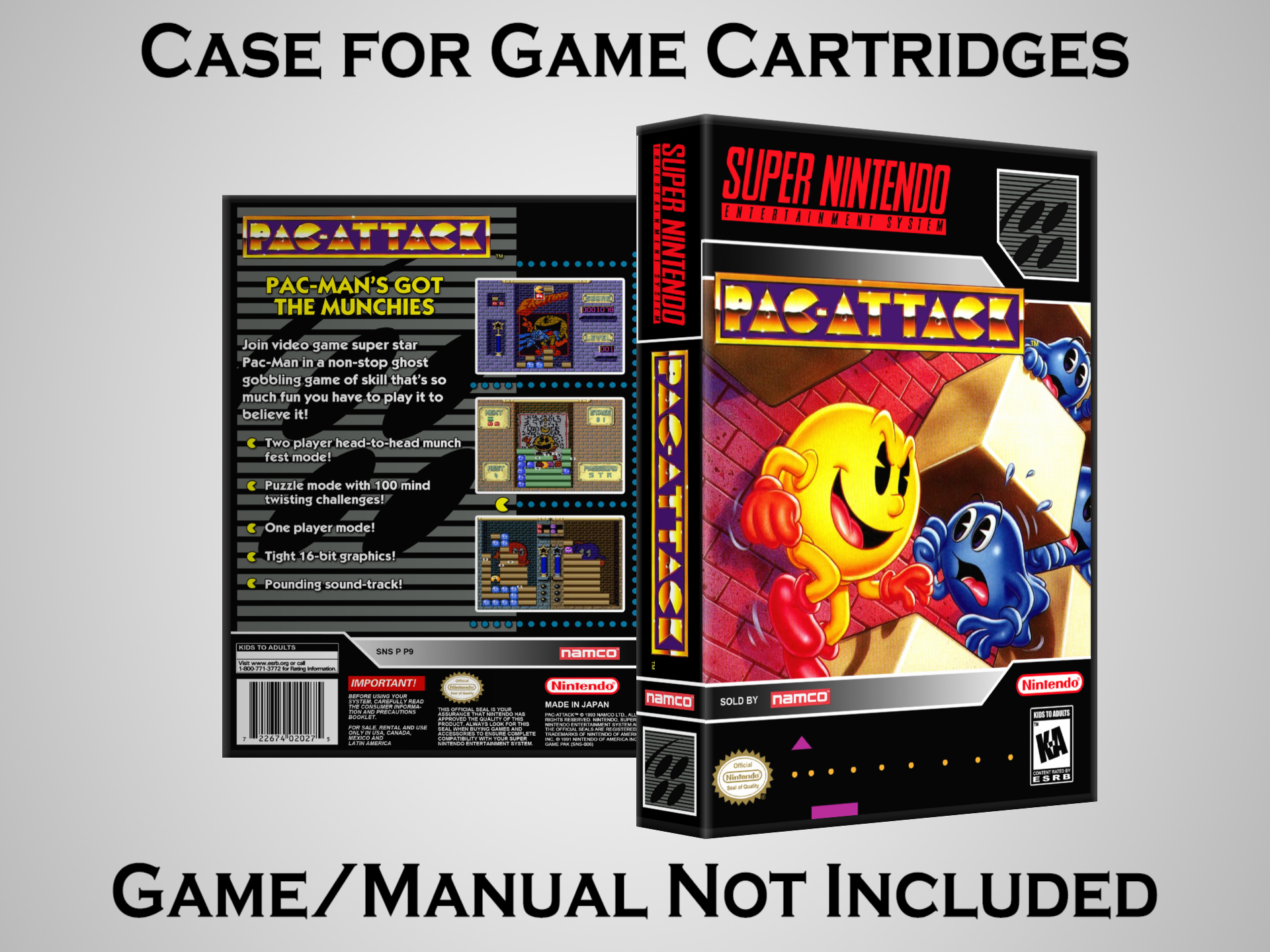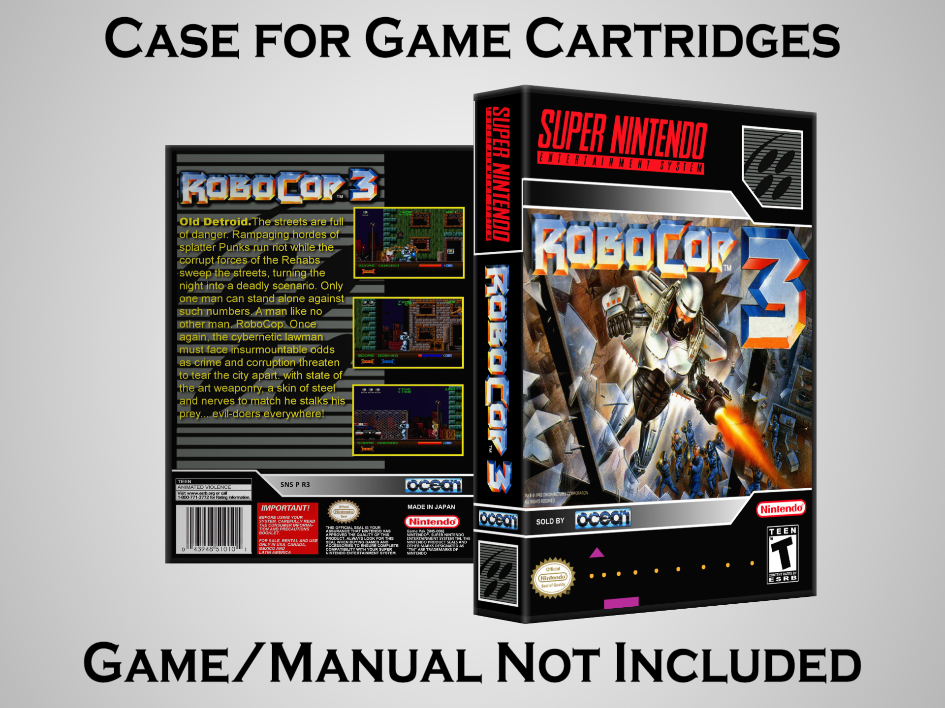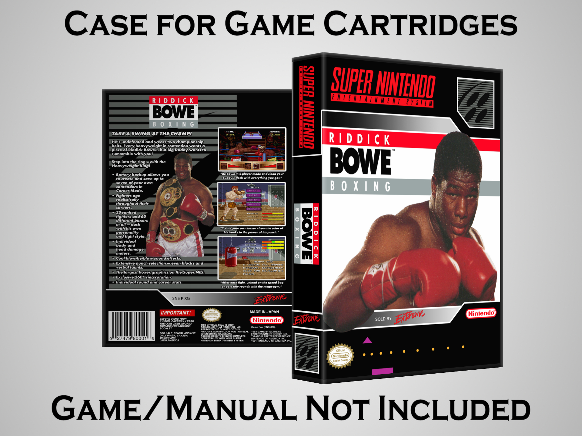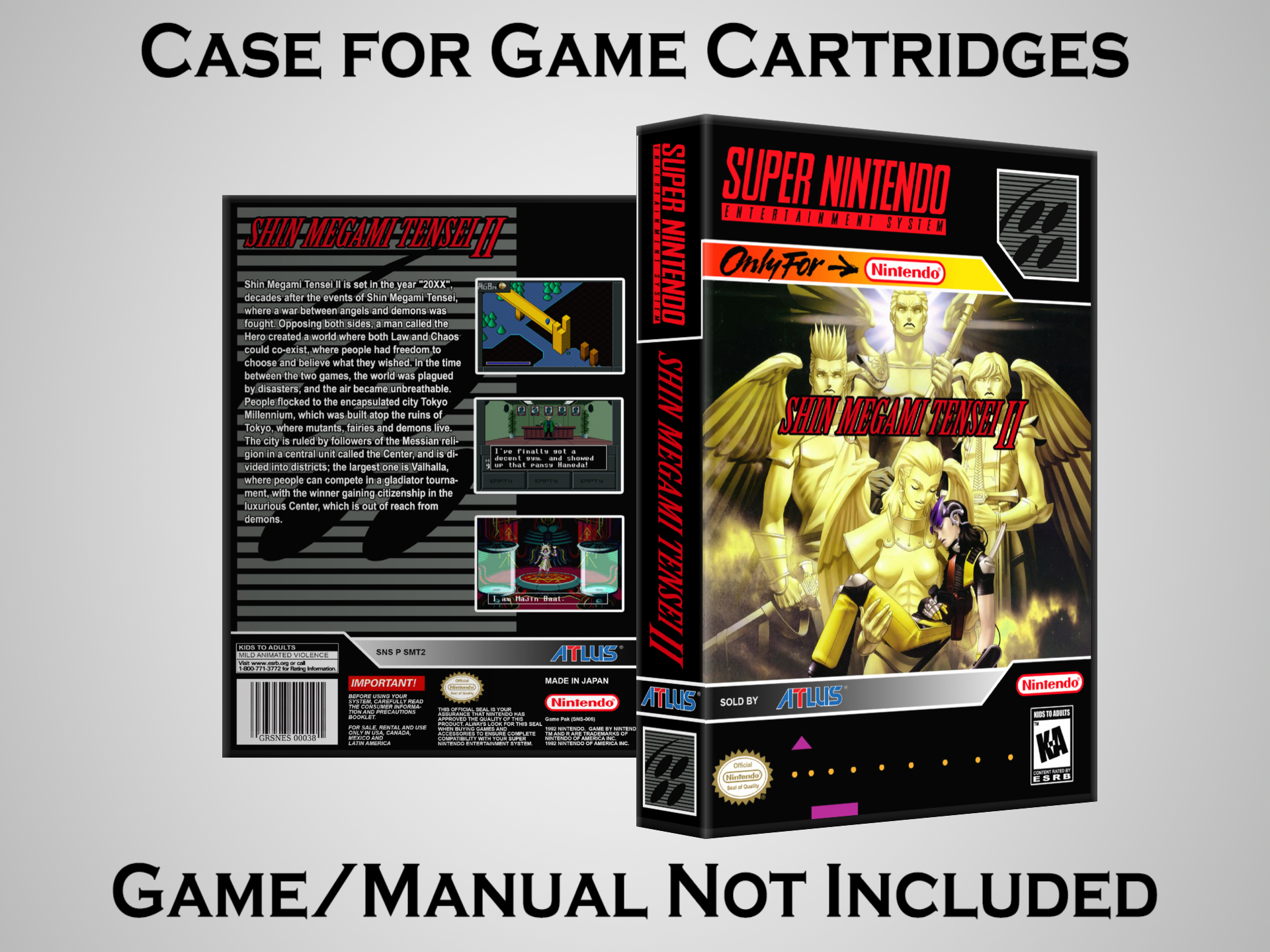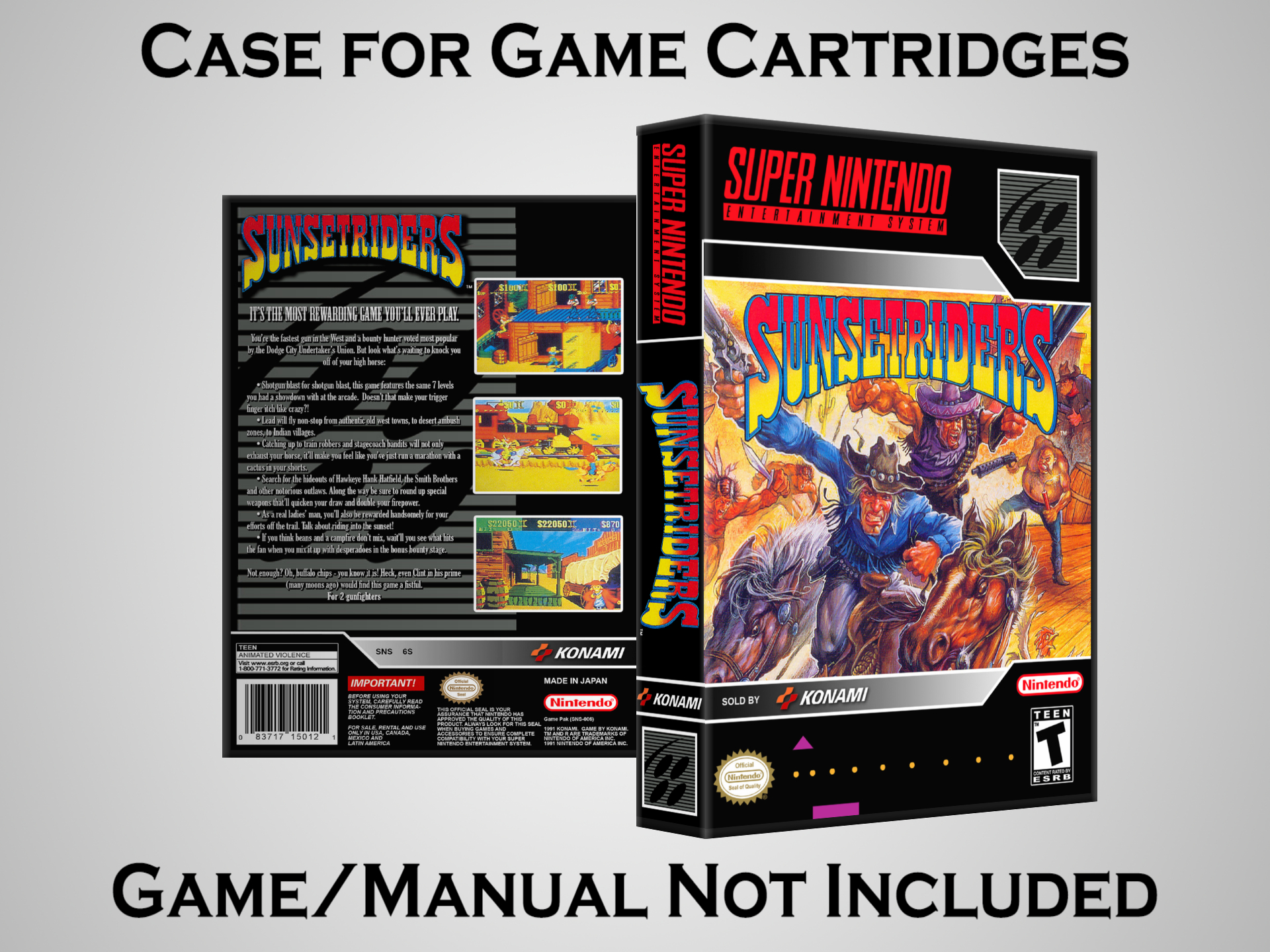 NO GAME OR MANUAL IS INCLUDED! This is NOT an original cardboard box. Case Dimensions : 7.25" x 5.25" x 1.125" Case Color : Dark Grey These cases are designed specifically to hold your Super Nintendo (SNES) cartridges. These are not the low quality Universal Game Cases that most other sellers offer. These firmly hold your cartridges in place, and include clips on the opposite side to hold the instruction manuals if you have them. Our Super Nintendo cases are split into multiple listings alphabetically due to the limit on options in one listing. You can find the rest of our cases in the following links: SNES Cases from # to F SNES Cases from G to N SNES Cases from O to S SNES Cases from T to Z Click here to find more cases in our eBay store!