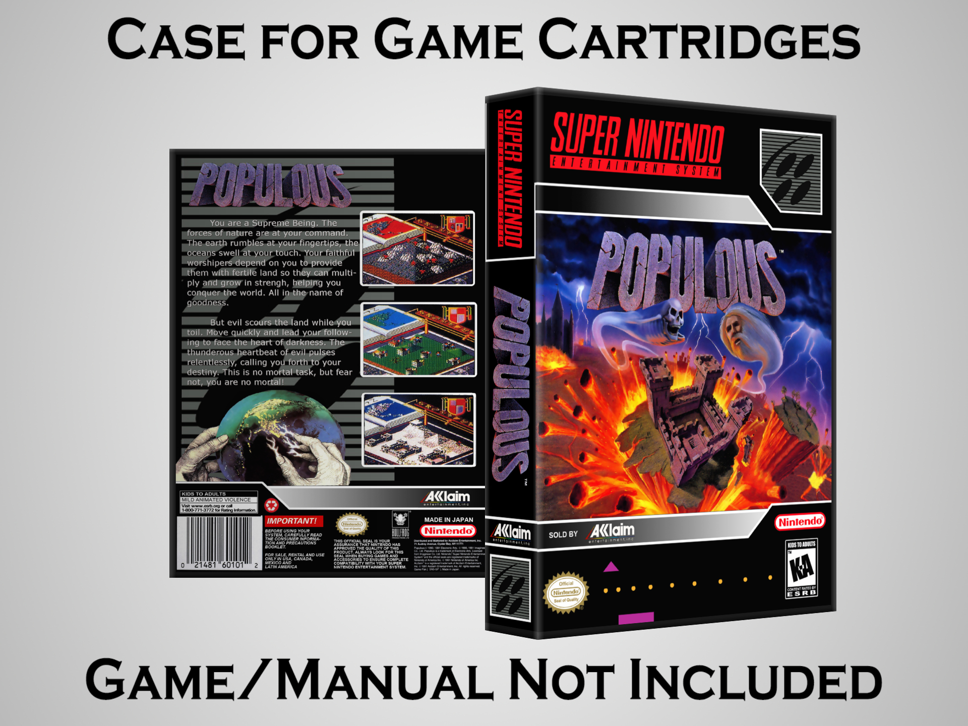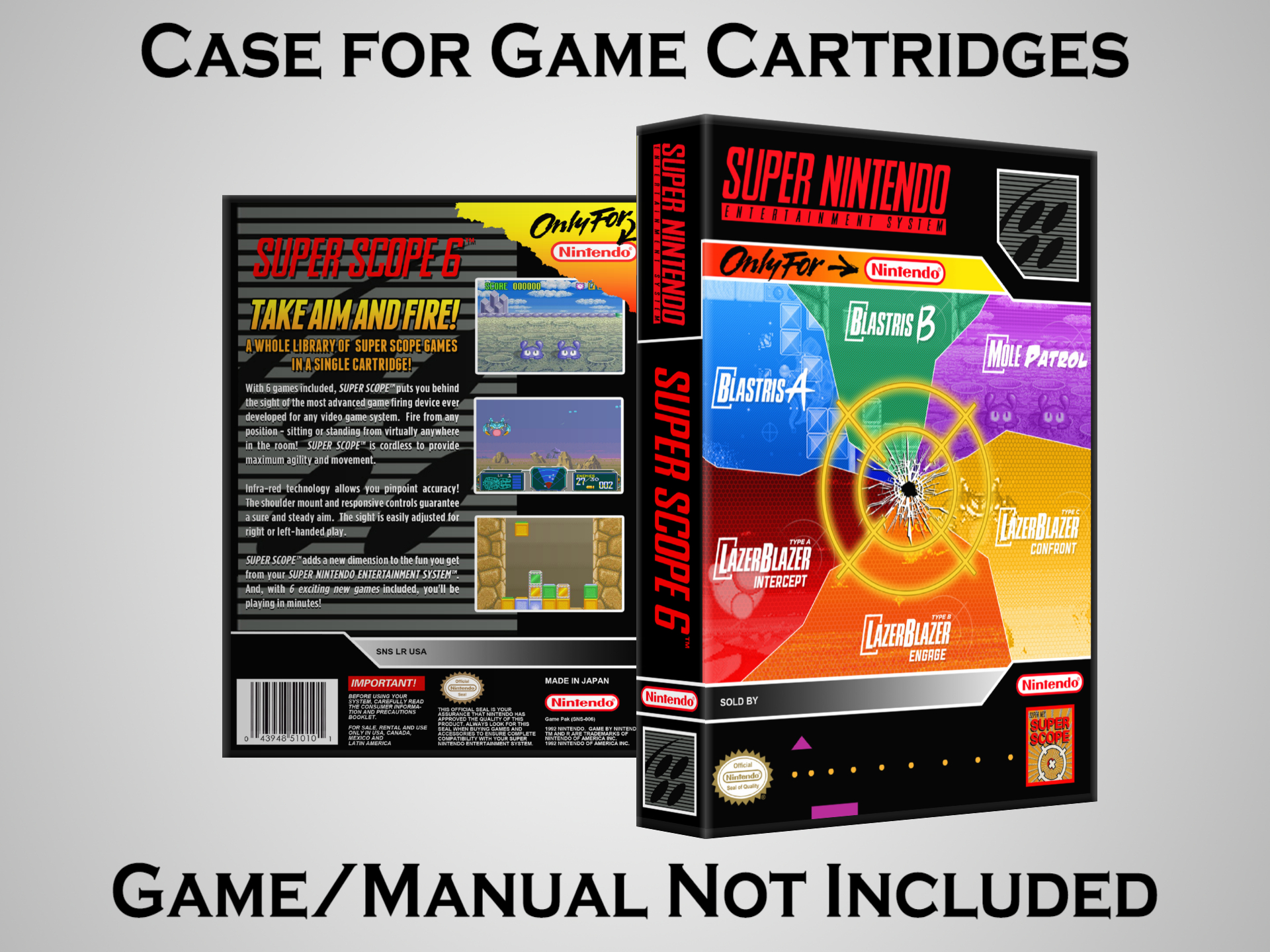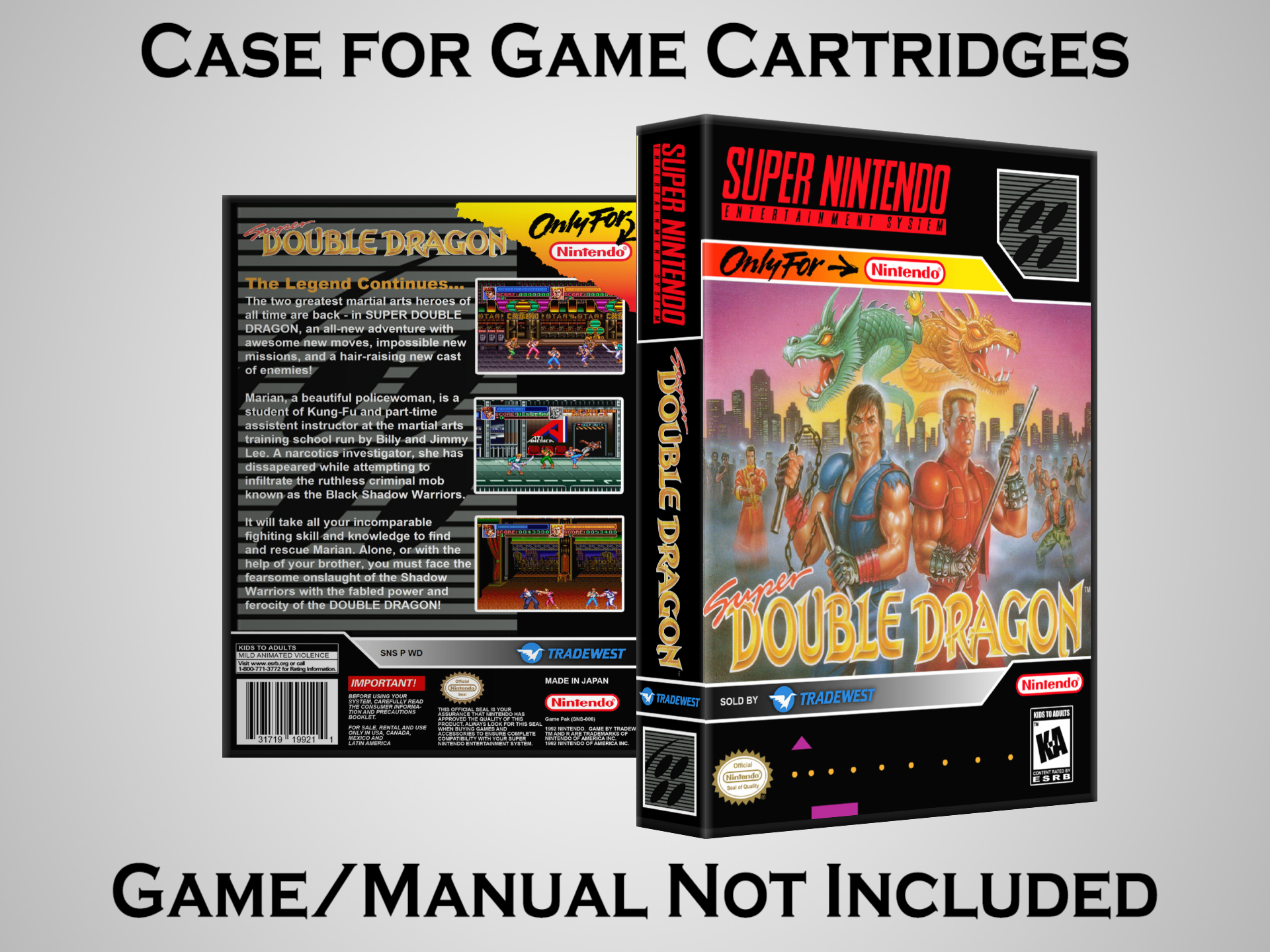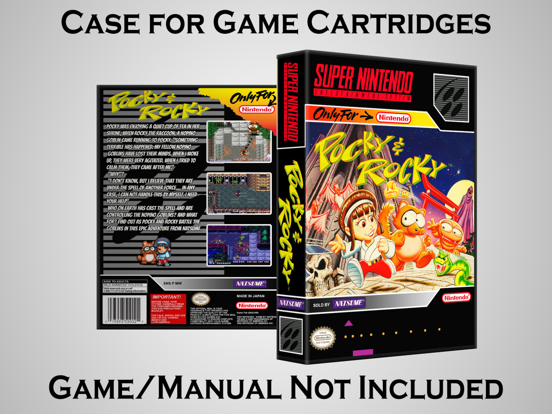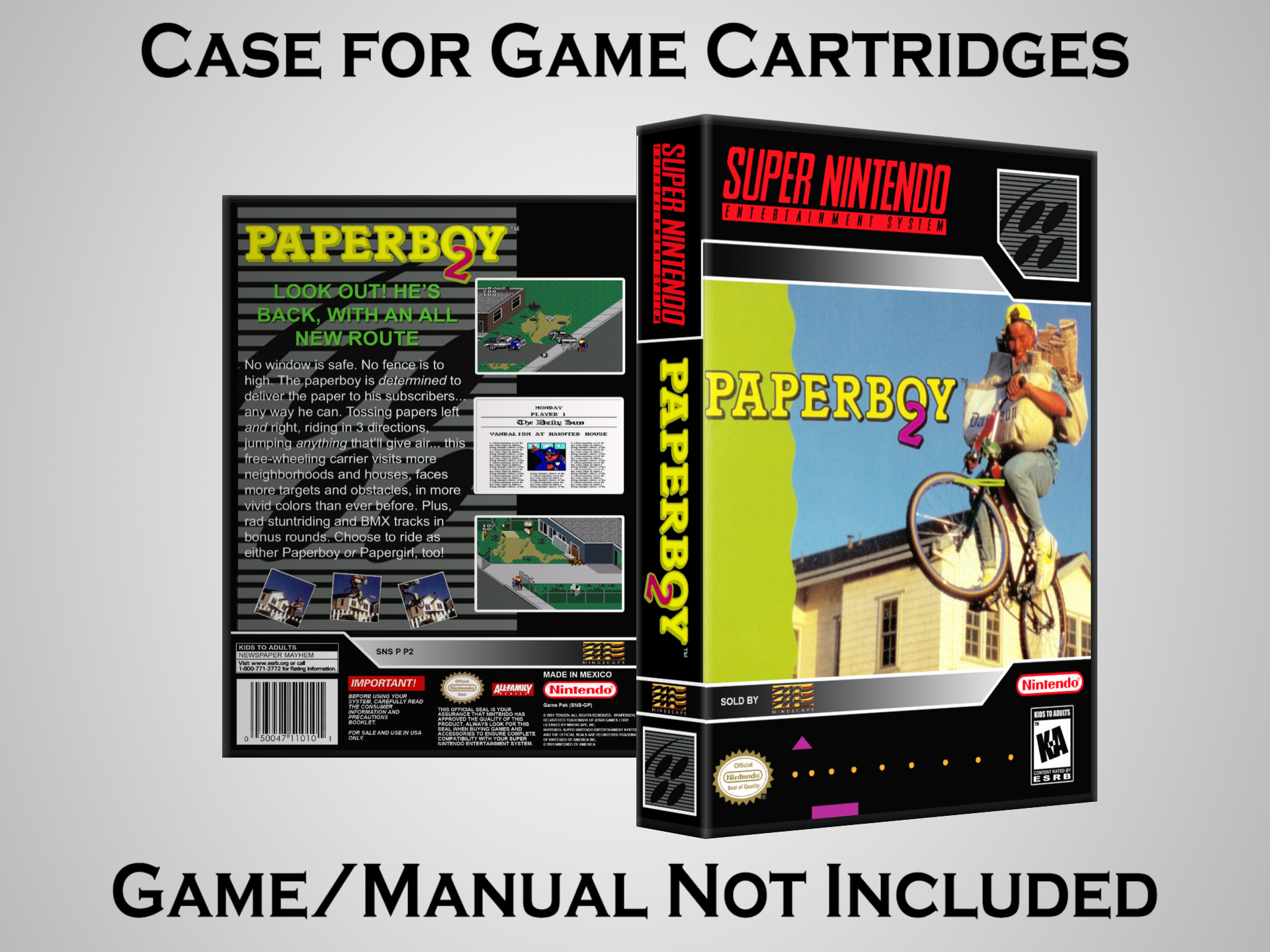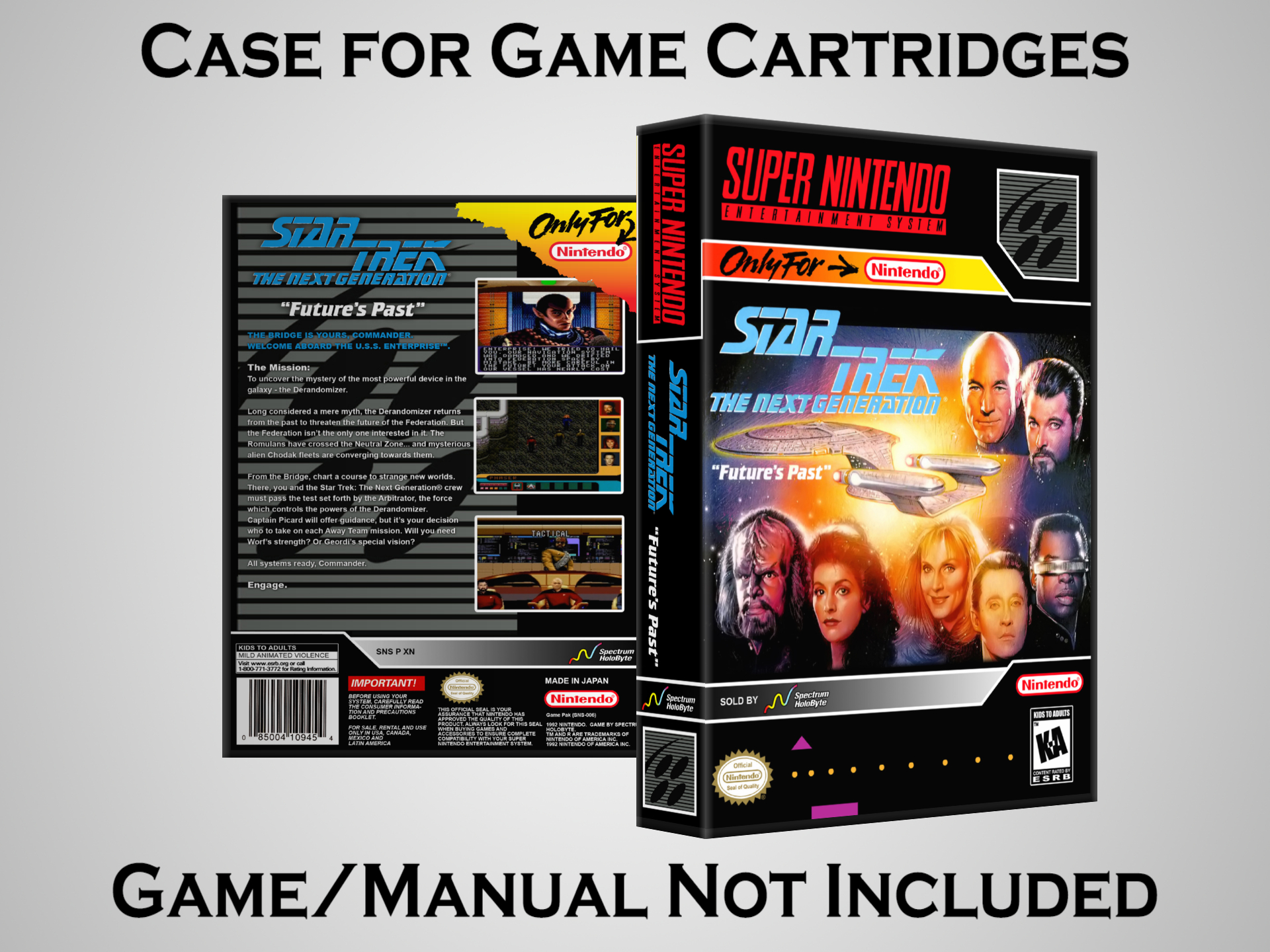NO GAME OR MANUAL IS INCLUDED! This is NOT an original cardboard box. Case Dimensions : 7.25" x 5.25" x 1.125" Case Color : Dark Grey These cases are designed specifically to hold your Super Nintendo (SNES) cartridges. These are not the low quality Universal Game Cases that most other sellers offer. These firmly hold your cartridges in place, and include clips on the opposite side to hold the instruction manuals if you have them. Our Super Nintendo cases are split into multiple listings alphabetically due to the limit on options in one listing. You can find the rest of our cases in the following links: SNES Cases from # to F SNES Cases from G to N SNES Cases from O to S SNES Cases from T to Z Click here to find more cases in our eBay store!