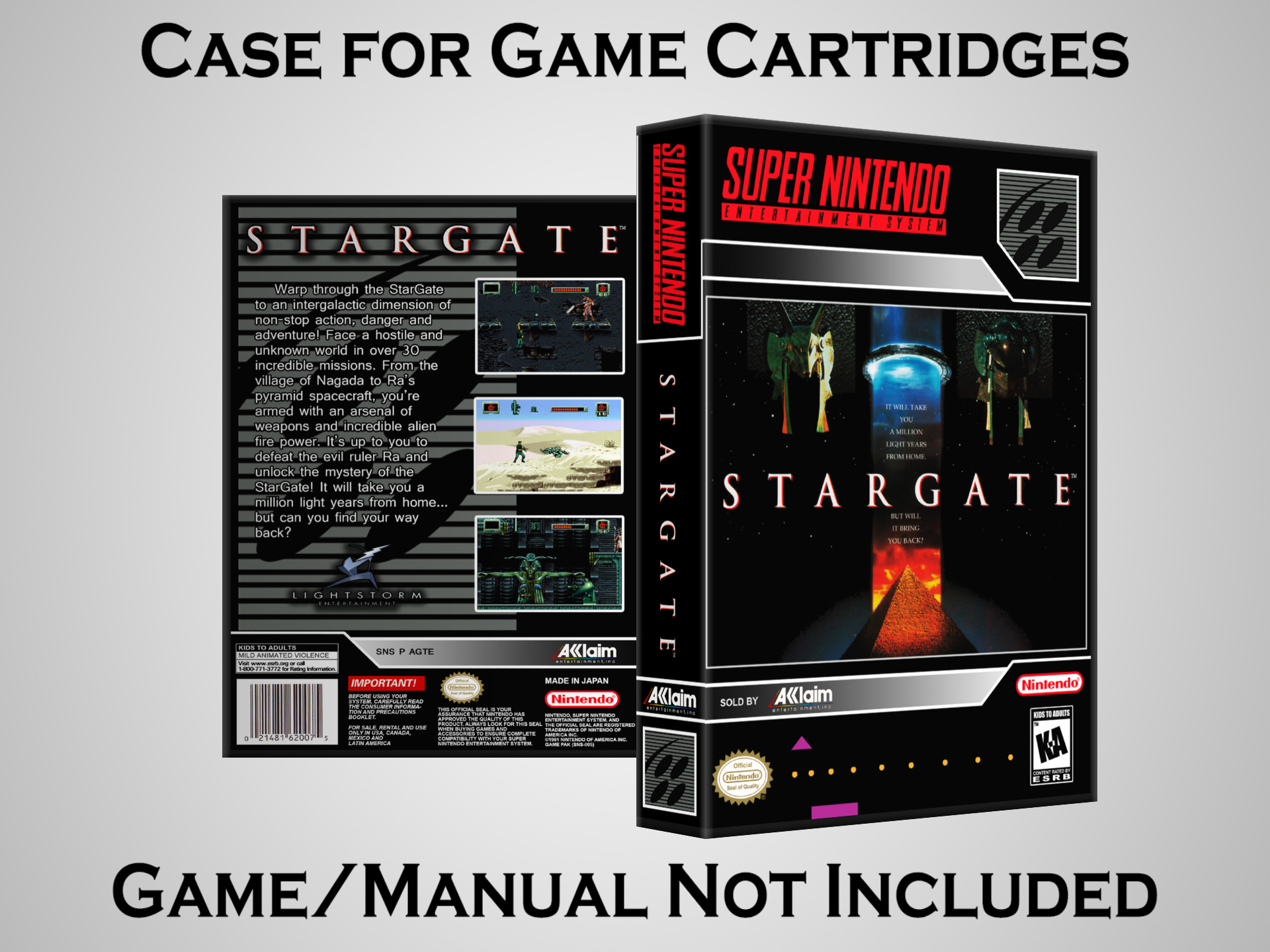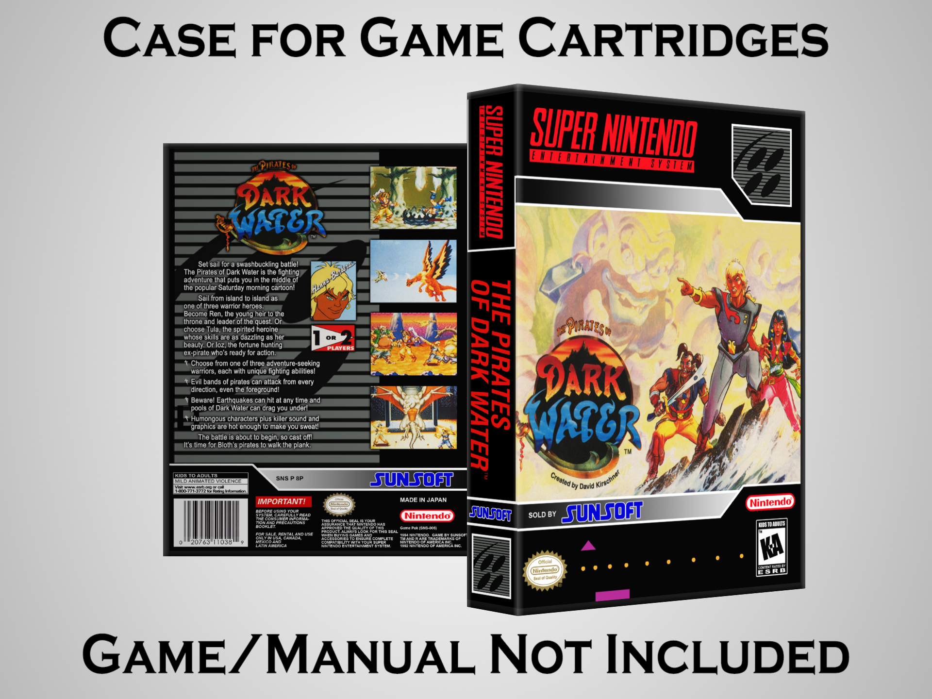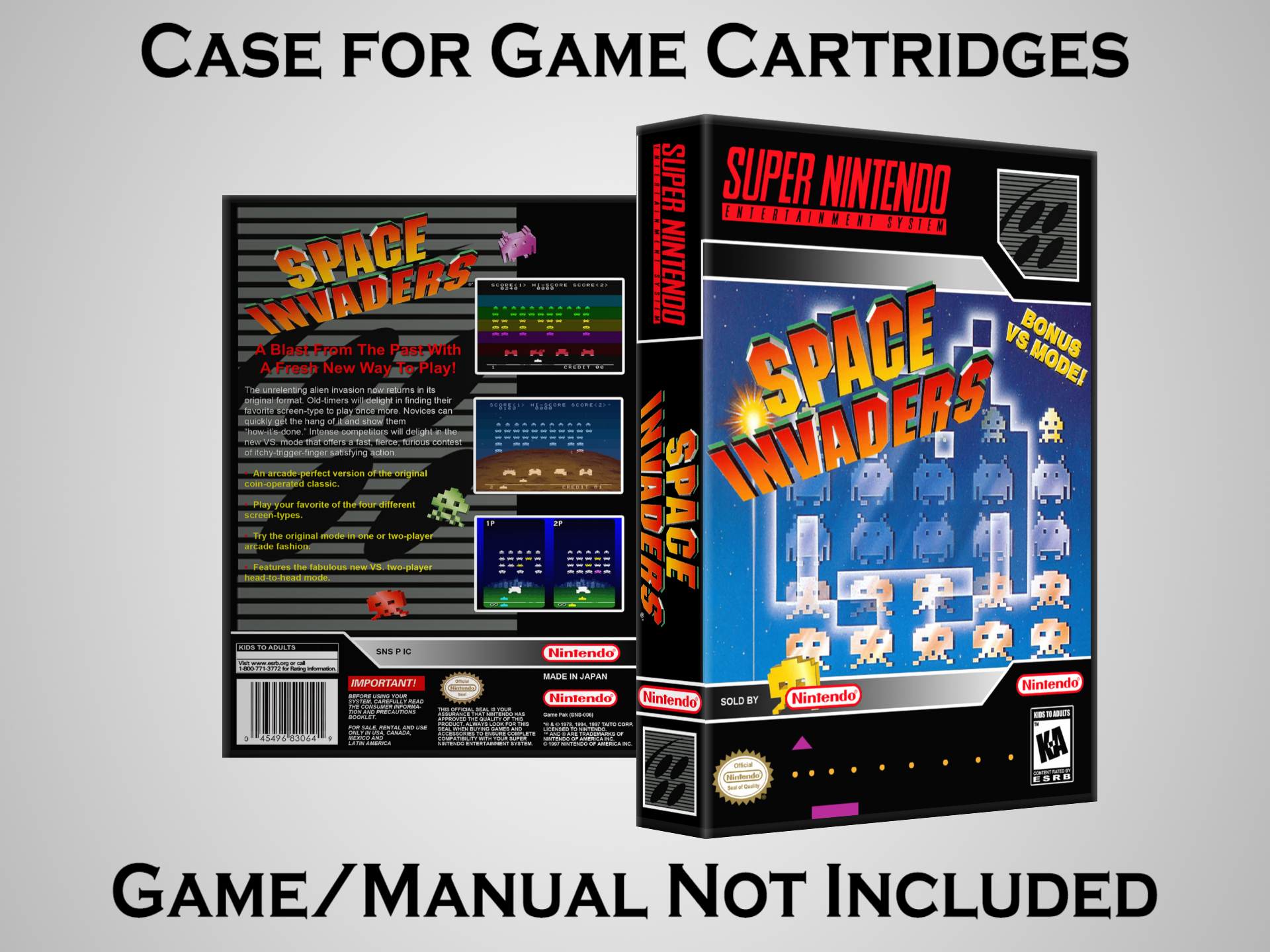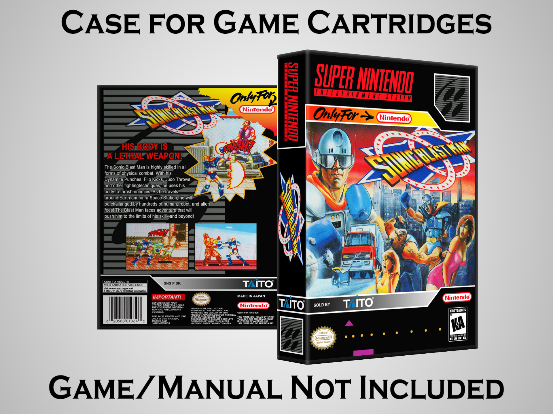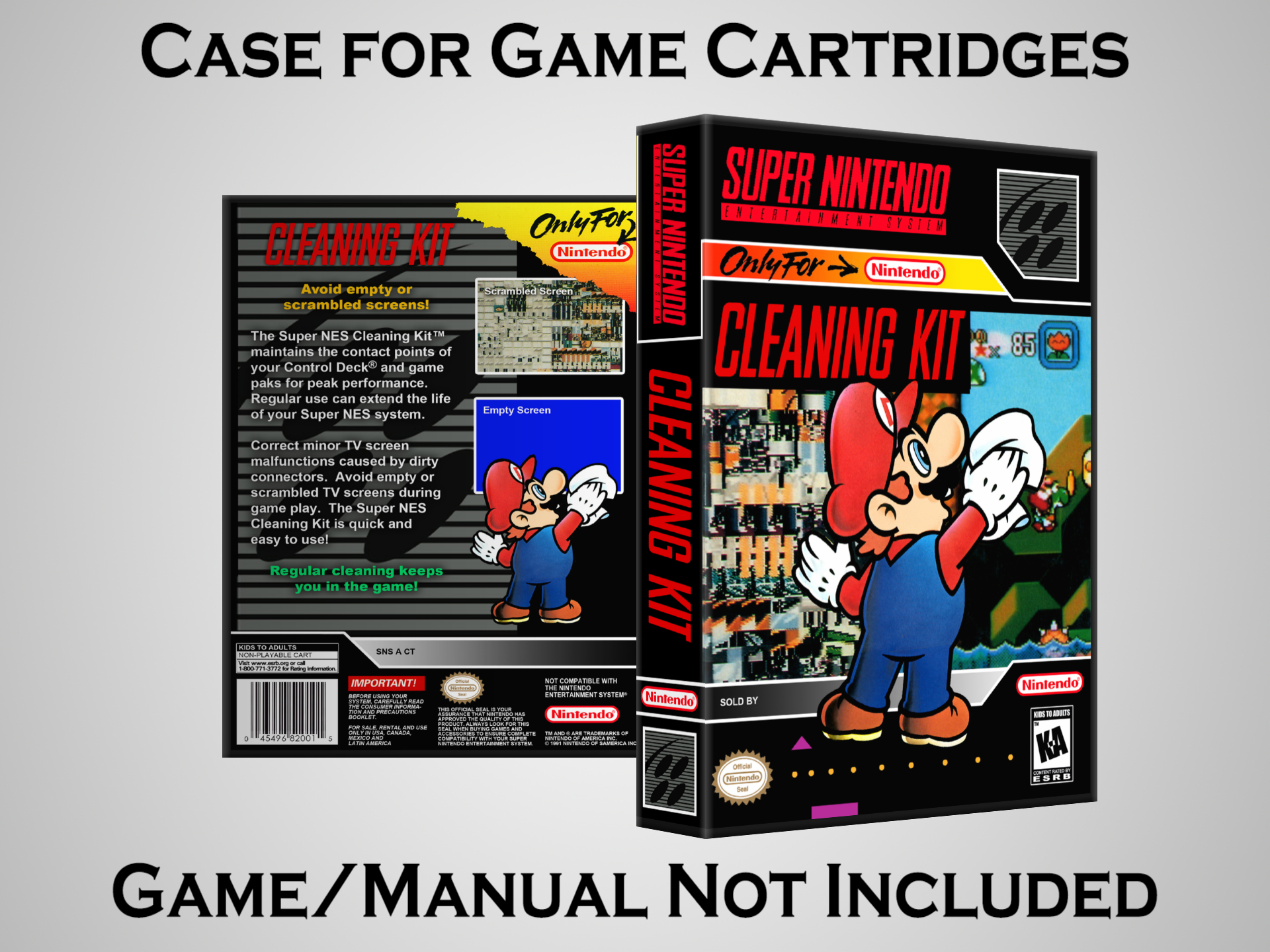 NO GAME OR MANUAL IS INCLUDED! This is NOT an original cardboard box. Case Dimensions : 7.25" x 5.25" x 1.125" Case Color : Dark Grey These cases are designed specifically to hold your Super Nintendo (SNES) cartridges. These are not the low quality Universal Game Cases that most other sellers offer. These firmly hold your cartridges in place, and include clips on the opposite side to hold the instruction manuals if you have them. Our Super Nintendo cases are split into multiple listings alphabetically due to the limit on options in one listing. You can find the rest of our cases in the following links: SNES Cases from # to F SNES Cases from G to N SNES Cases from O to S SNES Cases from T to Z Click here to find more cases in our eBay store!