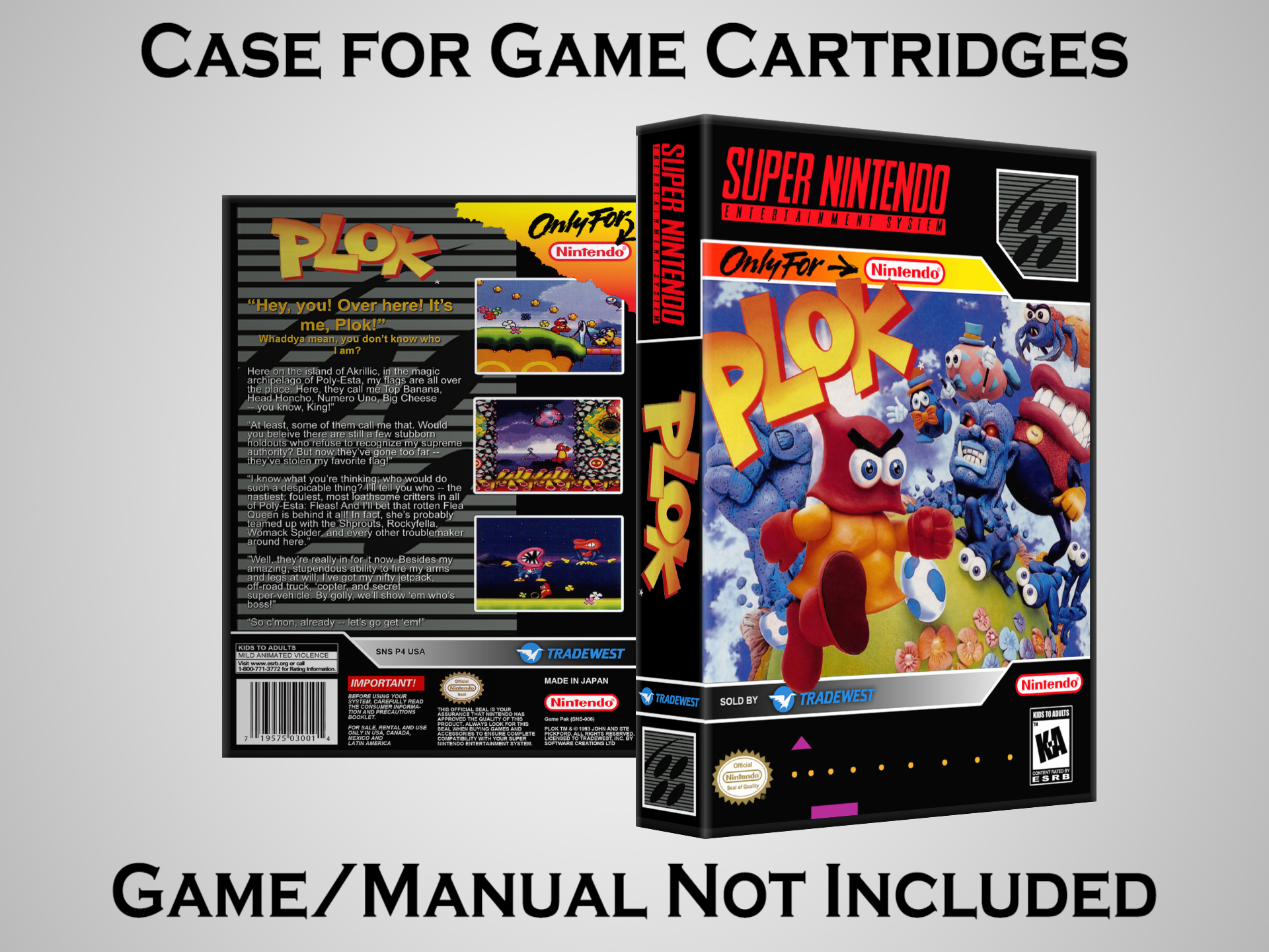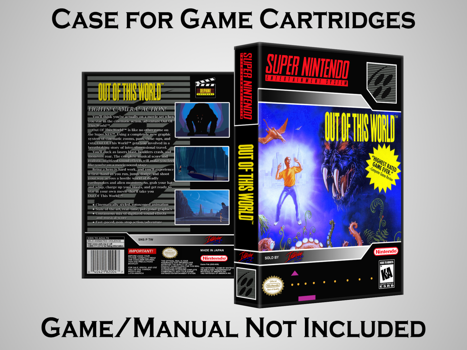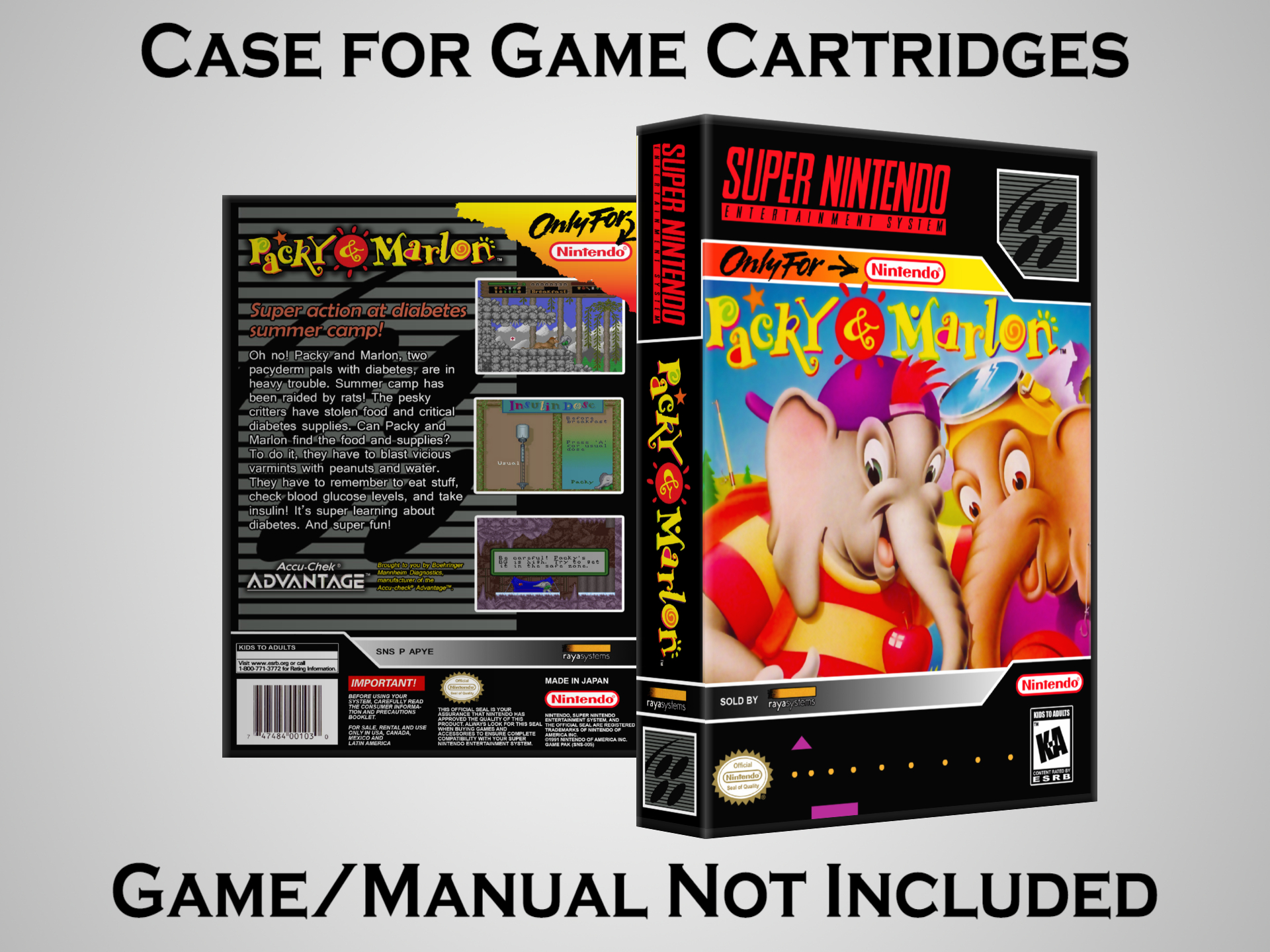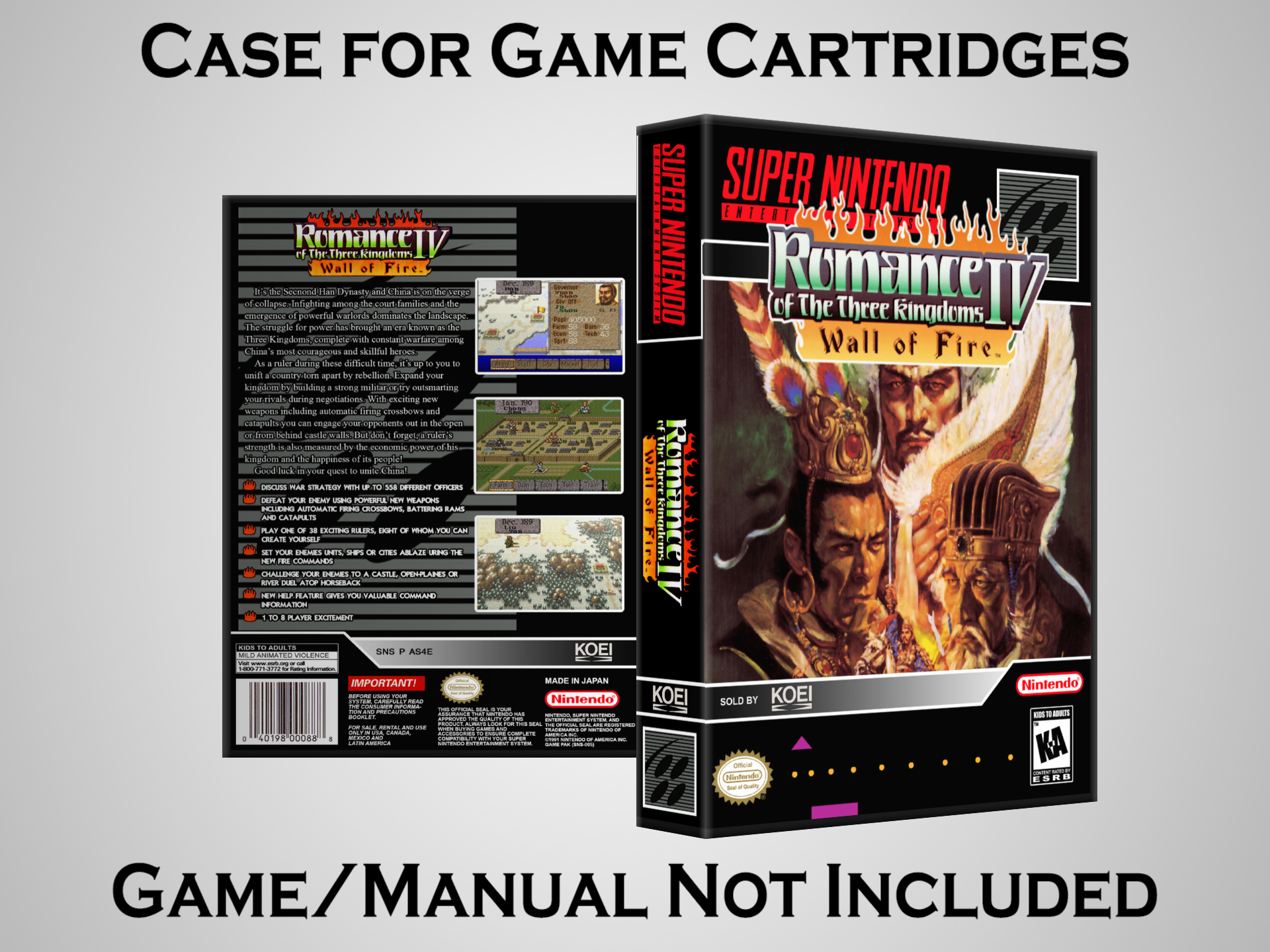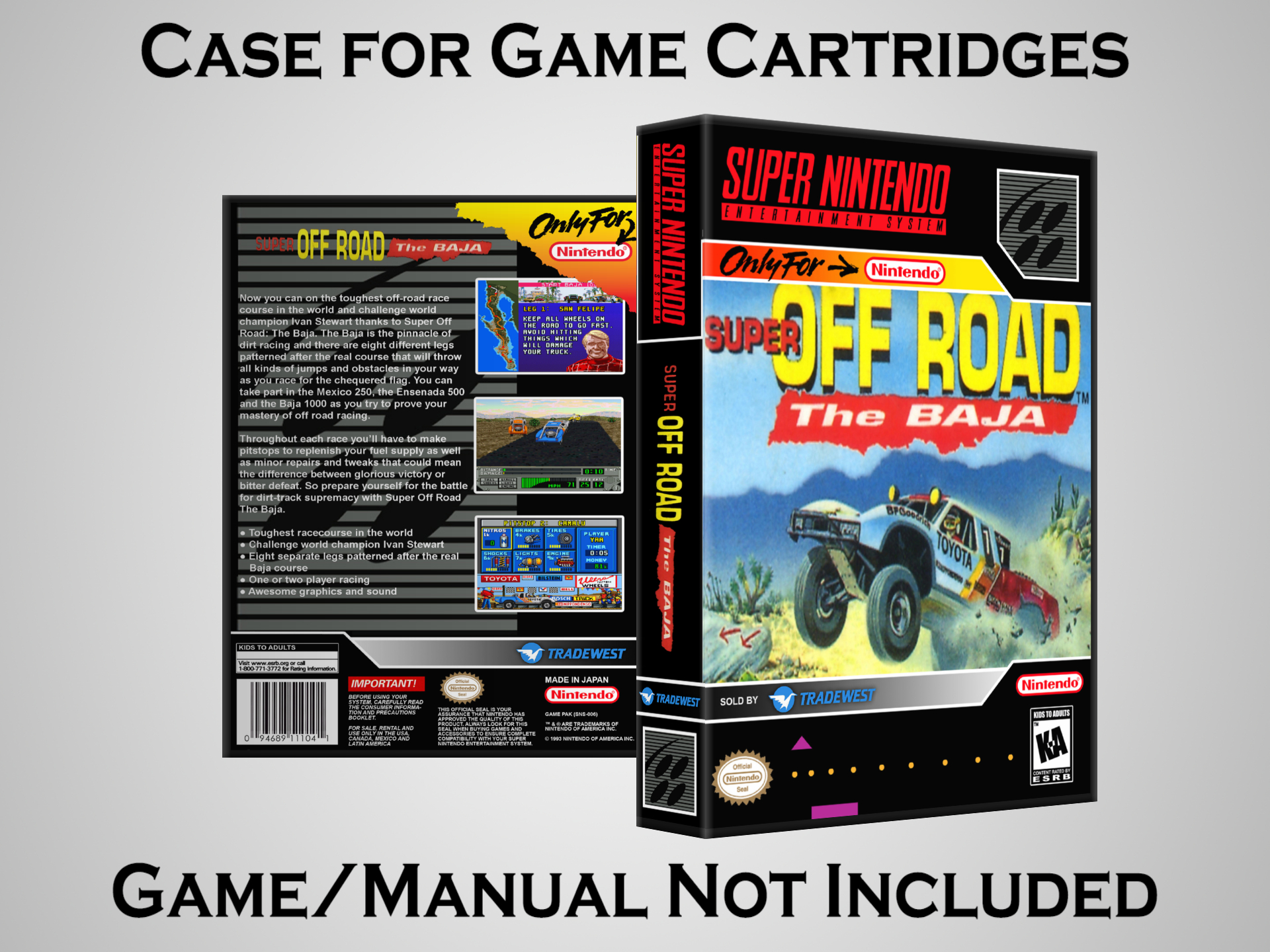 NO GAME OR MANUAL IS INCLUDED! This is NOT an original cardboard box. Case Dimensions : 7.25" x 5.25" x 1.125" Case Color : Dark Grey These cases are designed specifically to hold your Super Nintendo (SNES) cartridges. These are not the low quality Universal Game Cases that most other sellers offer. These firmly hold your cartridges in place, and include clips on the opposite side to hold the instruction manuals if you have them. Our Super Nintendo cases are split into multiple listings alphabetically due to the limit on options in one listing. You can find the rest of our cases in the following links: SNES Cases from # to F SNES Cases from G to N SNES Cases from O to S SNES Cases from T to Z Click here to find more cases in our eBay store!