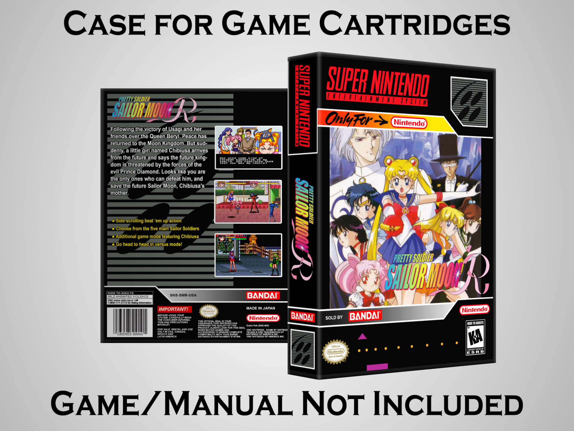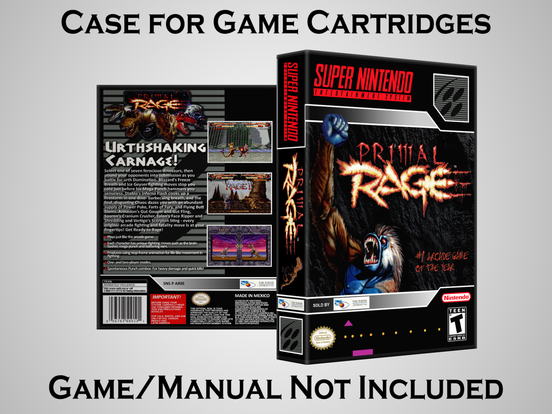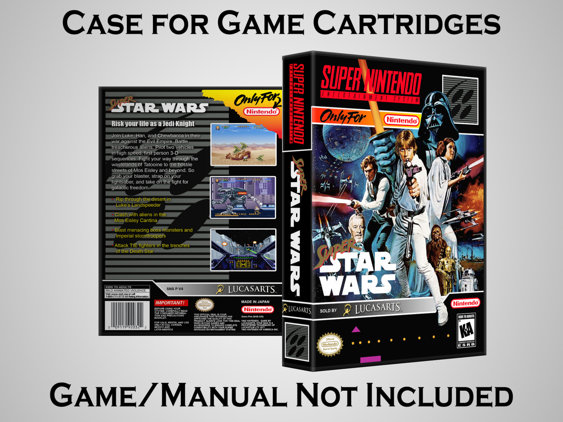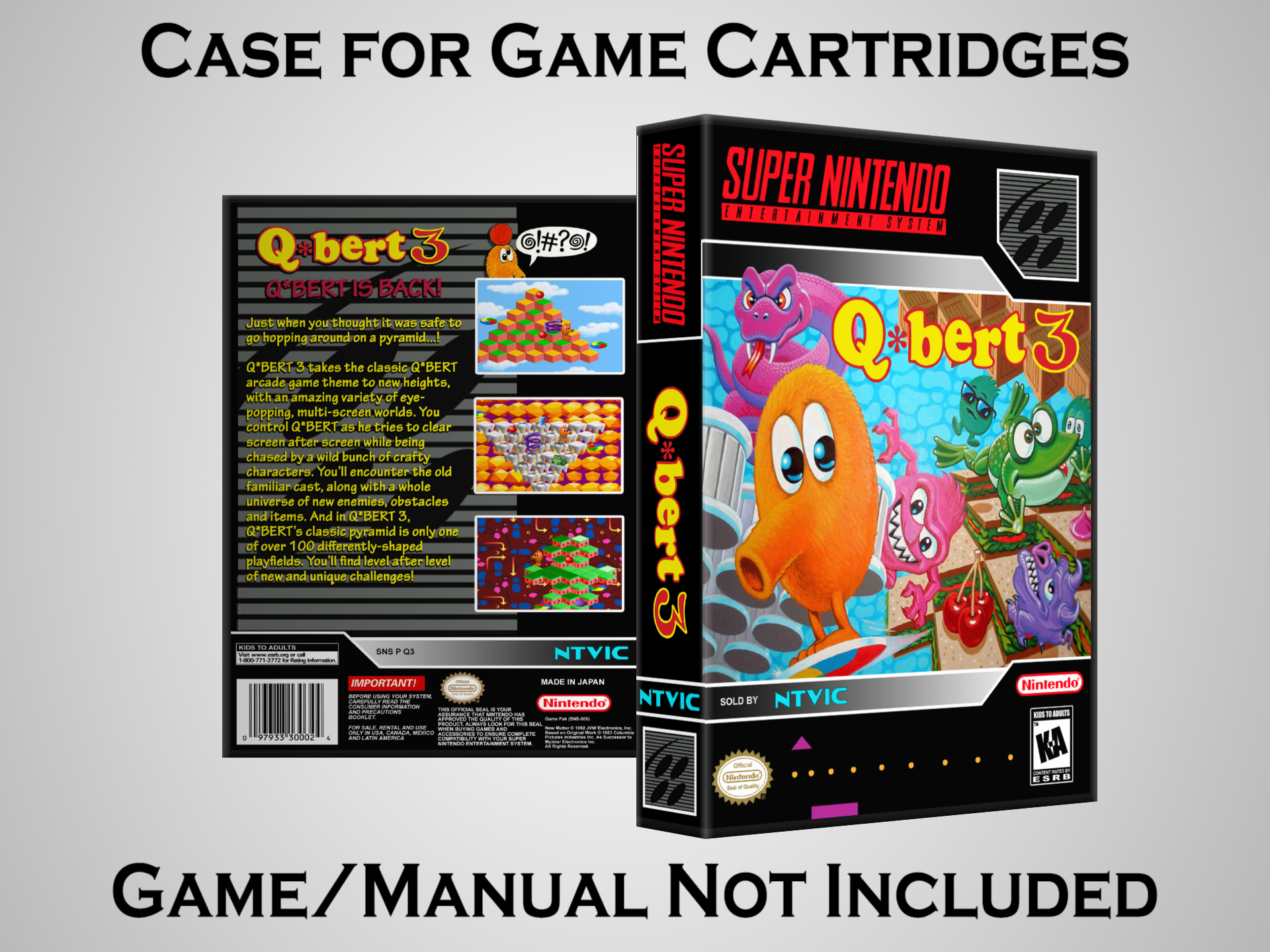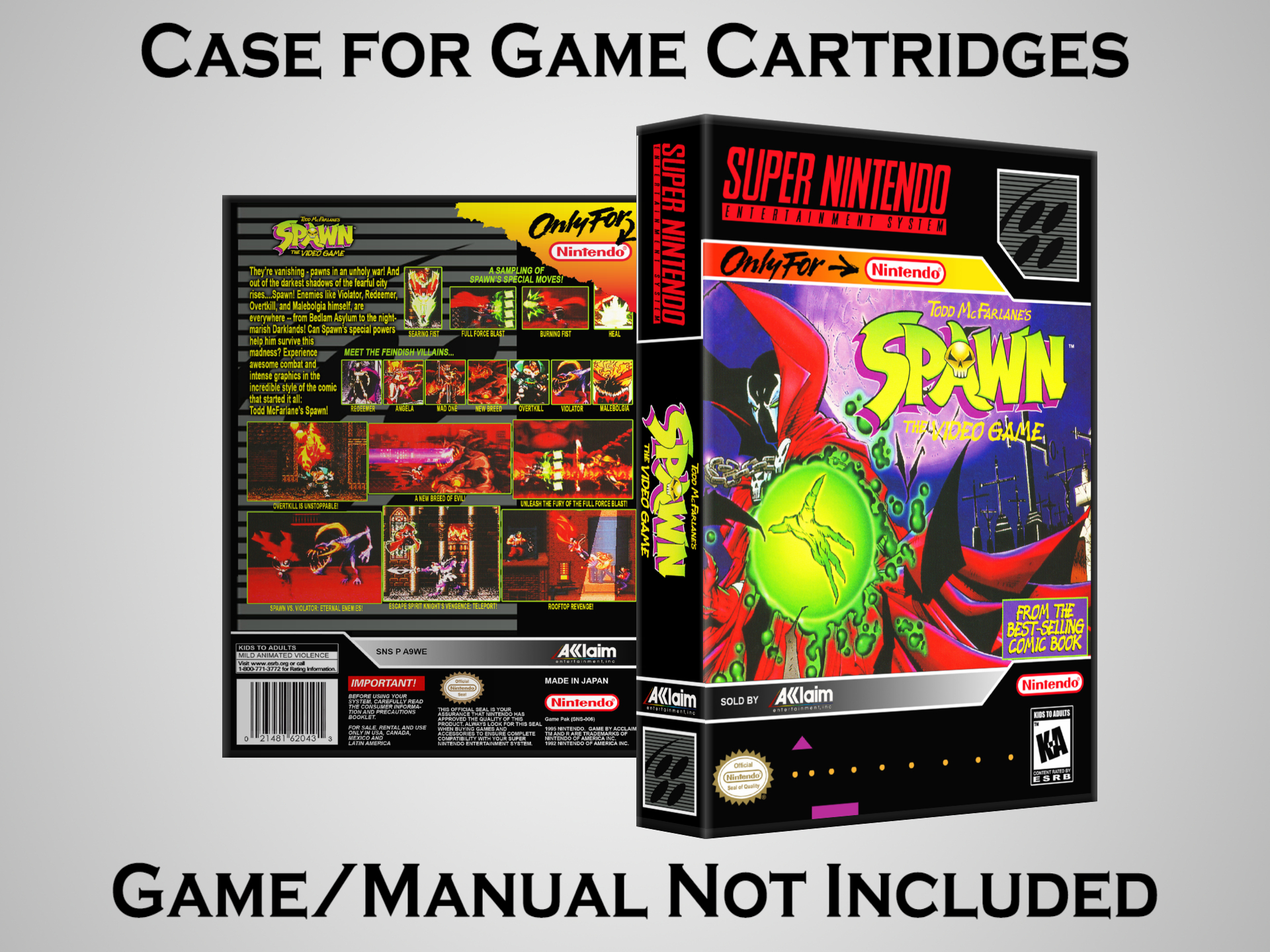 NO GAME OR MANUAL IS INCLUDED! This is NOT an original cardboard box. Case Dimensions : 7.25" x 5.25" x 1.125" Case Color : Dark Grey These cases are designed specifically to hold your Super Nintendo (SNES) cartridges. These are not the low quality Universal Game Cases that most other sellers offer. These firmly hold your cartridges in place, and include clips on the opposite side to hold the instruction manuals if you have them. Our Super Nintendo cases are split into multiple listings alphabetically due to the limit on options in one listing. You can find the rest of our cases in the following links: SNES Cases from # to F SNES Cases from G to N SNES Cases from O to S SNES Cases from T to Z Click here to find more cases in our eBay store!