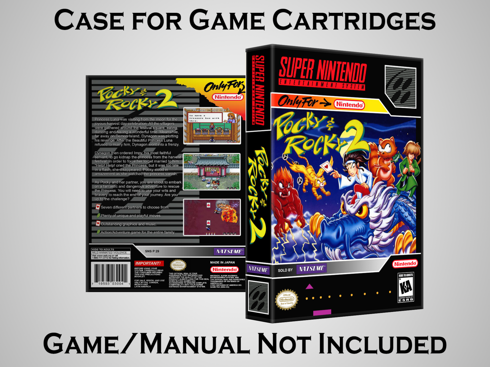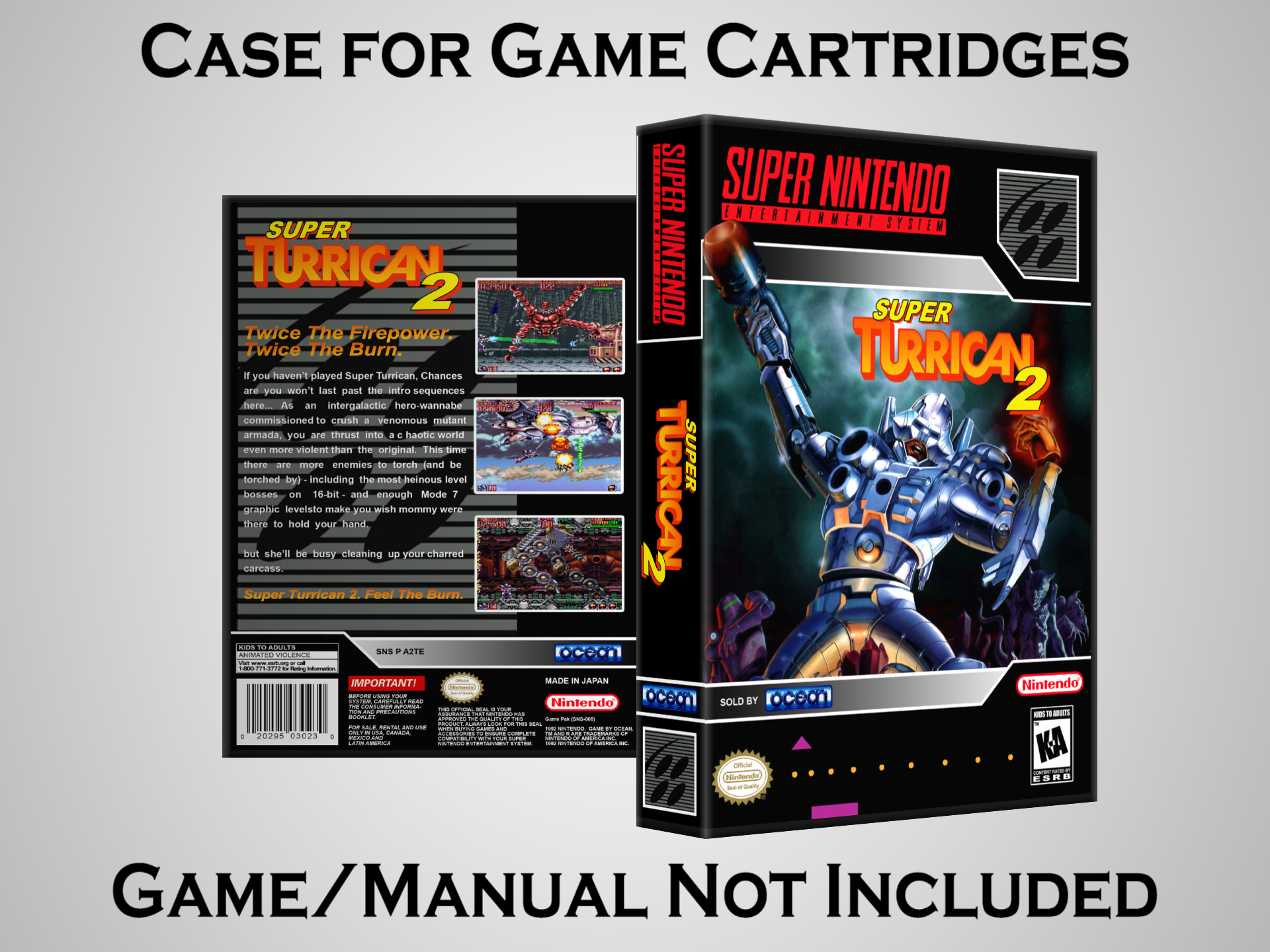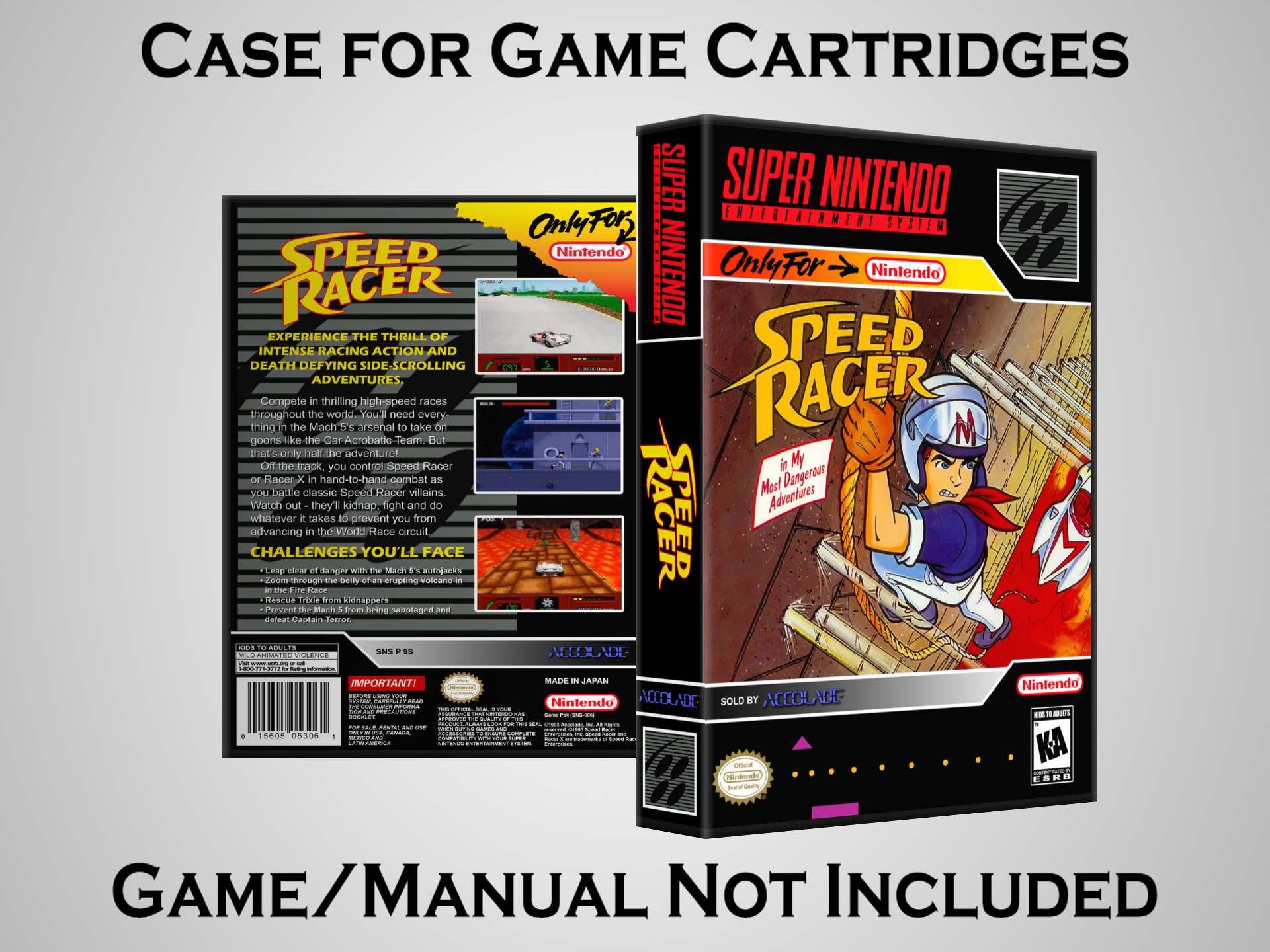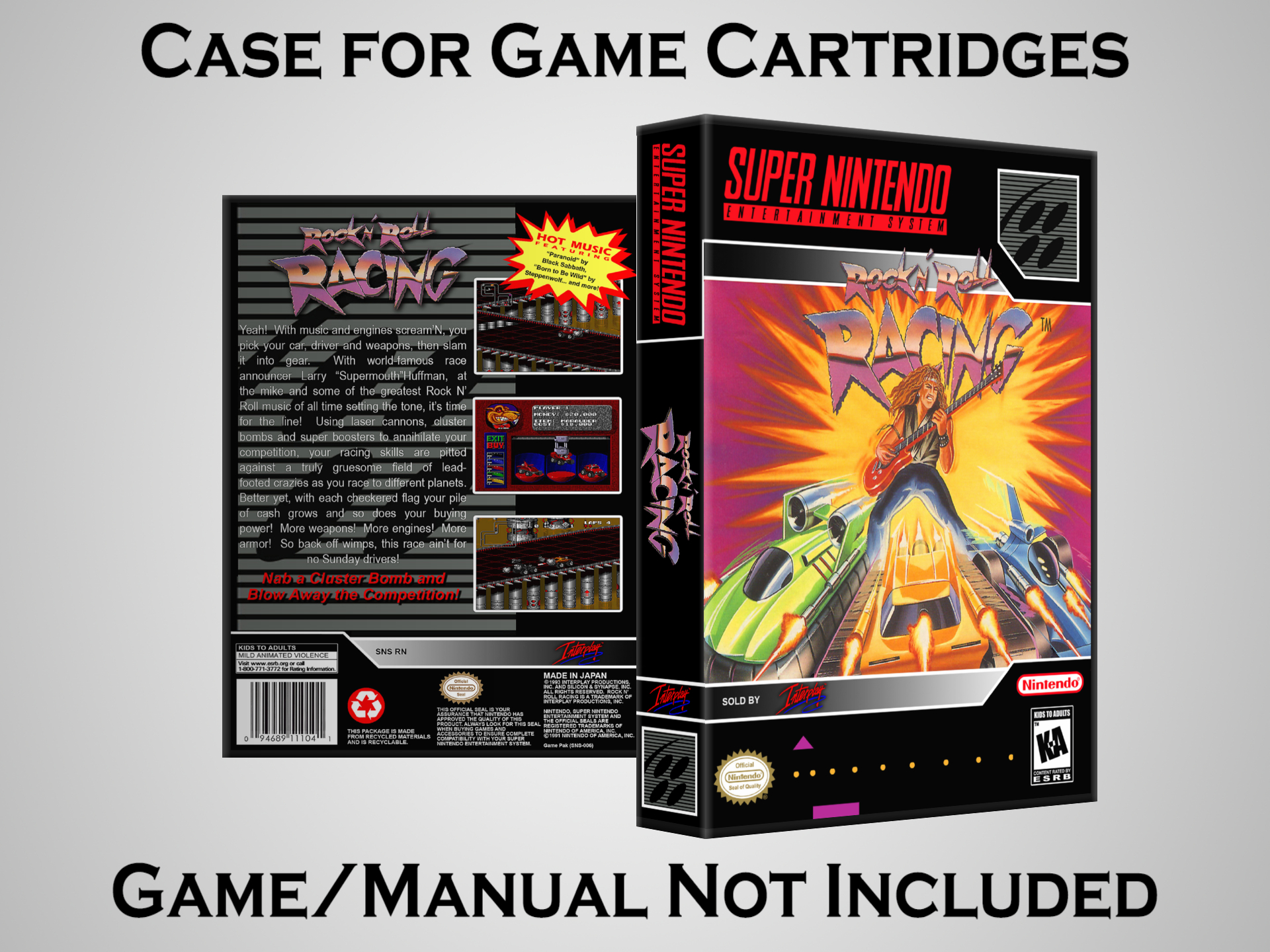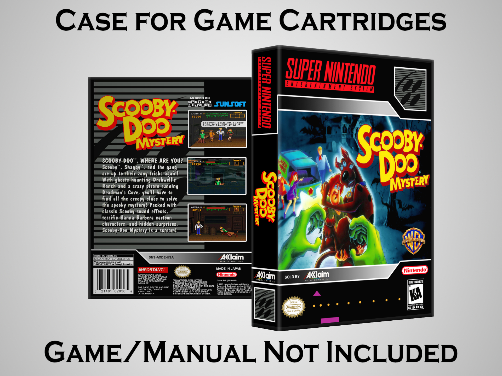 NO GAME OR MANUAL IS INCLUDED! This is NOT an original cardboard box. Case Dimensions : 7.25" x 5.25" x 1.125" Case Color : Dark Grey These cases are designed specifically to hold your Super Nintendo (SNES) cartridges. These are not the low quality Universal Game Cases that most other sellers offer. These firmly hold your cartridges in place, and include clips on the opposite side to hold the instruction manuals if you have them. Our Super Nintendo cases are split into multiple listings alphabetically due to the limit on options in one listing. You can find the rest of our cases in the following links: SNES Cases from # to F SNES Cases from G to N SNES Cases from O to S SNES Cases from T to Z Click here to find more cases in our eBay store!