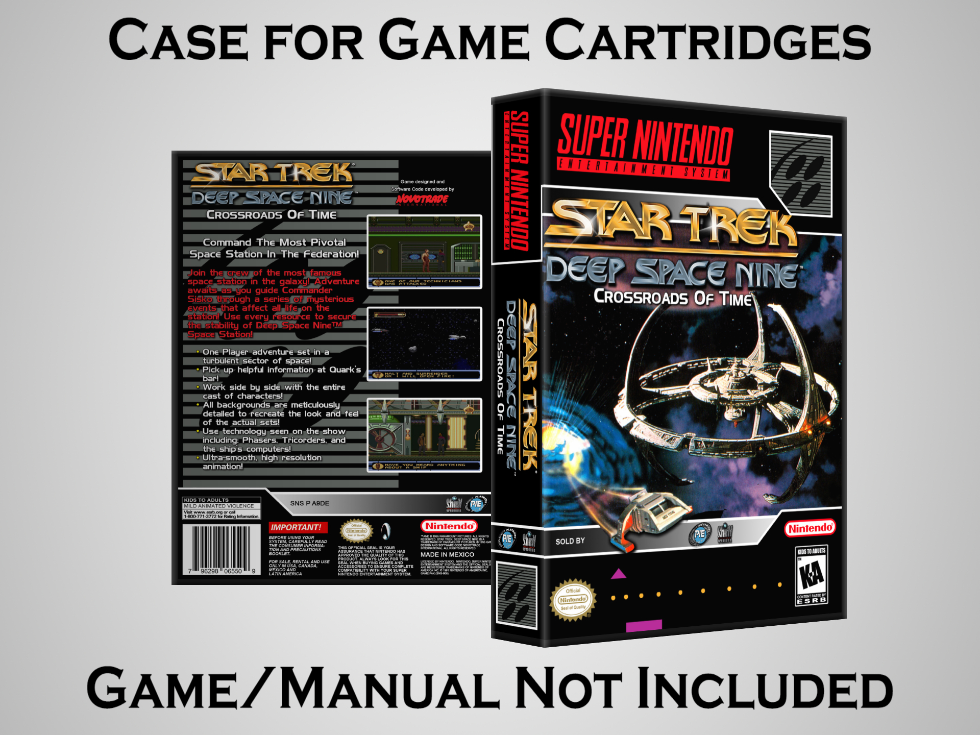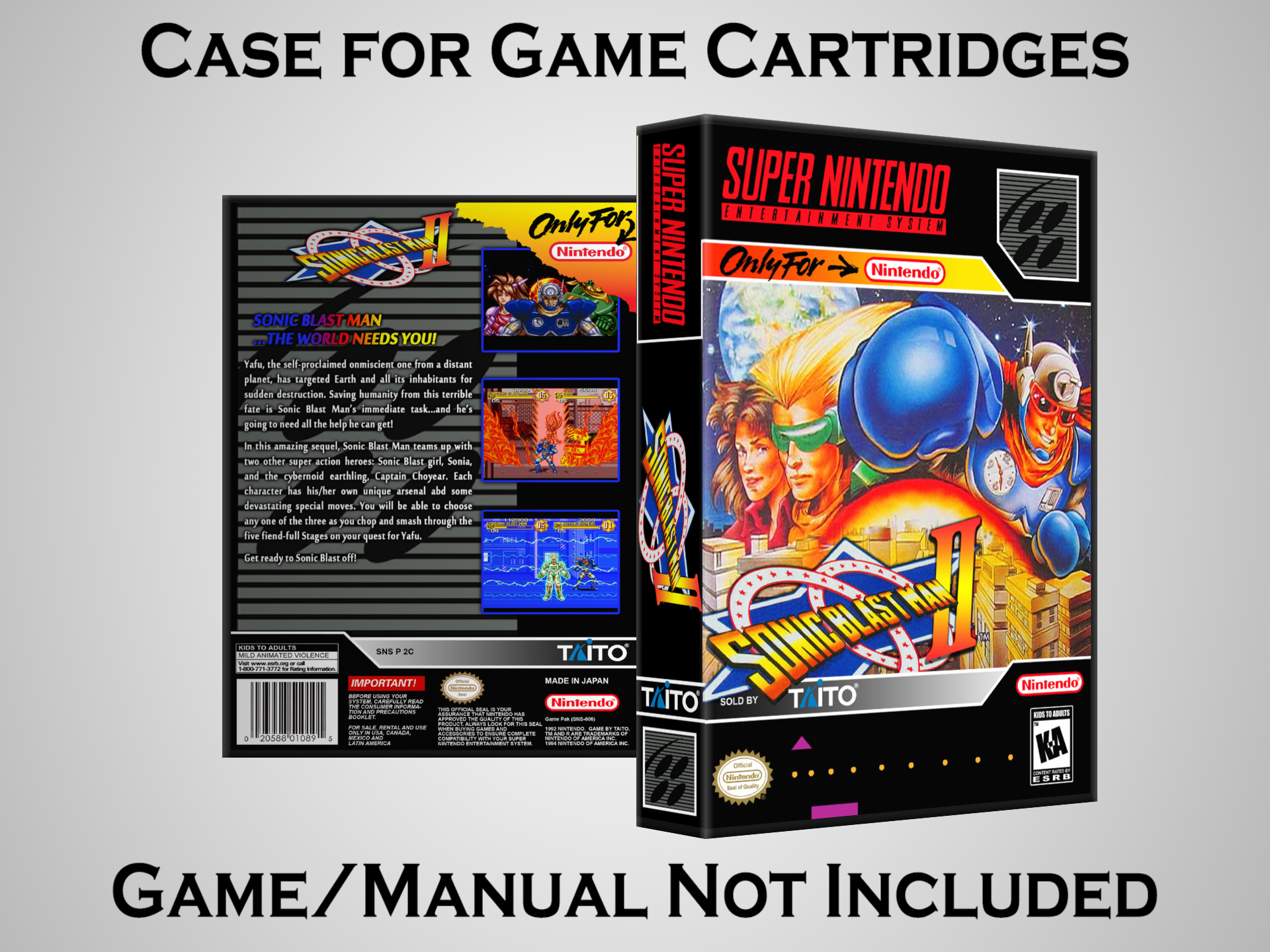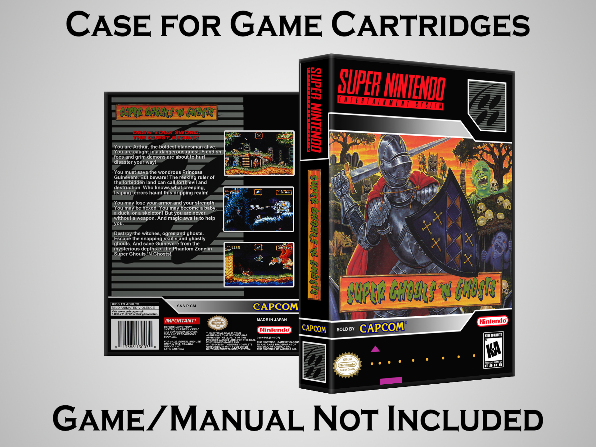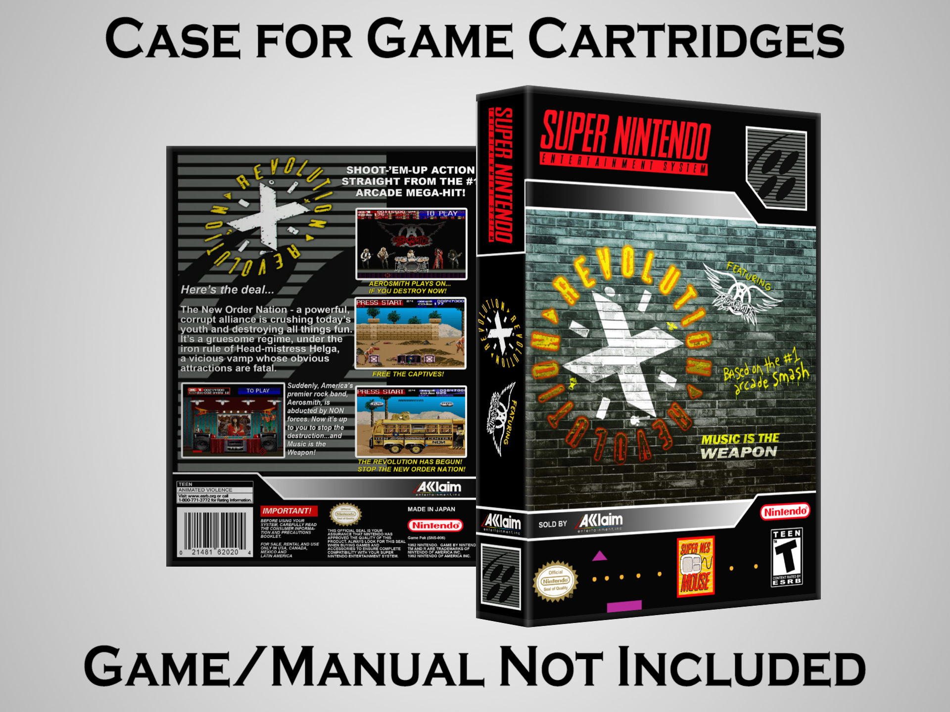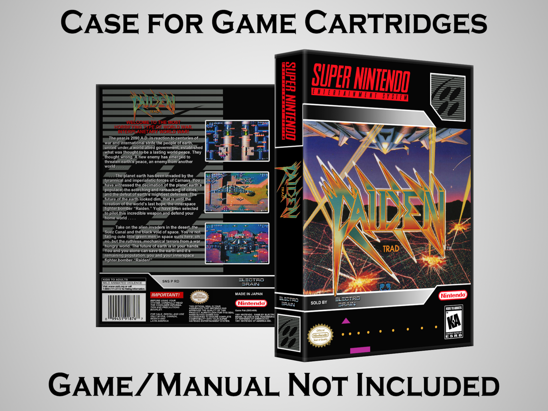 NO GAME OR MANUAL IS INCLUDED! This is NOT an original cardboard box. Case Dimensions : 7.25" x 5.25" x 1.125" Case Color : Dark Grey These cases are designed specifically to hold your Super Nintendo (SNES) cartridges. These are not the low quality Universal Game Cases that most other sellers offer. These firmly hold your cartridges in place, and include clips on the opposite side to hold the instruction manuals if you have them. Our Super Nintendo cases are split into multiple listings alphabetically due to the limit on options in one listing. You can find the rest of our cases in the following links: SNES Cases from # to F SNES Cases from G to N SNES Cases from O to S SNES Cases from T to Z Click here to find more cases in our eBay store!