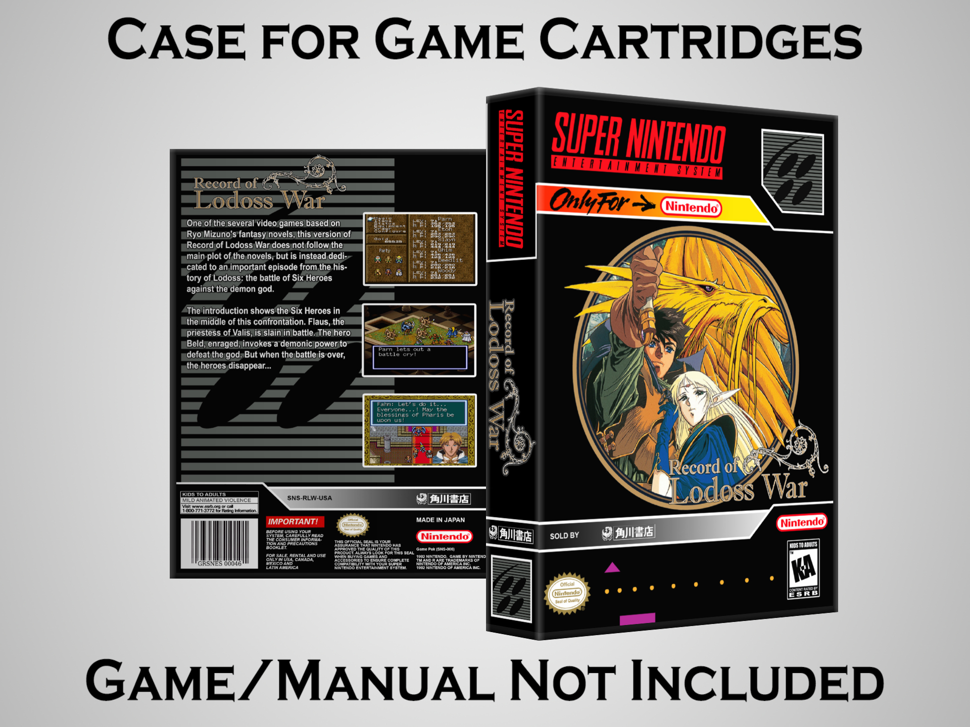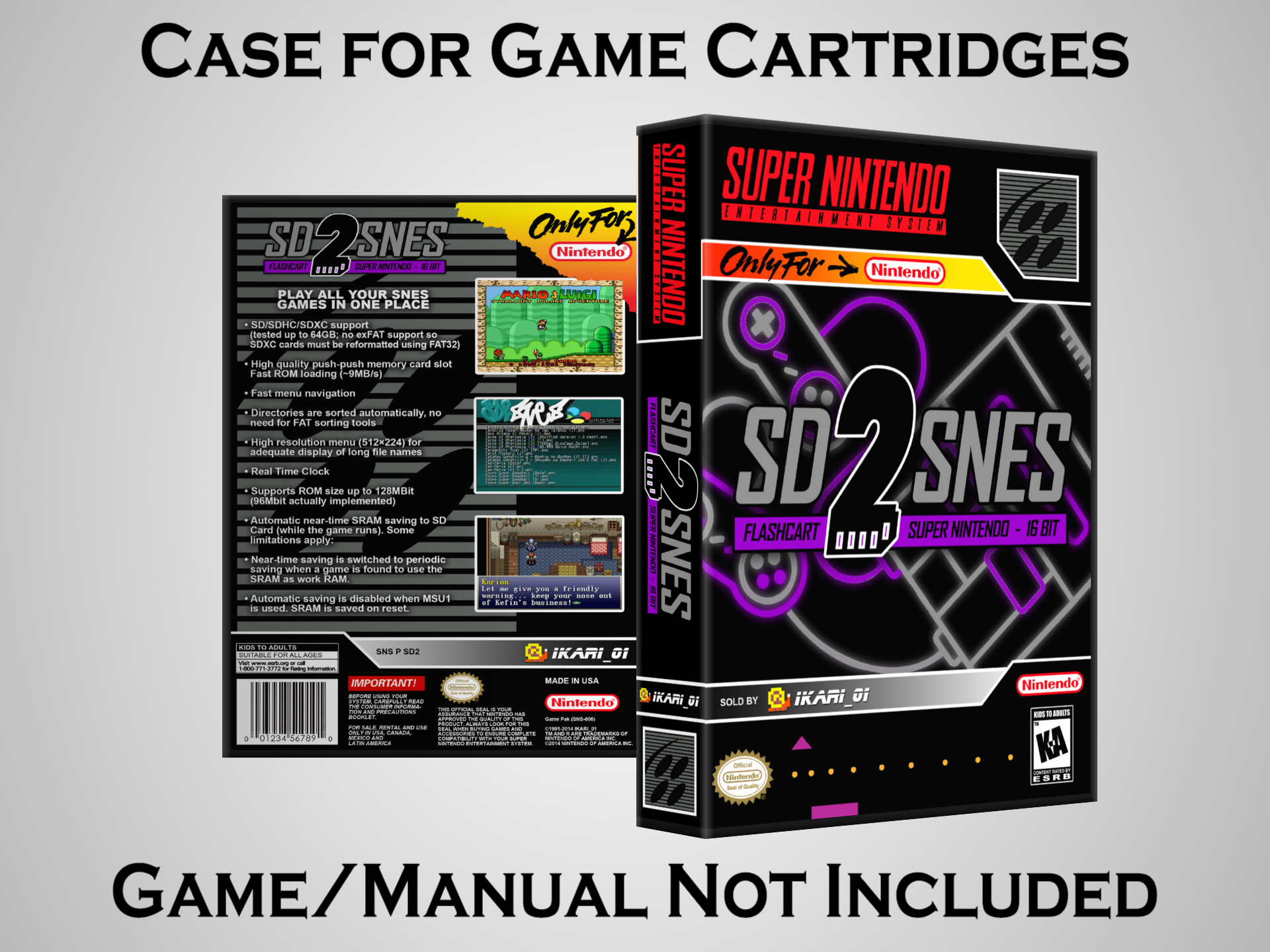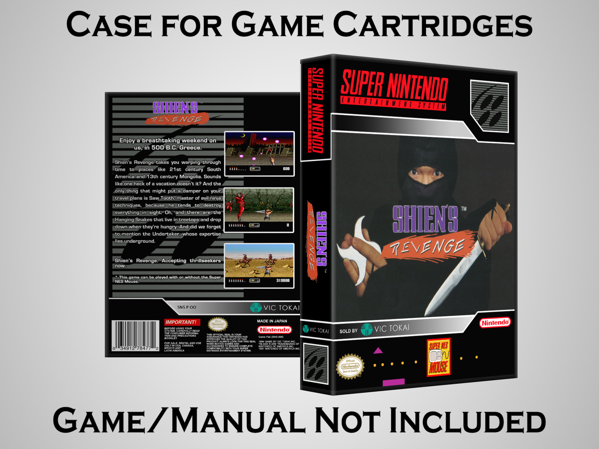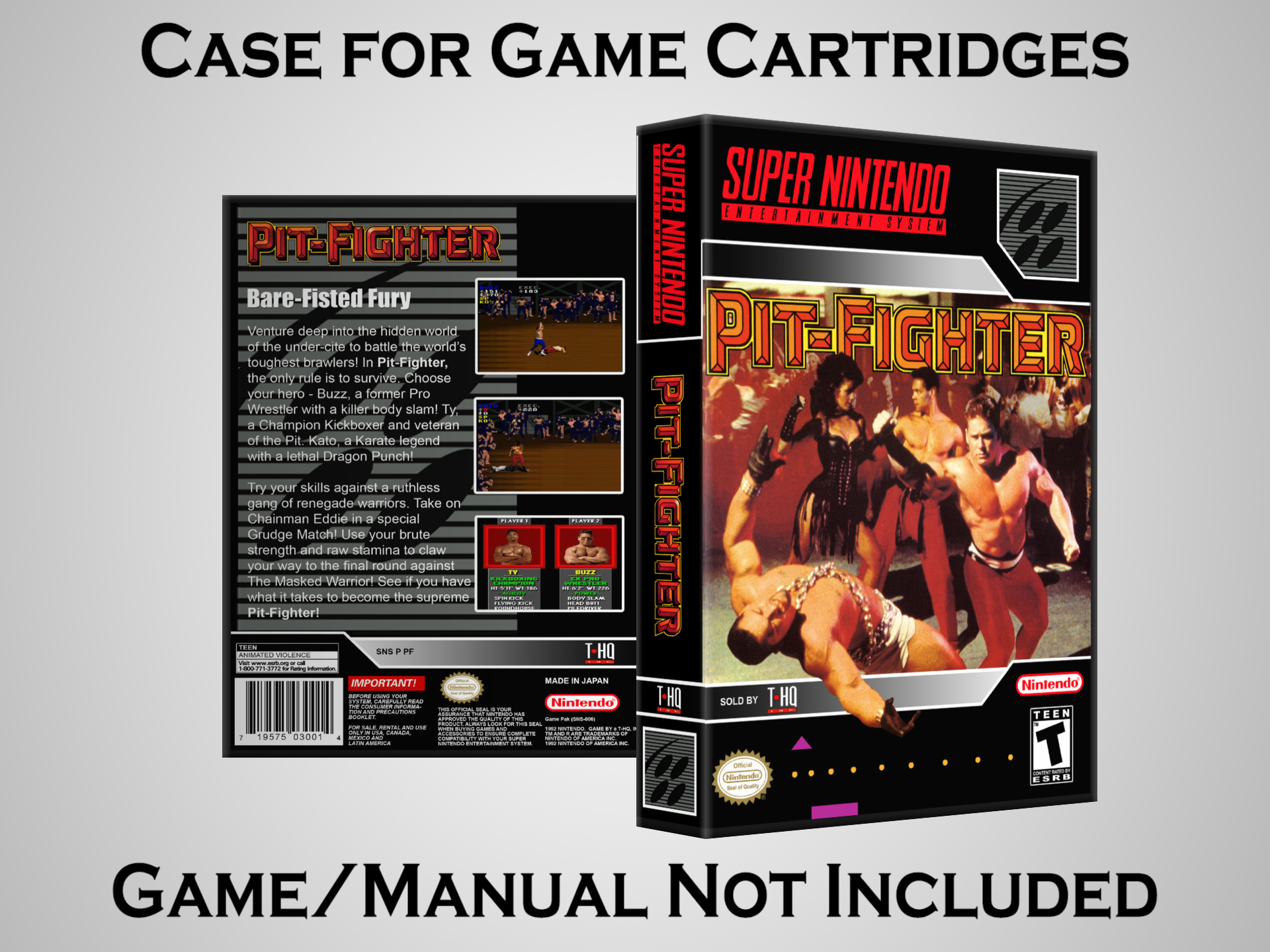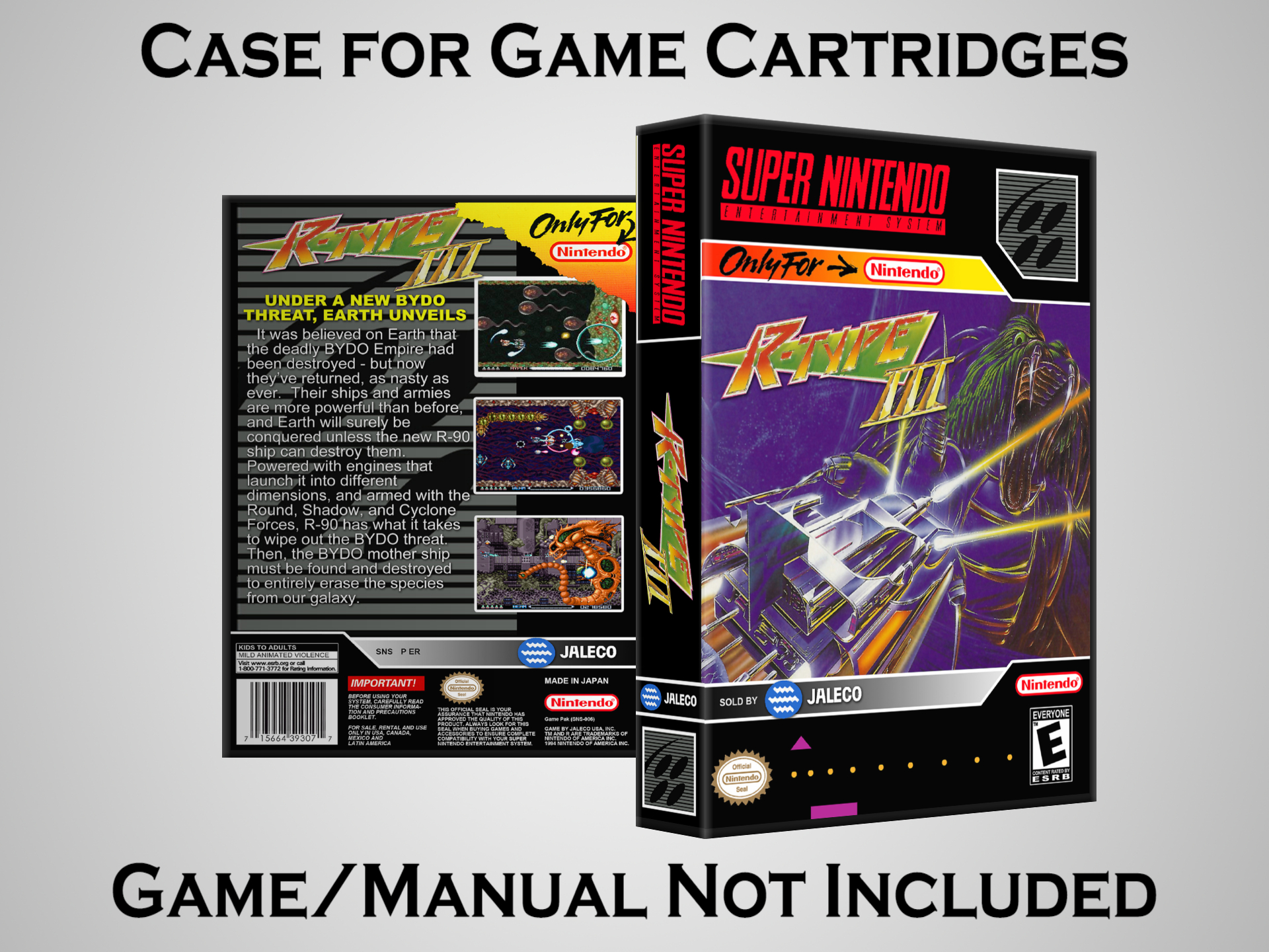 NO GAME OR MANUAL IS INCLUDED! This is NOT an original cardboard box. Case Dimensions : 7.25" x 5.25" x 1.125" Case Color : Dark Grey These cases are designed specifically to hold your Super Nintendo (SNES) cartridges. These are not the low quality Universal Game Cases that most other sellers offer. These firmly hold your cartridges in place, and include clips on the opposite side to hold the instruction manuals if you have them. Our Super Nintendo cases are split into multiple listings alphabetically due to the limit on options in one listing. You can find the rest of our cases in the following links: SNES Cases from # to F SNES Cases from G to N SNES Cases from O to S SNES Cases from T to Z Click here to find more cases in our eBay store!