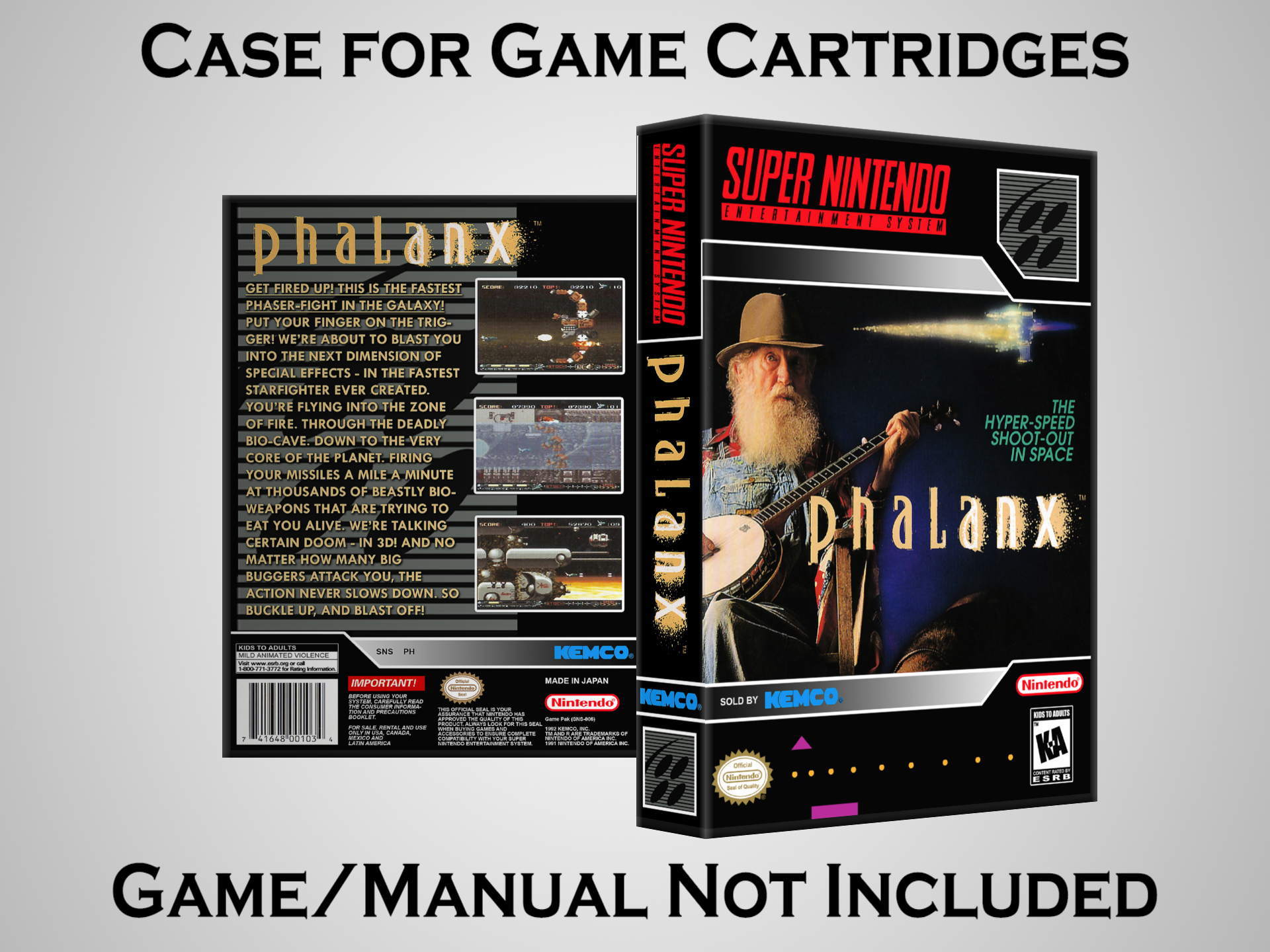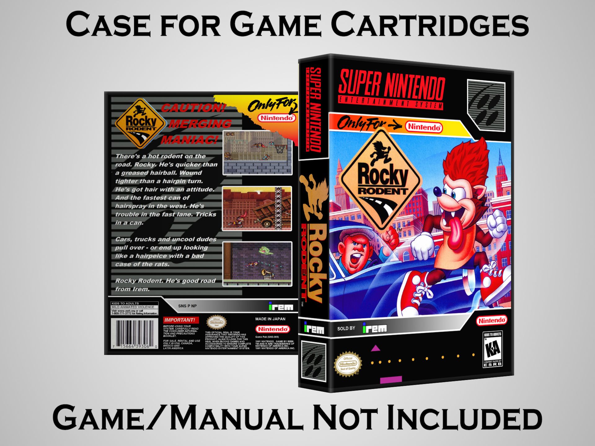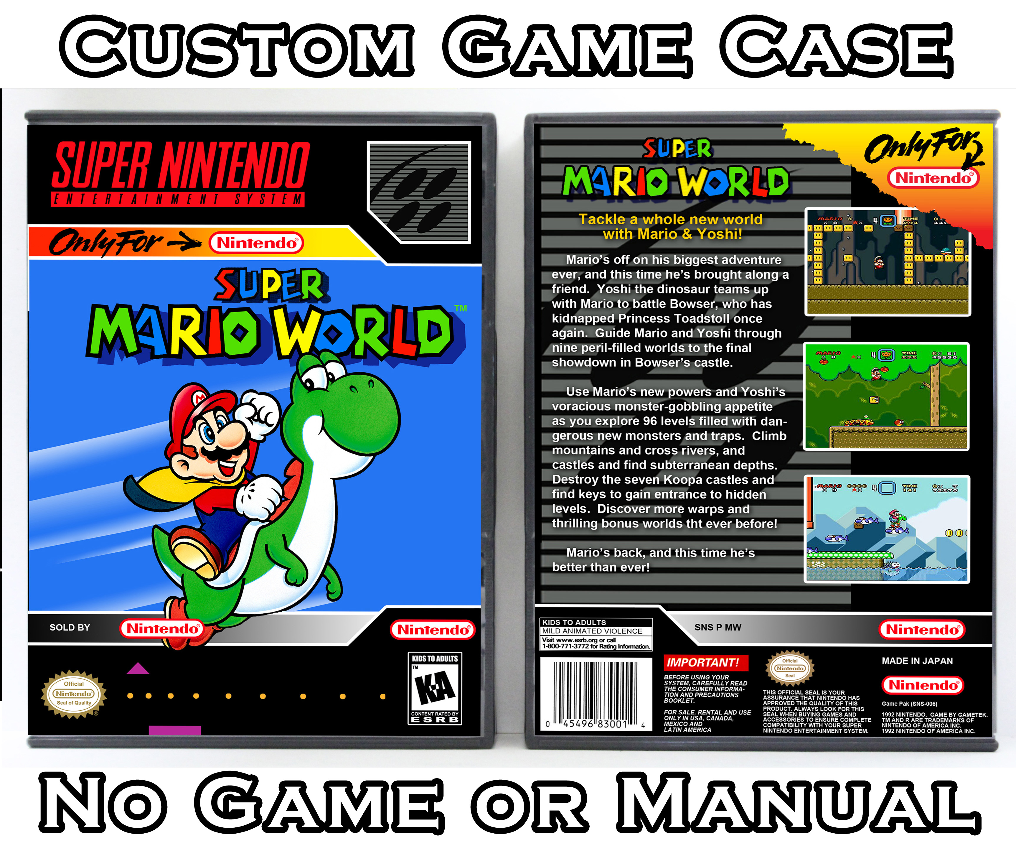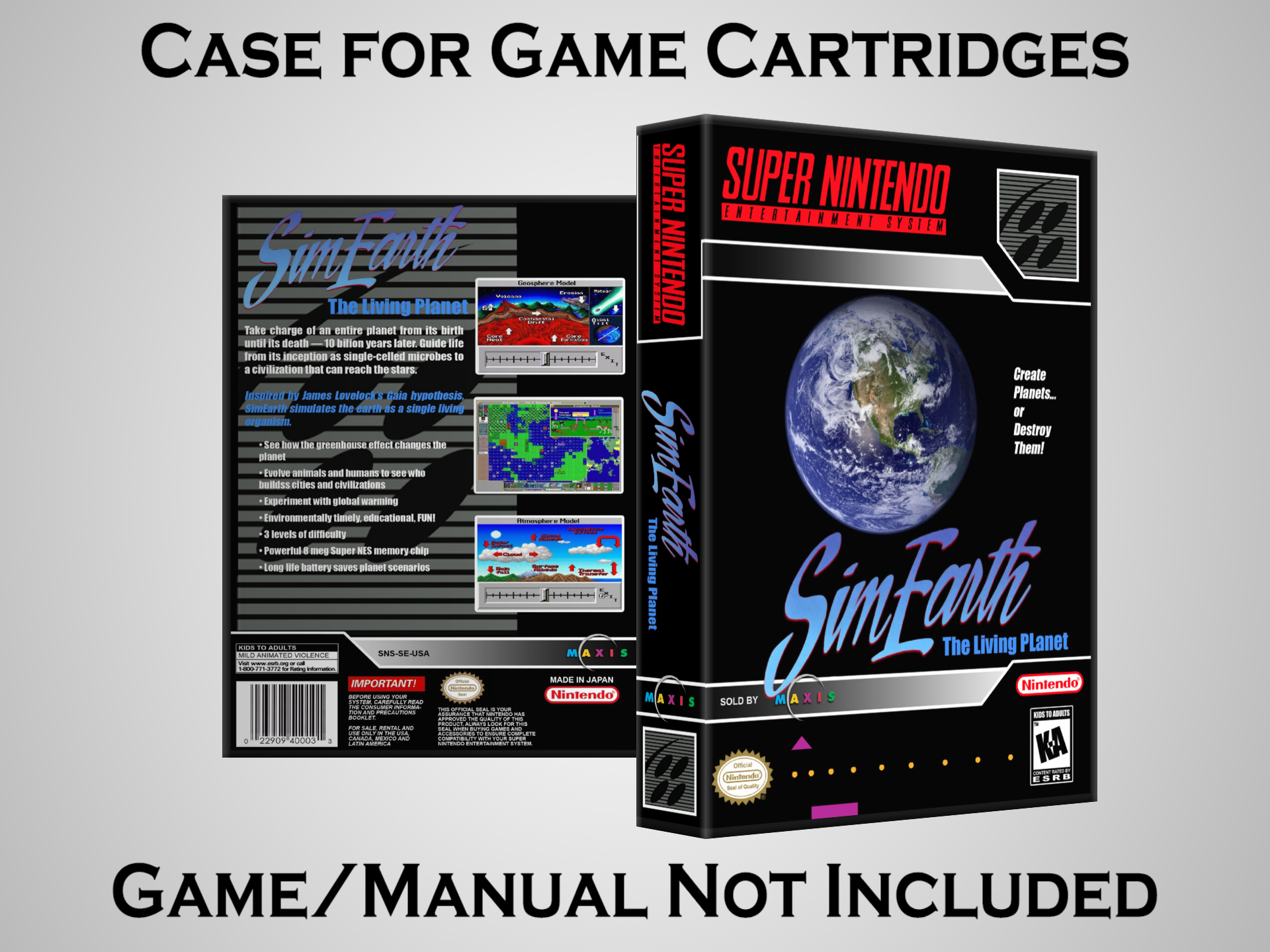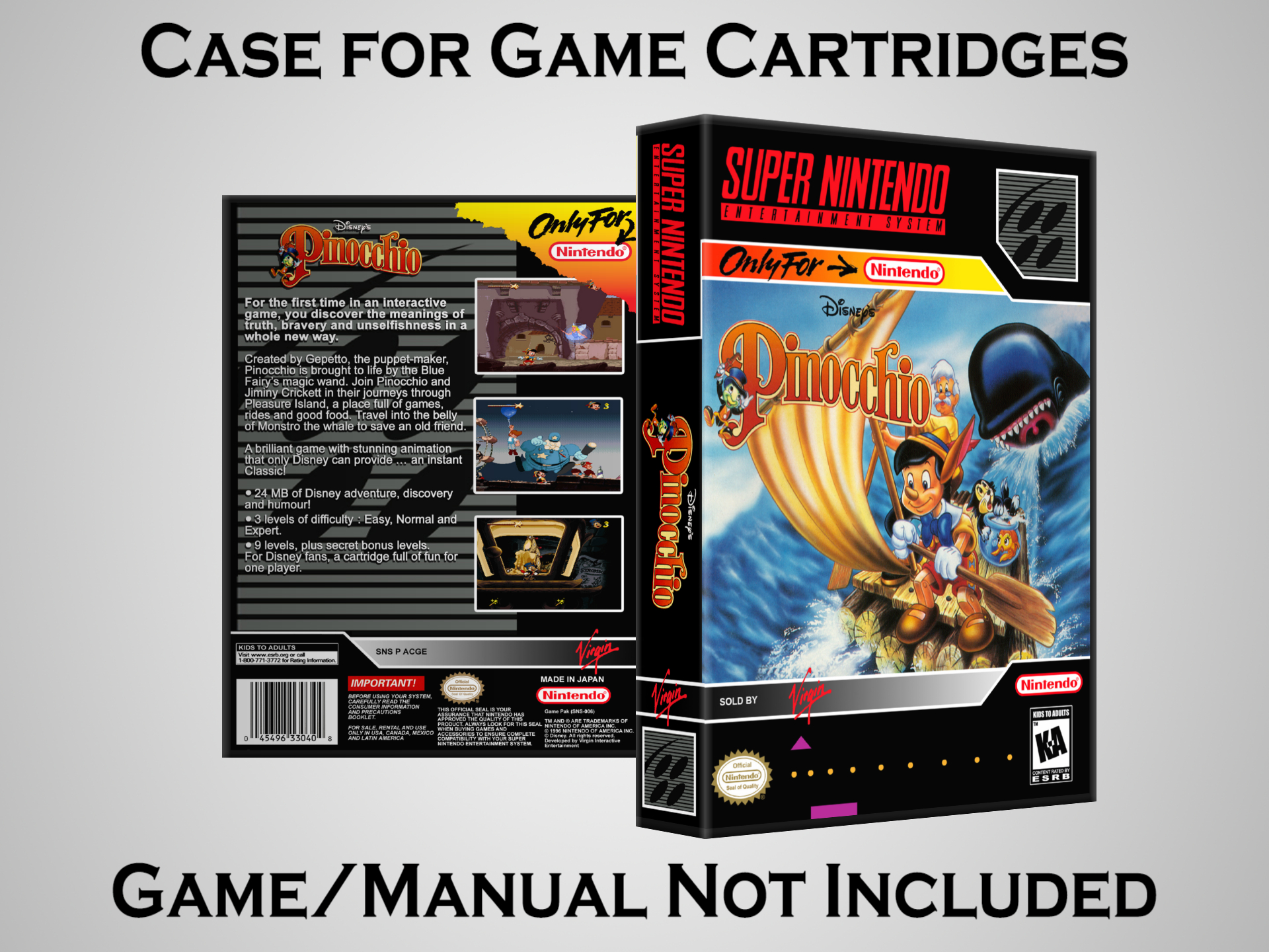 NO GAME OR MANUAL IS INCLUDED! This is NOT an original cardboard box. Case Dimensions : 7.25" x 5.25" x 1.125" Case Color : Dark Grey These cases are designed specifically to hold your Super Nintendo (SNES) cartridges. These are not the low quality Universal Game Cases that most other sellers offer. These firmly hold your cartridges in place, and include clips on the opposite side to hold the instruction manuals if you have them. Our Super Nintendo cases are split into multiple listings alphabetically due to the limit on options in one listing. You can find the rest of our cases in the following links: SNES Cases from # to F SNES Cases from G to N SNES Cases from O to S SNES Cases from T to Z Click here to find more cases in our eBay store!