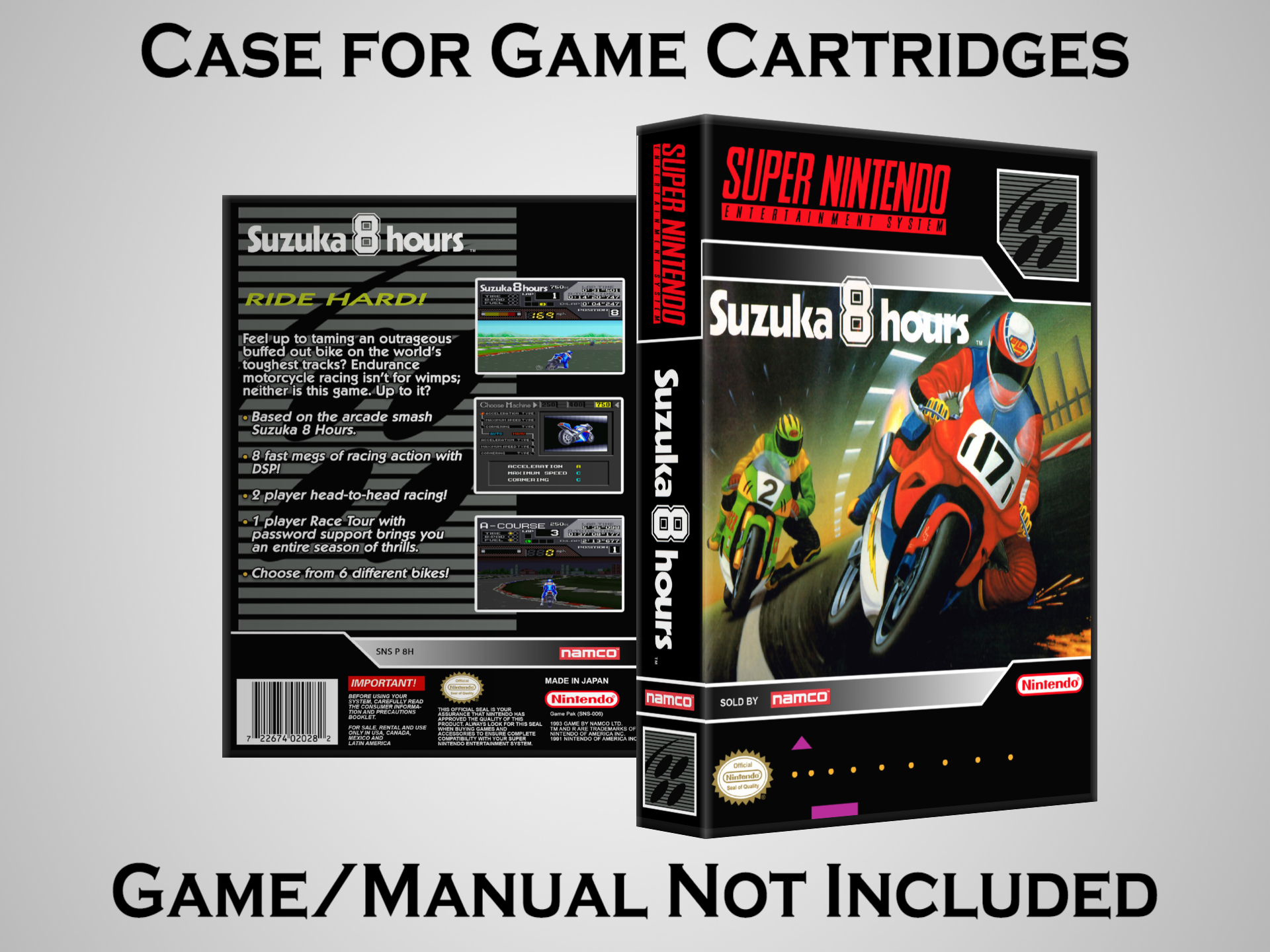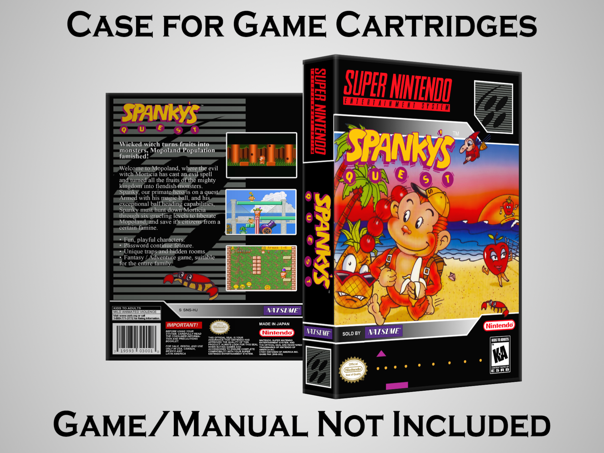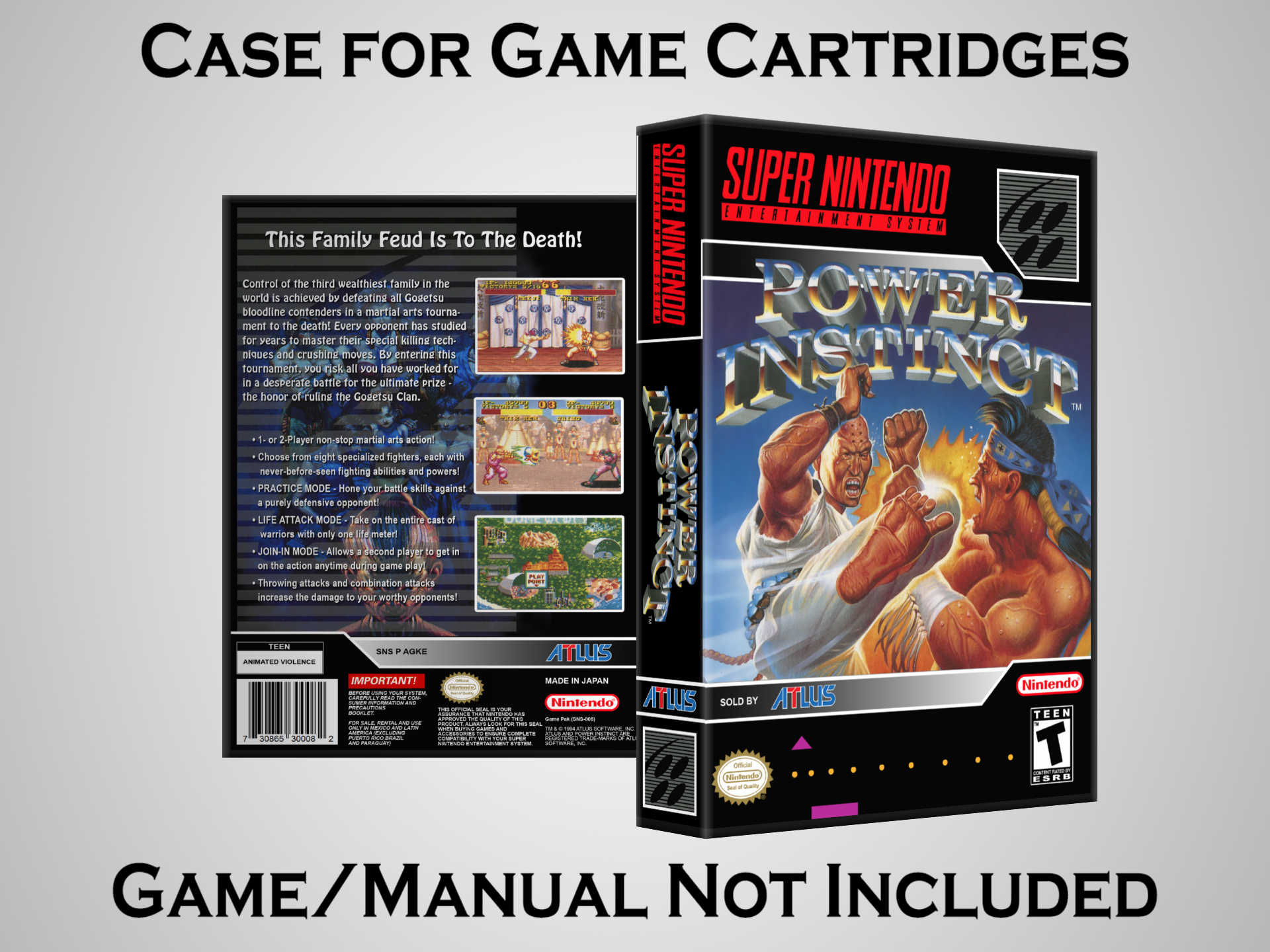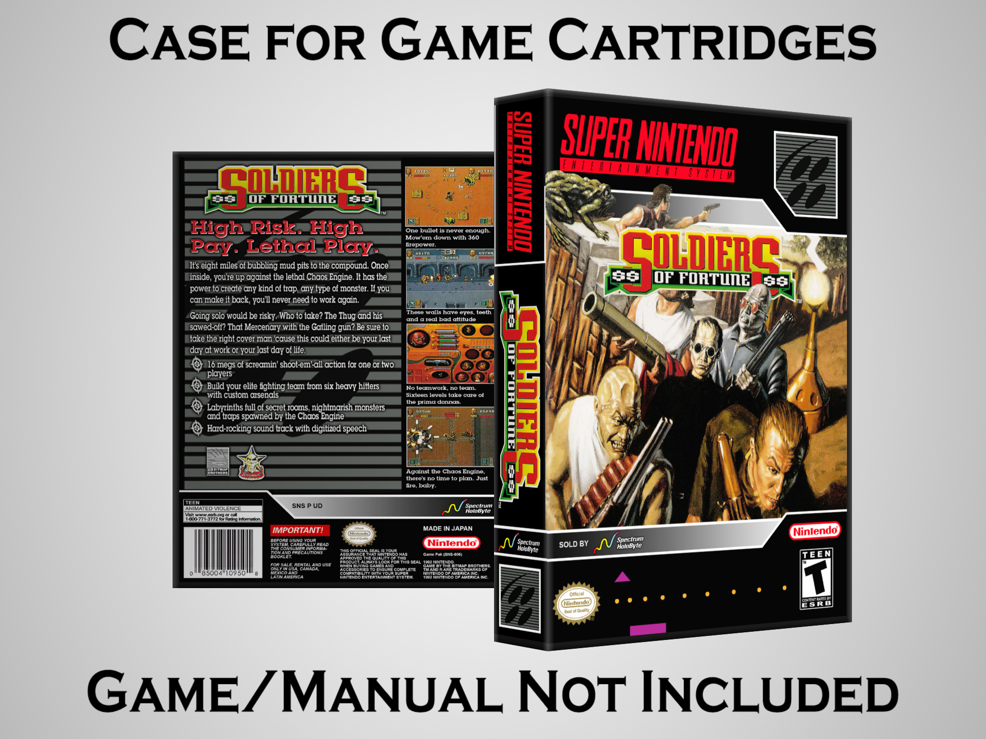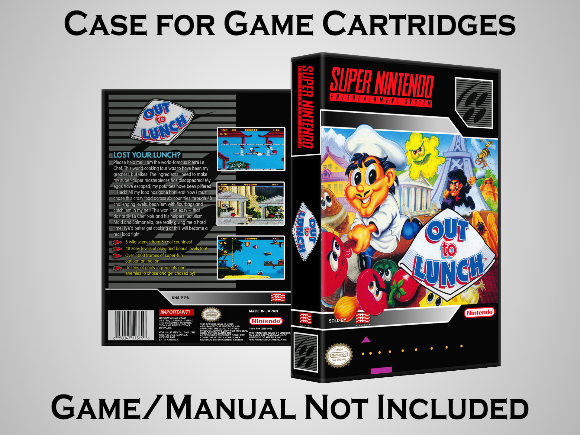 NO GAME OR MANUAL IS INCLUDED! This is NOT an original cardboard box. Case Dimensions : 7.25" x 5.25" x 1.125" Case Color : Dark Grey These cases are designed specifically to hold your Super Nintendo (SNES) cartridges. These are not the low quality Universal Game Cases that most other sellers offer. These firmly hold your cartridges in place, and include clips on the opposite side to hold the instruction manuals if you have them. Our Super Nintendo cases are split into multiple listings alphabetically due to the limit on options in one listing. You can find the rest of our cases in the following links: SNES Cases from # to F SNES Cases from G to N SNES Cases from O to S SNES Cases from T to Z Click here to find more cases in our eBay store!
