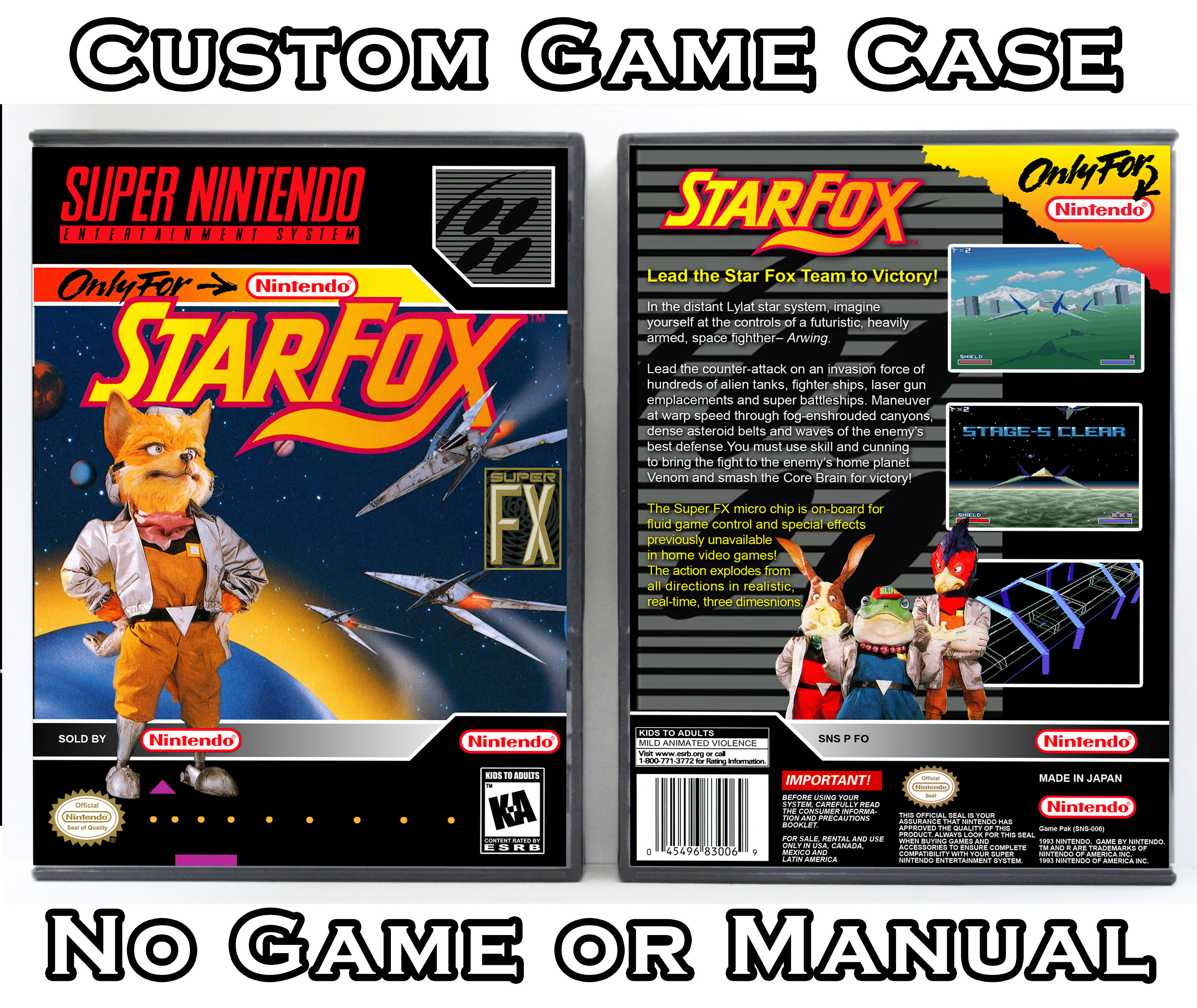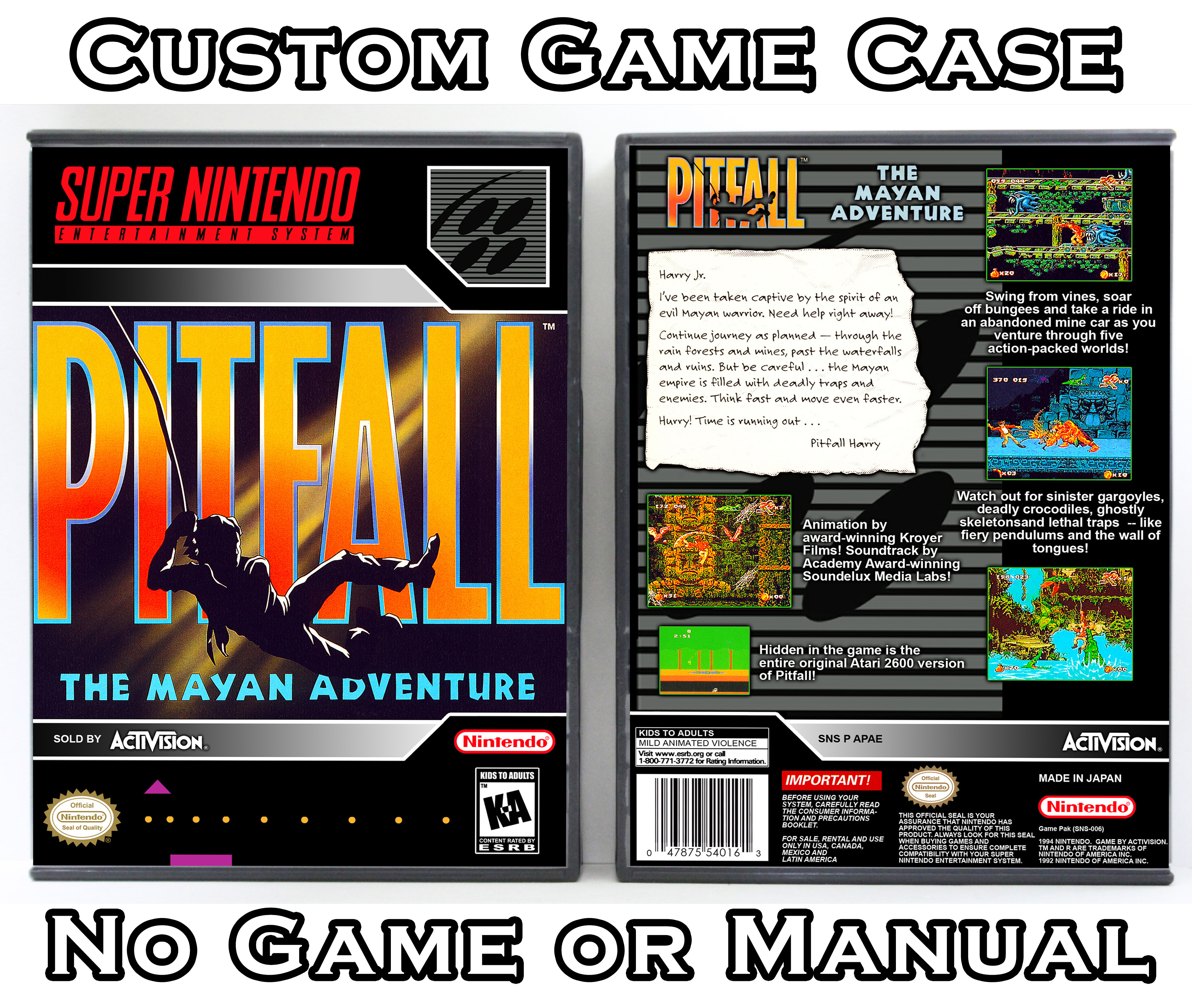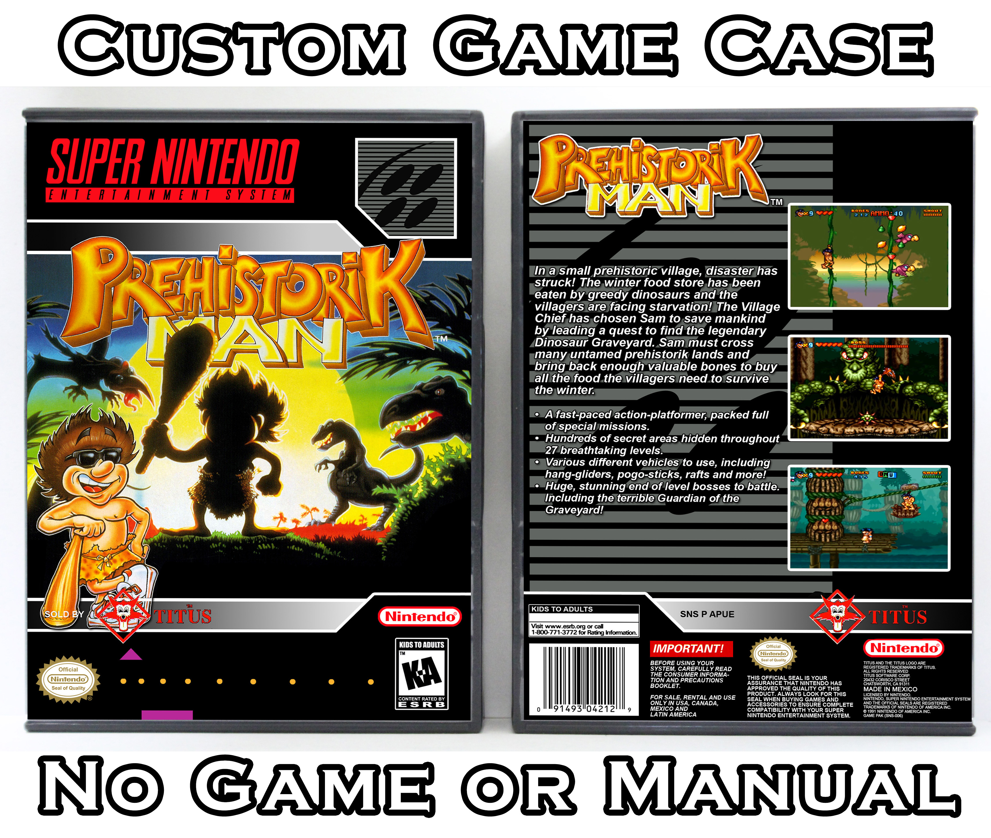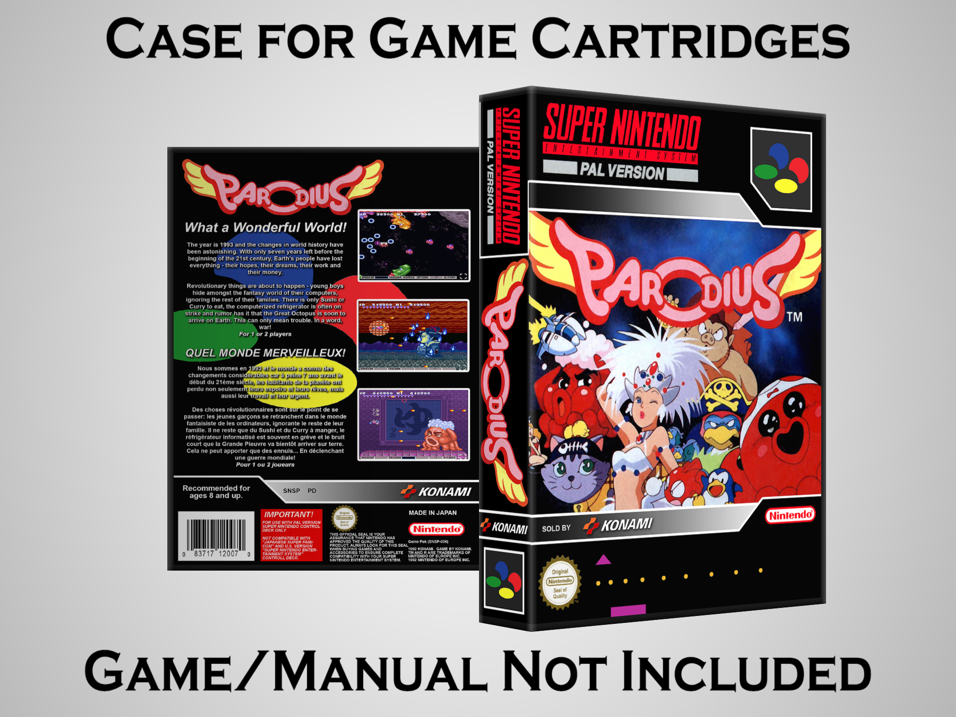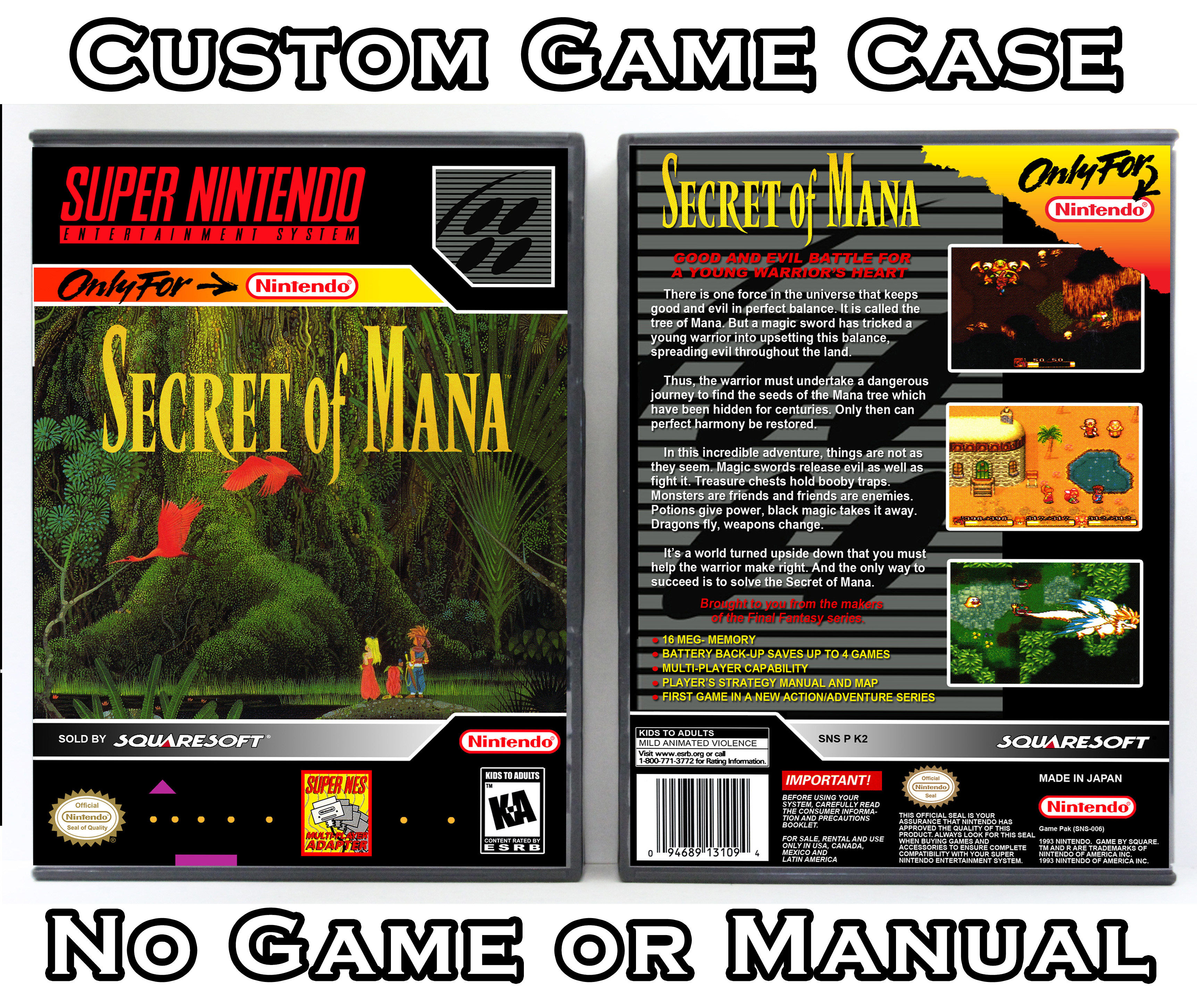 NO GAME OR MANUAL IS INCLUDED! This is NOT an original cardboard box. Case Dimensions : 7.25" x 5.25" x 1.125" Case Color : Dark Grey These cases are designed specifically to hold your Super Nintendo (SNES) cartridges. These are not the low quality Universal Game Cases that most other sellers offer. These firmly hold your cartridges in place, and include clips on the opposite side to hold the instruction manuals if you have them. Our Super Nintendo cases are split into multiple listings alphabetically due to the limit on options in one listing. You can find the rest of our cases in the following links: SNES Cases from # to F SNES Cases from G to N SNES Cases from O to S SNES Cases from T to Z Click here to find more cases in our eBay store!